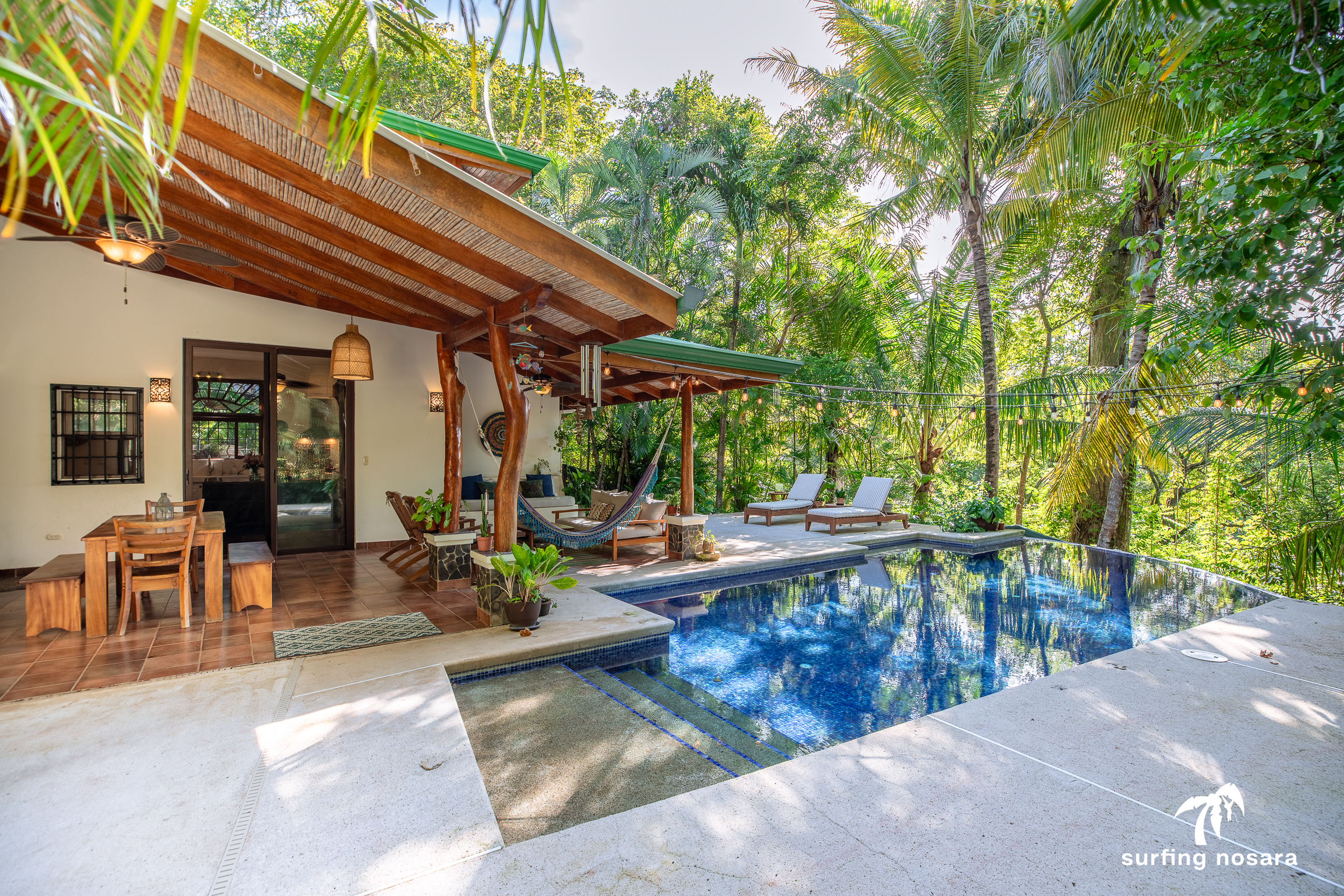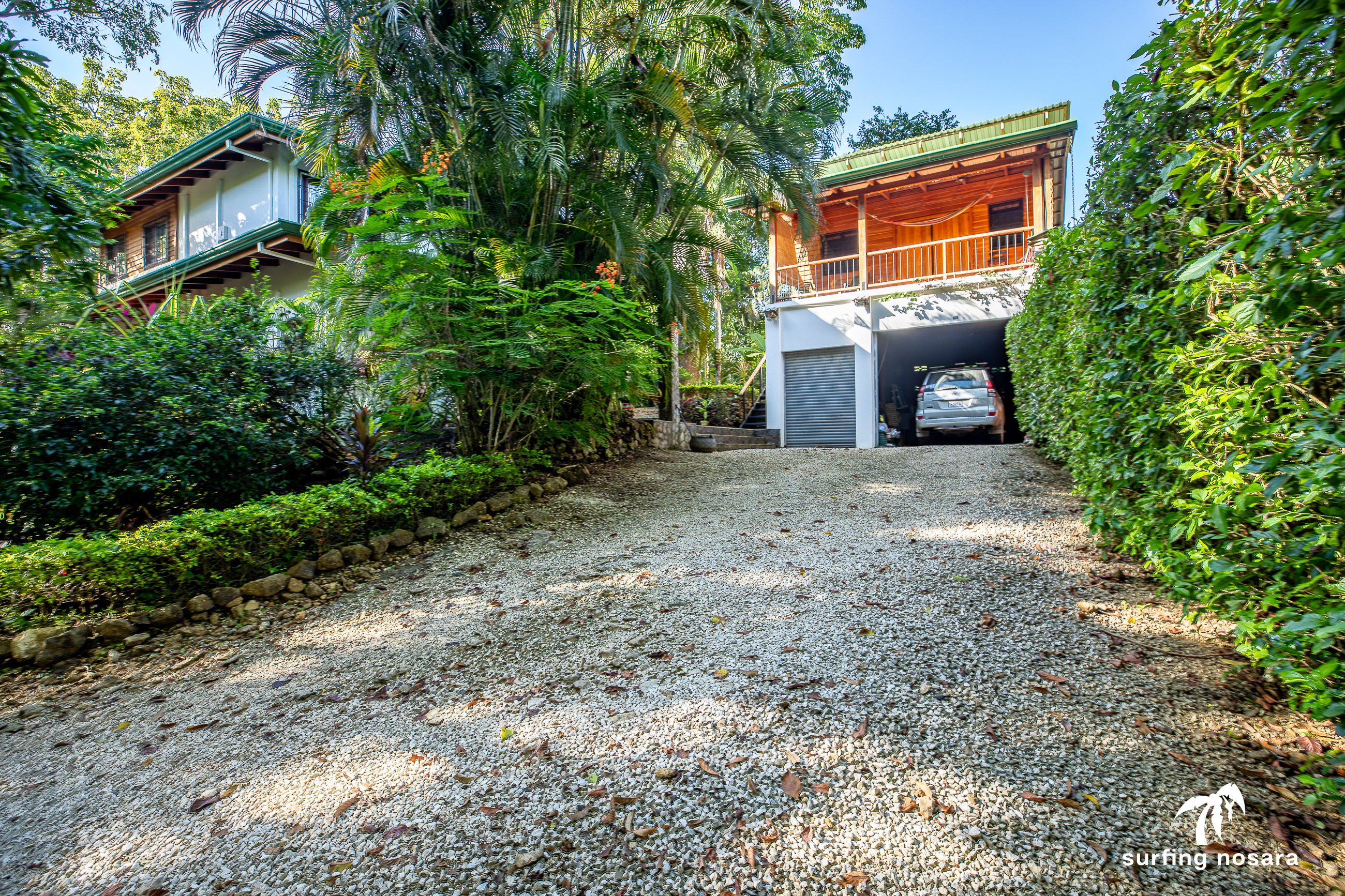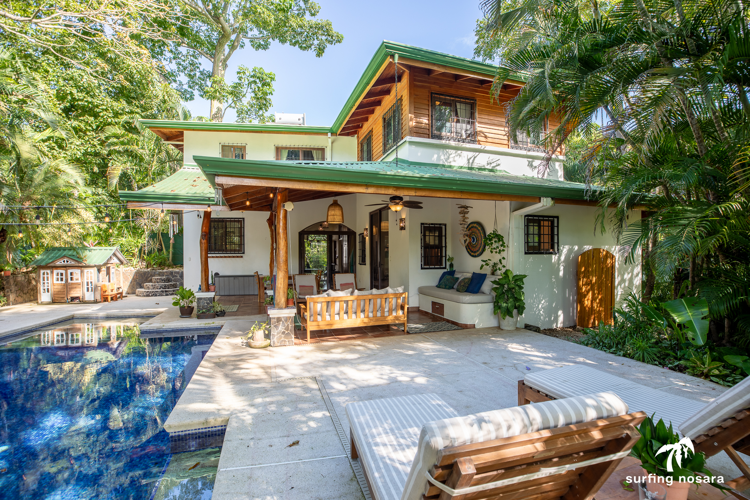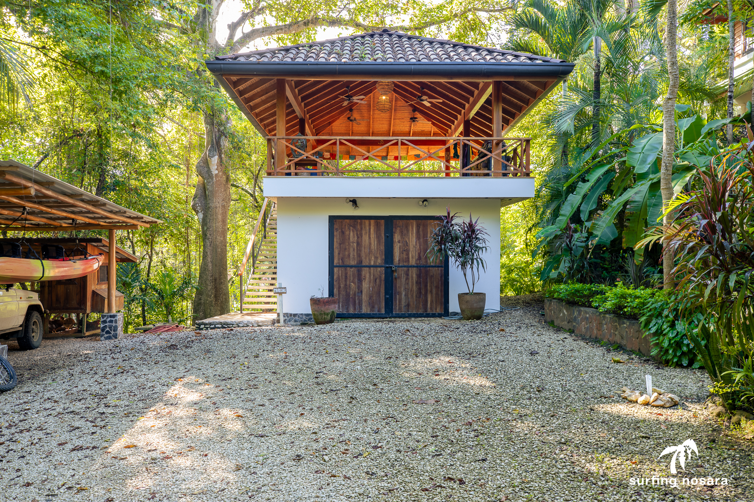 Casa Kiskadee is a charming estate near Playa Pelada beach, just a minute’s walk from “Boca Nosara,” a local hub for surfing, fishing, and nature hikes next to the preservation Lagarta Longe. The main house boasts 3 bedrooms, 2.5 bathrooms, and a beautifully decorated interior. A separate studio with a kitchen resides above the garage, and an additional apartment/office beneath the yoga shala offers flexible living or working space. The professionally used, elevated yoga shala overlooks lush jungle canopy, providing a private and serene view. The estate also features a spacious patio next to a saltwater pool, perfect for relaxing or entertaining while enjoying the presence of passing monkeys. Filled with tropical trees like banana, papaya, star fruit, and mango, the property is a verdant paradise. Additional amenities include extensive storage, a garage, solar hot water systems, AC in all bedrooms, a water storage tank.