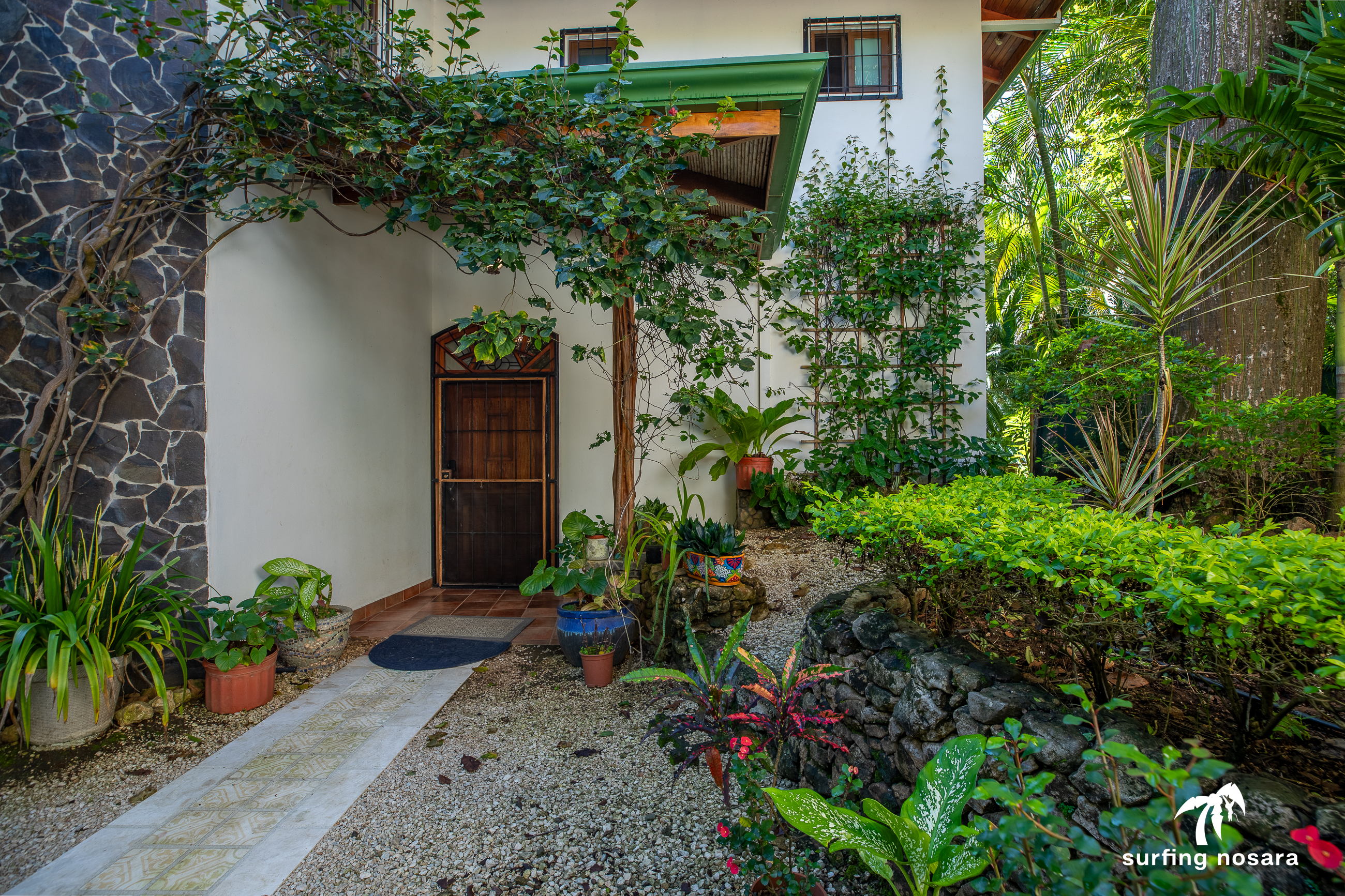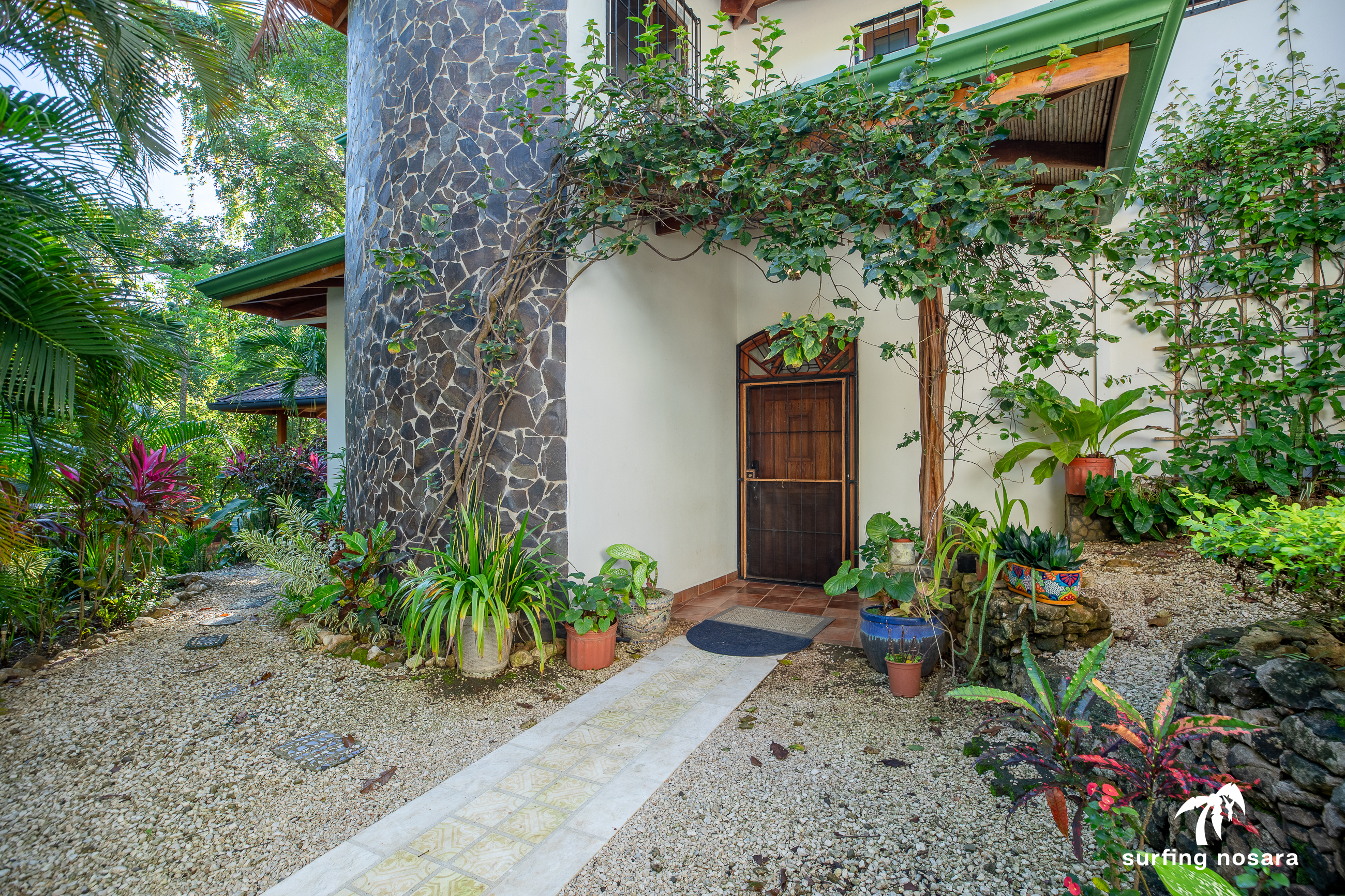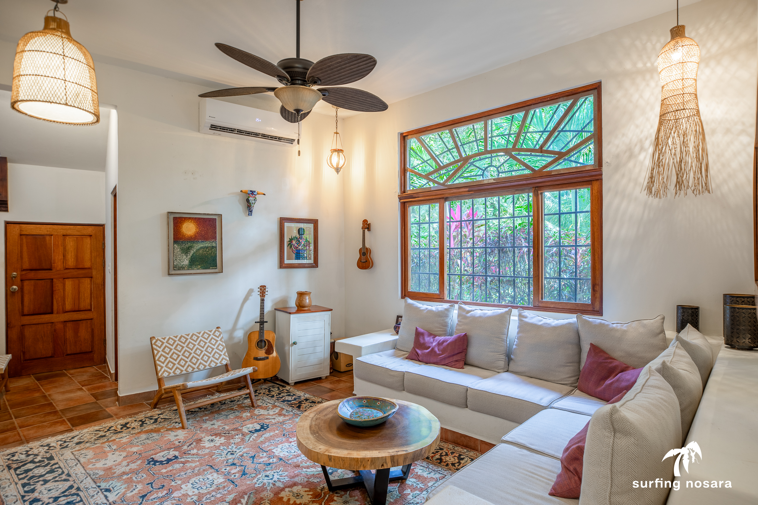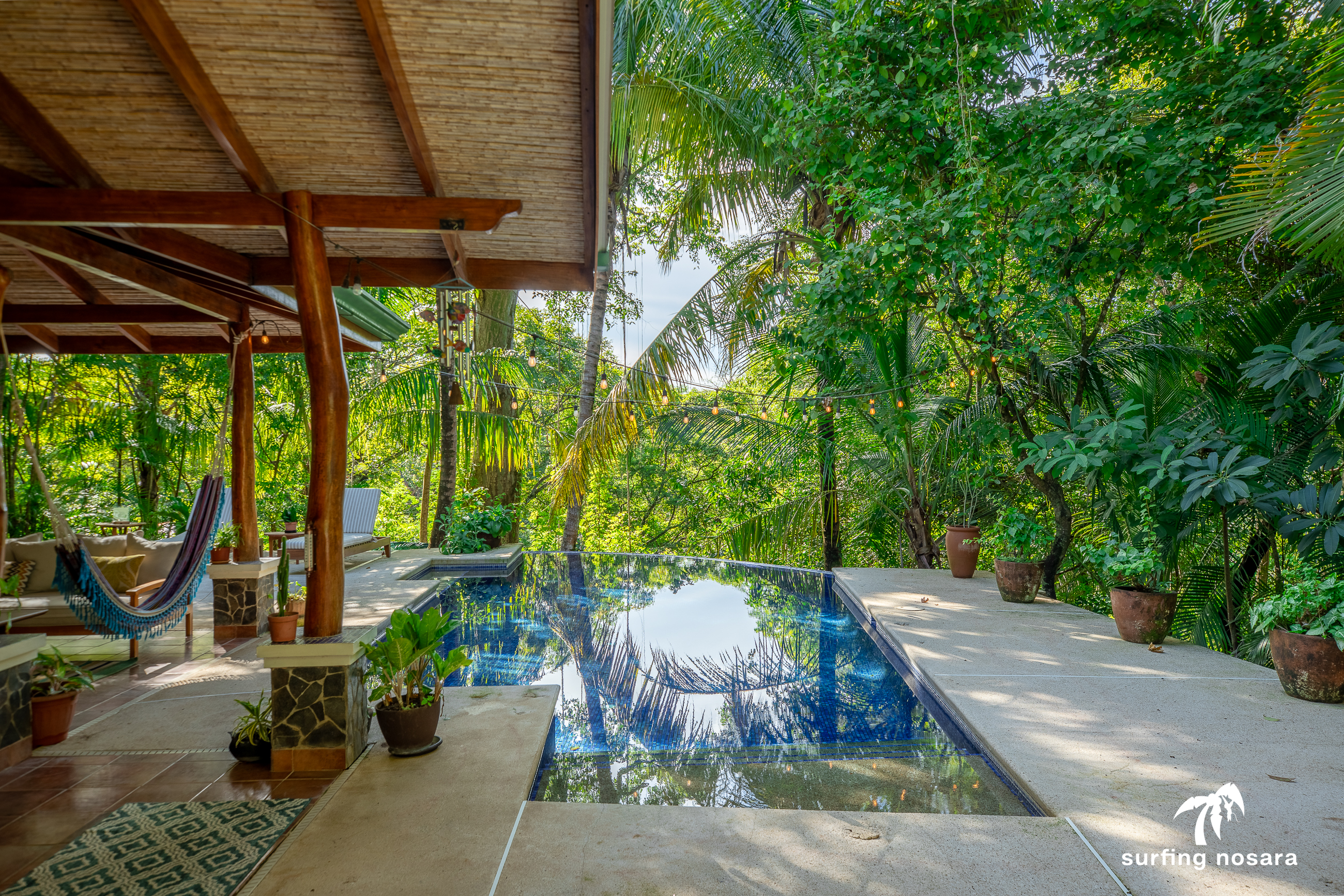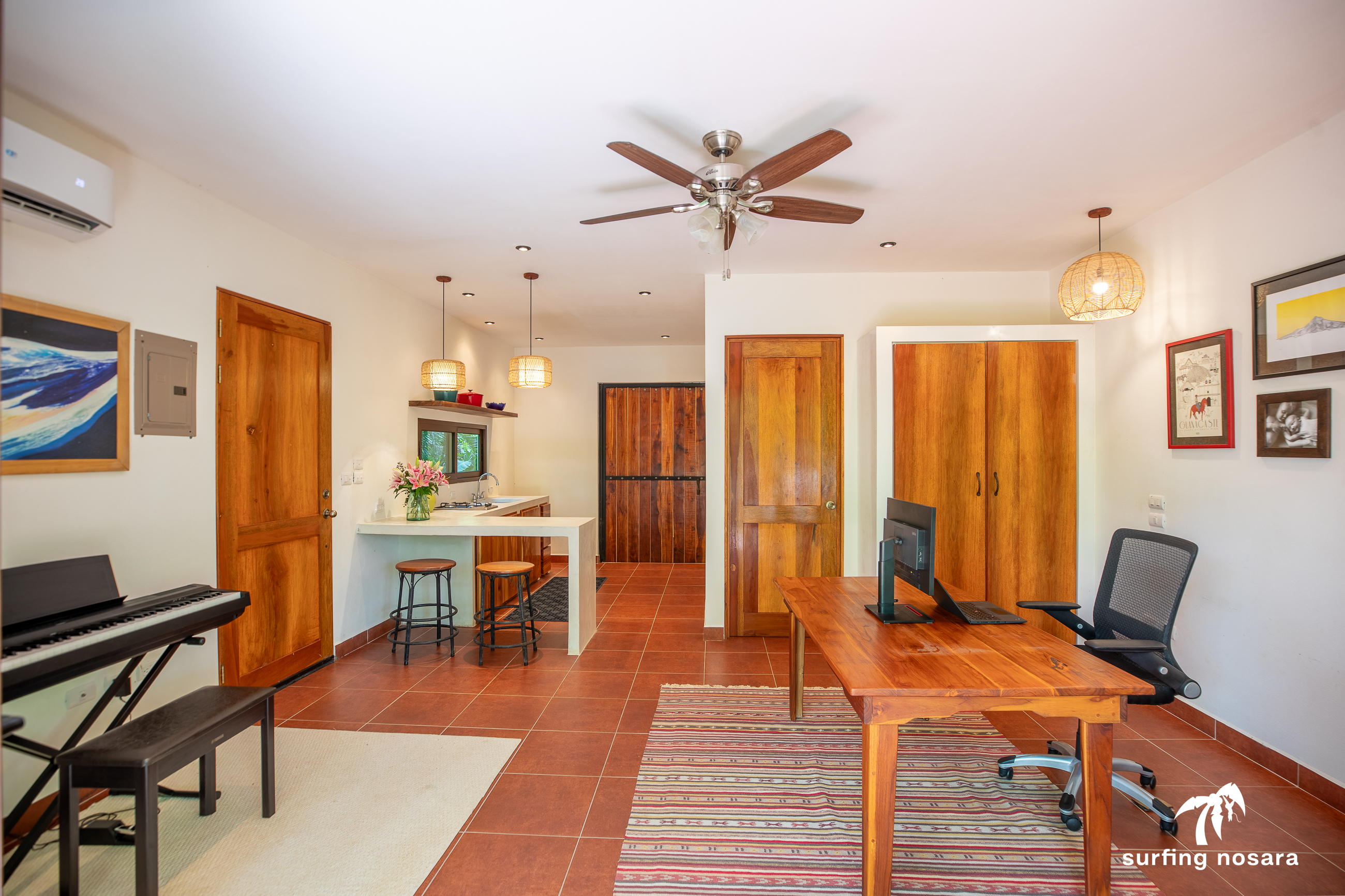 Casa Kiskadee is a charming estate near Playa Pelada beach, just a minute’s walk from “Boca Nosara,” a local hub for surfing, fishing, and nature hikes next to the preservation Lagarta Longe. The main house boasts 3 bedrooms, 2.5 bathrooms, and a beautifully decorated interior. A separate studio with a kitchen resides above the garage, and an additional apartment/office beneath the yoga shala offers flexible living or working space. The professionally used, elevated yoga shala overlooks lush jungle canopy, providing a private and serene view. The estate also features a spacious patio next to a saltwater pool, perfect for relaxing or entertaining while enjoying the presence of passing monkeys. Filled with tropical trees like banana, papaya, star fruit, and mango, the property is a verdant paradise. Additional amenities include extensive storage, a garage, solar hot water systems, AC in all bedrooms, a water storage tank.
