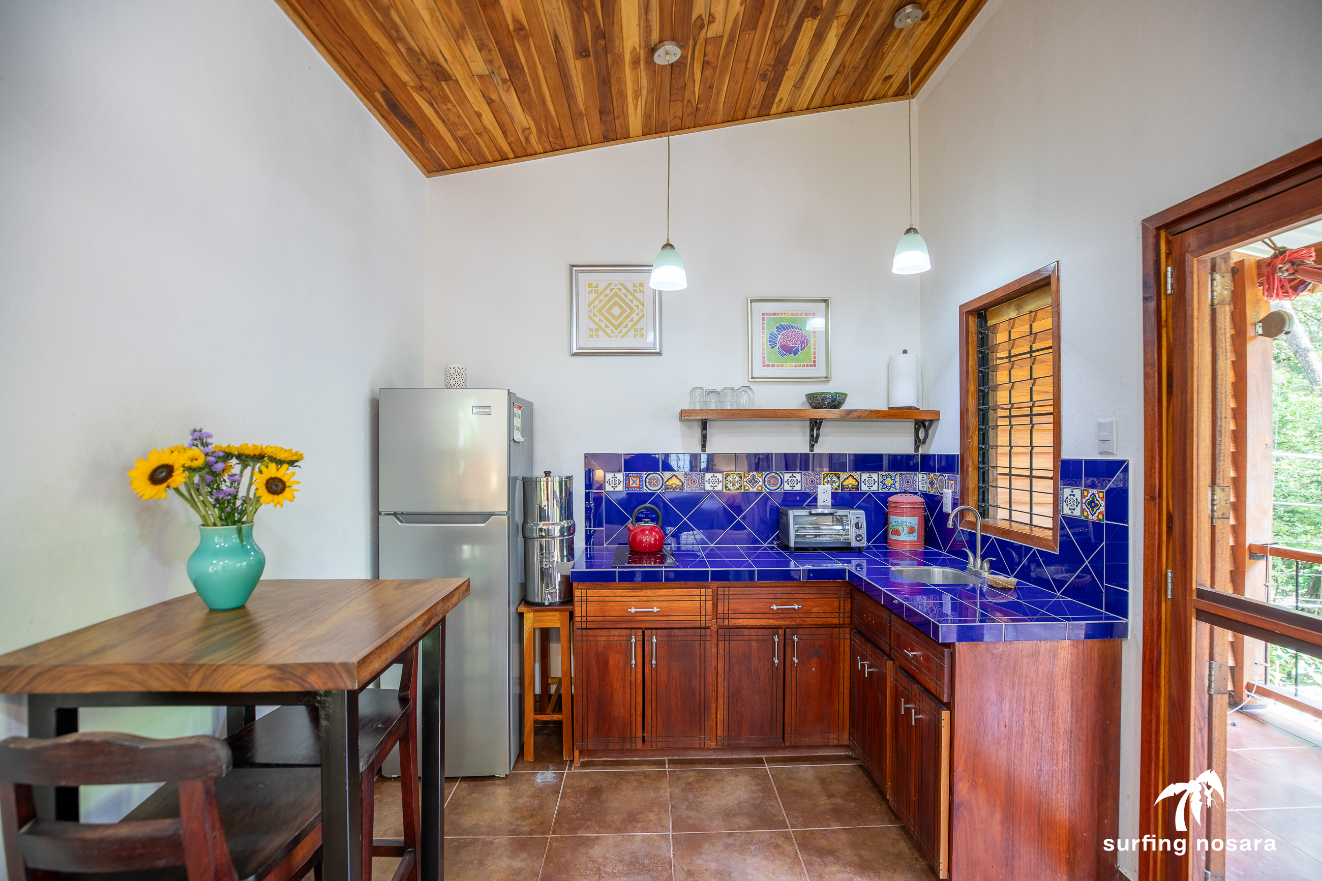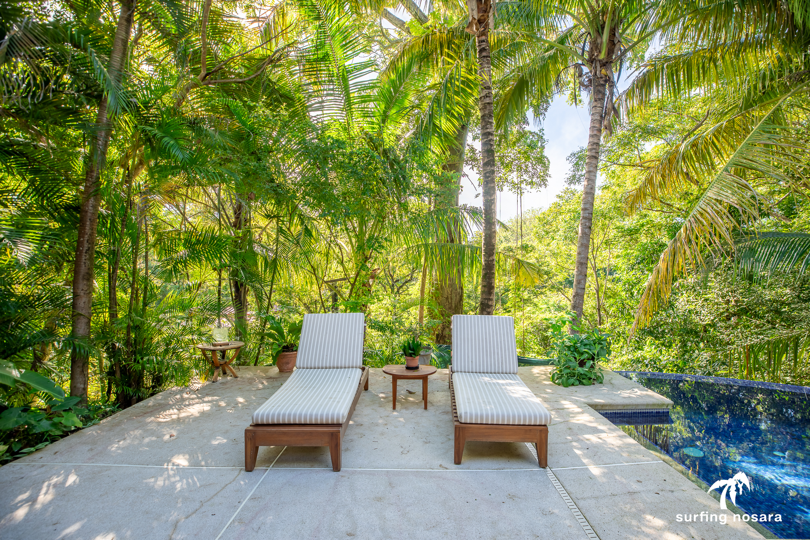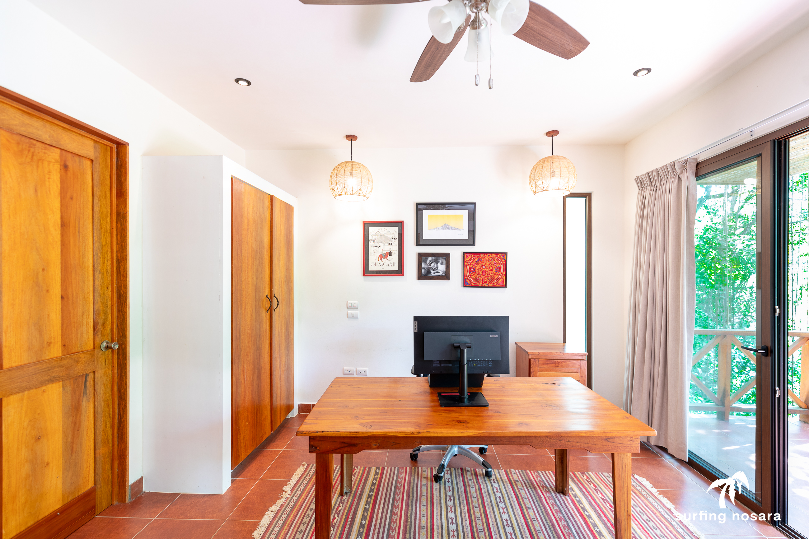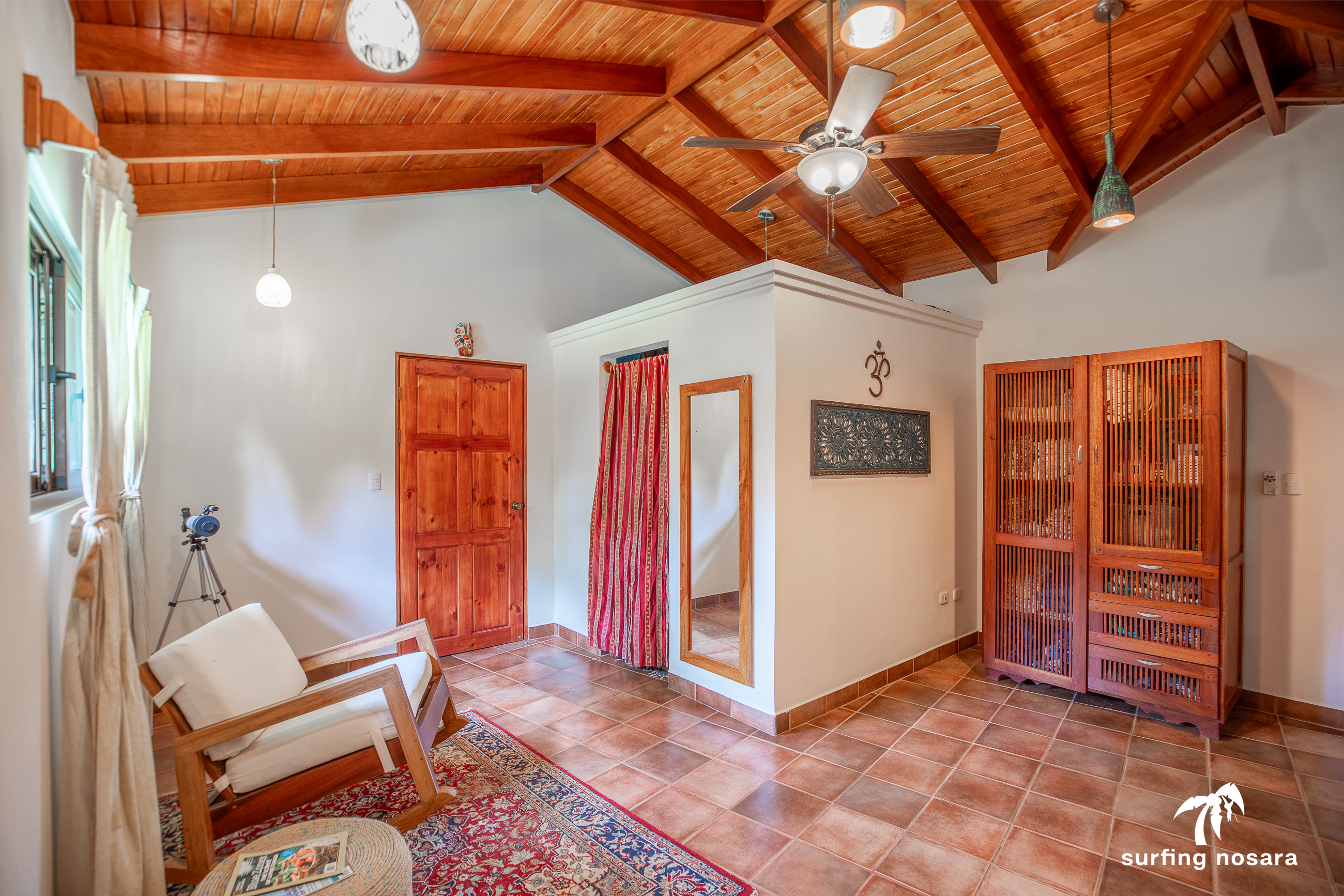 Casa Kiskadee is a charming estate near Playa Pelada beach, just a minute’s walk from “Boca Nosara,” a local hub for surfing, fishing, and nature hikes next to the preservation Lagarta Longe. The main house boasts 3 bedrooms, 2.5 bathrooms, and a beautifully decorated interior. A separate studio with a kitchen resides above the garage, and an additional apartment/office beneath the yoga shala offers flexible living or working space. The professionally used, elevated yoga shala overlooks lush jungle canopy, providing a private and serene view. The estate also features a spacious patio next to a saltwater pool, perfect for relaxing or entertaining while enjoying the presence of passing monkeys. Filled with tropical trees like banana, papaya, star fruit, and mango, the property is a verdant paradise. Additional amenities include extensive storage, a garage, solar hot water systems, AC in all bedrooms, a water storage tank.