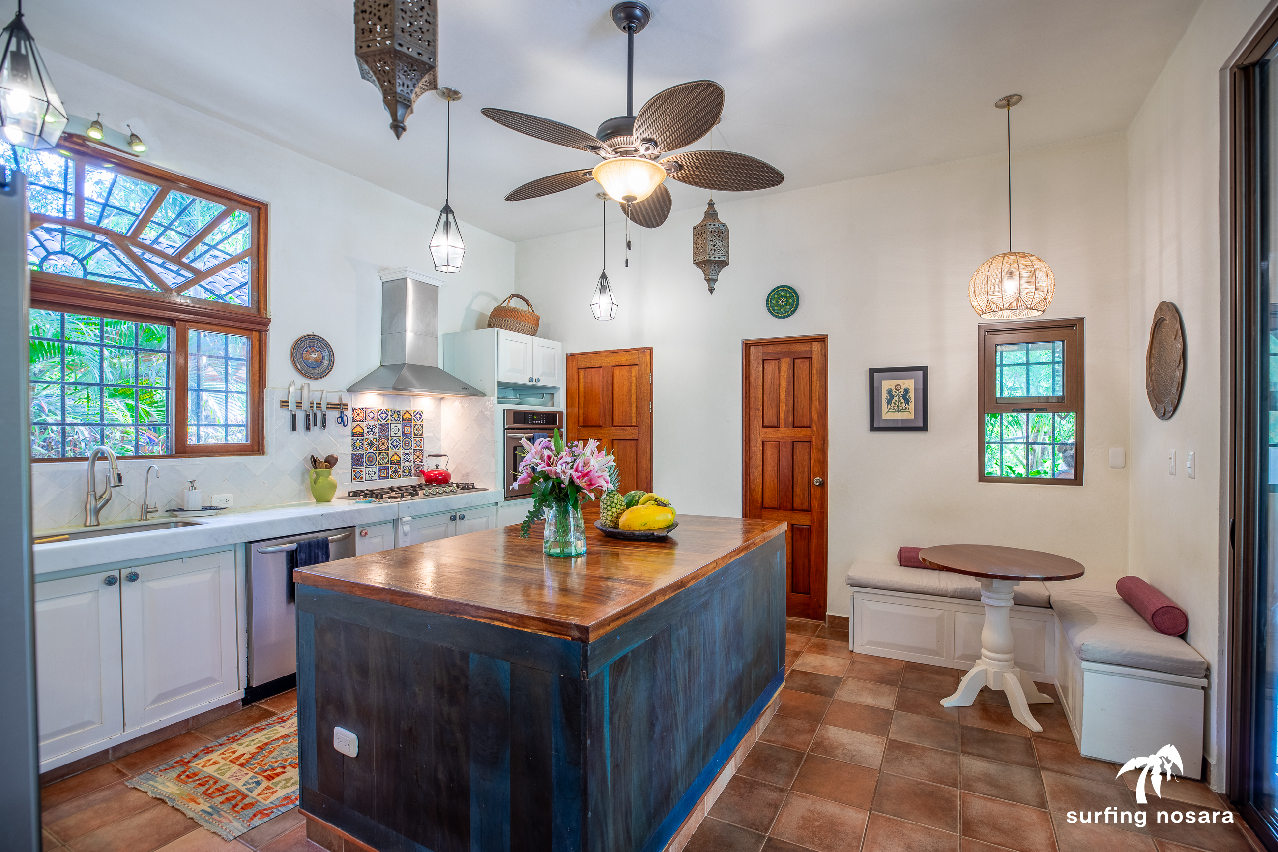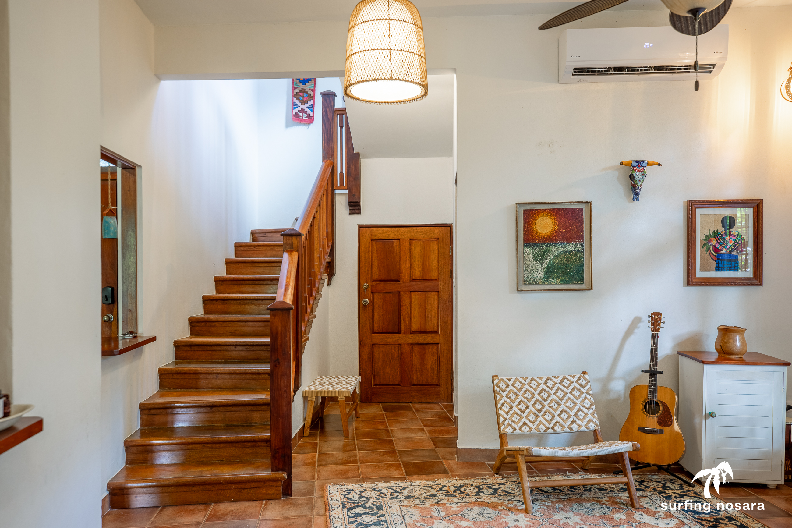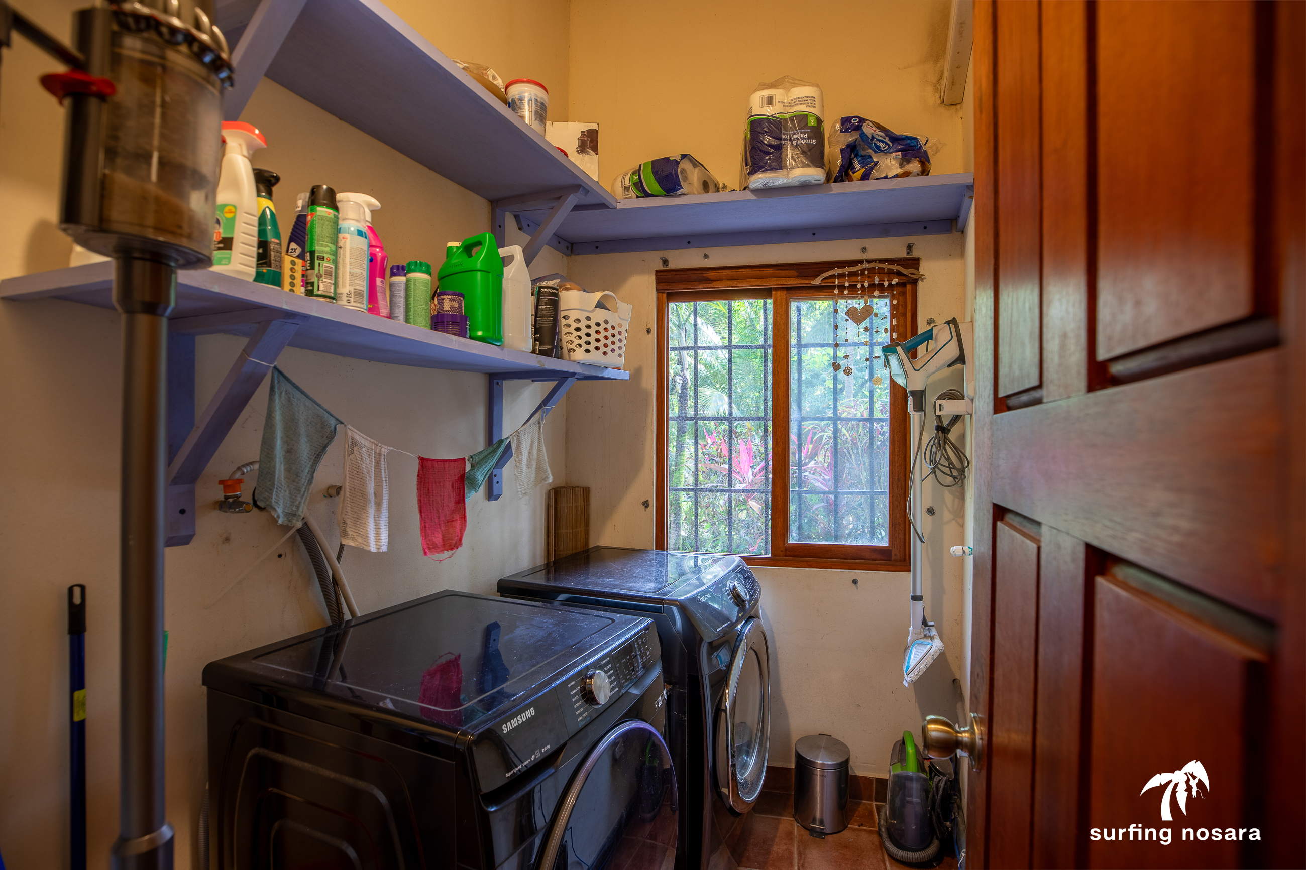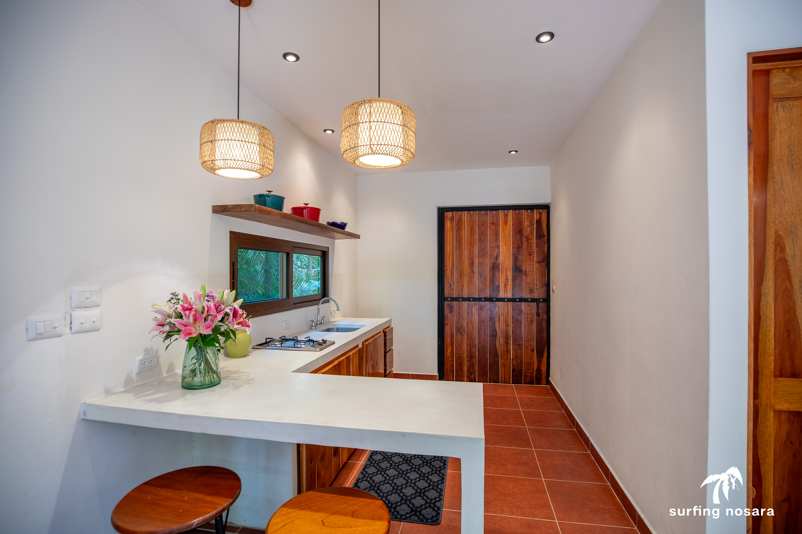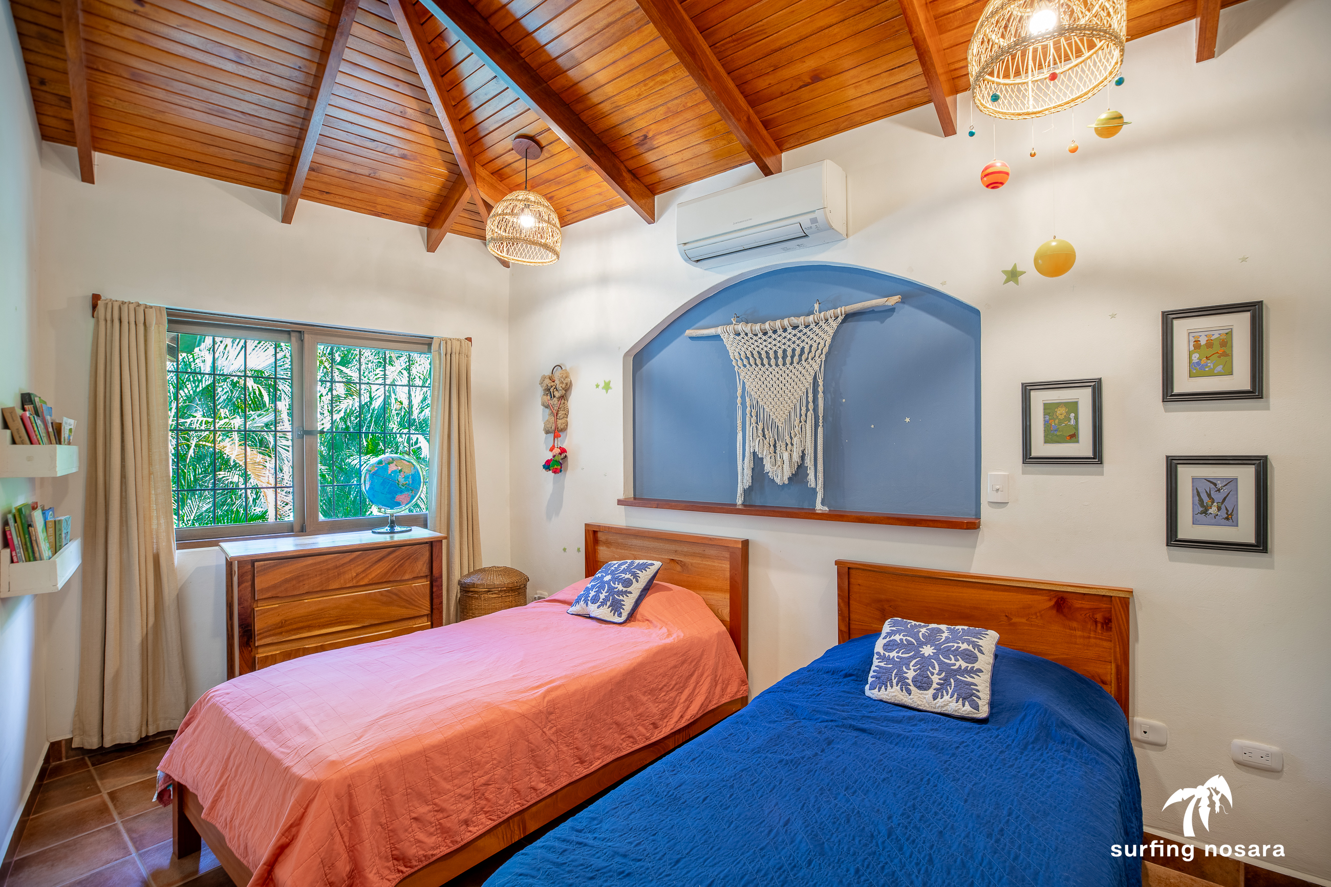 Casa Kiskadee is a charming estate near Playa Pelada beach, just a minute’s walk from “Boca Nosara,” a local hub for surfing, fishing, and nature hikes next to the preservation Lagarta Longe. The main house boasts 3 bedrooms, 2.5 bathrooms, and a beautifully decorated interior. A separate studio with a kitchen resides above the garage, and an additional apartment/office beneath the yoga shala offers flexible living or working space. The professionally used, elevated yoga shala overlooks lush jungle canopy, providing a private and serene view. The estate also features a spacious patio next to a saltwater pool, perfect for relaxing or entertaining while enjoying the presence of passing monkeys. Filled with tropical trees like banana, papaya, star fruit, and mango, the property is a verdant paradise. Additional amenities include extensive storage, a garage, solar hot water systems, AC in all bedrooms, a water storage tank.
