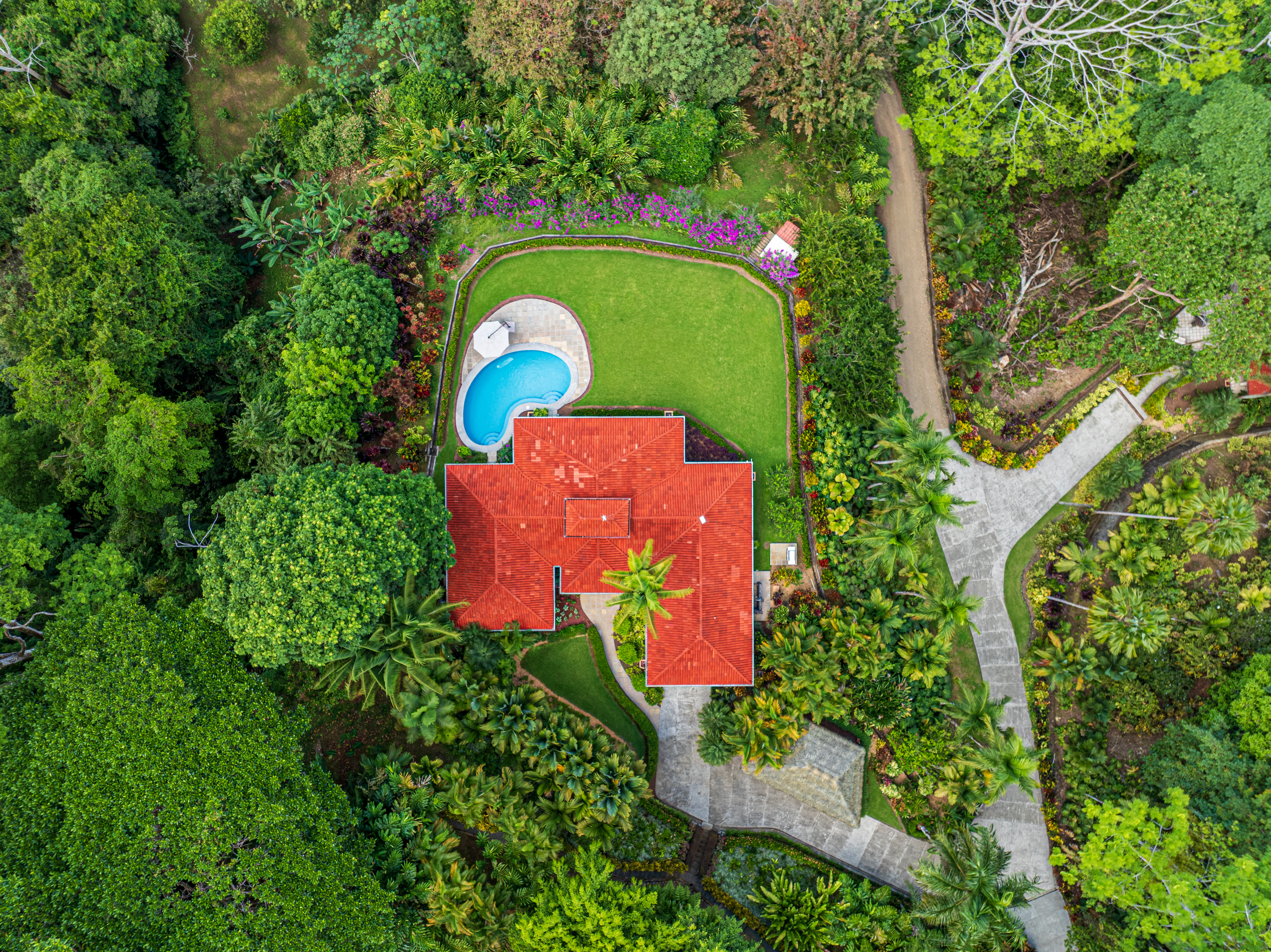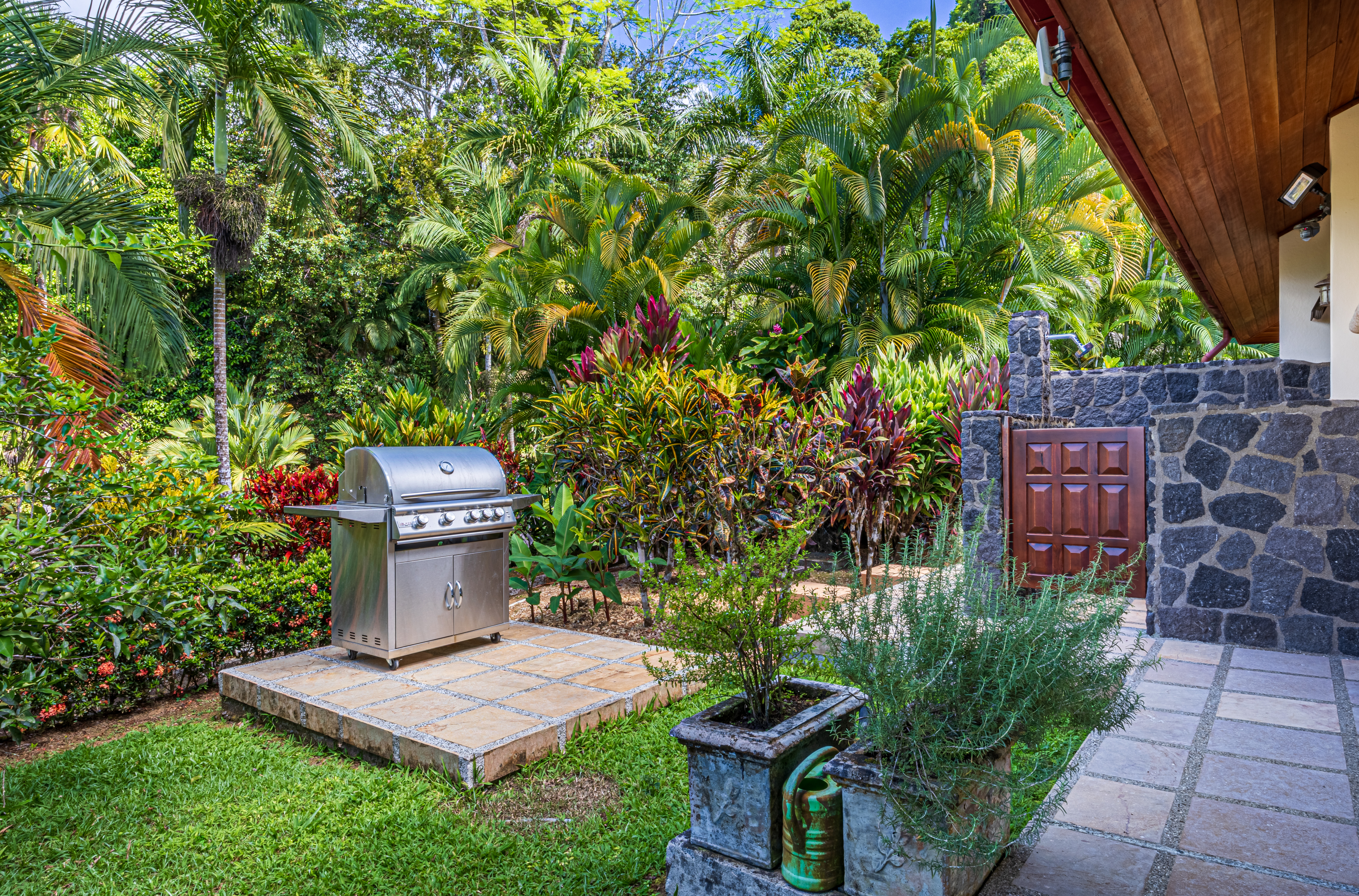 The property is beautifully landscaped with manicured lawns, mature trees, and vibrant tropical flower islands that provide color year-round. Stone pathways connect each home while maintaining a sense of privacy and flow across the estate. Fruit trees throughout the property offer seasonal harvests and aromas.