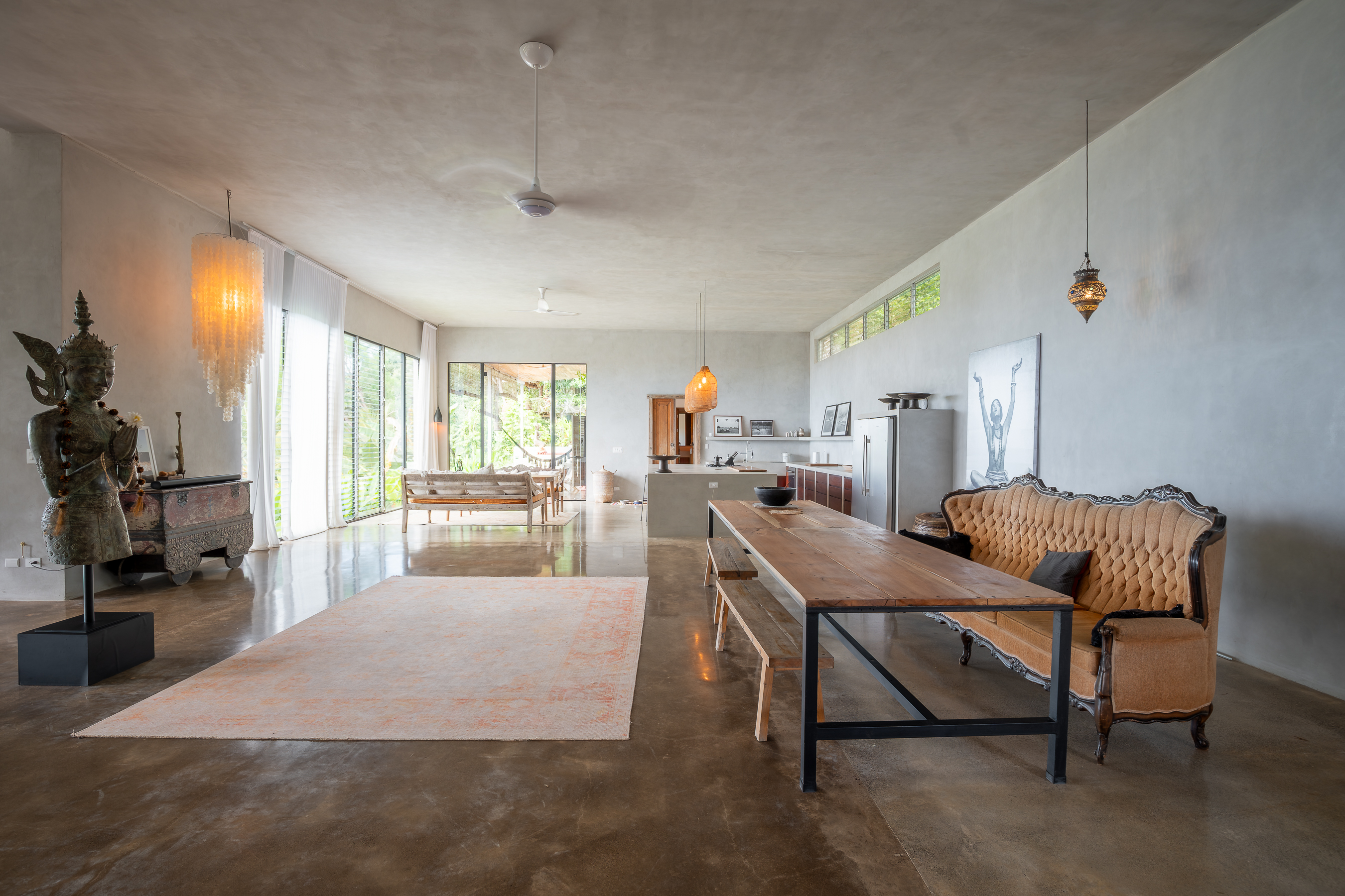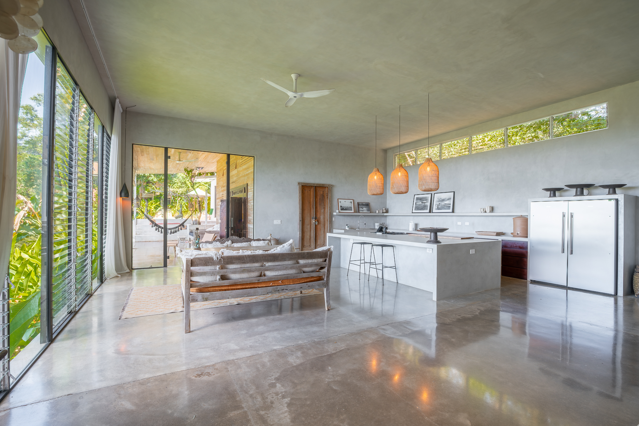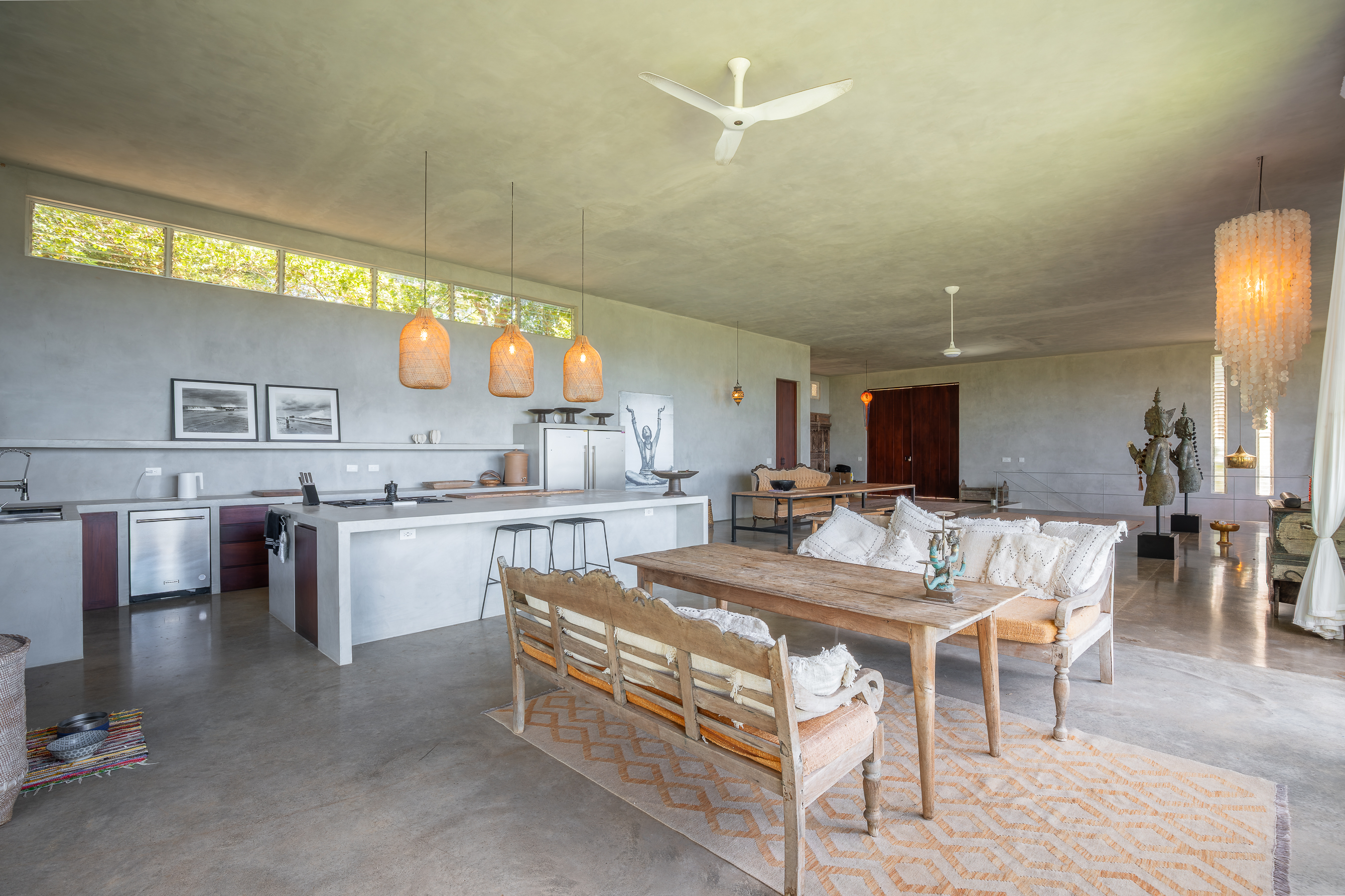 The main residence features approximately 655 m² (7,050 sq ft) of beautifully designed open-concept living space, where floor-to-ceiling glass opens onto expansive terraces, inviting in natural light and ocean breezes. Multiple lounge areas, a refined dining space, and a contemporary chef’s kitchen with large island make it ideal for both entertaining and everyday living.
