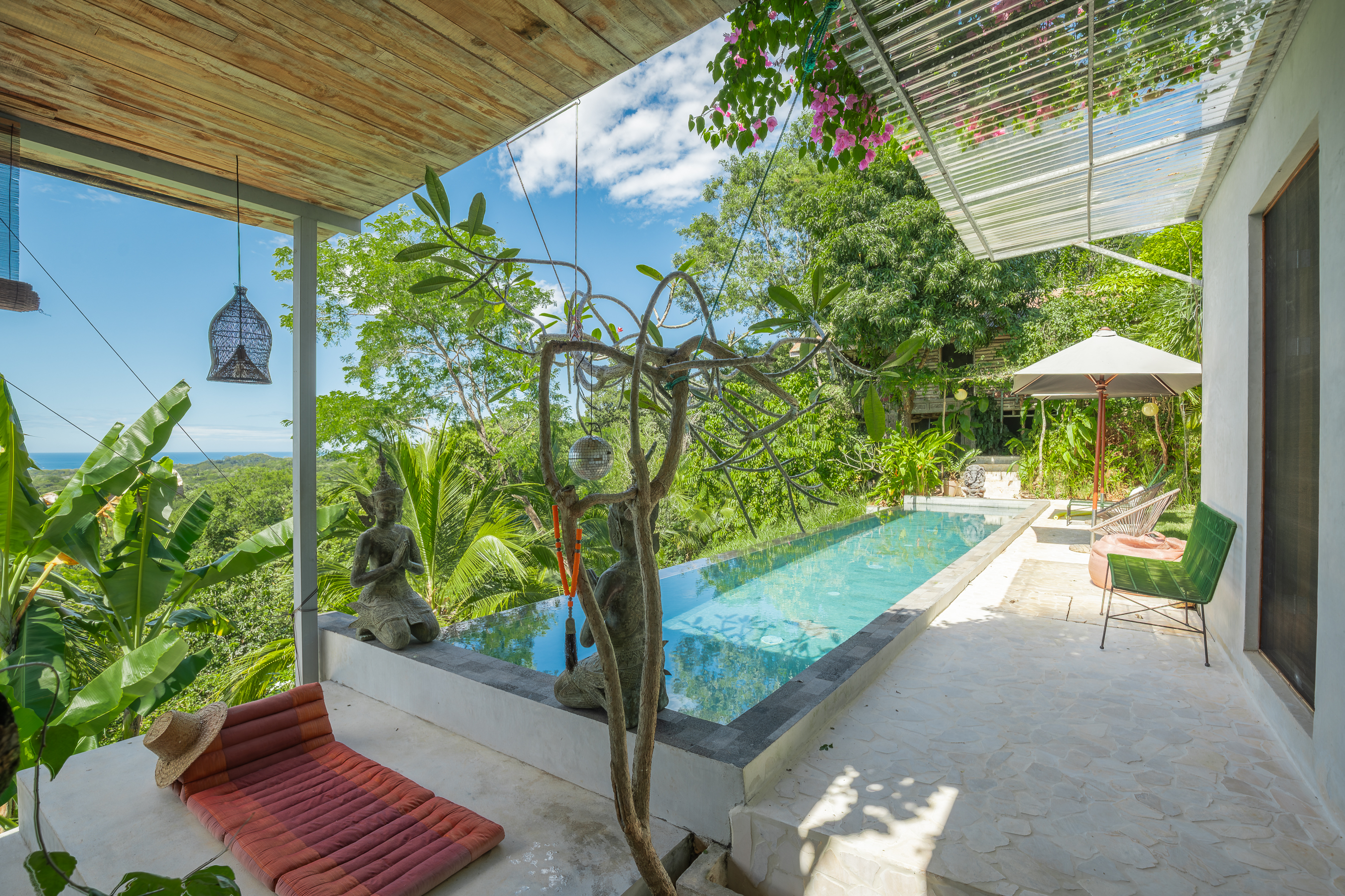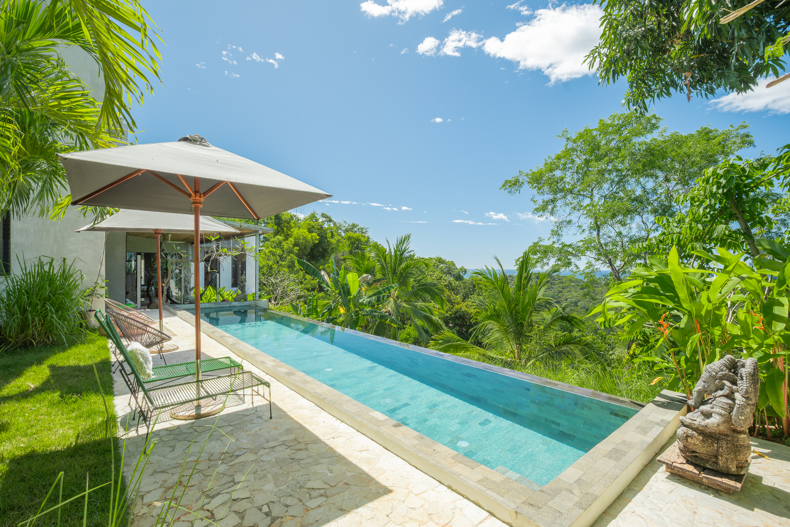 Outdoor living centers around a 13-meter lap pool, perfect for sunset gatherings. A separate guesthouse with its own infinity pool provides additional privacy for family and guests. Lush landscaped gardens with Moroccan-inspired details and vibrant bougainvillea enhance the estate’s tropical elegance.