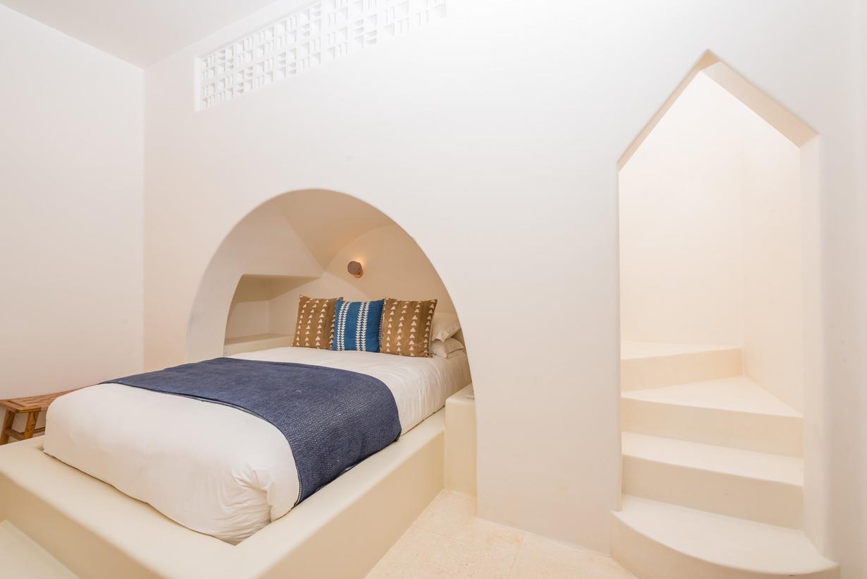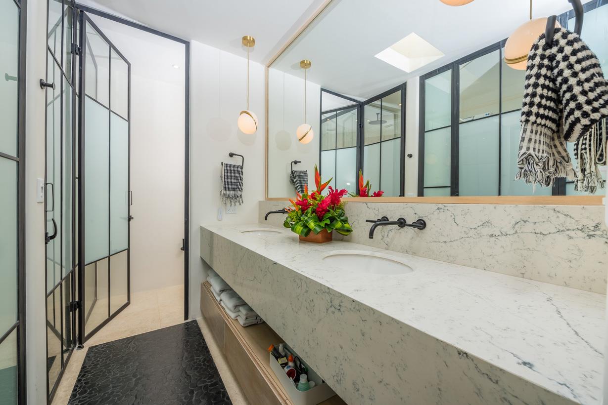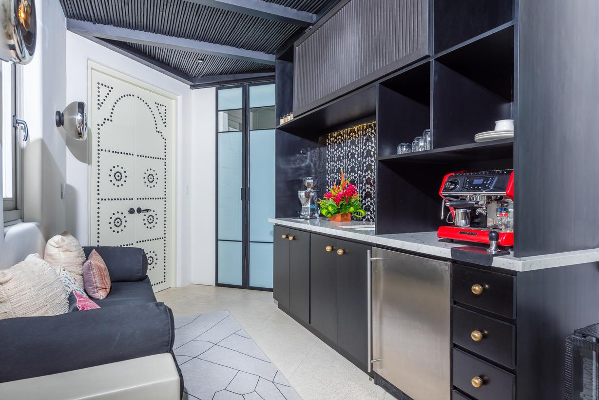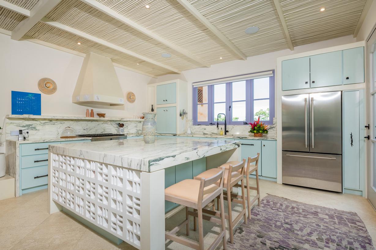 A special mention goes to the lavender staircase, hand-painted with micro-cement, featuring a unique shape and design that is sure to impress. Upstairs, you'll find two dueling master bedrooms, each with its own ensuite bathroom and private coffee area in the middle. The top floor showcases extra high ceilings, and each master bedroom boasts its own unique features, including built-in furniture, stone rain showers, and even an outdoor stone tub with stunning views of the sky and ocean.