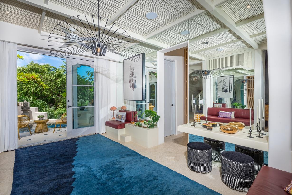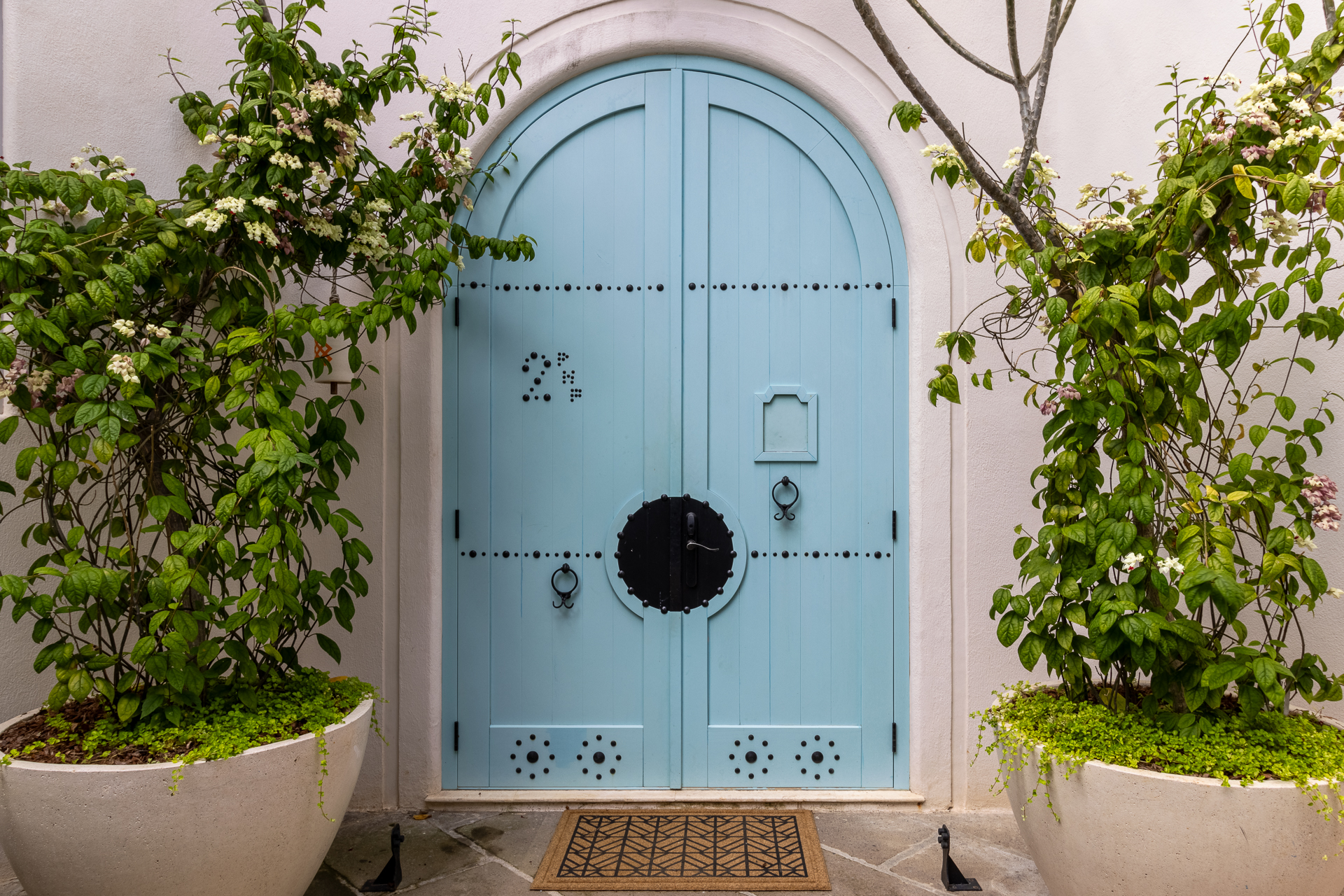 As you enter, you are greeted by a welcoming private courtyard adorned with beautiful potted tropical plants, setting the stage for what awaits inside. The stunning custom baby blue arched front door with black accents provides a captivating focal point, and a peek-a-boo door ensures privacy and security.