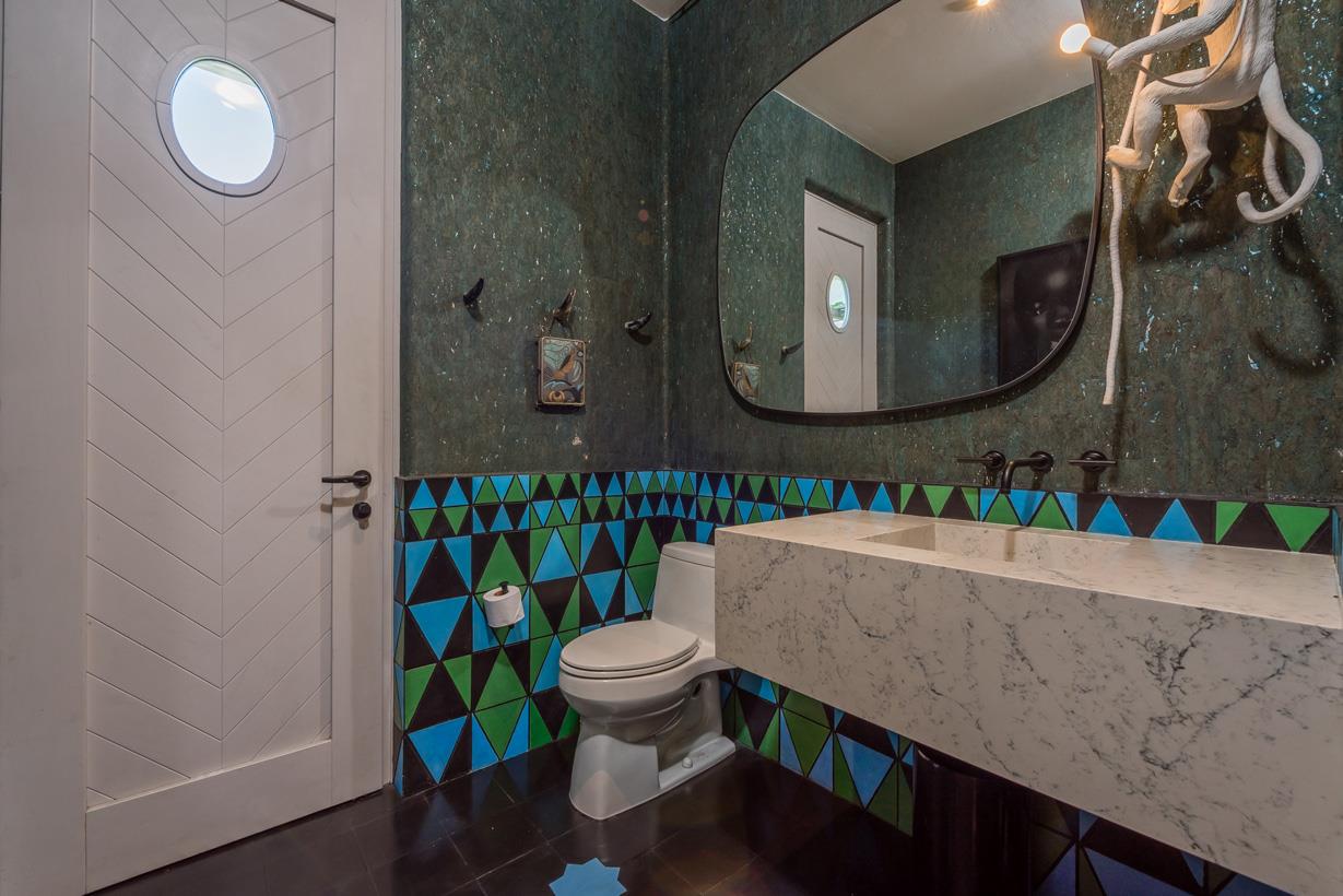 Downstairs, you'll discover two guest bedrooms with custom built-in furniture and ensuites, one with a tub, and a studio apartment, all uniquely designed and thoughtfully appointed. The media room, nestled in the middle, is perfect for entertaining with its extra-long couch that can convert into two twin beds. The studio apartment comes with a private enclosed terrace with a fountain, and a kitchenette, making it a potential rental separate from the main house.