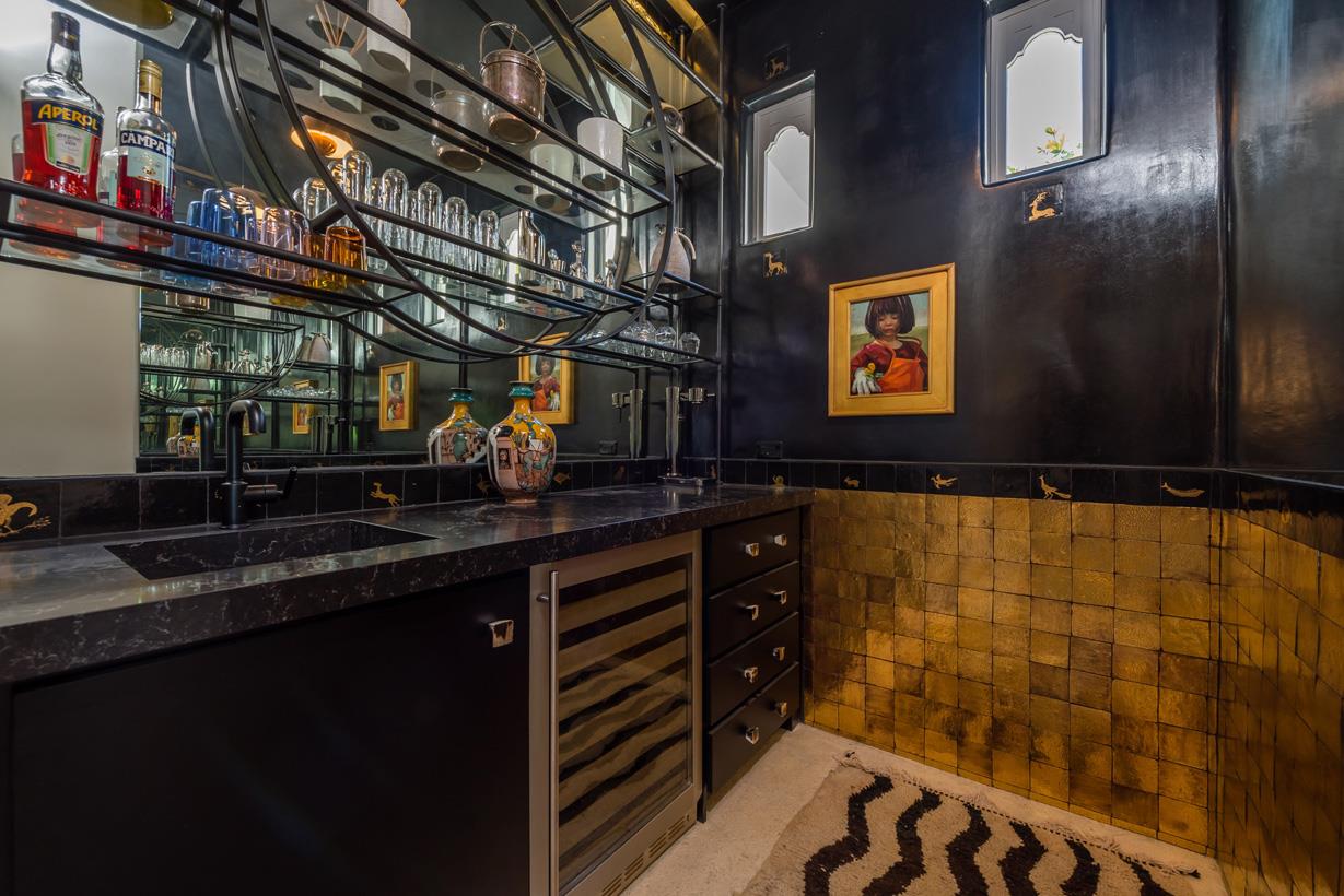 The expansive kitchen and dining room, with patio doors opening to a terrace, is a culinary enthusiast's dream. An oversized stone island with concrete details, handmade tiles on the hood above the gas range, and an abundance of counter space make this a perfect space for creating culinary masterpieces. The living room is a sanctuary of comfort, boasting super-soft carpets and an arched sitting area with views. A gorgeous bar, just off the living room, adorned with tiles from Belgium and Paris, adds a touch of European charm to your evenings.