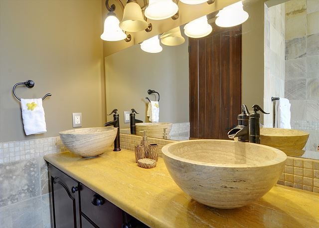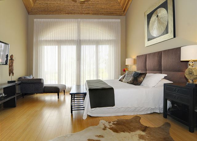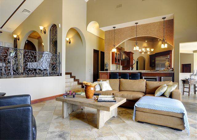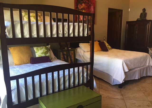 The house, ideal for a large family, extended family, or group of friends given the layout, has five bedrooms and six full bathrooms, distributed across the house allowing for separate family nuclei or friend groups (or age groups!), and even a separate casita with full kitchen. The master is conveniently separate from the other rooms, affording privacy and space, which itself is an oversized and great bedroom.
