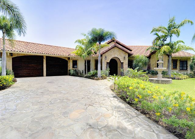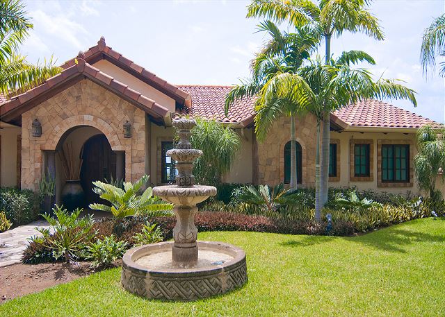 A fountain welcomes you to the main entrance of the home on a nice stone driveway, with a garage which fits two large SUVs, and allowing plenty of cars on the driveway.
