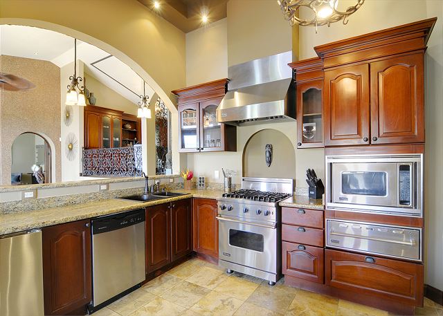 A good sized kitchen with a bar and quality appliances– including a wine fridge and heating drawer– look over into the living room and connect with the formal dining room for eight.