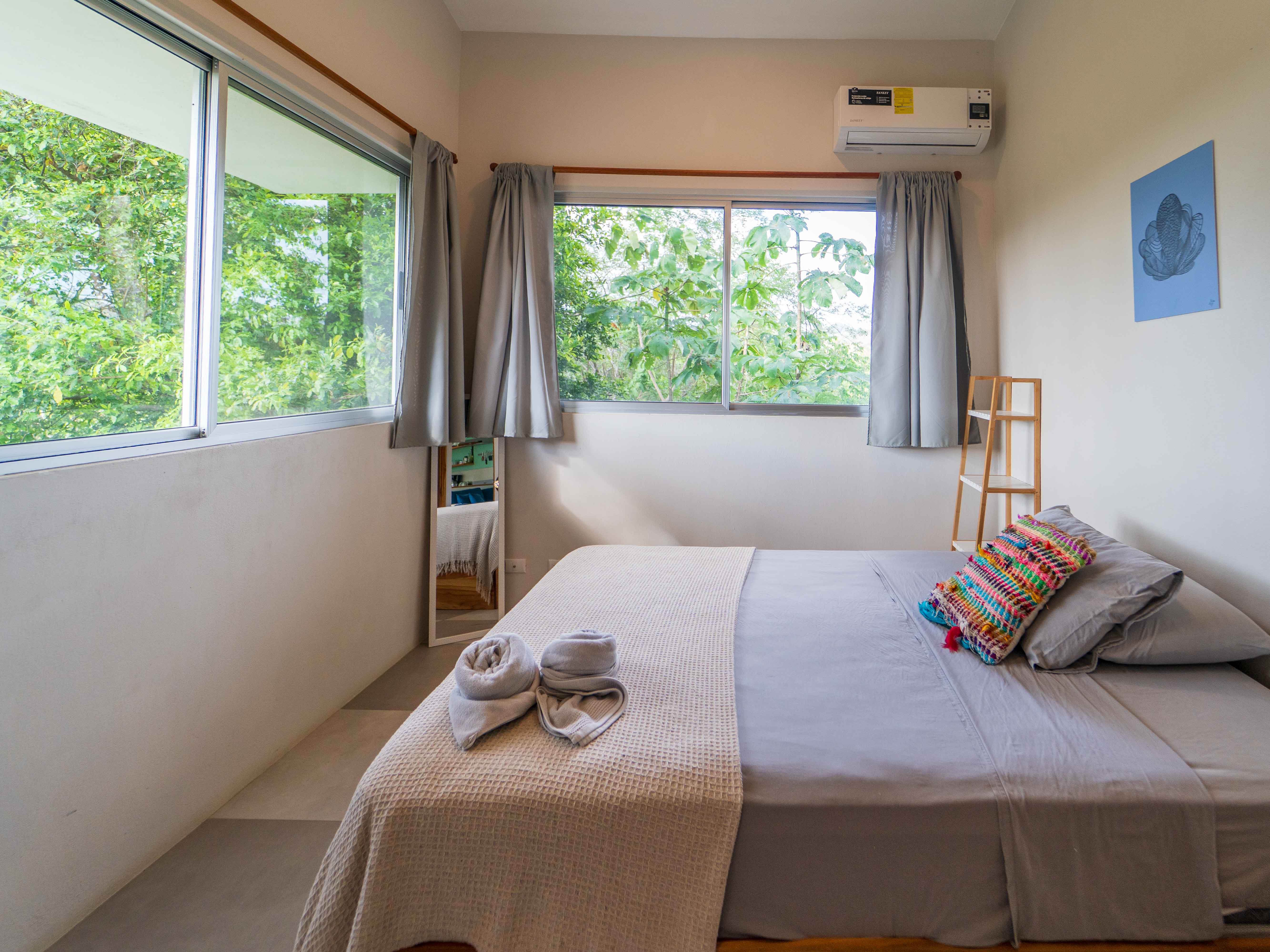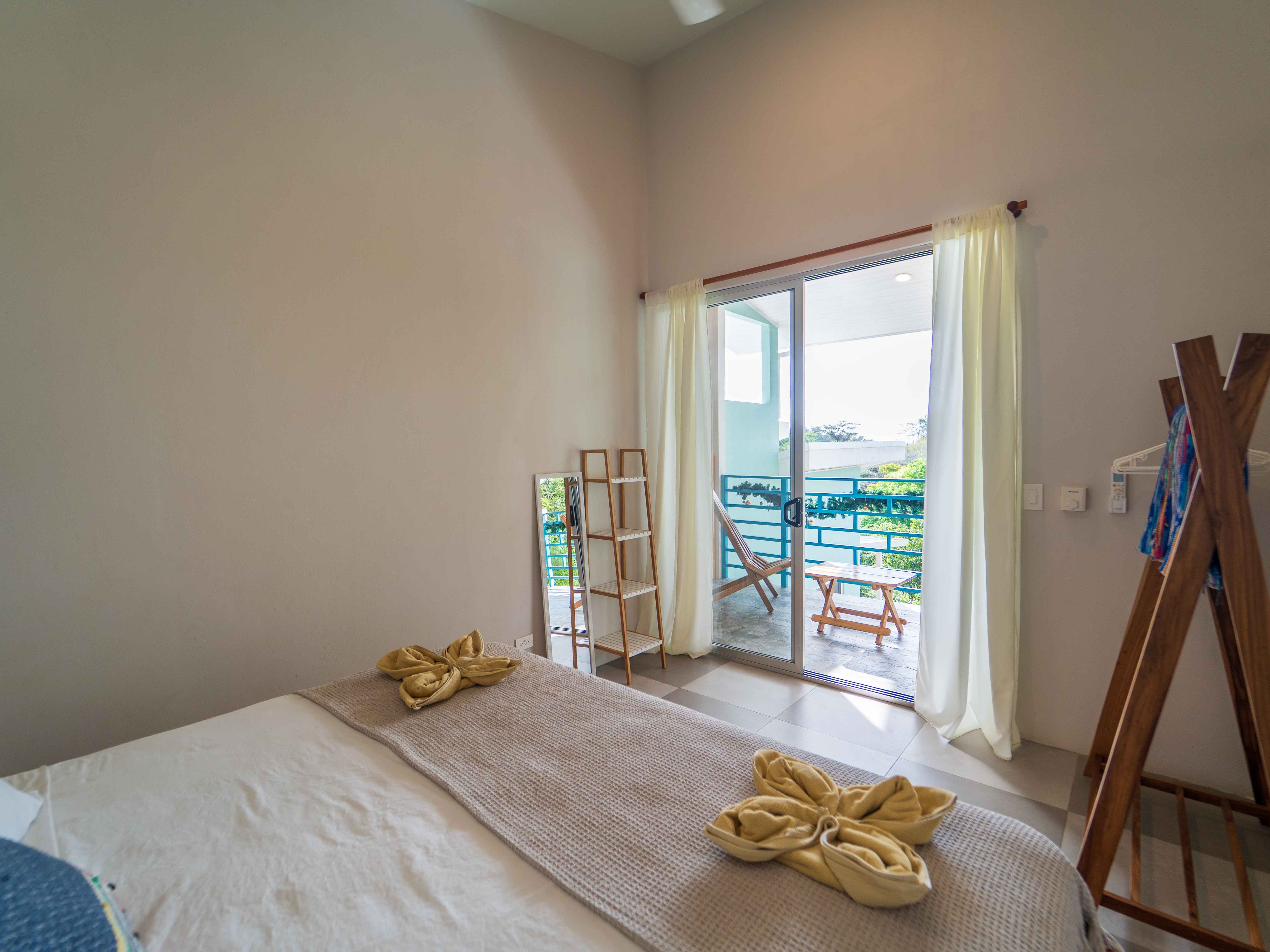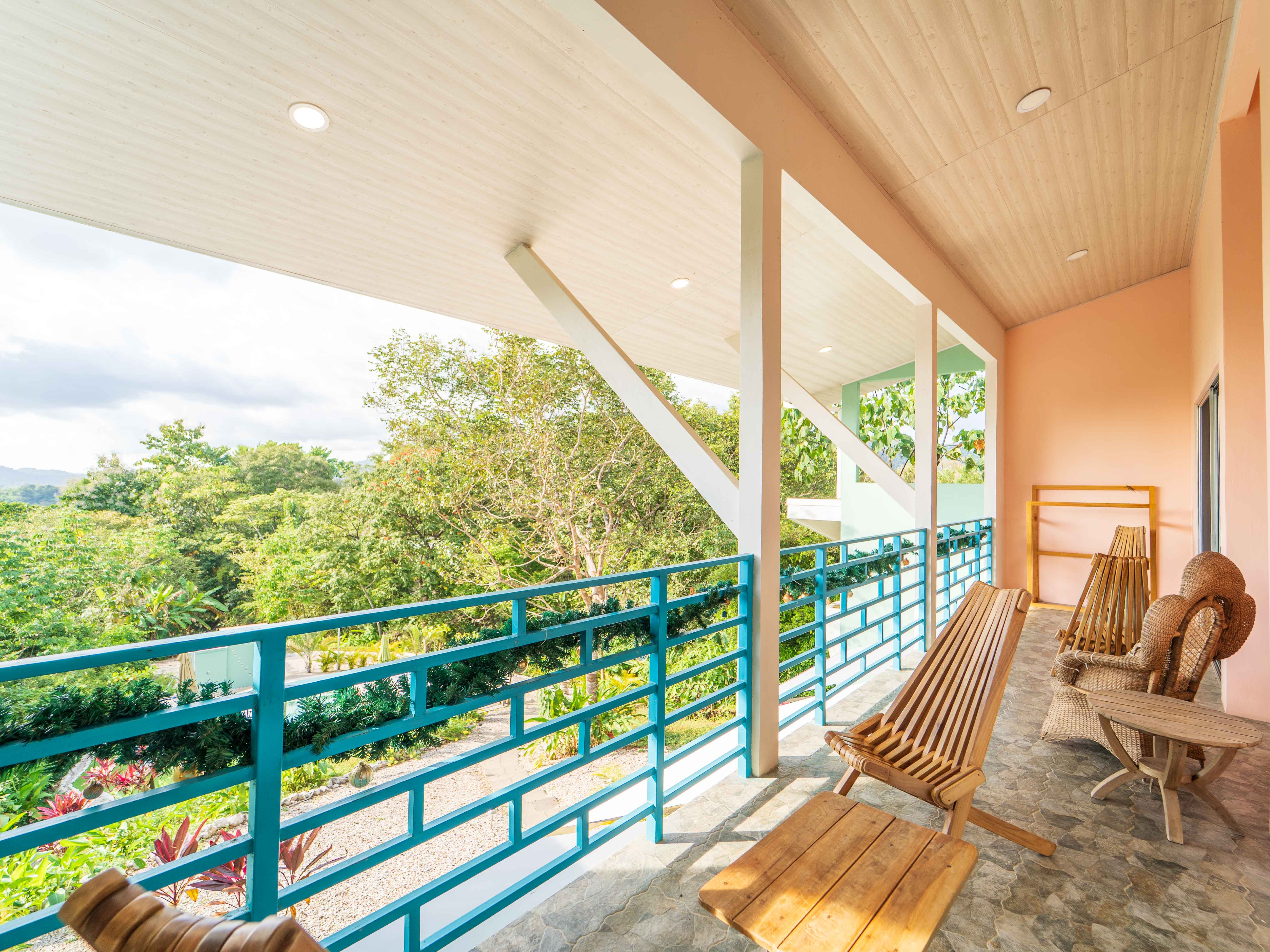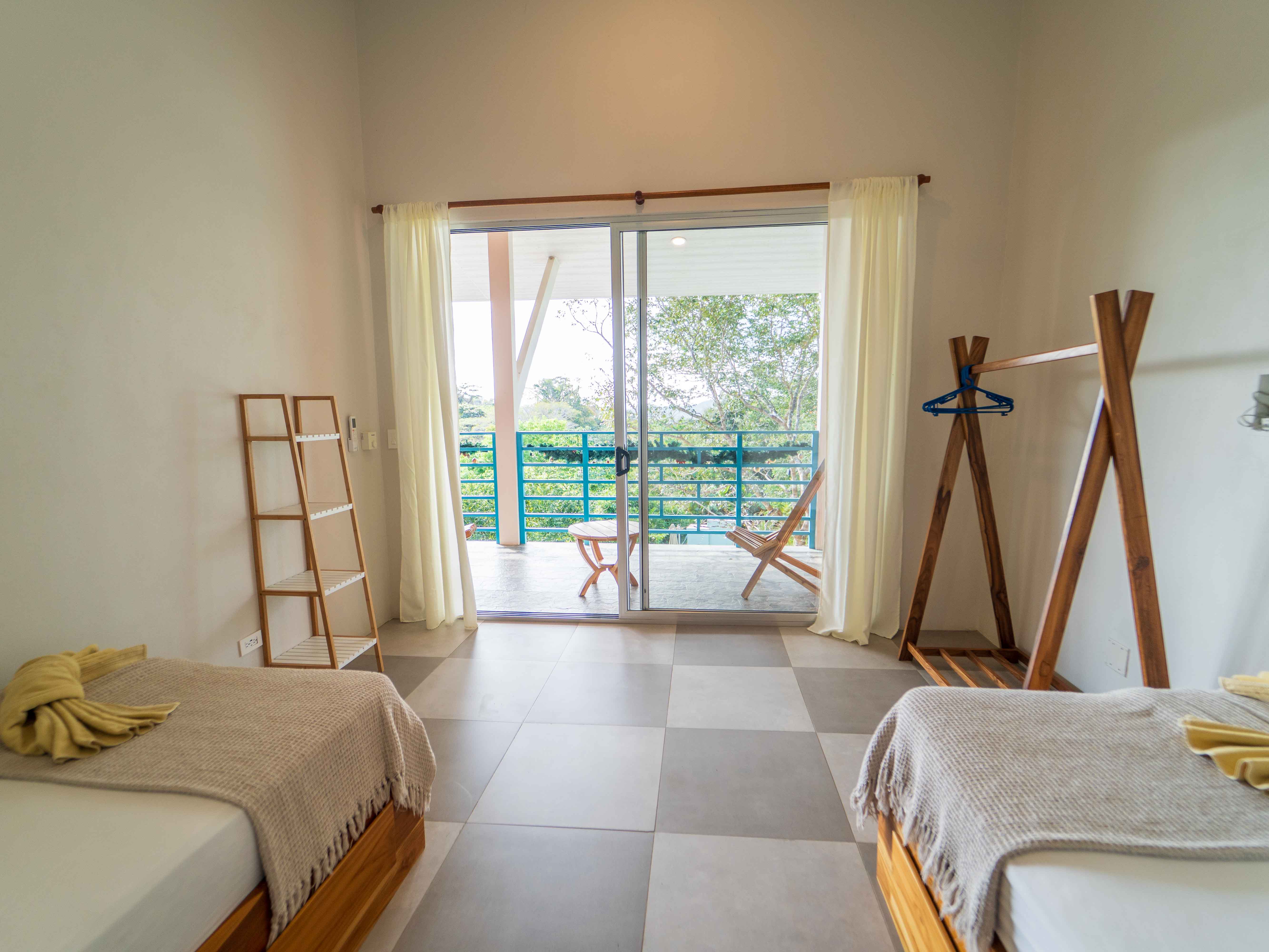The upper level hosts two more bedrooms—one with a king bed and the other with twin beds—both opening onto a large balcony with jungle and mountain views. These bedrooms share a well-appointed full bathroom, making the space ideal for families or groups.