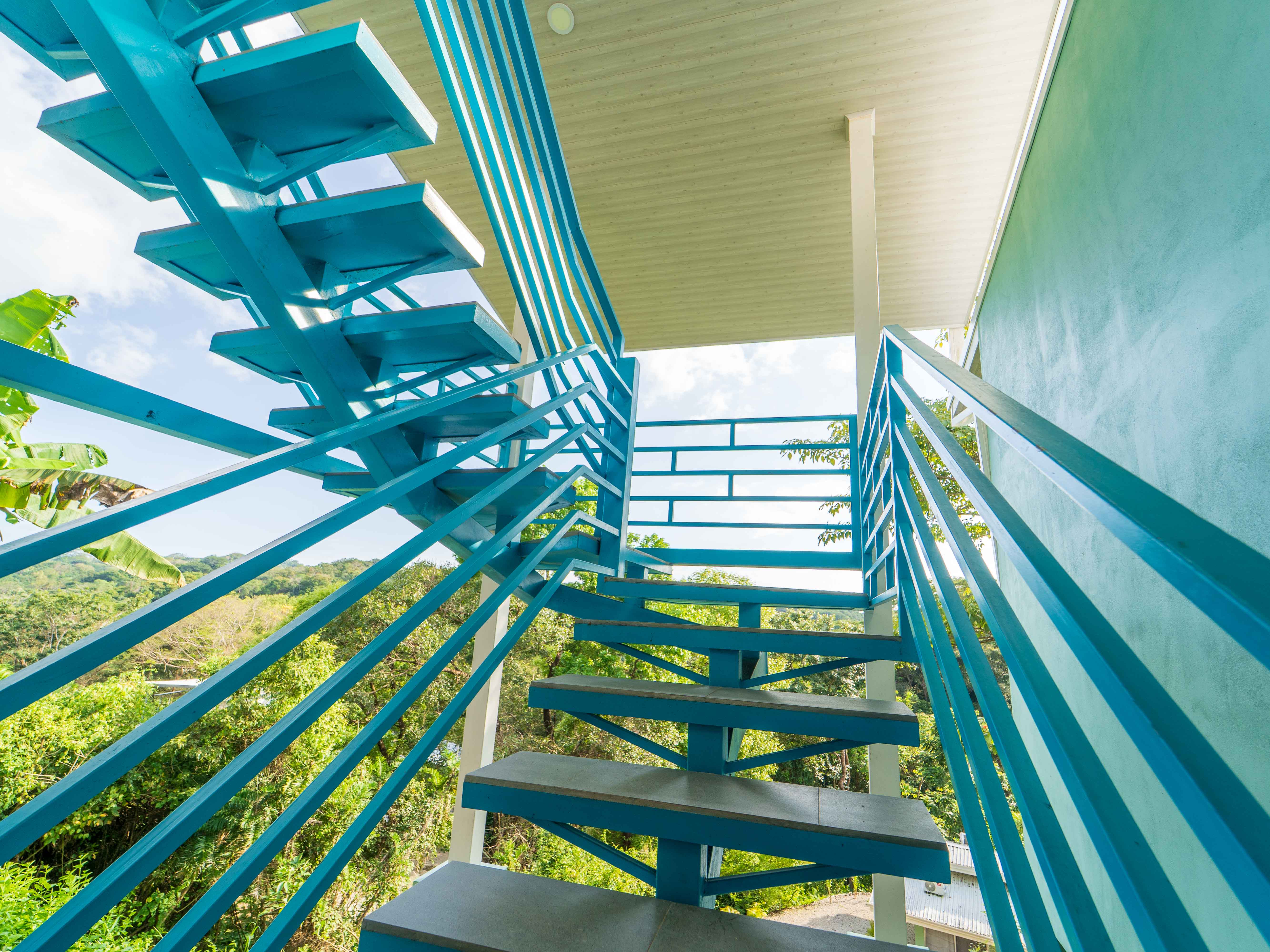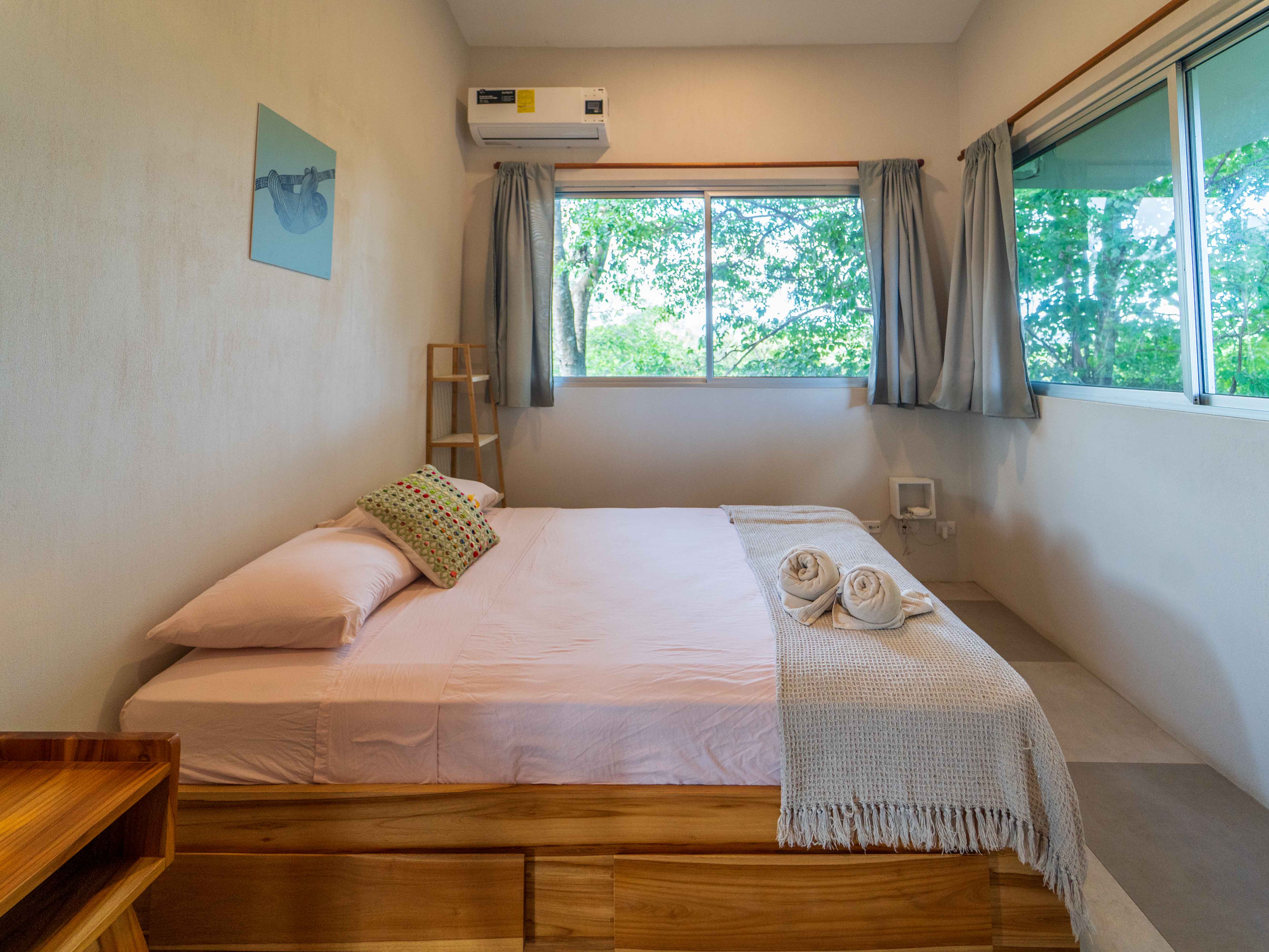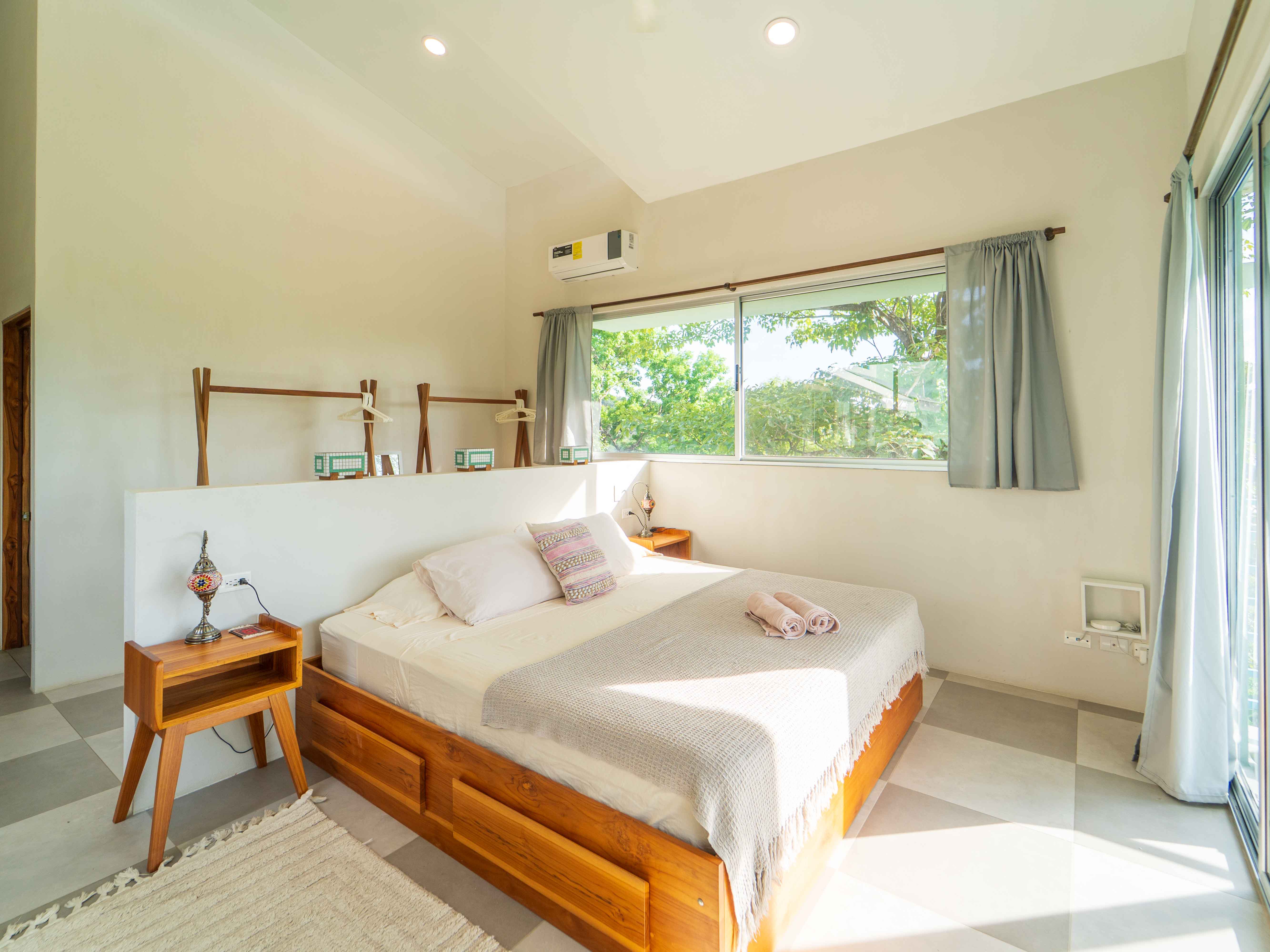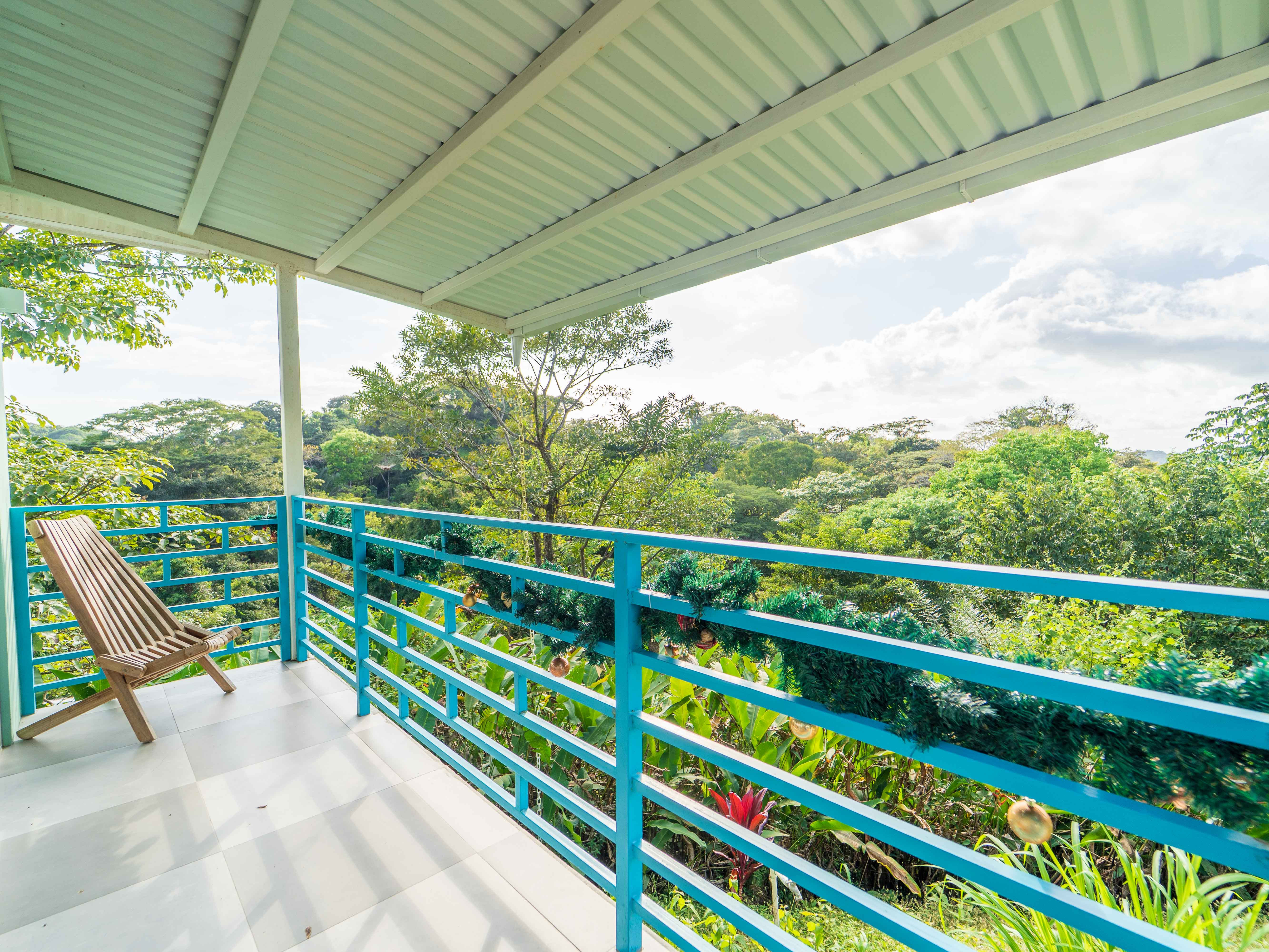 The upper level hosts two more bedrooms—one with a king bed and the other with twin beds—both opening onto a large balcony with jungle and mountain views. These bedrooms share a well-appointed full bathroom, making the space ideal for families or groups.