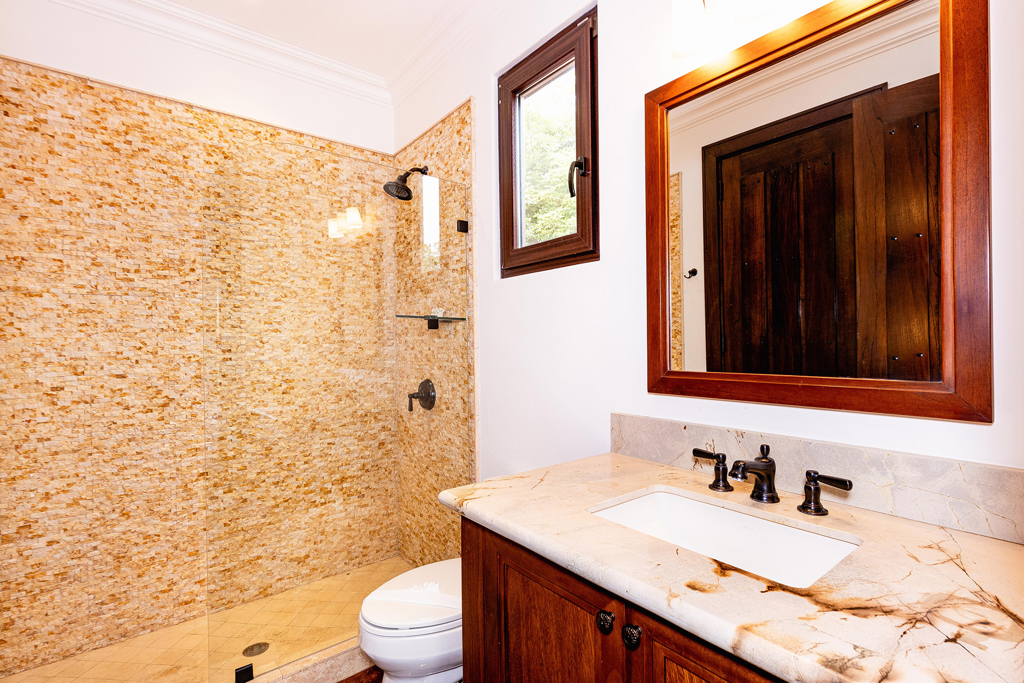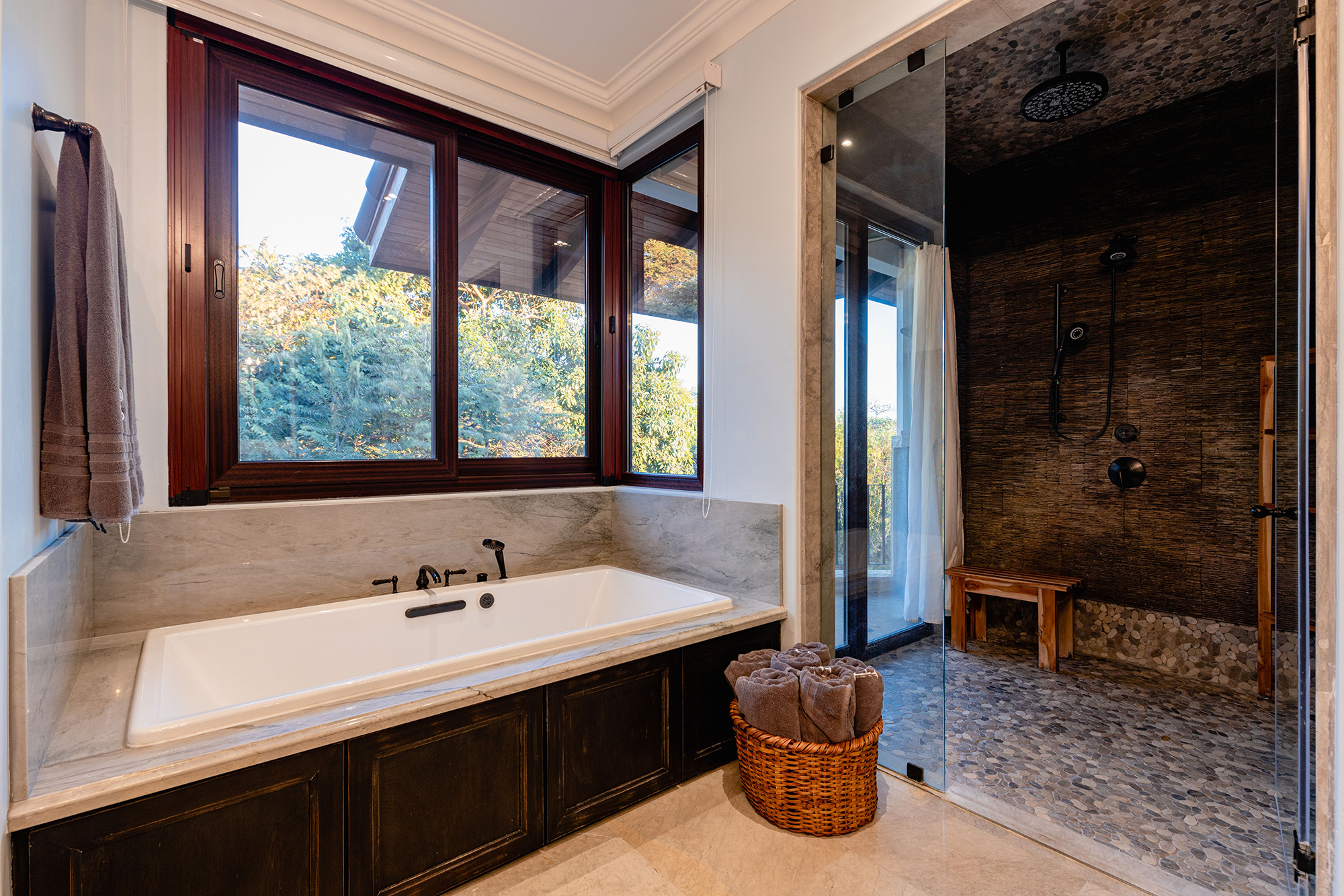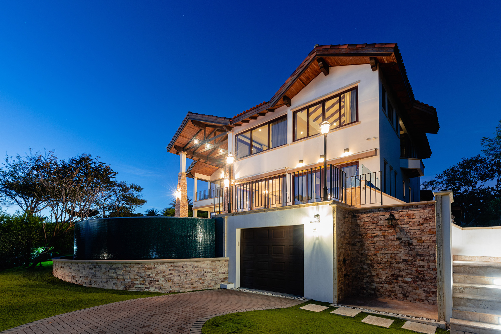 The home, designed by famous Palm Beach architects Colestock and Muir, and built by top Costa Rican firm, Cordoba Construction, is located at the most southern end of the community. You must pass through a minimum of two guarded gates to reach this estate home. Built with the highest of standards and exceptional attention to detail, this 5 bedrooms, 5.5 bathrooms property includes a full underground 1,000-bottle wine cellar, premium turf grass, a full-home electric generator, and the added protection of laser beam perimeter security. There are also 3 outside showers, 2 climate controlled garages and a full climate controlled basement. The master bedroom is completely glassed including a large sitting room with pocket back windows. The master bath has his and hers toilets and two walk in closets that double as safe rooms with stainless steel doors that are wrapped in wood.