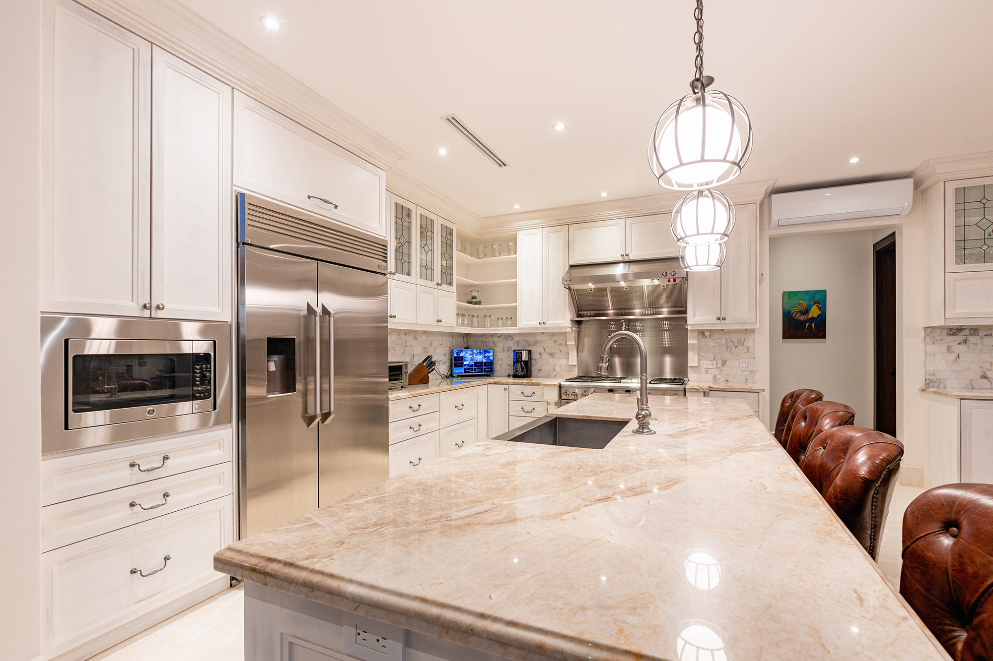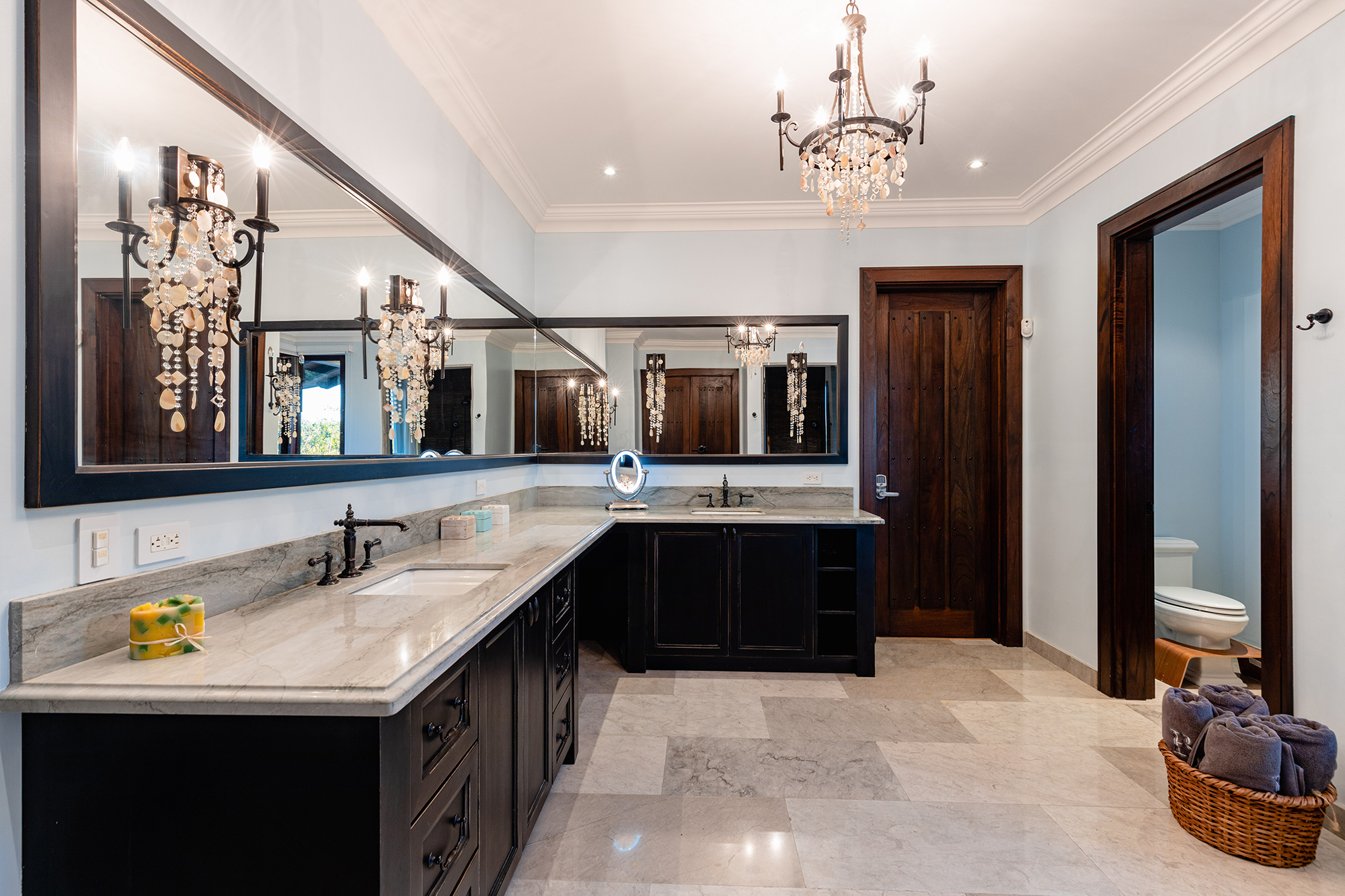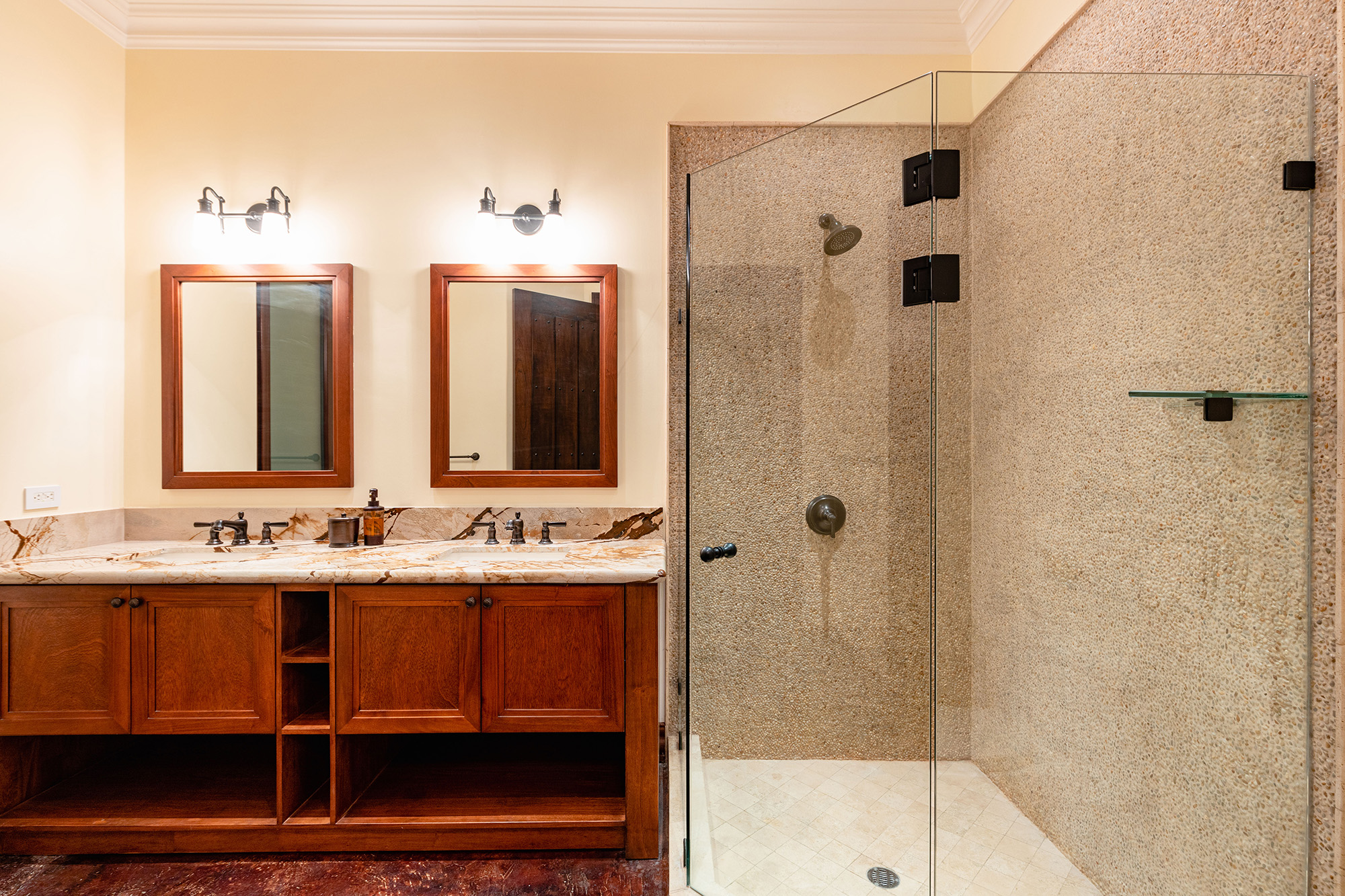 The home, designed by famous Palm Beach architects Colestock and Muir, and built by top Costa Rican firm, Cordoba Construction, is located at the most southern end of the community. You must pass through a minimum of two guarded gates to reach this estate home. Built with the highest of standards and exceptional attention to detail, this 5 bedrooms, 5.5 bathrooms property includes a full underground 1,000-bottle wine cellar, premium turf grass, a full-home electric generator, and the added protection of laser beam perimeter security. There are also 3 outside showers, 2 climate controlled garages and a full climate controlled basement. The master bedroom is completely glassed including a large sitting room with pocket back windows. The master bath has his and hers toilets and two walk in closets that double as safe rooms with stainless steel doors that are wrapped in wood.