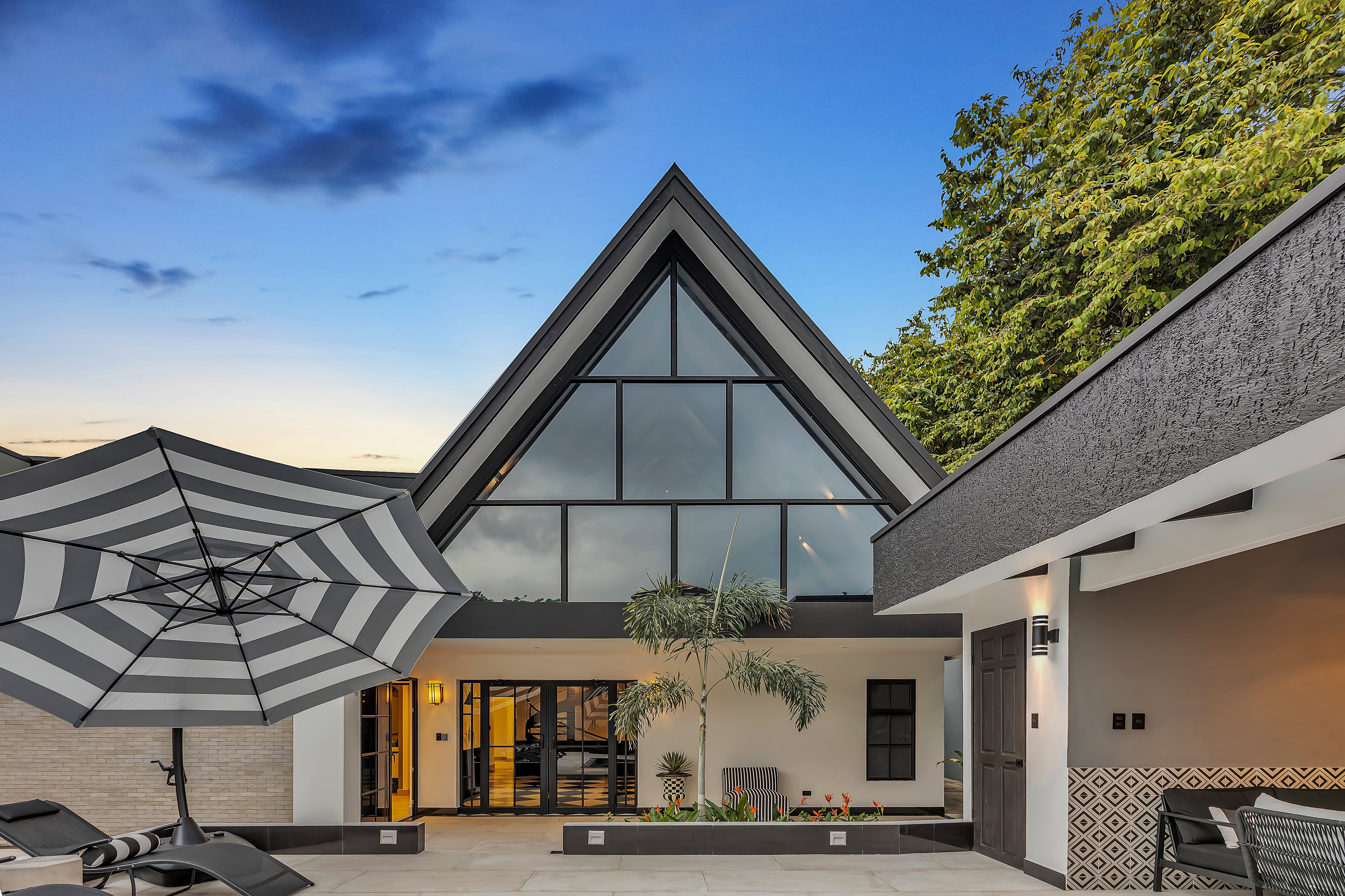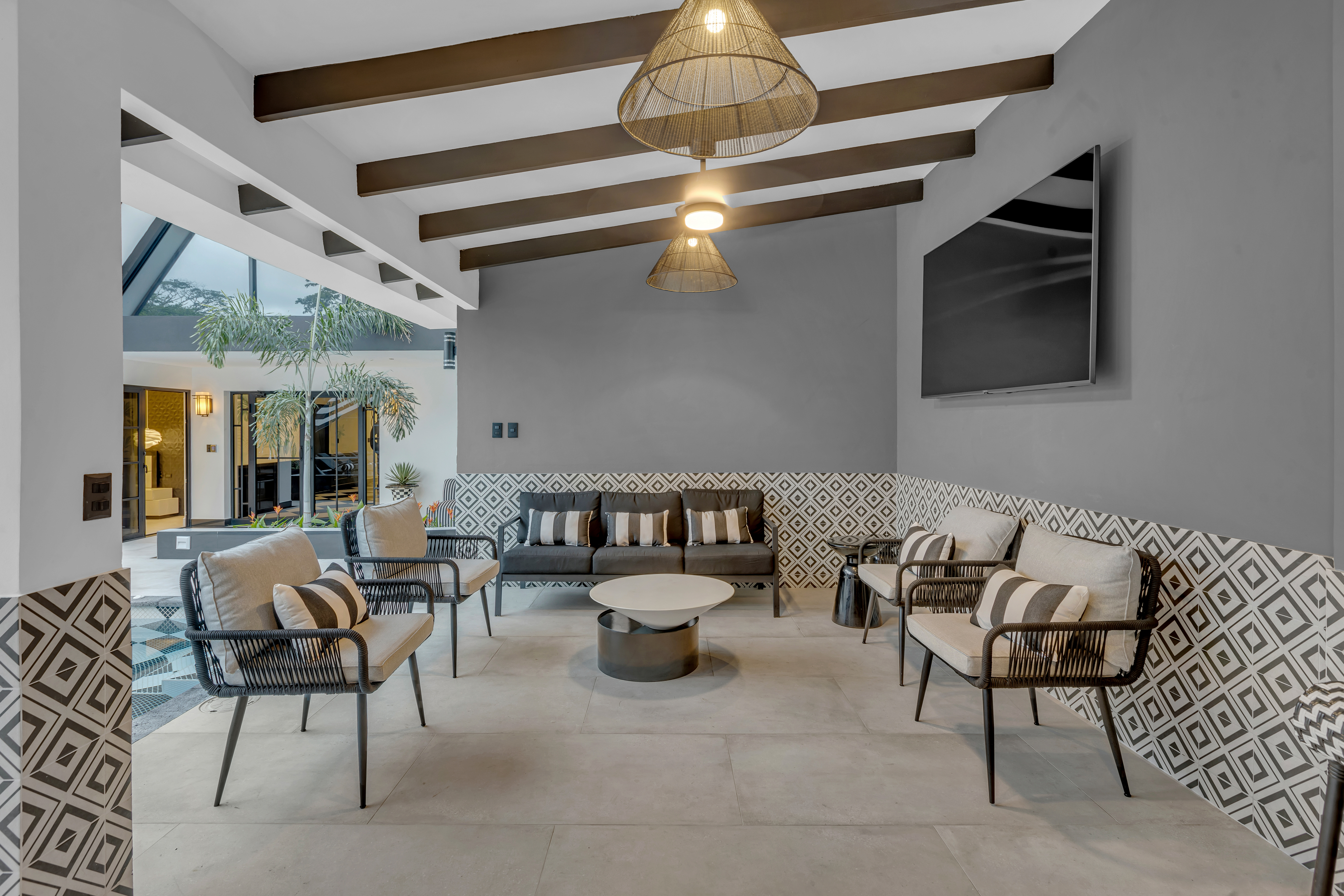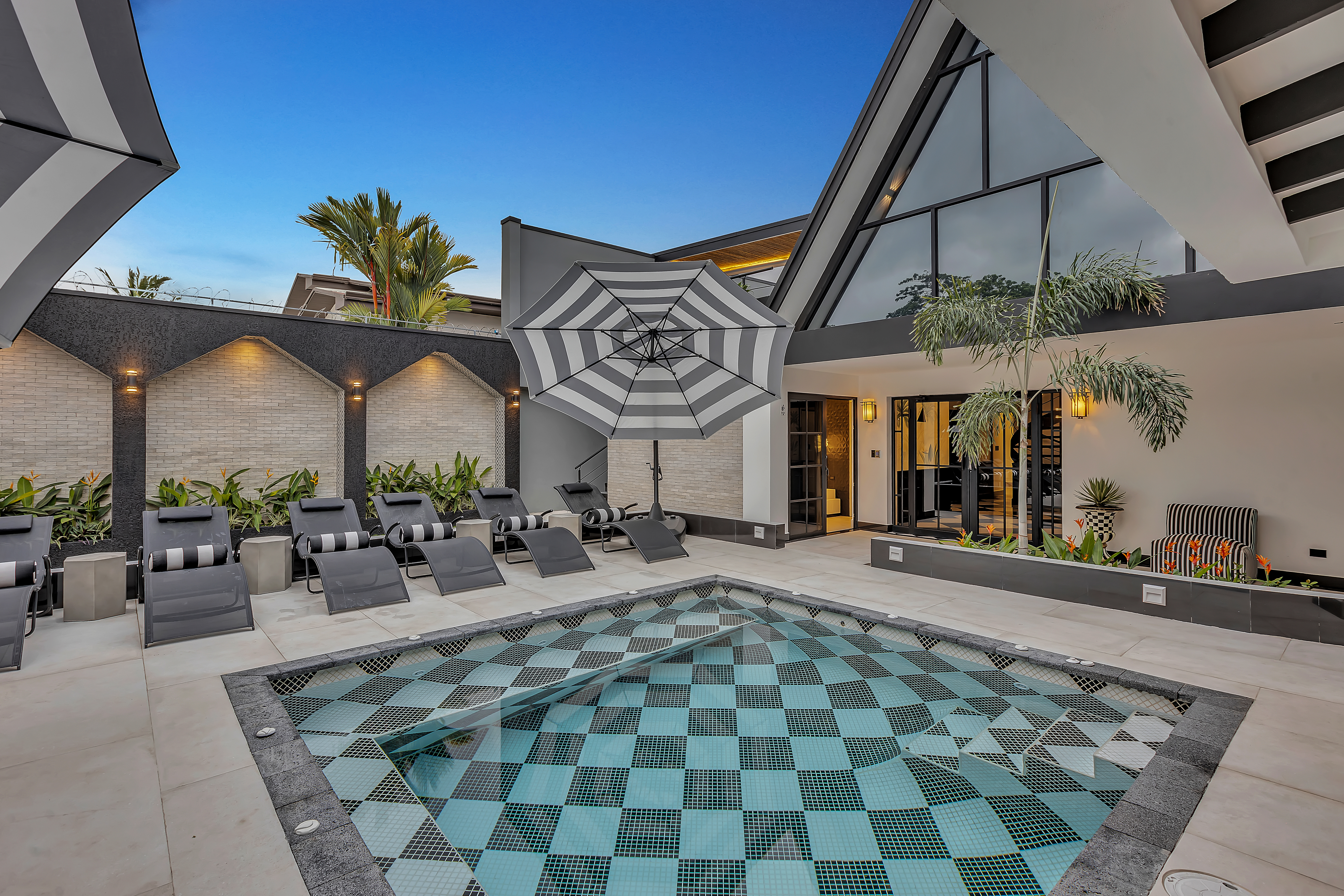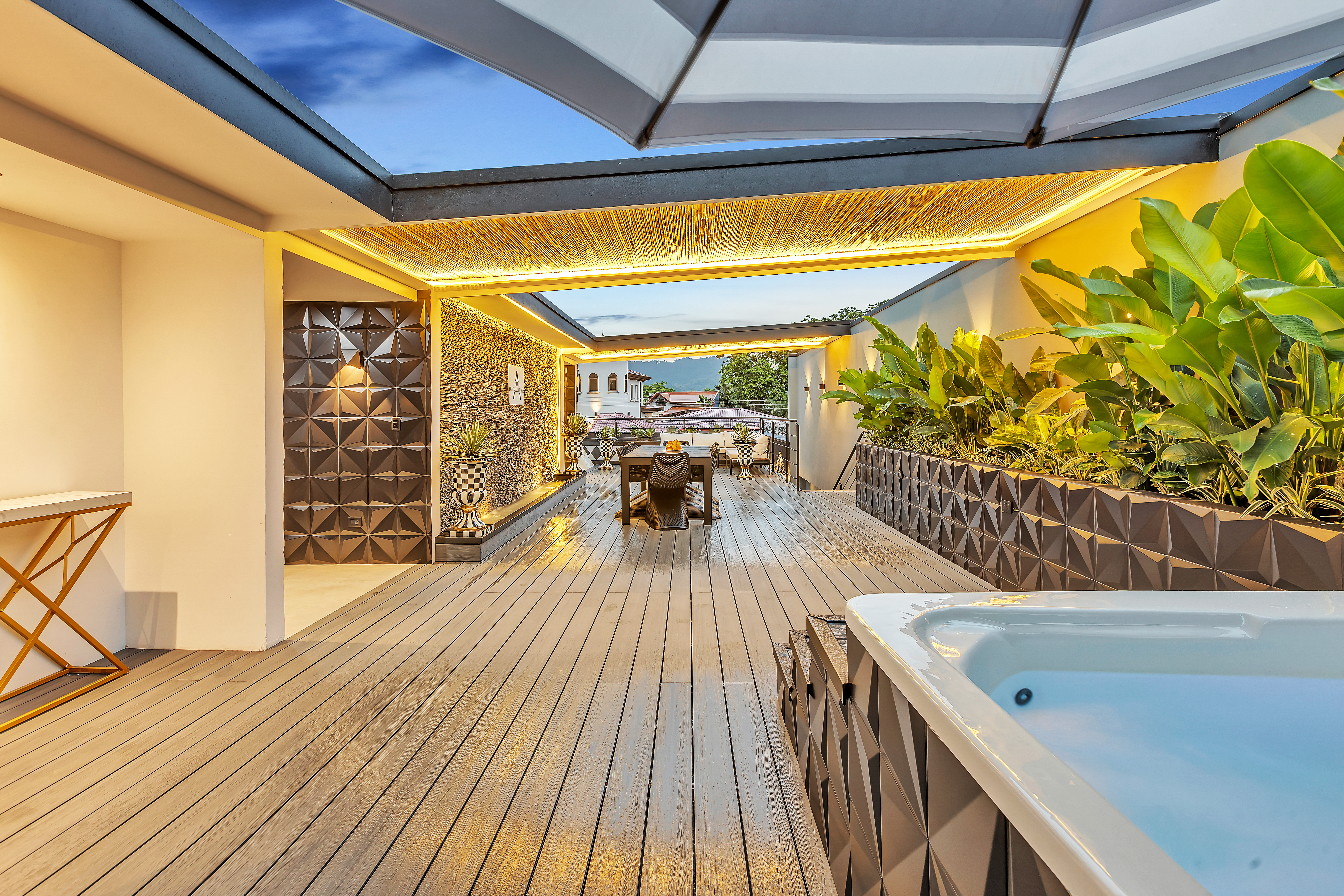 đ€ About the Villa Black & White: A luxury estate where sophisticated design meets natural tranquility. The villaâs sleek interiors, polished finishes, and minimalist style are balanced by the warmth of wood accents and the lush tropical setting. Upstairs, the oversized entertainment deck features a waterfall wall and ambient lightingâperfect for hosting dinners under the stars. The rooftop jacuzzi offers panoramic views of the surrounding hills and skyline.