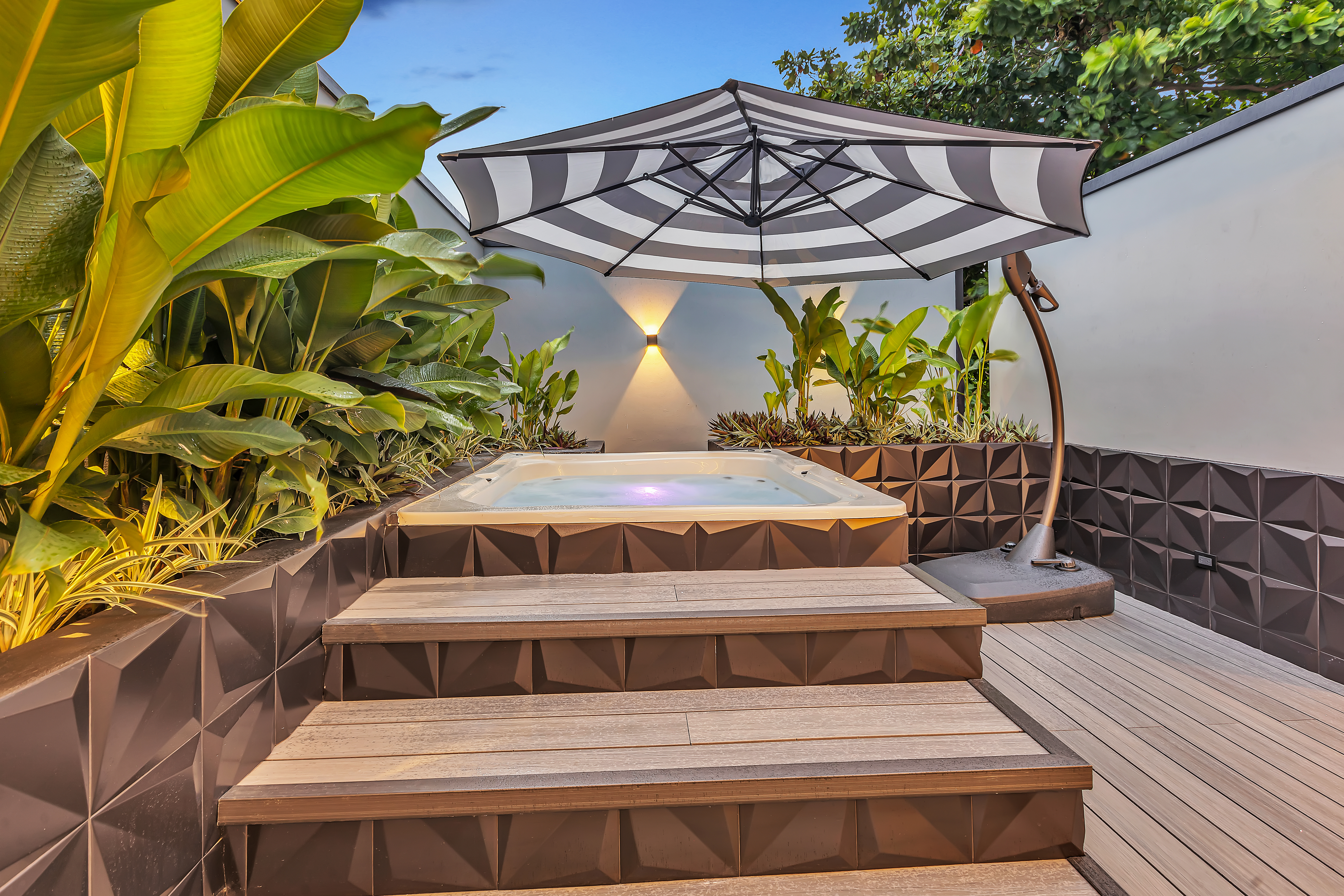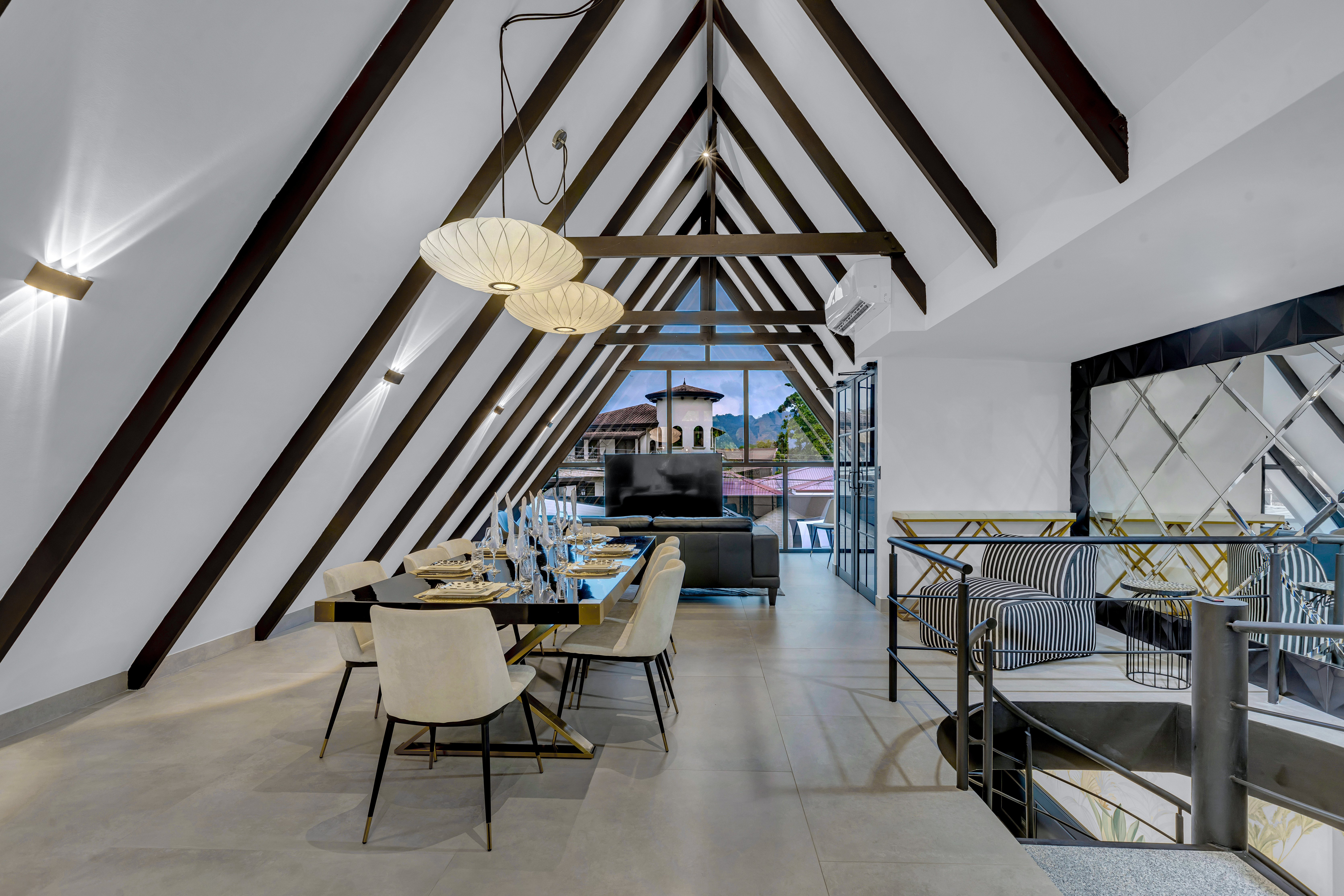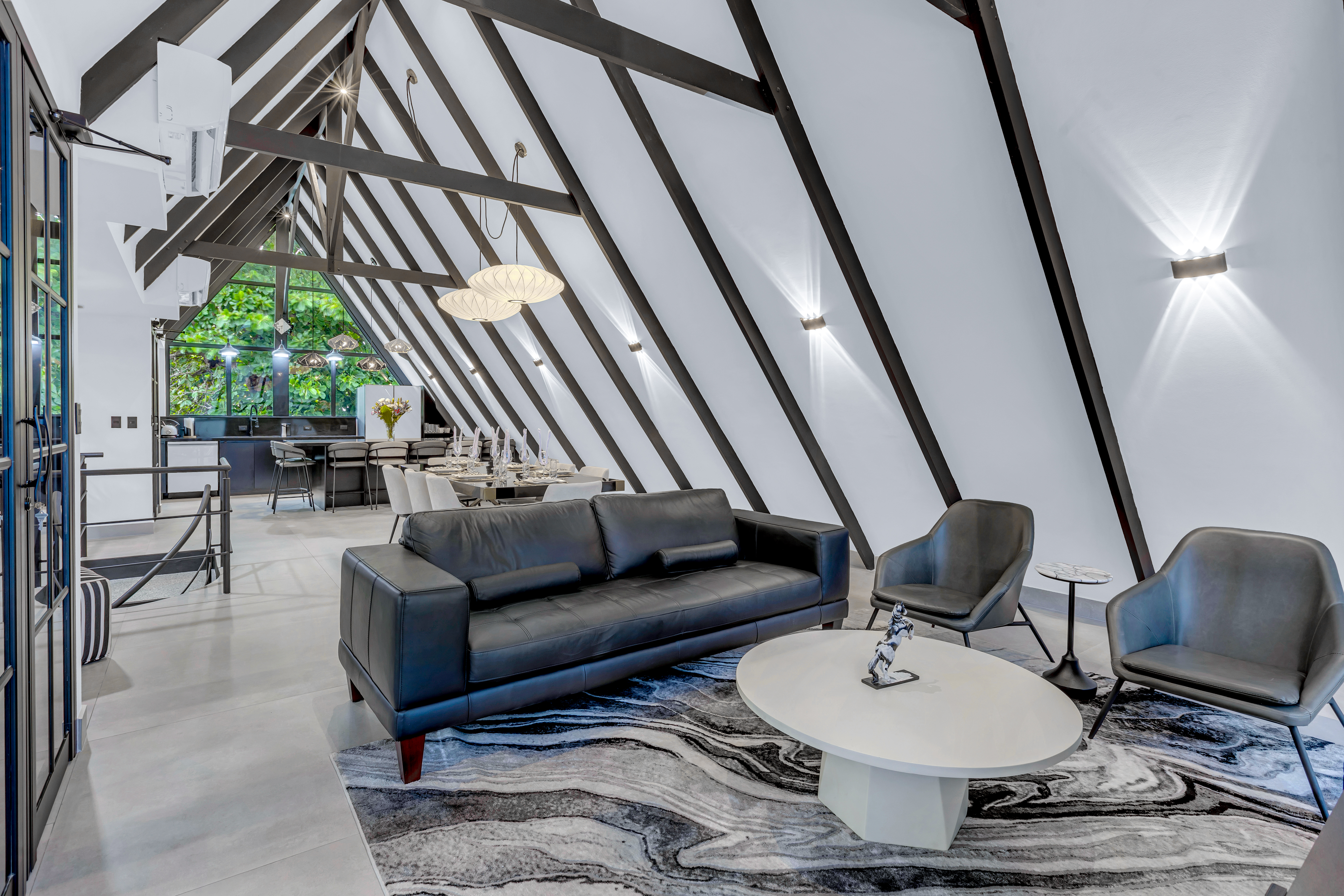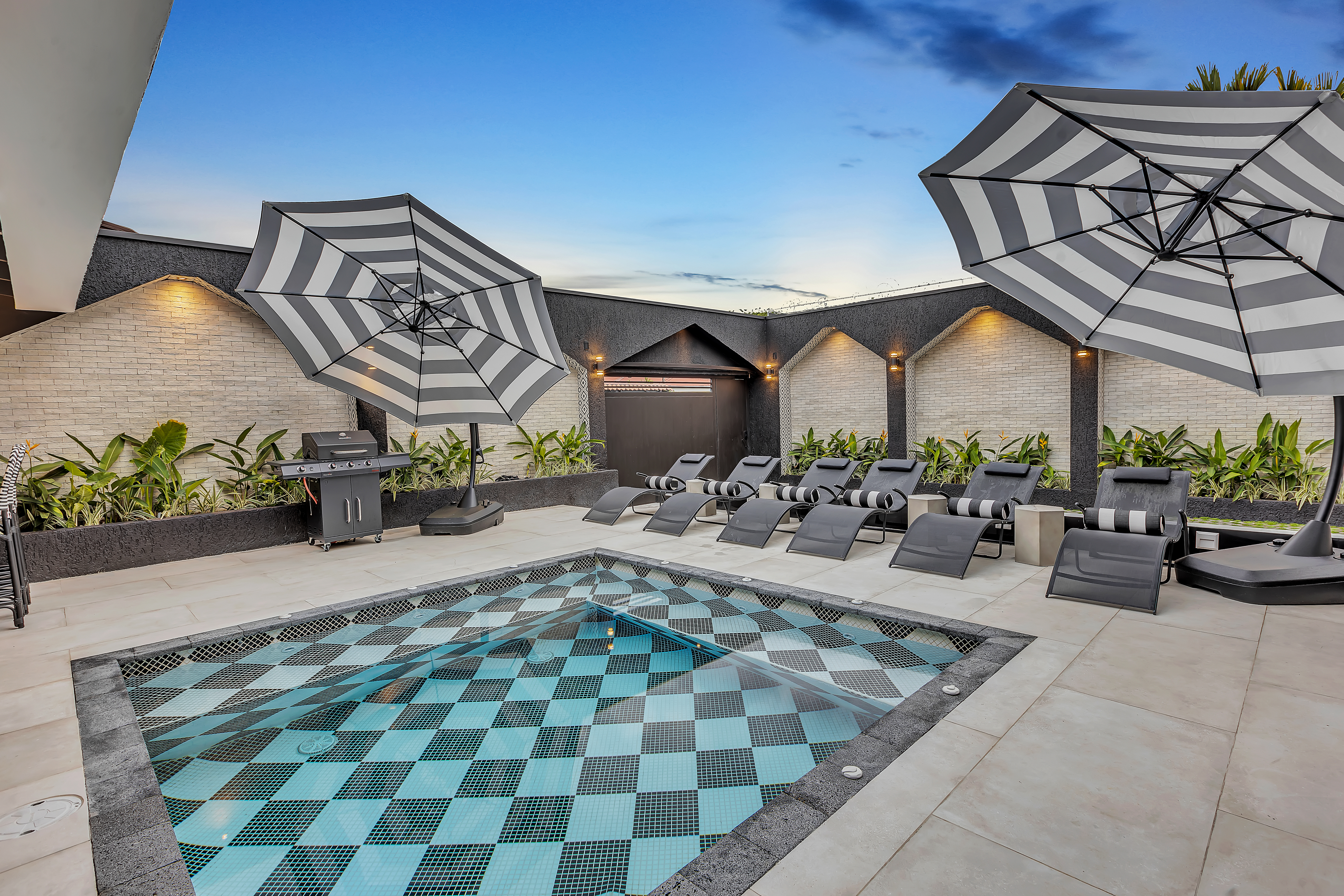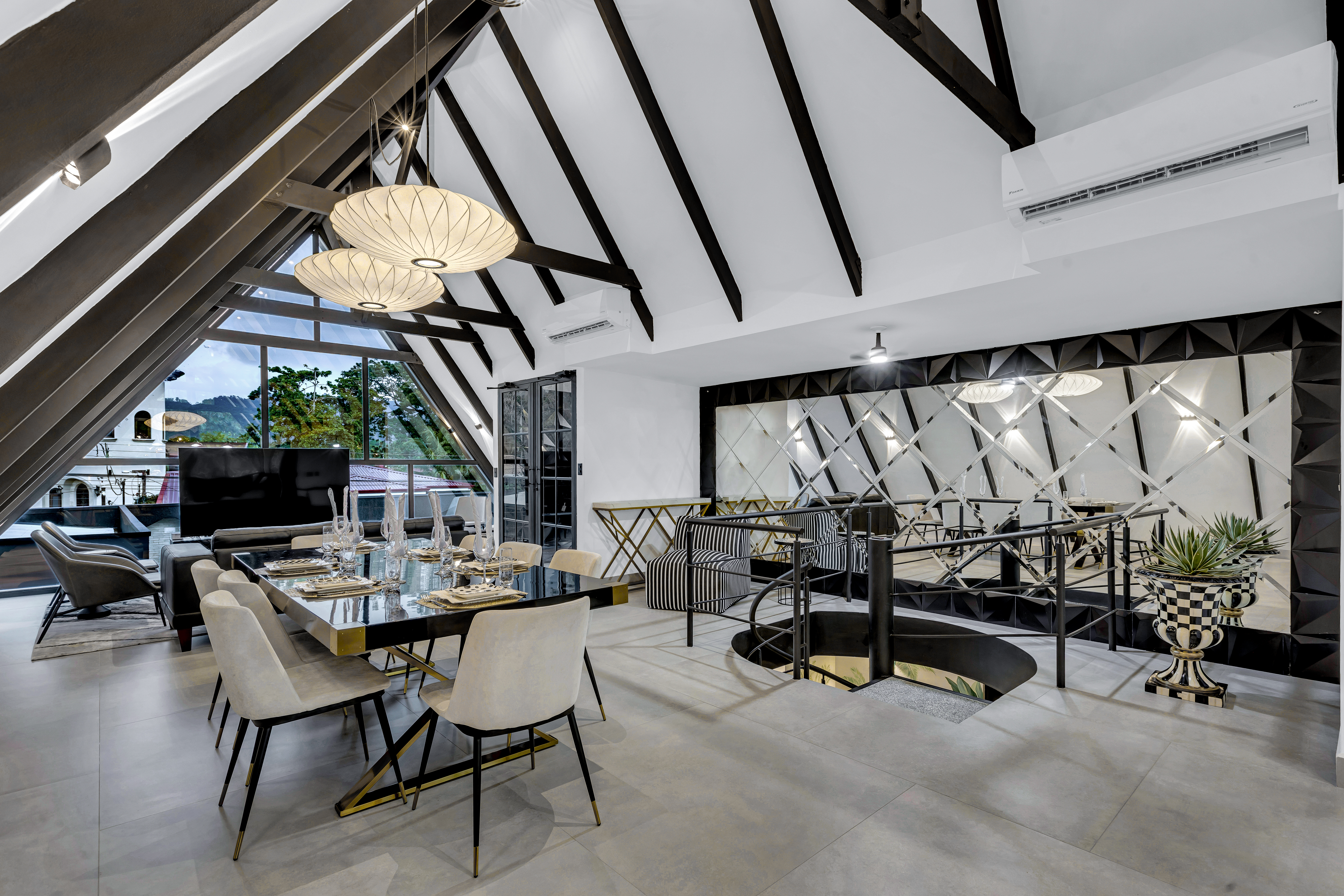 đ€ About the Villa Black & White: A luxury estate where sophisticated design meets natural tranquility. The villaâs sleek interiors, polished finishes, and minimalist style are balanced by the warmth of wood accents and the lush tropical setting. Upstairs, the oversized entertainment deck features a waterfall wall and ambient lightingâperfect for hosting dinners under the stars. The rooftop jacuzzi offers panoramic views of the surrounding hills and skyline.