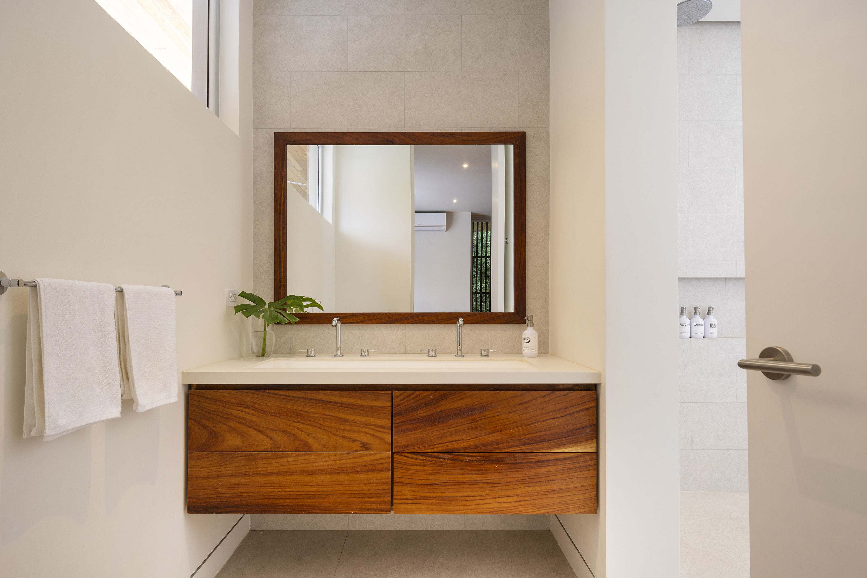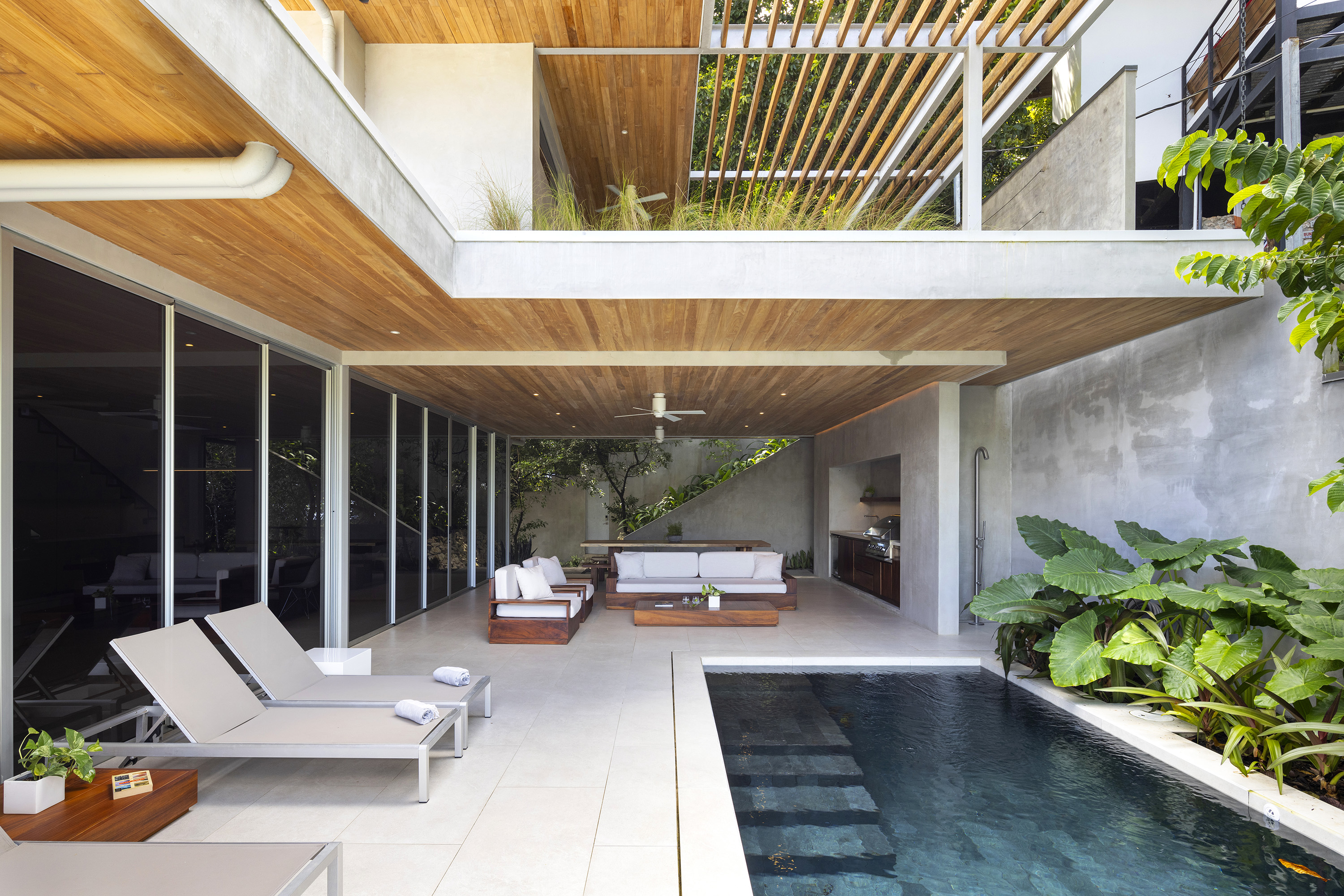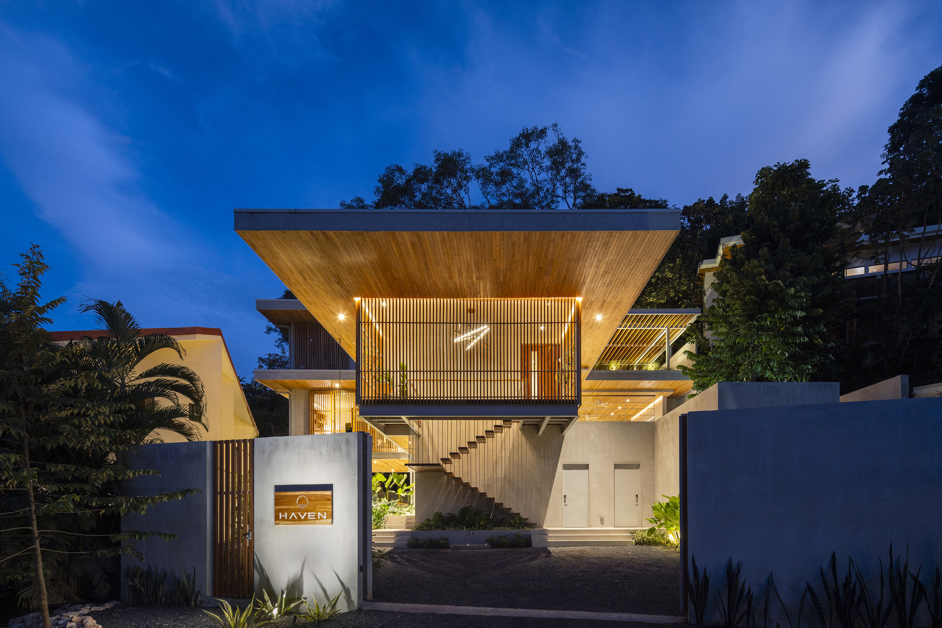 Casa Haven. Modern luxury property with two independent living units on an 829 m² lot, just a 6-minute walk to Playa Pelada and 12 minutes to Playa Guiones. The ground-floor villa features 2 bedrooms, 2 bathrooms, a fully equipped kitchen, a covered outdoor living area, and a private plunge pool. The main residence, spanning the upper two floors, includes 4 bedrooms, 4.5 bathrooms, expansive open-concept living spaces, and a 10’ x 42’ lap pool with an outdoor entertaining area.