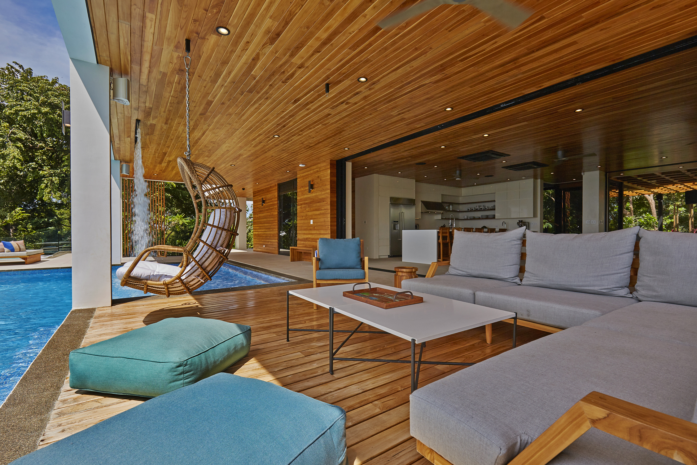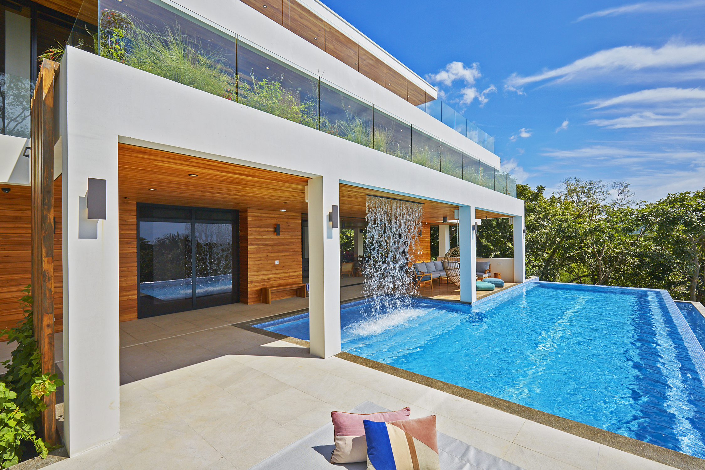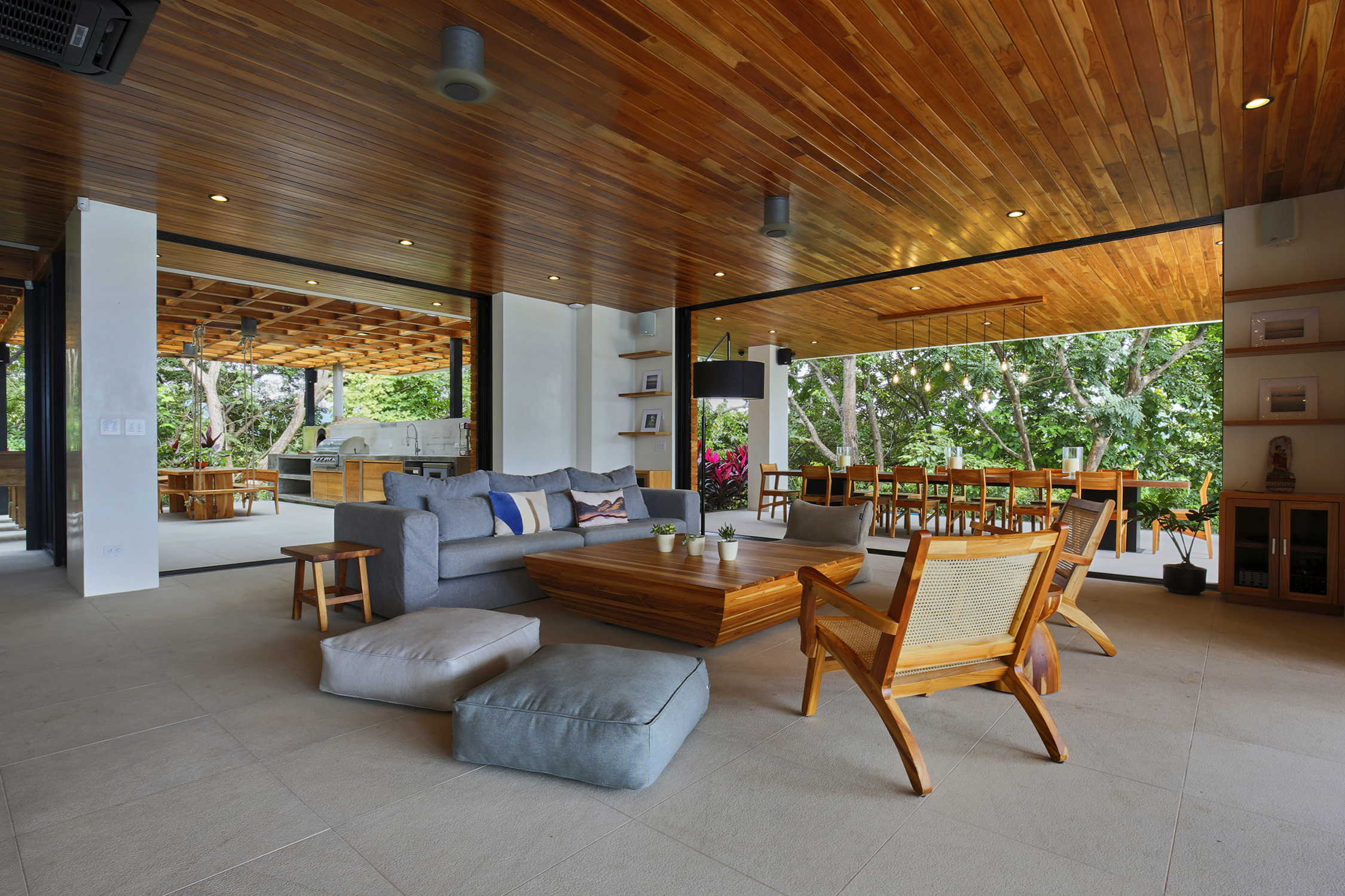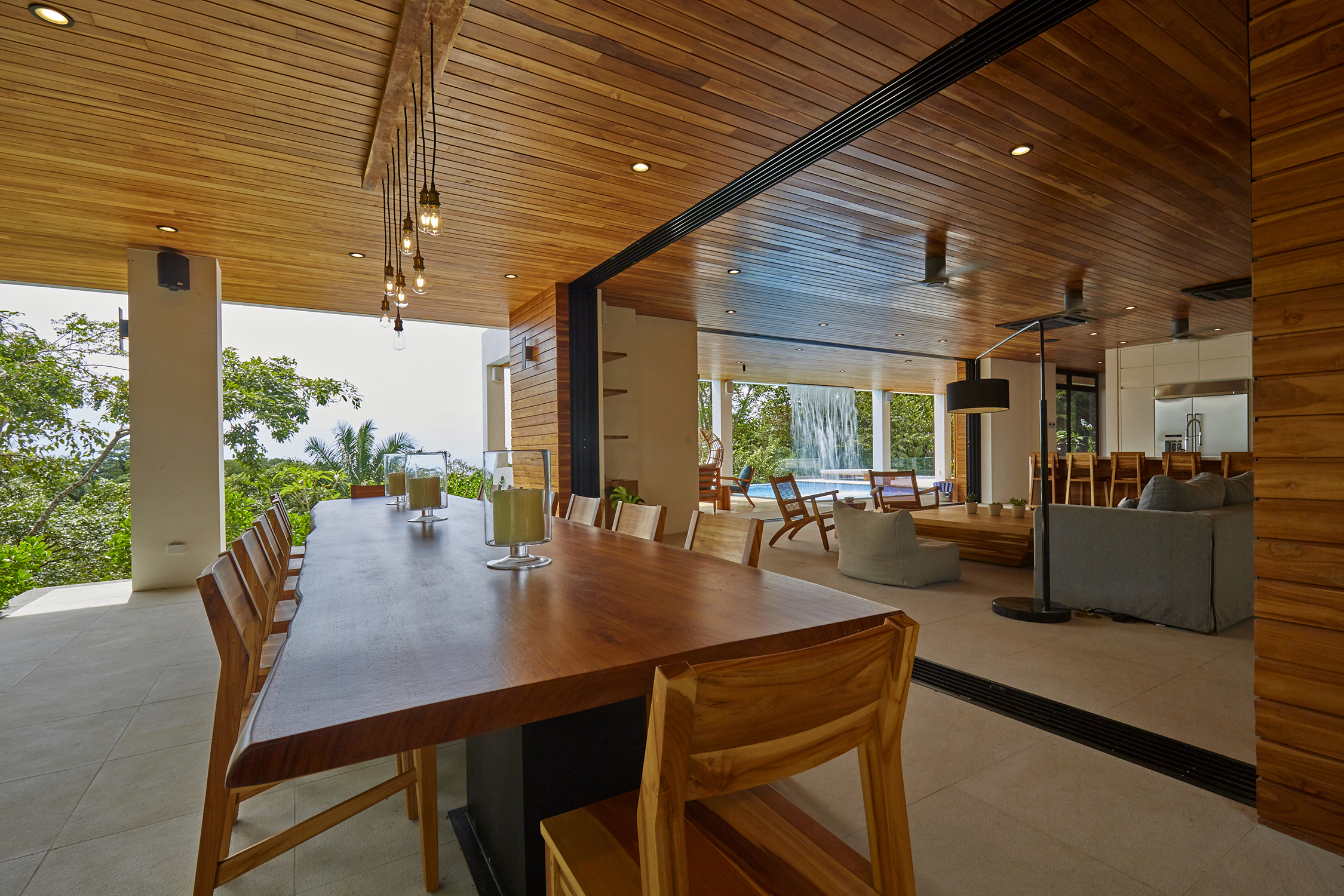 On the first floor, you have an expansive pool deck, fully equipped with a hot tub and your own waterfall. The massive sliding glass door opens the entire kitchen and living space to the outdoors so you can simply enjoy with the family or fiesta with a ton of your friends. The rear of the home opens up to the jungle with an incredible barbeque area equipped with your own covered organic garden for home grown herbs and veggies. Cater a private dinner and enjoy the experience with eighteen of your friends at the gigantic locally made dining room table.