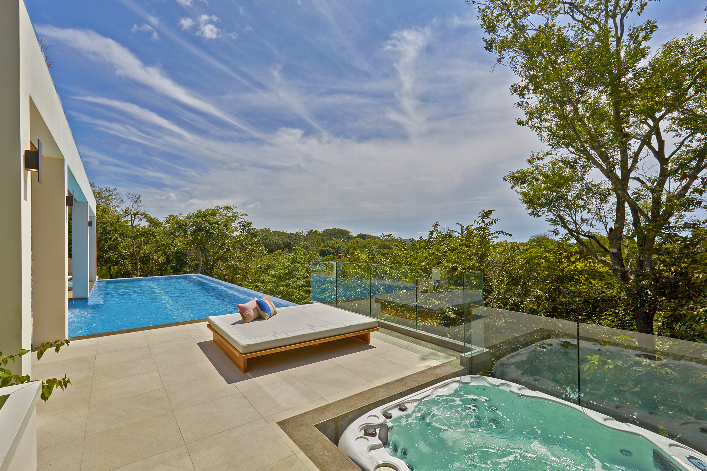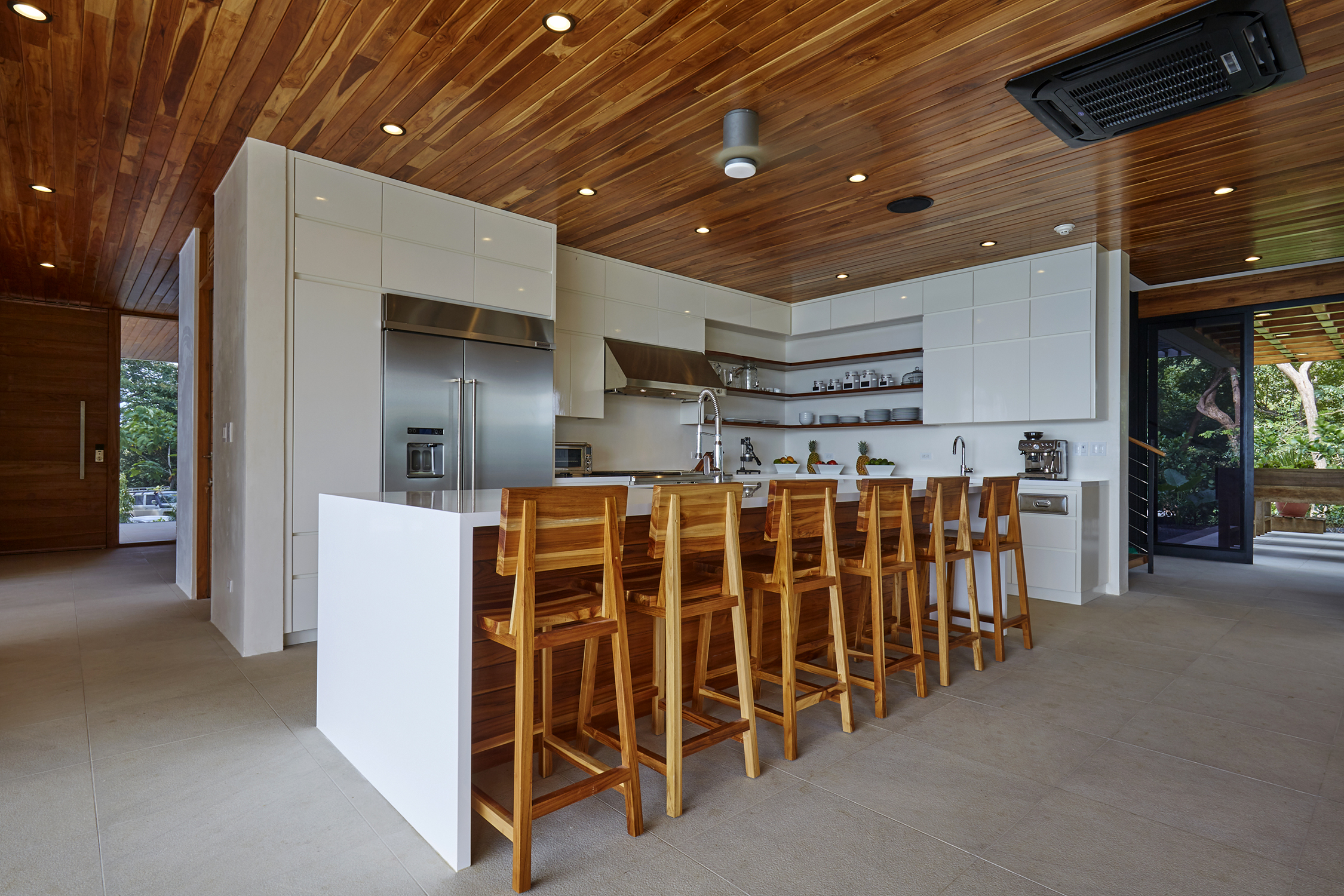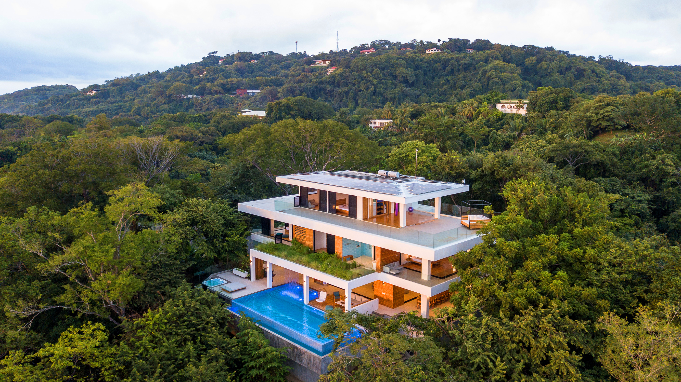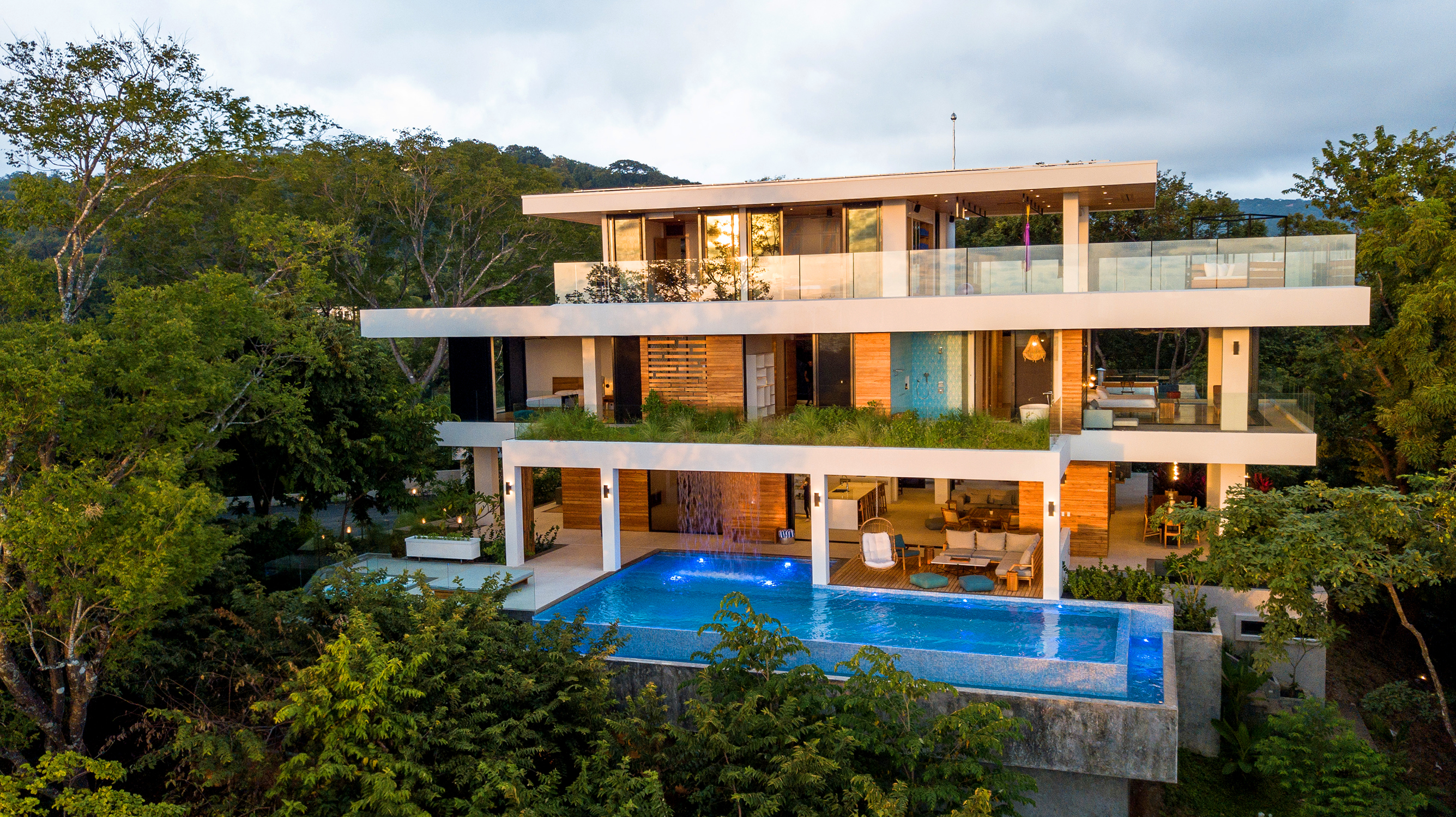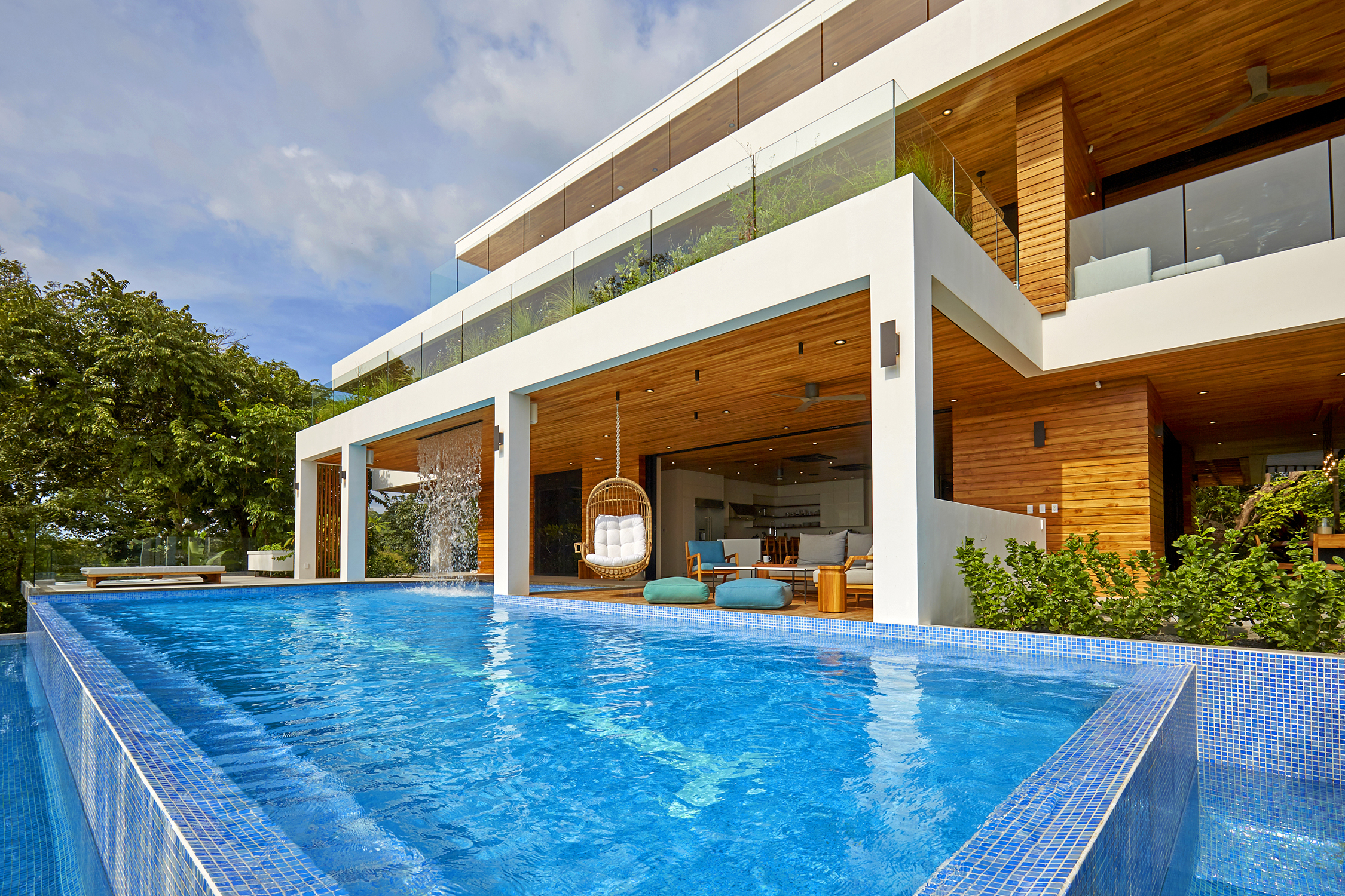 On the first floor, you have an expansive pool deck, fully equipped with a hot tub and your own waterfall. The massive sliding glass door opens the entire kitchen and living space to the outdoors so you can simply enjoy with the family or fiesta with a ton of your friends. The rear of the home opens up to the jungle with an incredible barbeque area equipped with your own covered organic garden for home grown herbs and veggies. Cater a private dinner and enjoy the experience with eighteen of your friends at the gigantic locally made dining room table.