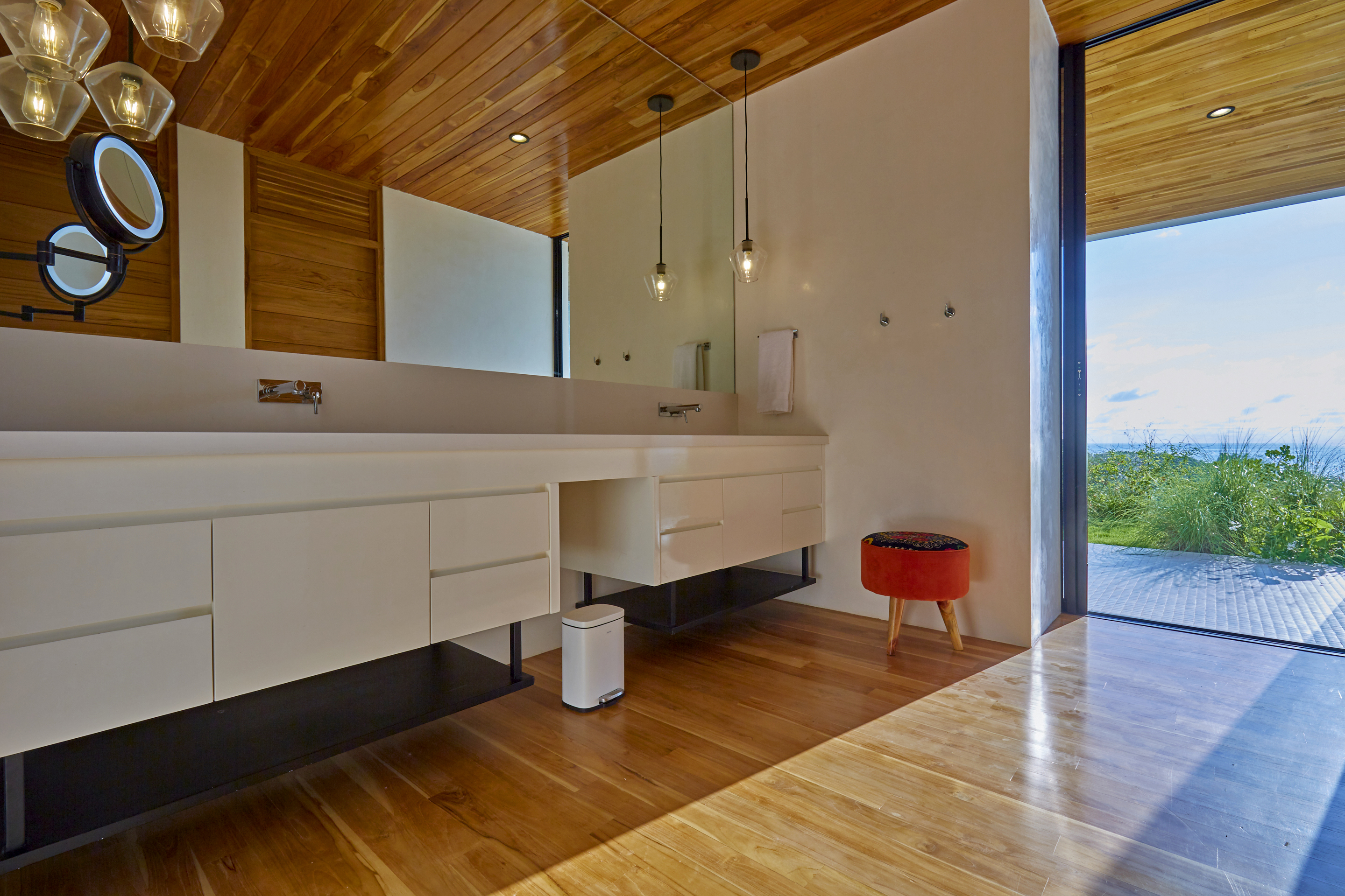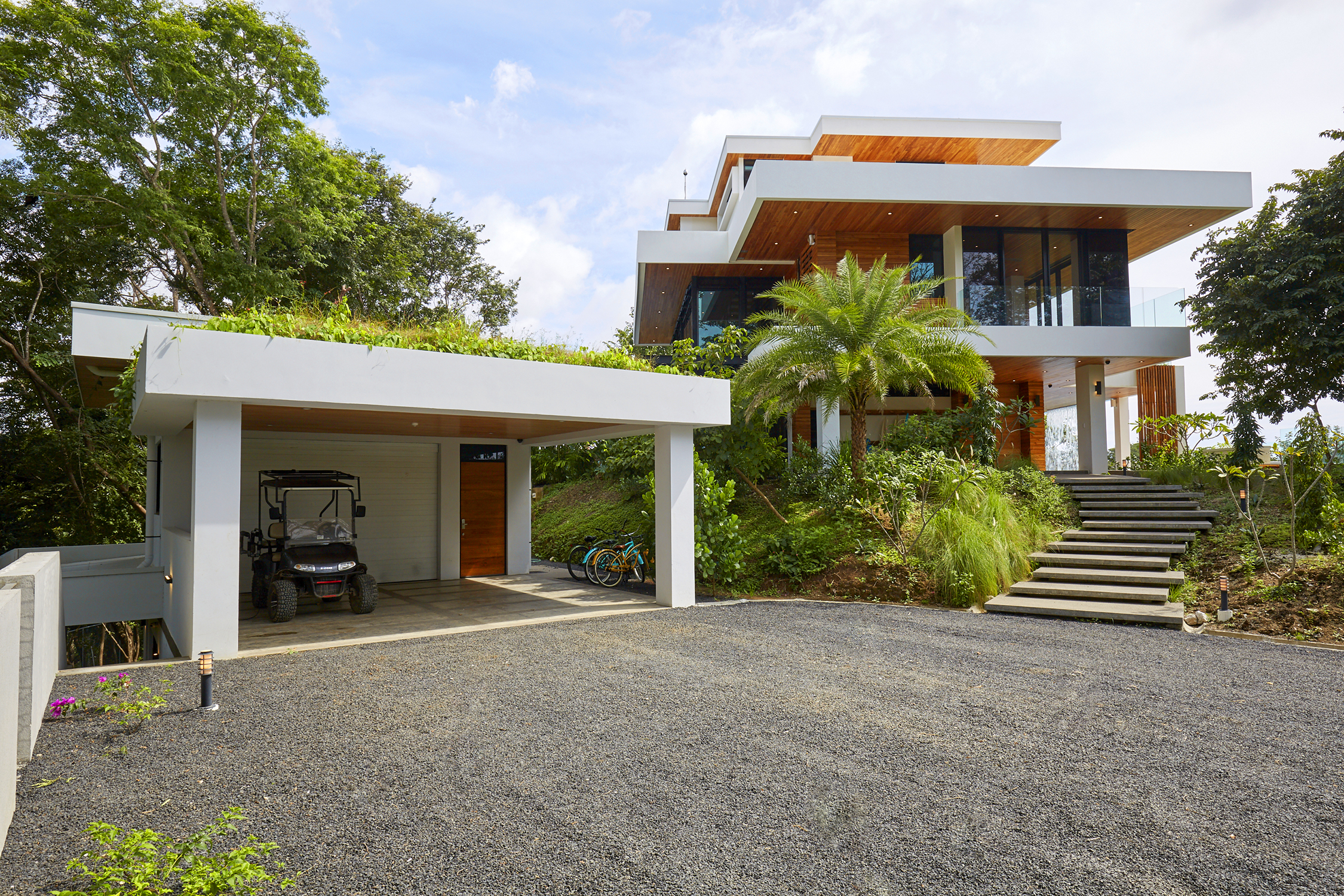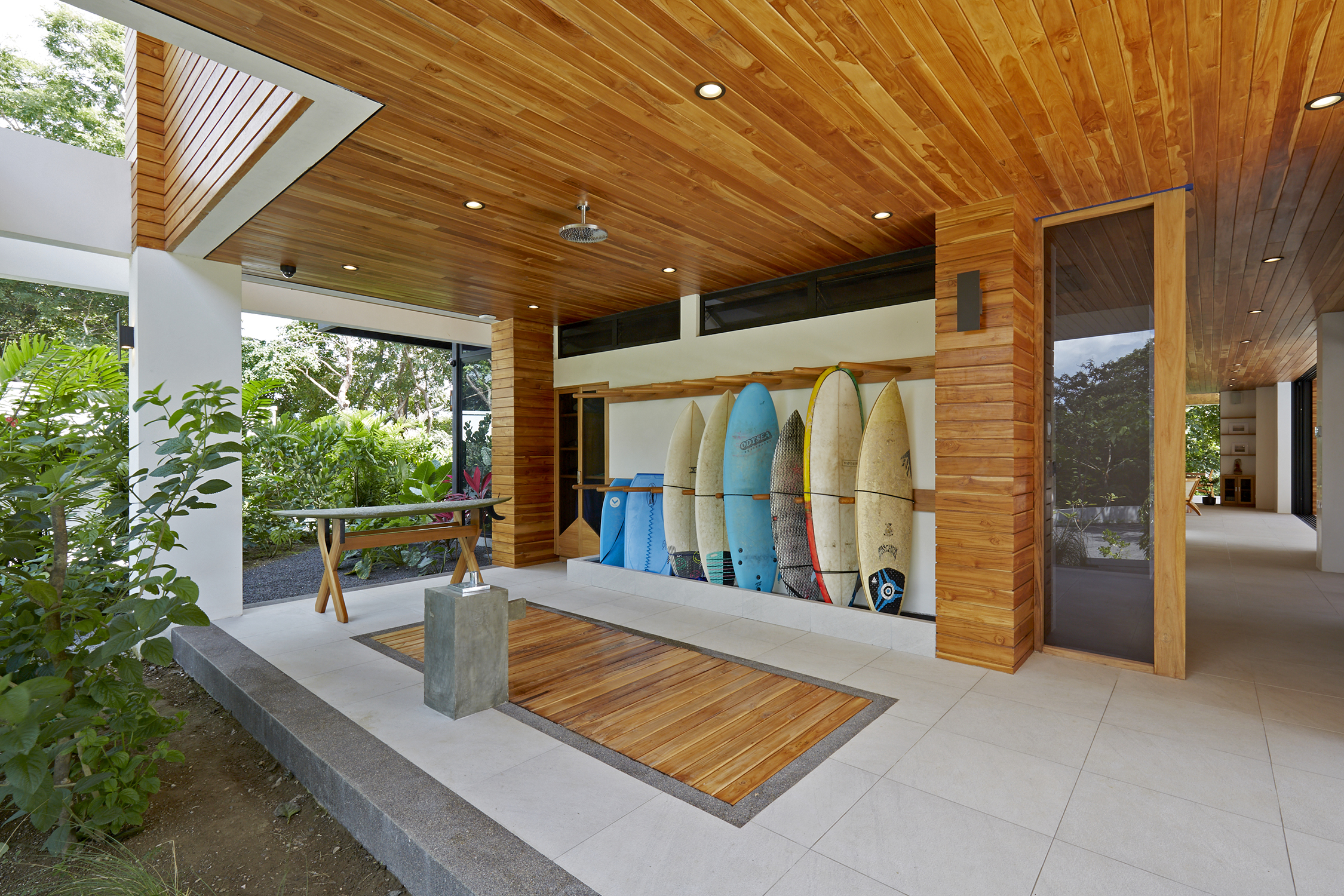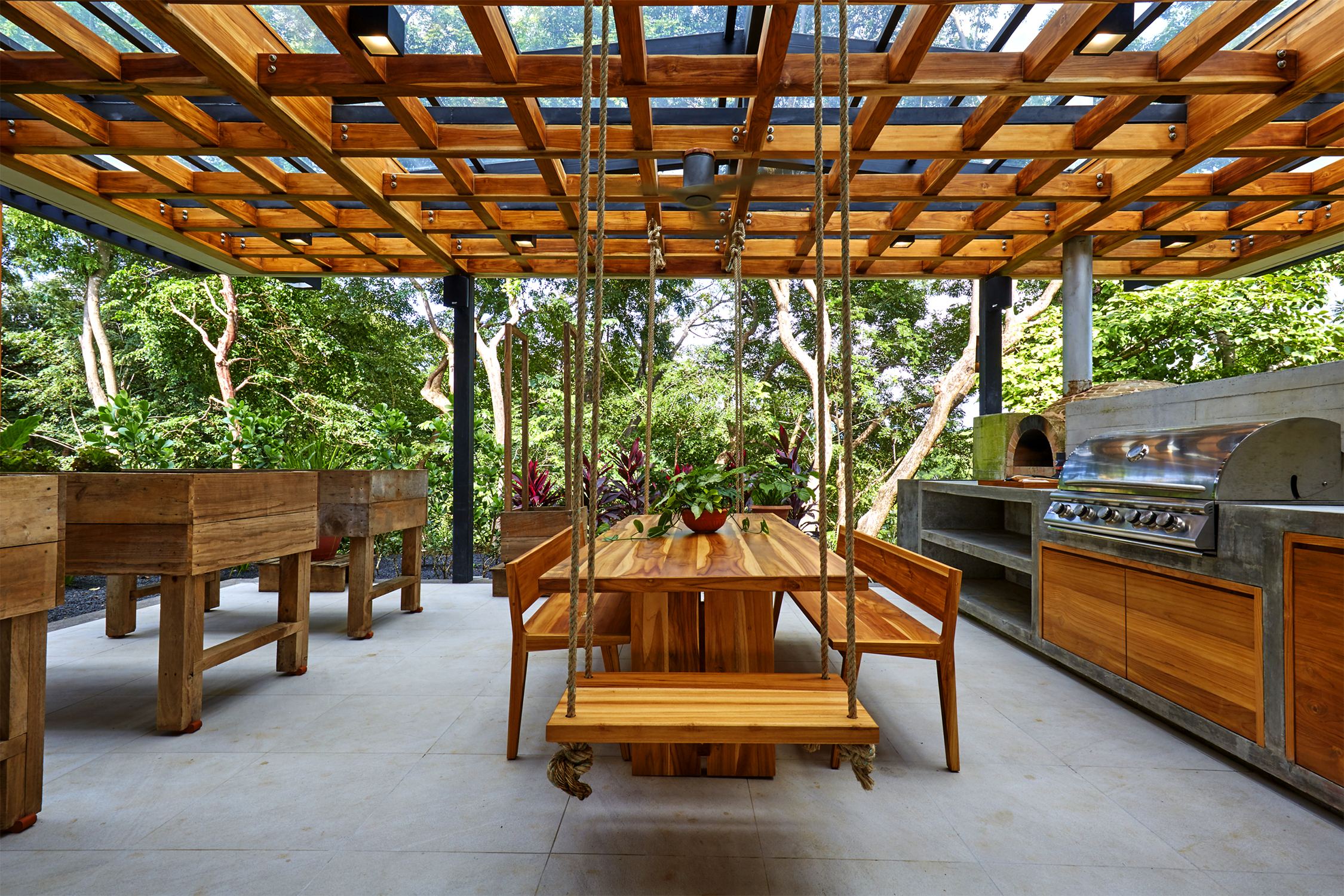 On the first floor, you have an expansive pool deck, fully equipped with a hot tub and your own waterfall. The massive sliding glass door opens the entire kitchen and living space to the outdoors so you can simply enjoy with the family or fiesta with a ton of your friends. The rear of the home opens up to the jungle with an incredible barbeque area equipped with your own covered organic garden for home grown herbs and veggies. Cater a private dinner and enjoy the experience with eighteen of your friends at the gigantic locally made dining room table.