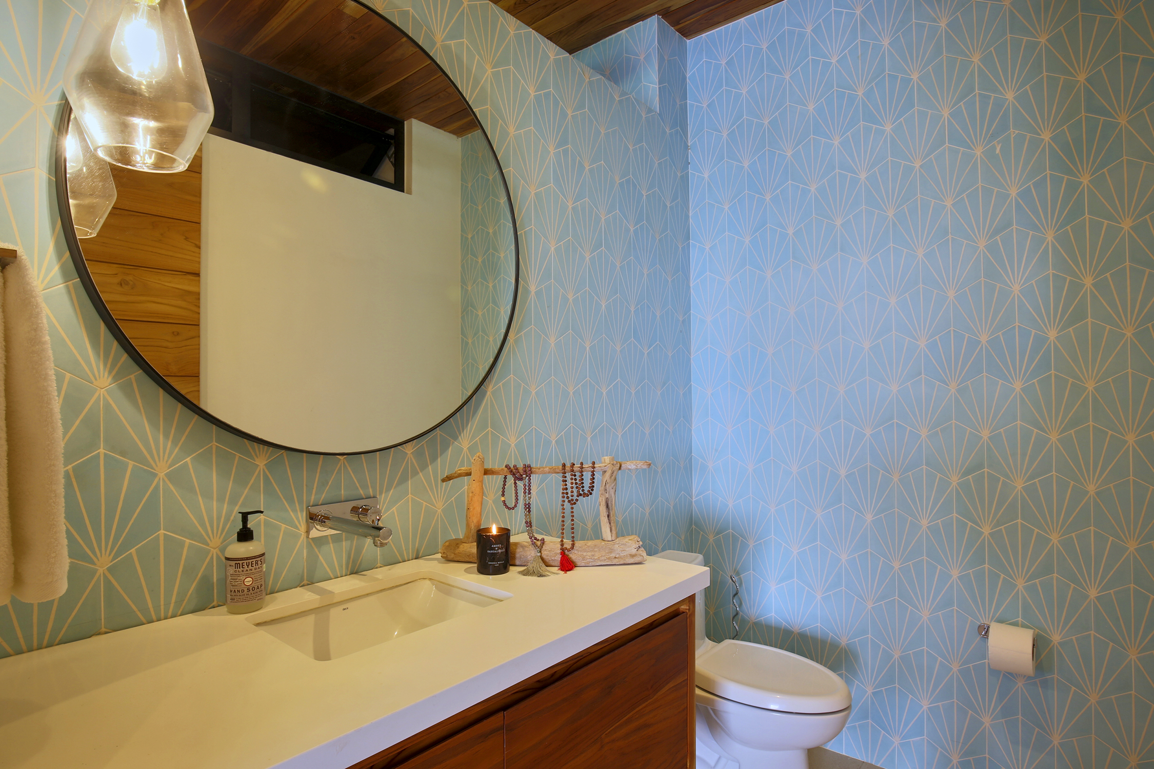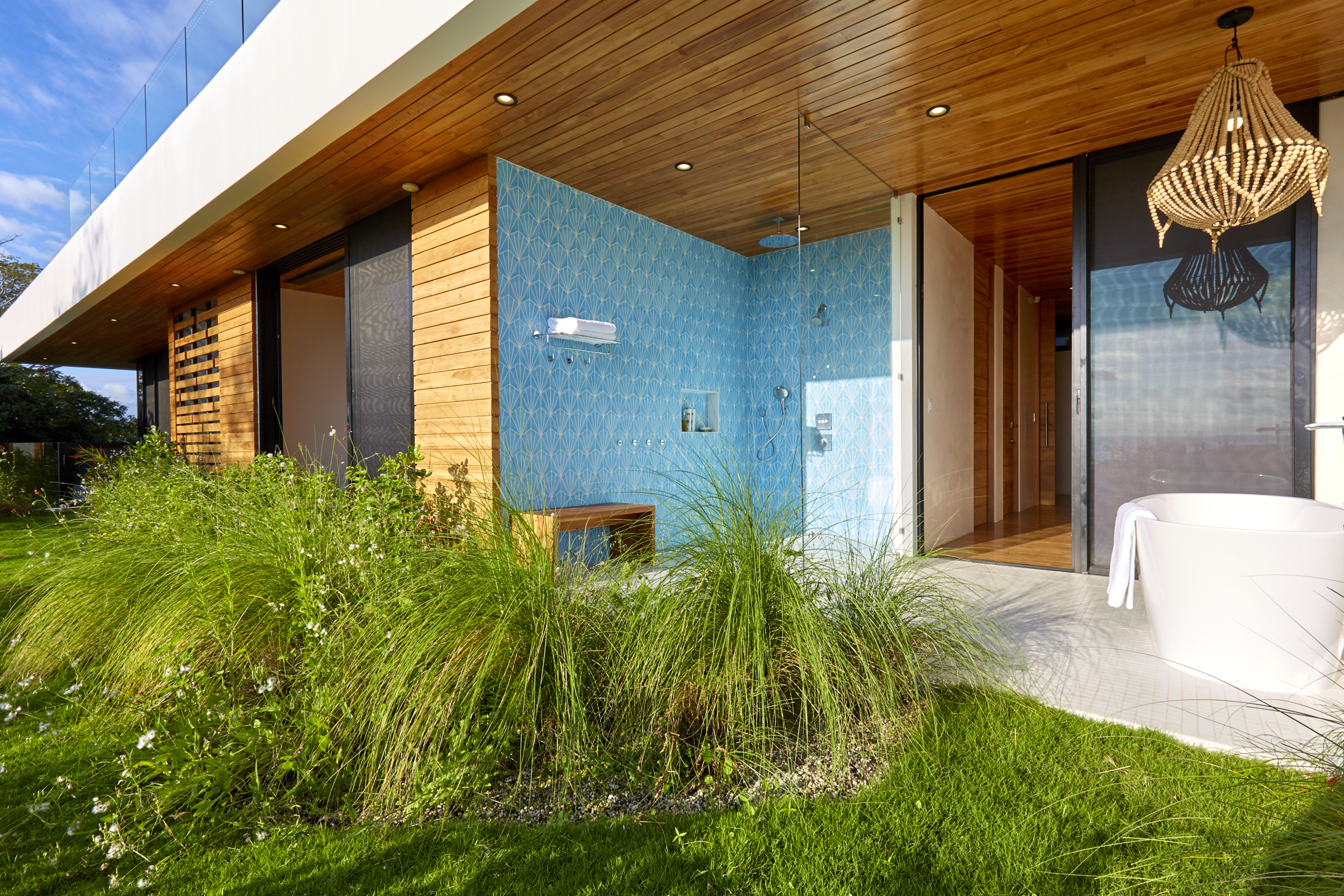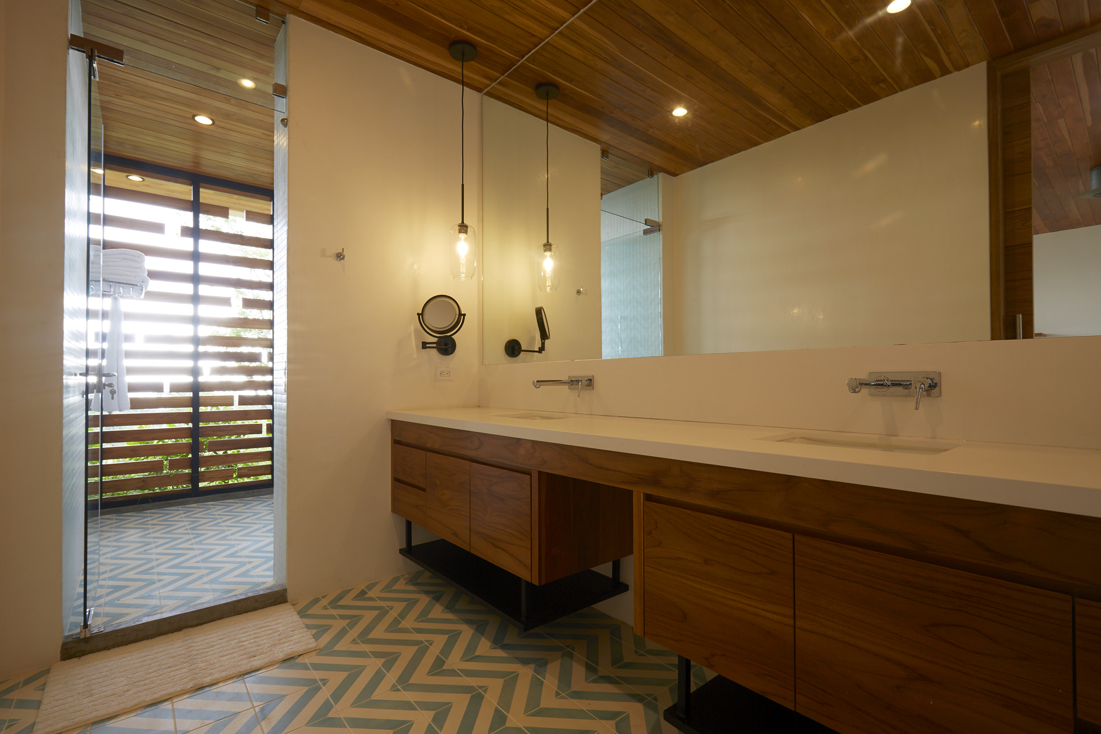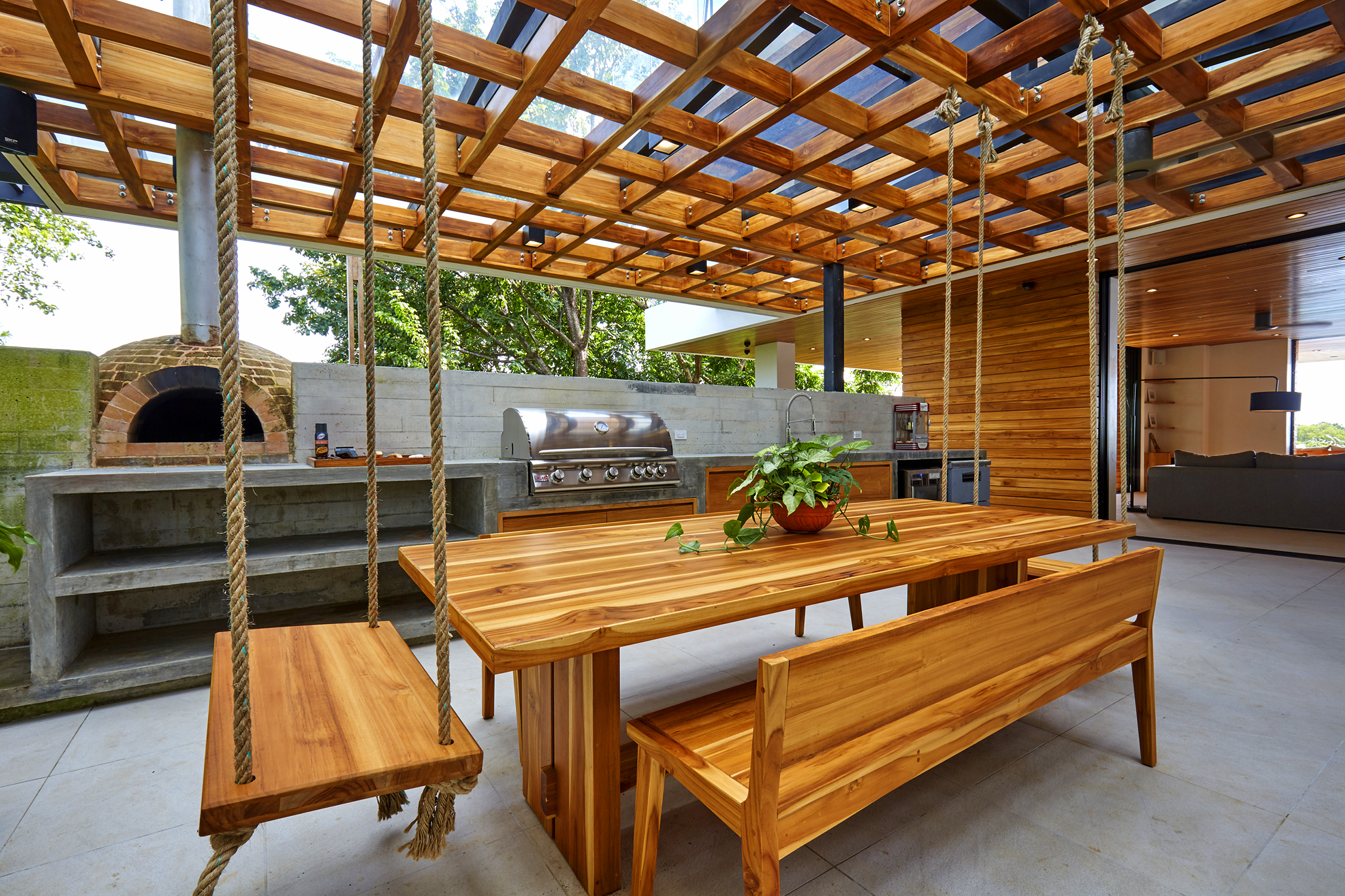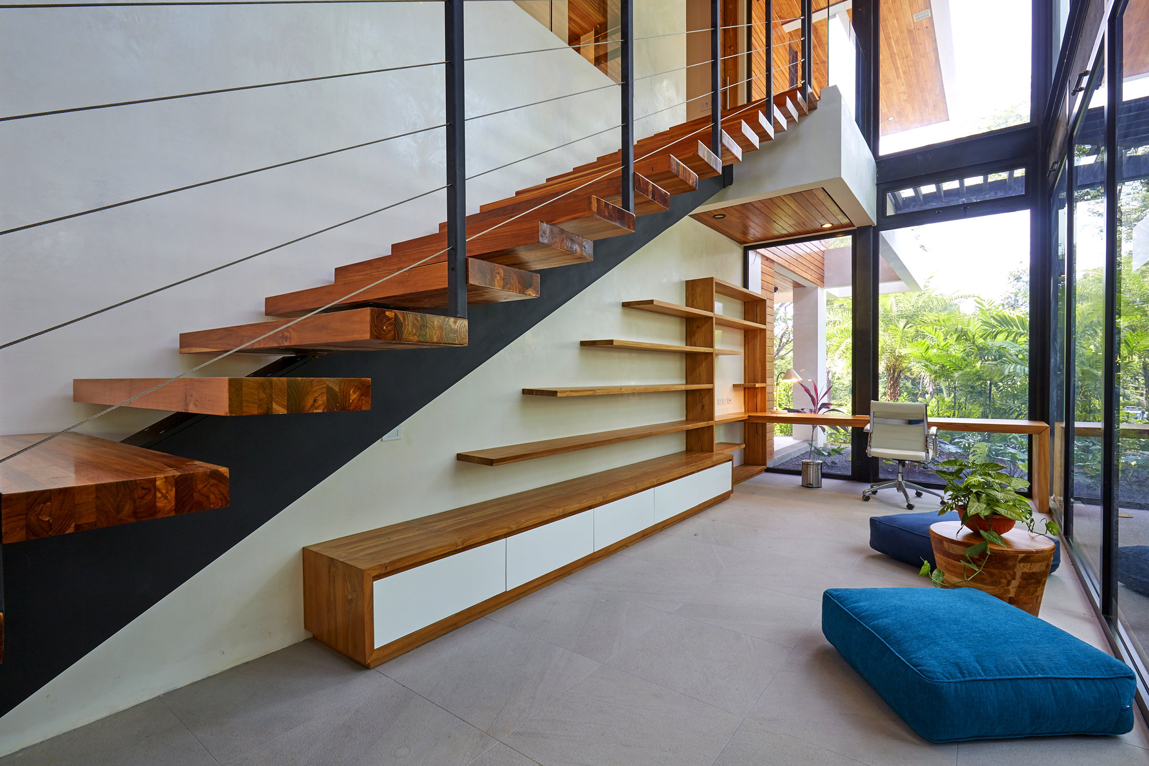 On the first floor, you have an expansive pool deck, fully equipped with a hot tub and your own waterfall. The massive sliding glass door opens the entire kitchen and living space to the outdoors so you can simply enjoy with the family or fiesta with a ton of your friends. The rear of the home opens up to the jungle with an incredible barbeque area equipped with your own covered organic garden for home grown herbs and veggies. Cater a private dinner and enjoy the experience with eighteen of your friends at the gigantic locally made dining room table.