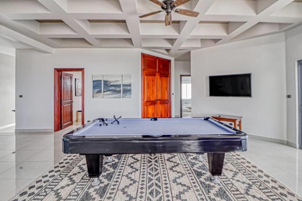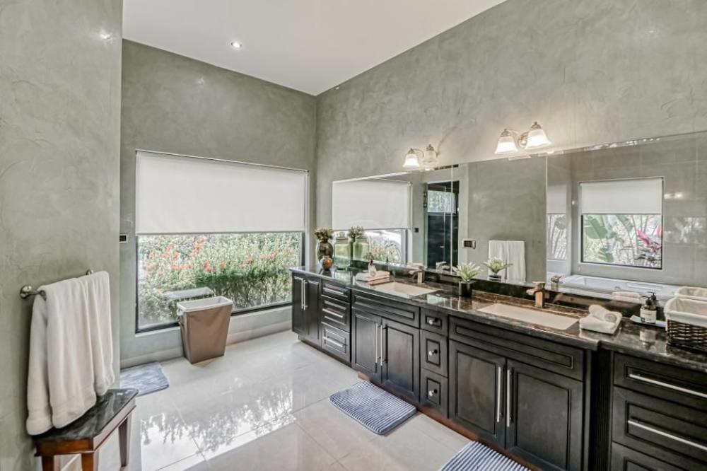 The bedrooms are distributed across two floors. The first-floor master bedroom has a stunning en suite bathroom with a steam shower, jacuzzi, double vanity, and a private entrance to the terrace and outdoor shower nook. This floor has two more spacious rooms with lovely views of the front yard and distant mountains. Three bedrooms, each with its own distinct style and impeccable design, are located on different wings of the second floor. A wraparound balcony connects the game room and a bedroom to the outside, overlooking the swimming pools and gardens and providing the property's best sunset views.