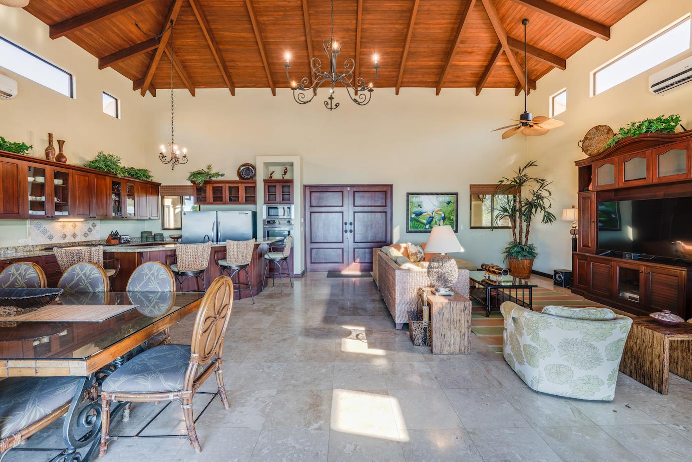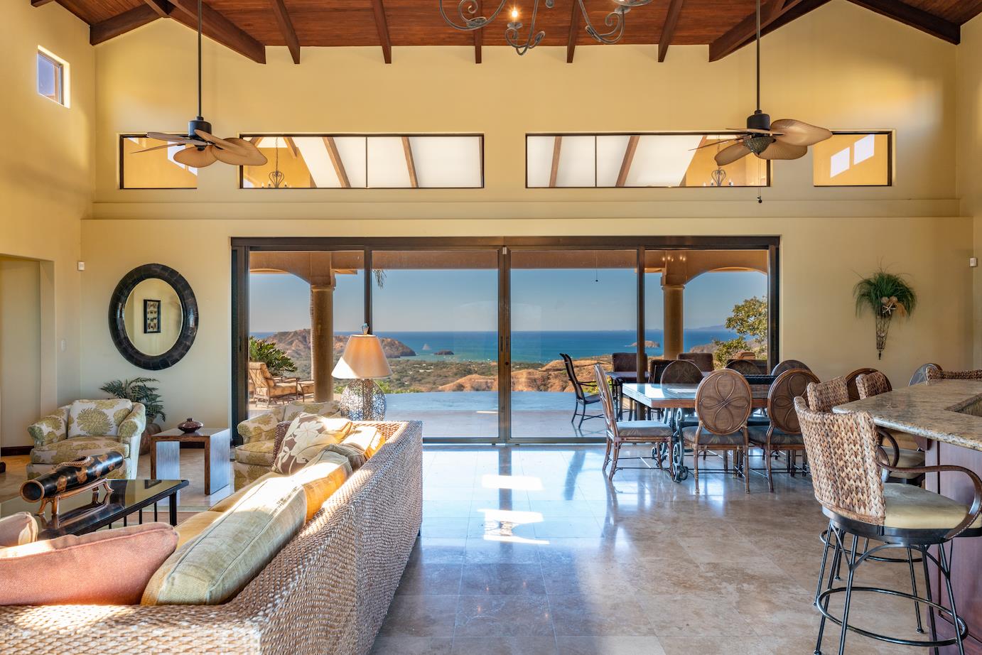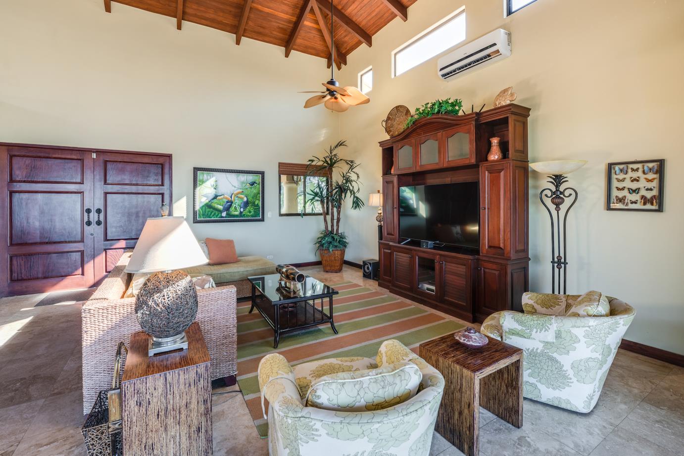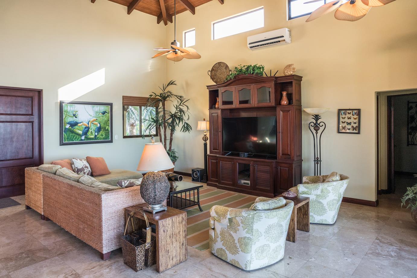 Amazing. Marvelous. Two words that best describe this villa with GORGEOUS views of the Pacific Ocean and volcanoes. This stunning 6 bed, 6.5 bath, 5,000f2 (under a/c) Mediterranean-style home is in the gated community of Ladera Del Mar. Add another 1,100ft2 for patios and terraces to take in the spectacular views. This magnificent villa's comfortable elegance is only the beginning of its description. The elegant Tommy Bahama decor and furniture immediately convey that you are in tropical luxury! The living and dining areas have 24' high ceilings, and the room completely opens to the outside (sliding doors disappear into the walls), allowing you to live comfortably both inside and outside in Costa Rica. The kitchen is fully equipped, with stainless appliances and granite countertops. Villa de la Cascada has four bedrooms with views of the Pacific Ocean and two bedrooms with views of the mountains and valley. With separate bathrooms made of the finest Costa Rican woodwork, granite, and tile, all bedrooms offer complete privacy. All of this is only 25 minutes from Liberia International Airport and 5 minutes from the bustling beach town of Playas del Coco, complete with amenities and services. TV