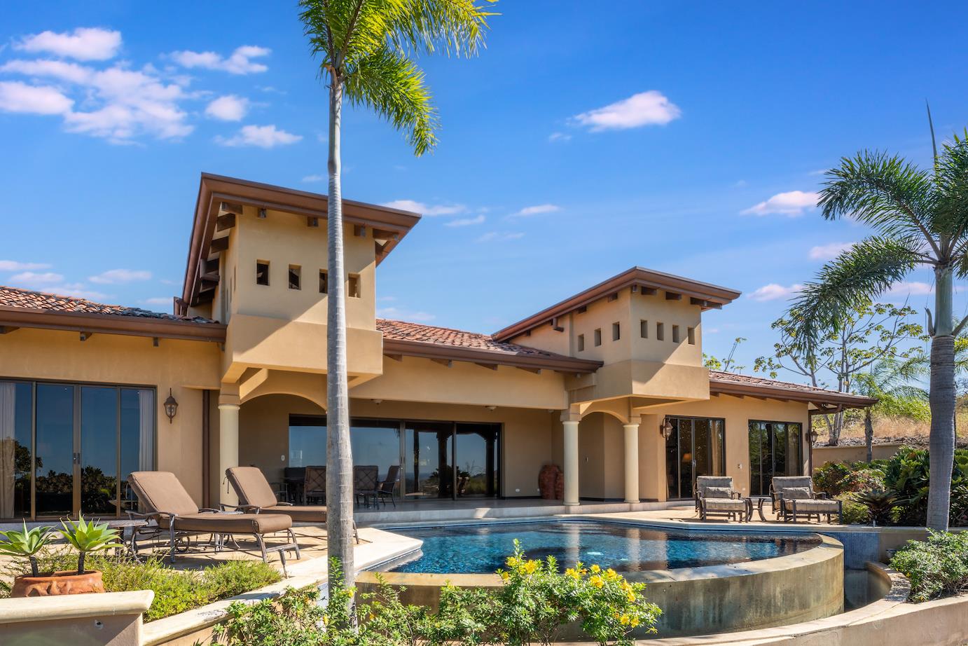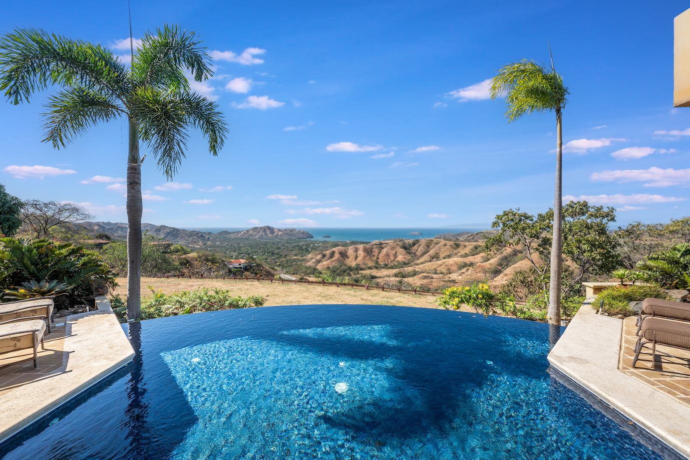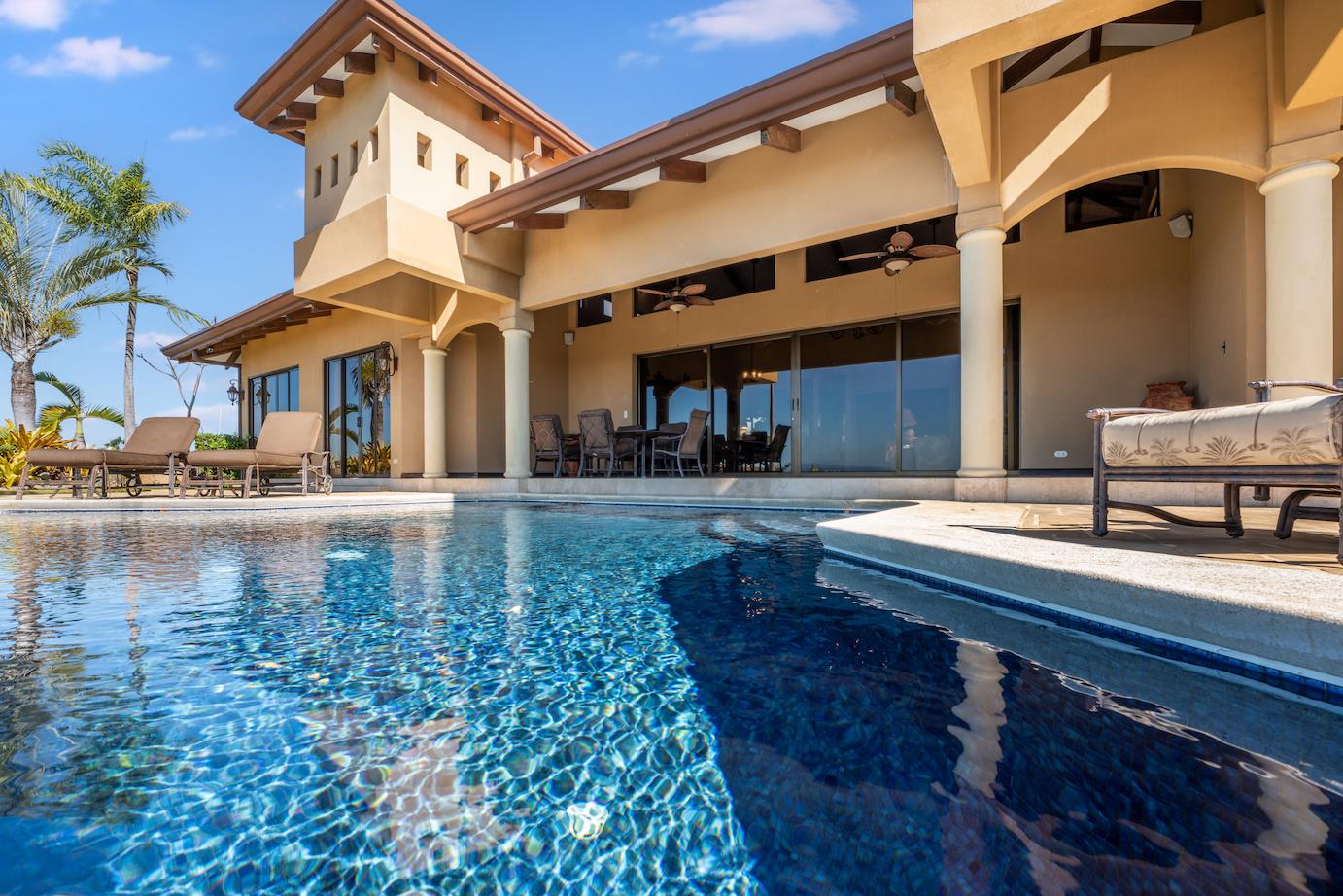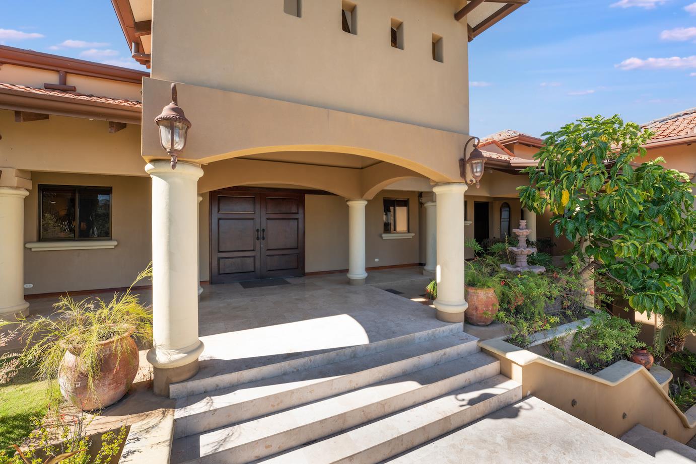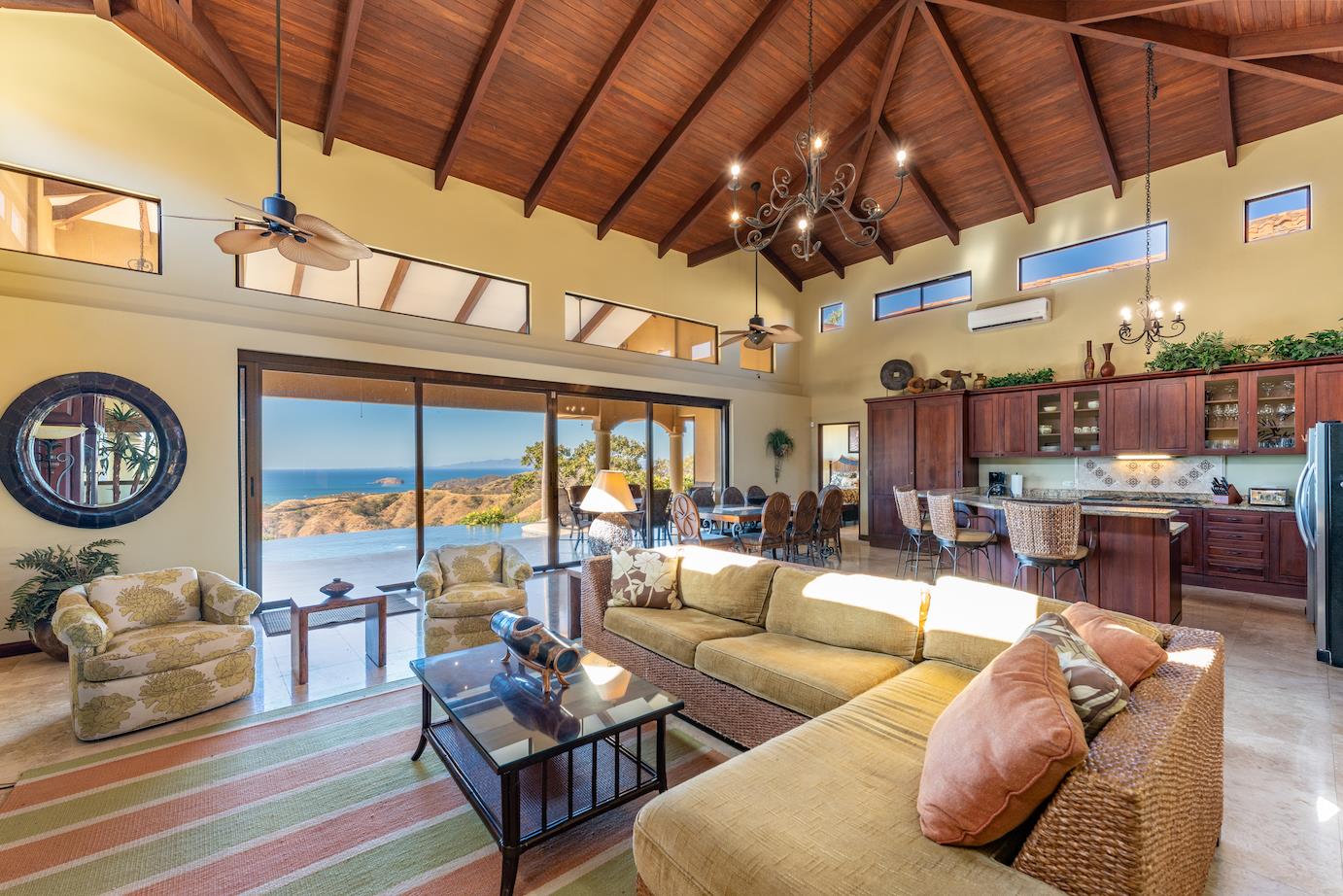 Amazing. Marvelous. Two words that best describe this villa with GORGEOUS views of the Pacific Ocean and volcanoes. This stunning 6 bed, 6.5 bath, 5,000f2 (under a/c) Mediterranean-style home is in the gated community of Ladera Del Mar. Add another 1,100ft2 for patios and terraces to take in the spectacular views. This magnificent villa's comfortable elegance is only the beginning of its description. The elegant Tommy Bahama decor and furniture immediately convey that you are in tropical luxury! The living and dining areas have 24' high ceilings, and the room completely opens to the outside (sliding doors disappear into the walls), allowing you to live comfortably both inside and outside in Costa Rica. The kitchen is fully equipped, with stainless appliances and granite countertops. Villa de la Cascada has four bedrooms with views of the Pacific Ocean and two bedrooms with views of the mountains and valley. With separate bathrooms made of the finest Costa Rican woodwork, granite, and tile, all bedrooms offer complete privacy. All of this is only 25 minutes from Liberia International Airport and 5 minutes from the bustling beach town of Playas del Coco, complete with amenities and services. TV