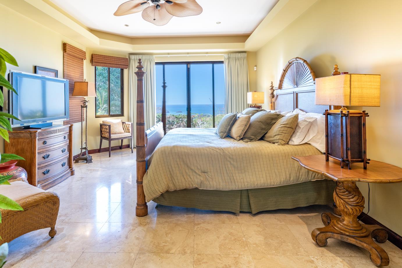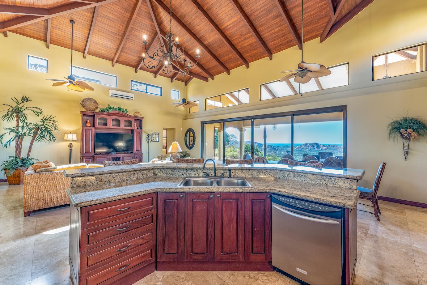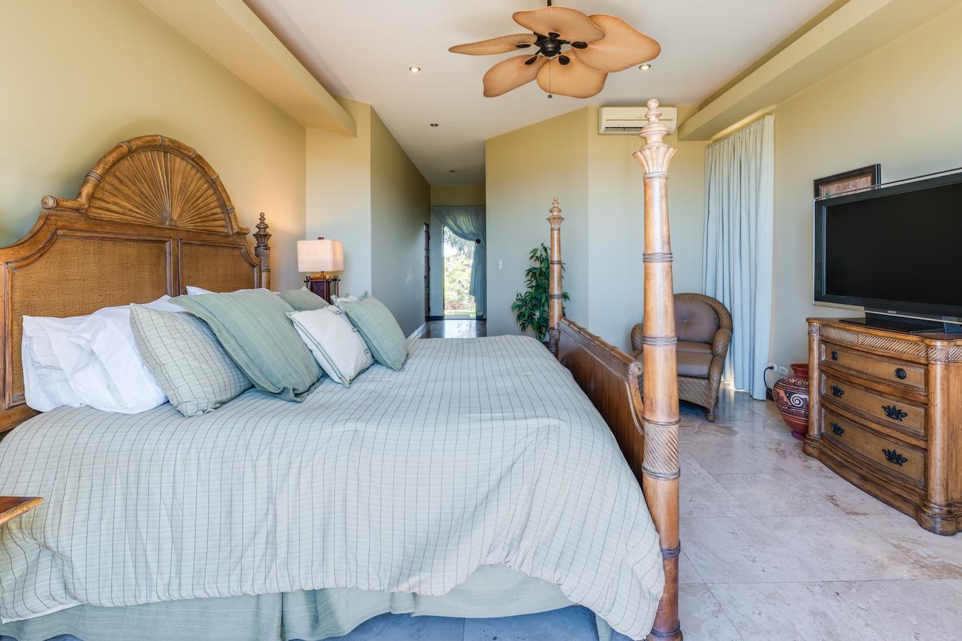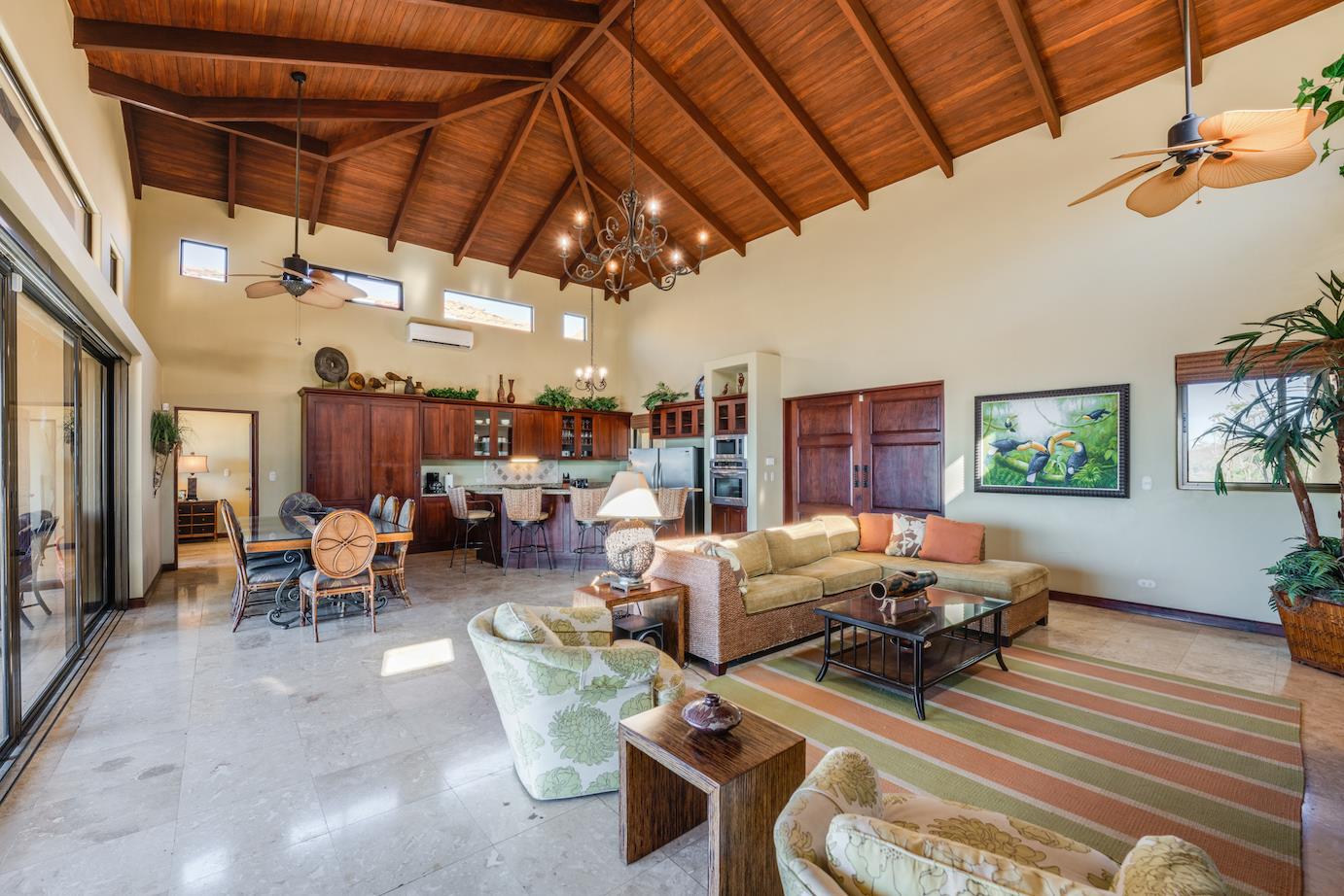Amazing. Marvelous. Two words that best describe this villa with GORGEOUS views of the Pacific Ocean and volcanoes. This stunning 6 bed, 6.5 bath, 5,000f2 (under a/c) Mediterranean-style home is in the gated community of Ladera Del Mar. Add another 1,100ft2 for patios and terraces to take in the spectacular views. This magnificent villa's comfortable elegance is only the beginning of its description. The elegant Tommy Bahama decor and furniture immediately convey that you are in tropical luxury! The living and dining areas have 24' high ceilings, and the room completely opens to the outside (sliding doors disappear into the walls), allowing you to live comfortably both inside and outside in Costa Rica. The kitchen is fully equipped, with stainless appliances and granite countertops. Villa de la Cascada has four bedrooms with views of the Pacific Ocean and two bedrooms with views of the mountains and valley. With separate bathrooms made of the finest Costa Rican woodwork, granite, and tile, all bedrooms offer complete privacy. All of this is only 25 minutes from Liberia International Airport and 5 minutes from the bustling beach town of Playas del Coco, complete with amenities and services. TV