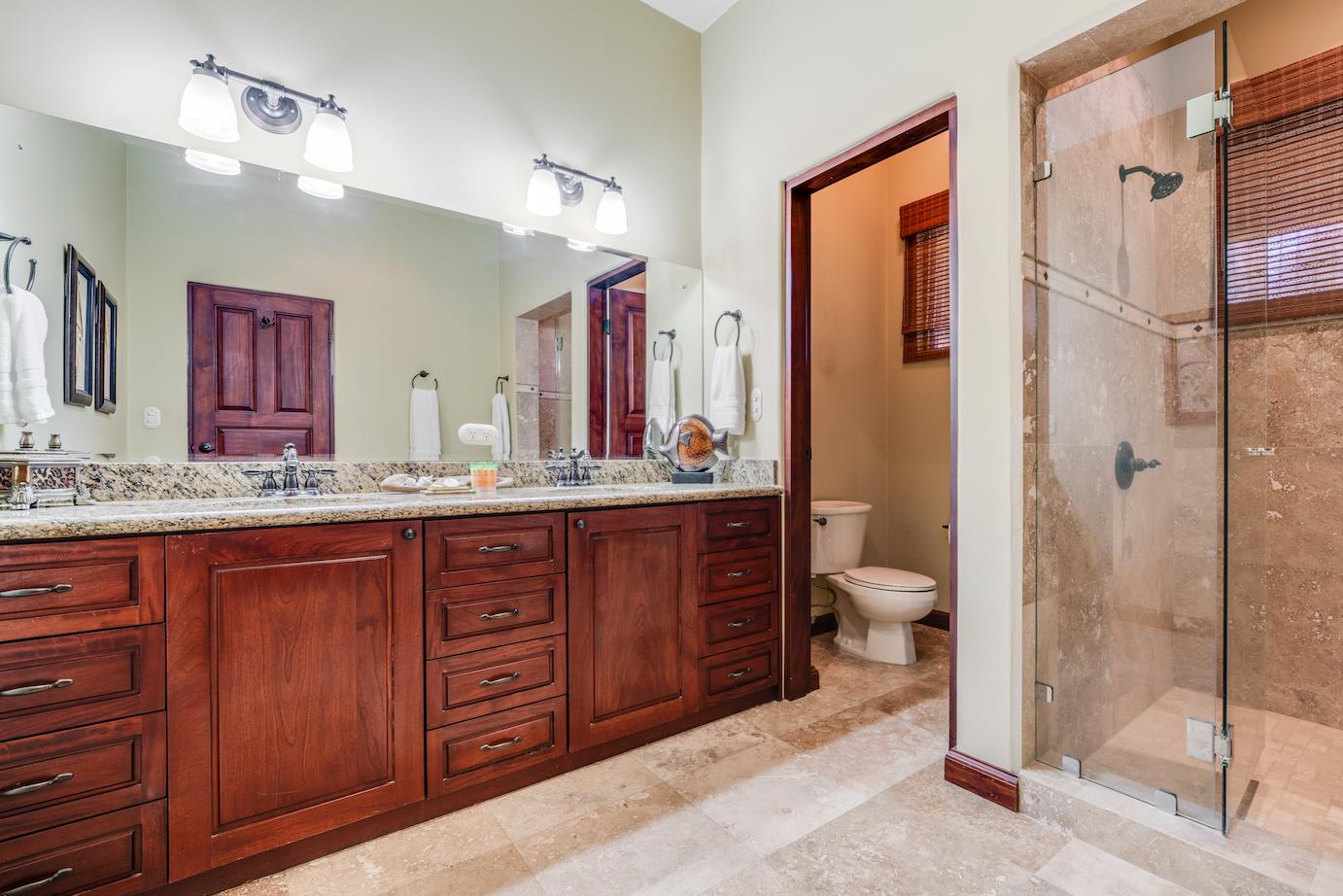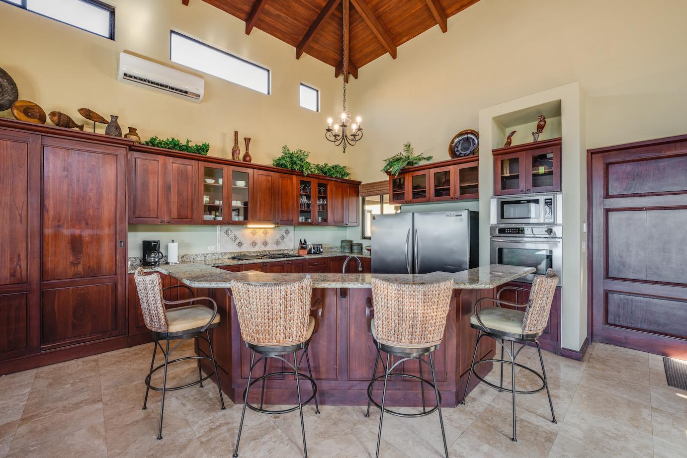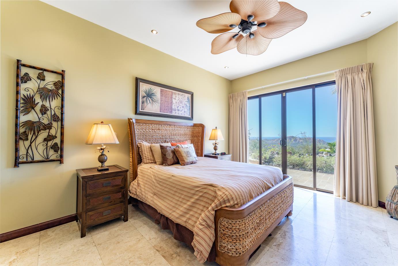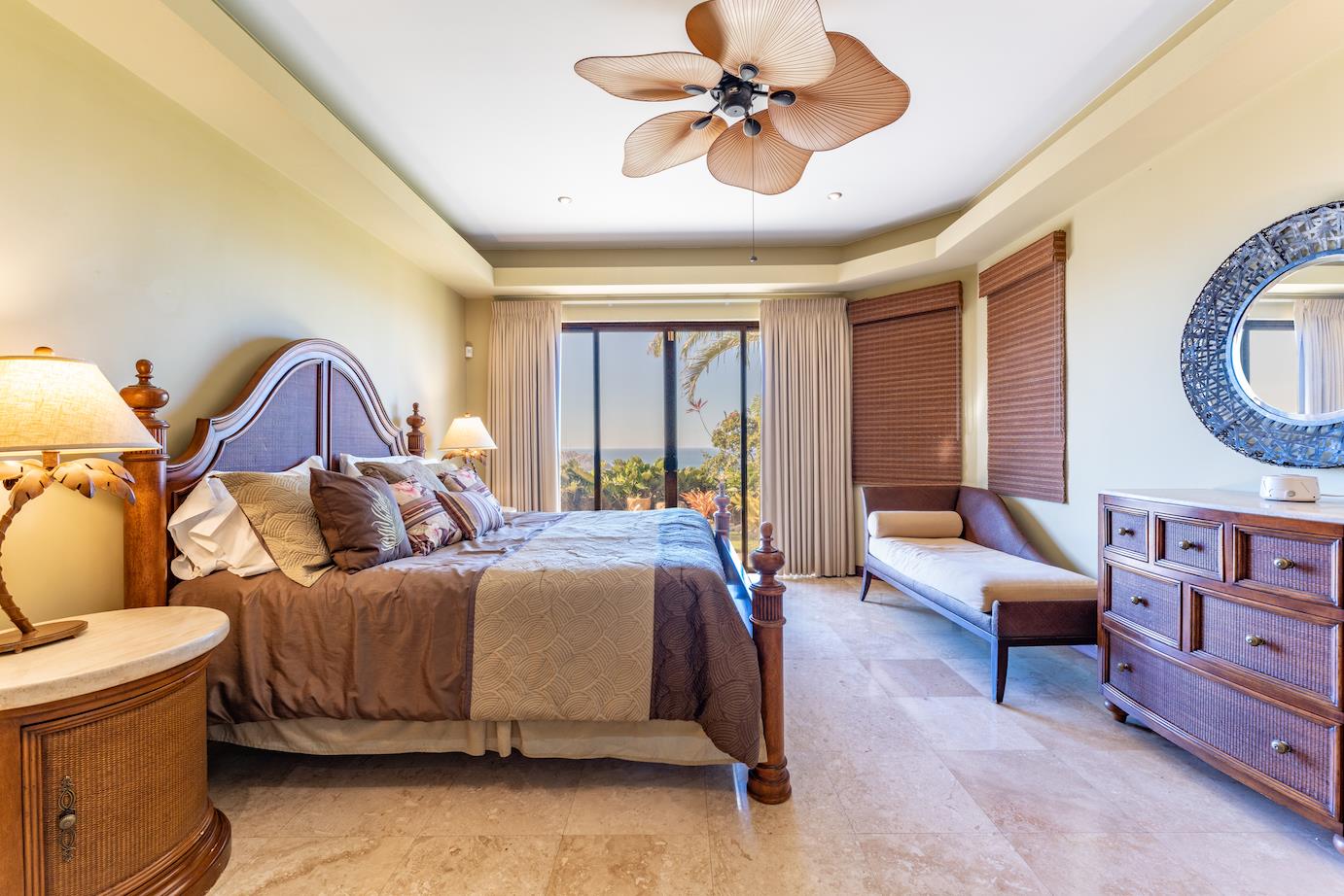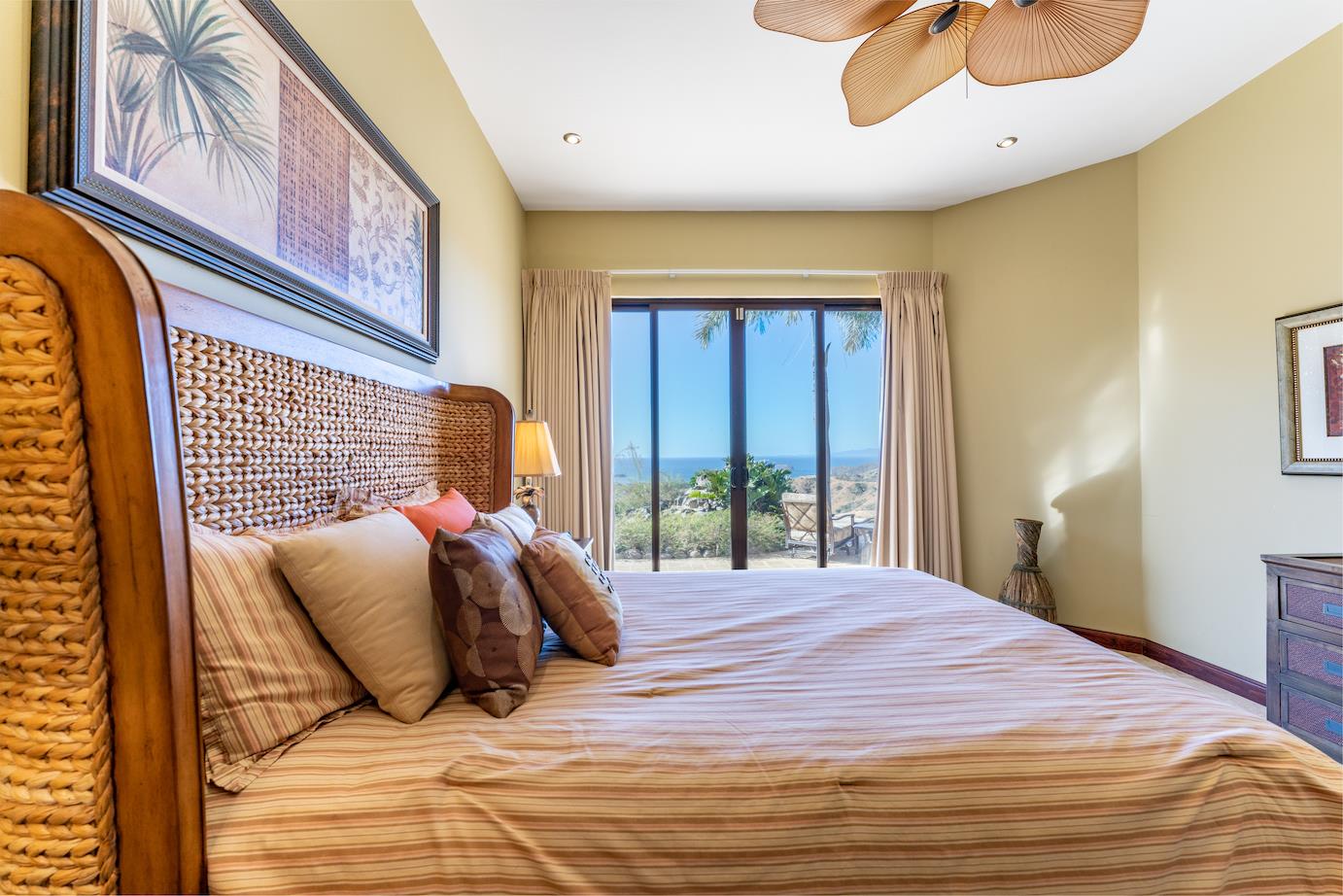 Amazing. Marvelous. Two words that best describe this villa with GORGEOUS views of the Pacific Ocean and volcanoes. This stunning 6 bed, 6.5 bath, 5,000f2 (under a/c) Mediterranean-style home is in the gated community of Ladera Del Mar. Add another 1,100ft2 for patios and terraces to take in the spectacular views. This magnificent villa's comfortable elegance is only the beginning of its description. The elegant Tommy Bahama decor and furniture immediately convey that you are in tropical luxury! The living and dining areas have 24' high ceilings, and the room completely opens to the outside (sliding doors disappear into the walls), allowing you to live comfortably both inside and outside in Costa Rica. The kitchen is fully equipped, with stainless appliances and granite countertops. Villa de la Cascada has four bedrooms with views of the Pacific Ocean and two bedrooms with views of the mountains and valley. With separate bathrooms made of the finest Costa Rican woodwork, granite, and tile, all bedrooms offer complete privacy. All of this is only 25 minutes from Liberia International Airport and 5 minutes from the bustling beach town of Playas del Coco, complete with amenities and services. TV