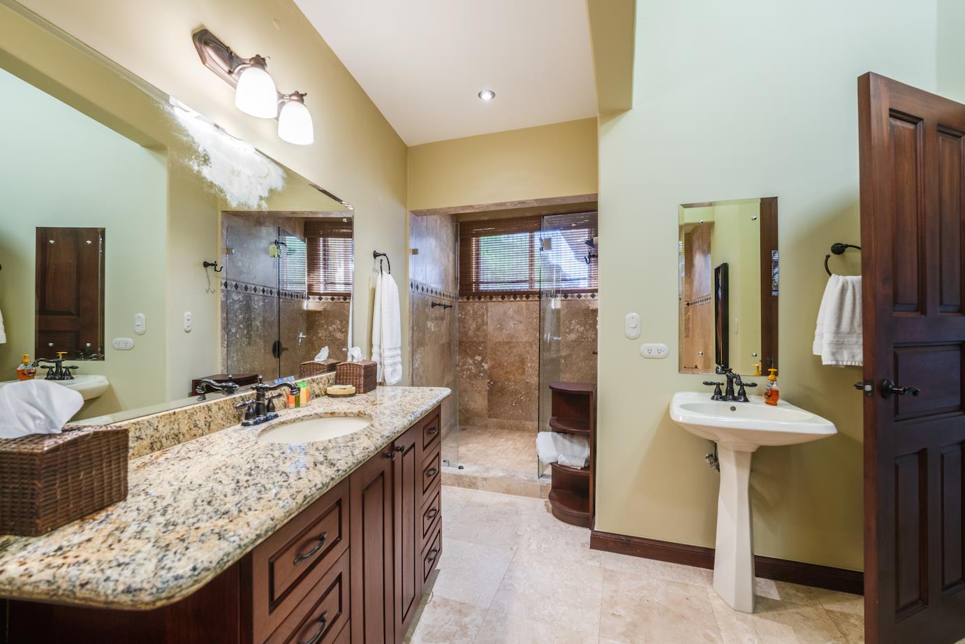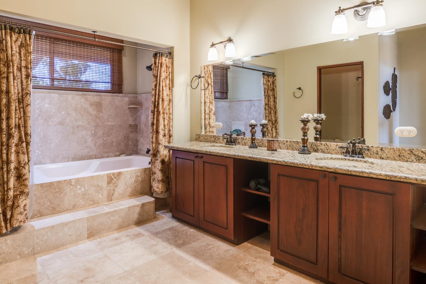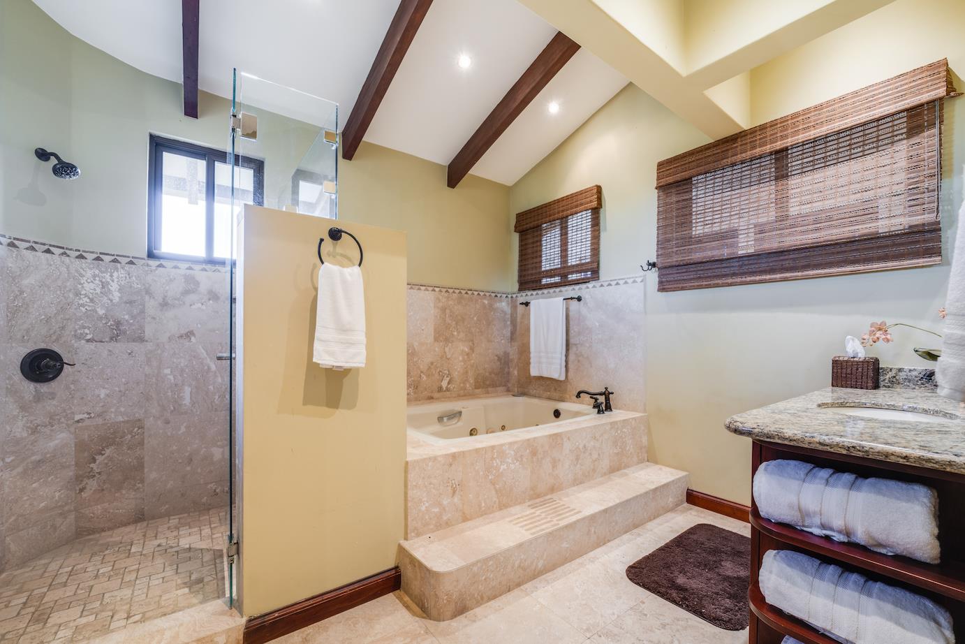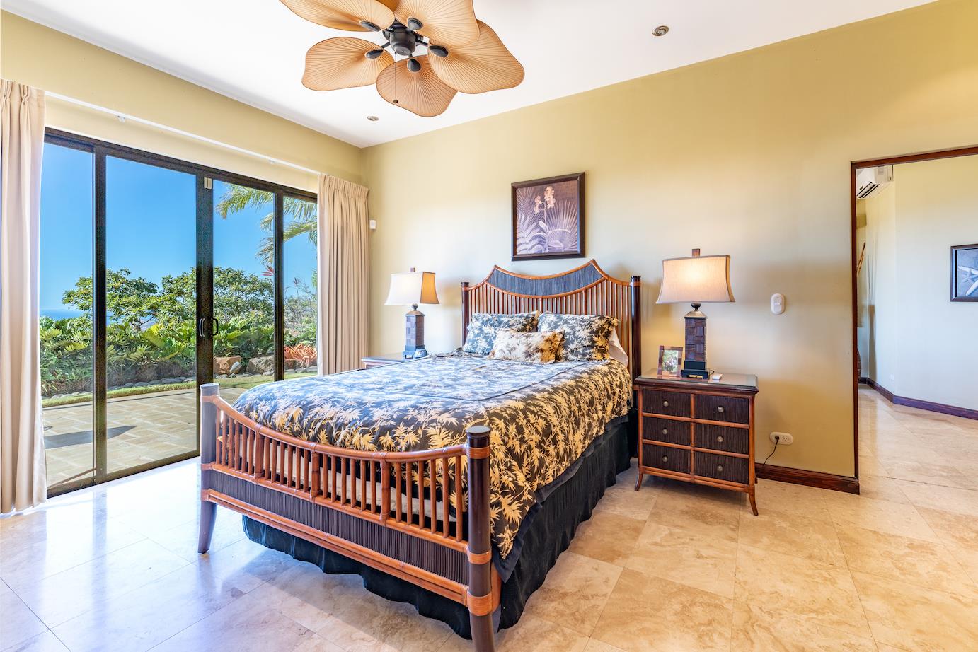Amazing. Marvelous. Two words that best describe this villa with GORGEOUS views of the Pacific Ocean and volcanoes. This stunning 6 bed, 6.5 bath, 5,000f2 (under a/c) Mediterranean-style home is in the gated community of Ladera Del Mar. Add another 1,100ft2 for patios and terraces to take in the spectacular views. This magnificent villa's comfortable elegance is only the beginning of its description. The elegant Tommy Bahama decor and furniture immediately convey that you are in tropical luxury! The living and dining areas have 24' high ceilings, and the room completely opens to the outside (sliding doors disappear into the walls), allowing you to live comfortably both inside and outside in Costa Rica. The kitchen is fully equipped, with stainless appliances and granite countertops. Villa de la Cascada has four bedrooms with views of the Pacific Ocean and two bedrooms with views of the mountains and valley. With separate bathrooms made of the finest Costa Rican woodwork, granite, and tile, all bedrooms offer complete privacy. All of this is only 25 minutes from Liberia International Airport and 5 minutes from the bustling beach town of Playas del Coco, complete with amenities and services. TV