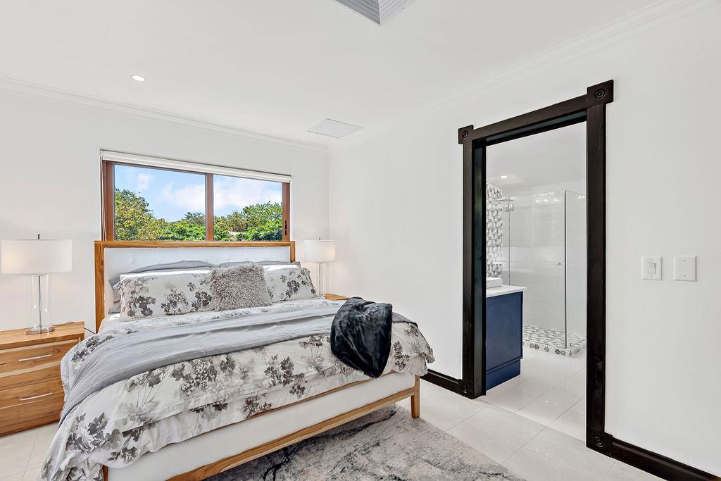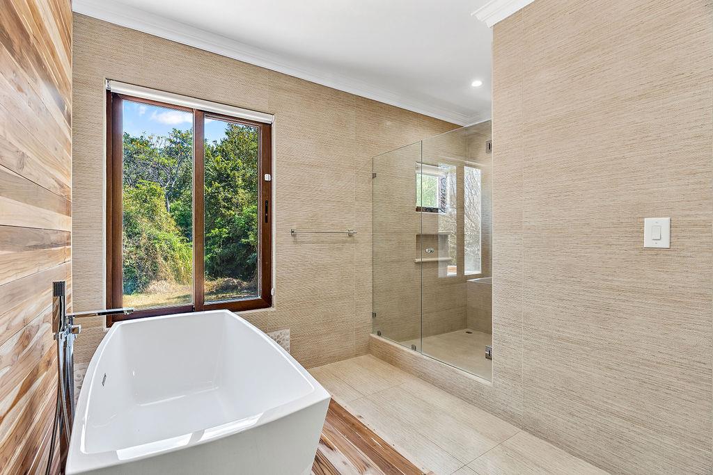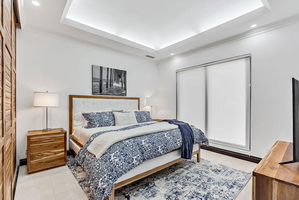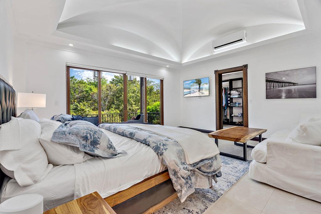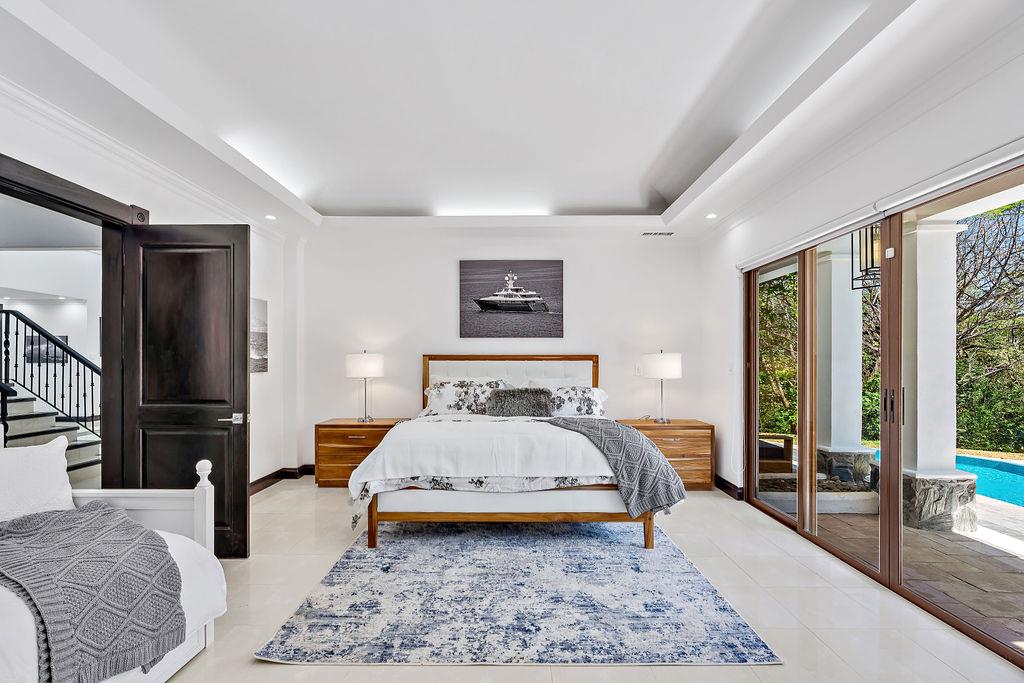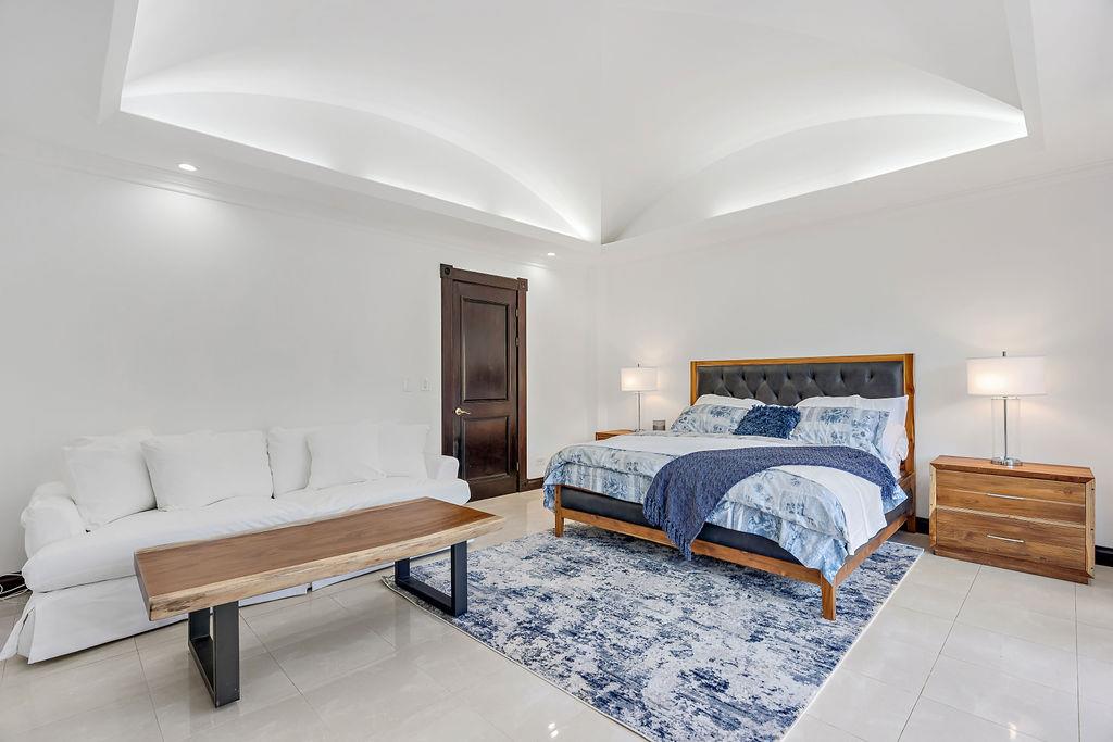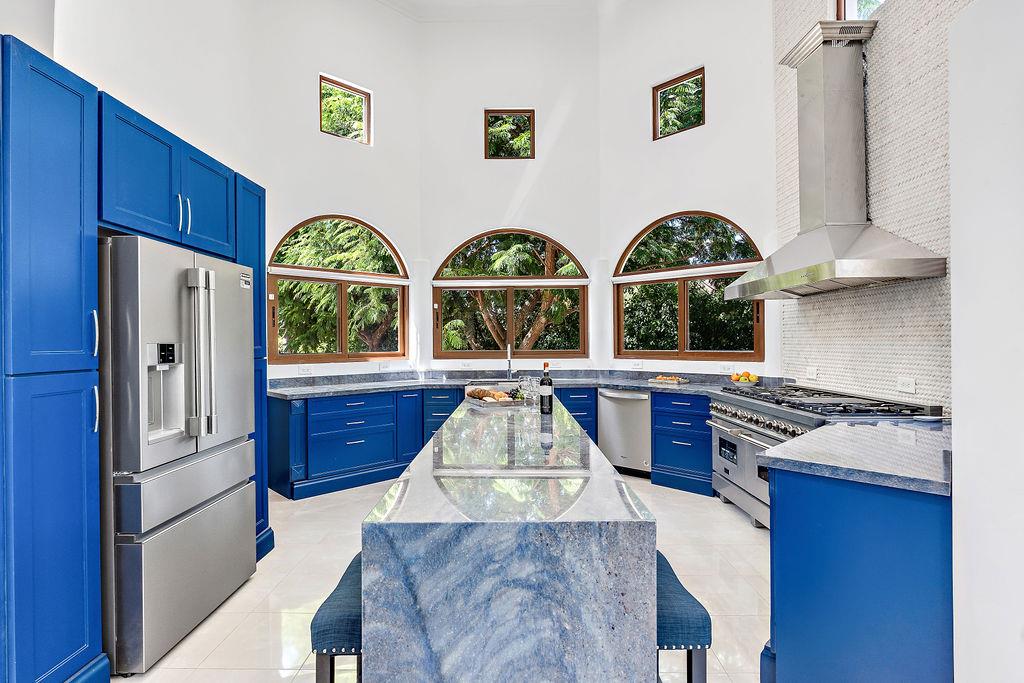 A meticulously detailed modern 7,500 sq. ft. (700 sq. mts.) home with luxury finishes, large bedrooms, and pool is ready for its new owners. Each bedroom has an ensuite bathroom with marble tile and finishes, as well as large showers and privacy for each guest. Three bedrooms, a media room, a rotunda entryway, a dining room, a living room, and a luxury kitchen are located downstairs. Two bedrooms are located upstairs, and there is a view of the pool area and trees where monkeys like to hang out. The kitchen at Casa Victoria has a large farm sink, dual fuel (electric/gas) oven and stove combination, stainless-steel refrigerator, ultra-quiet Kitchen-Aide dishwasher, wine refrigerator, large blue and gray quartzite island, large pantry, custom soft close cabinets, and seating for 14 at the dining areas.