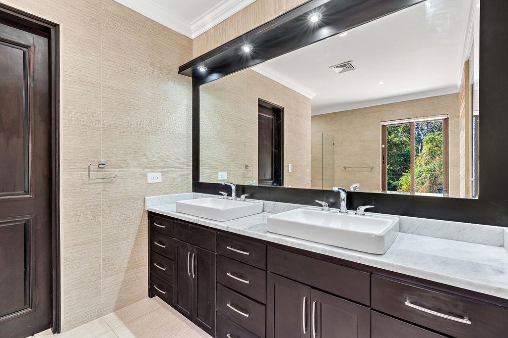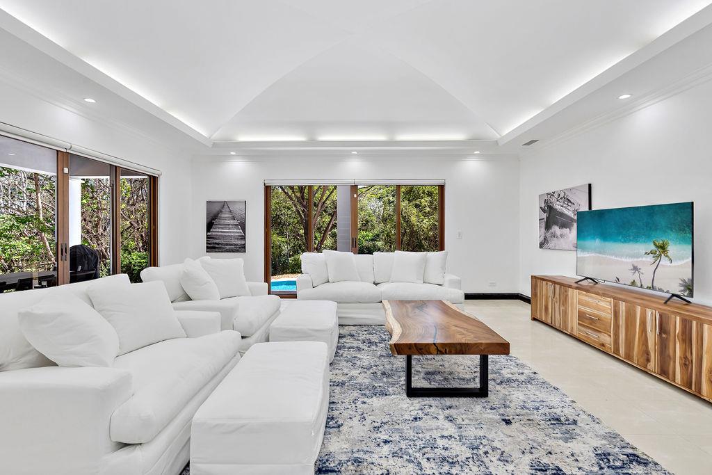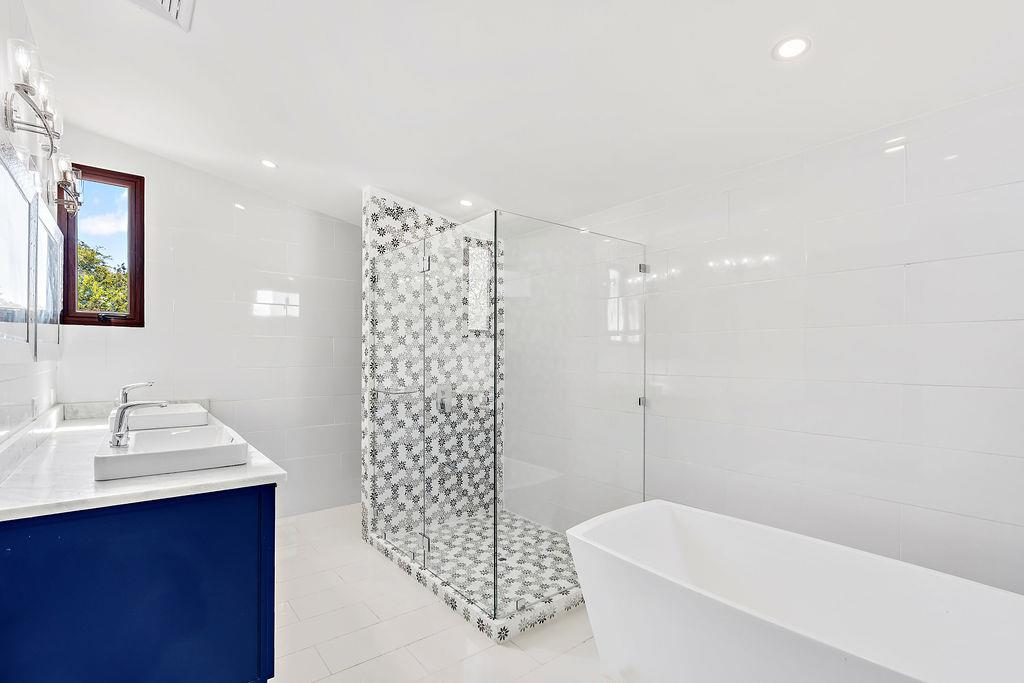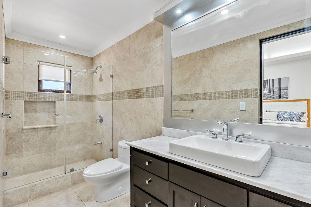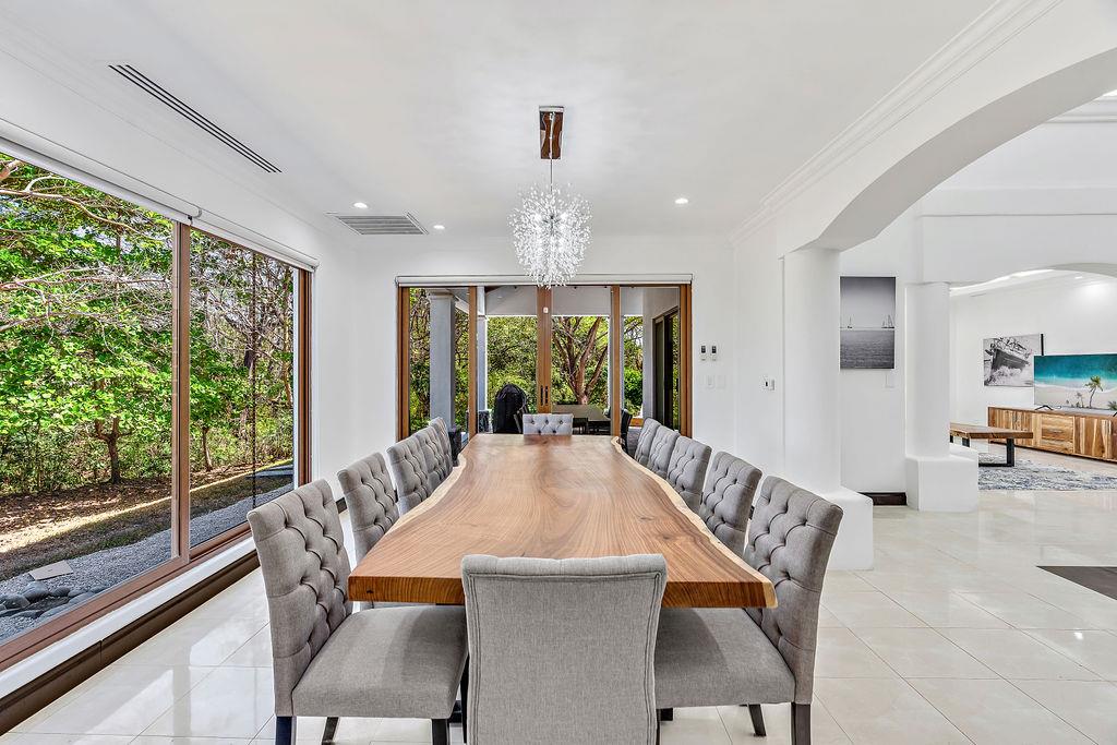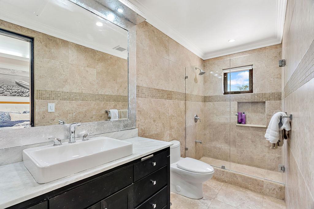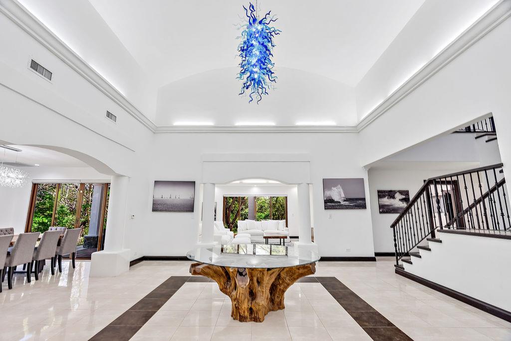 A meticulously detailed modern 7,500 sq. ft. (700 sq. mts.) home with luxury finishes, large bedrooms, and pool is ready for its new owners. Each bedroom has an ensuite bathroom with marble tile and finishes, as well as large showers and privacy for each guest. Three bedrooms, a media room, a rotunda entryway, a dining room, a living room, and a luxury kitchen are located downstairs. Two bedrooms are located upstairs, and there is a view of the pool area and trees where monkeys like to hang out. The kitchen at Casa Victoria has a large farm sink, dual fuel (electric/gas) oven and stove combination, stainless-steel refrigerator, ultra-quiet Kitchen-Aide dishwasher, wine refrigerator, large blue and gray quartzite island, large pantry, custom soft close cabinets, and seating for 14 at the dining areas.