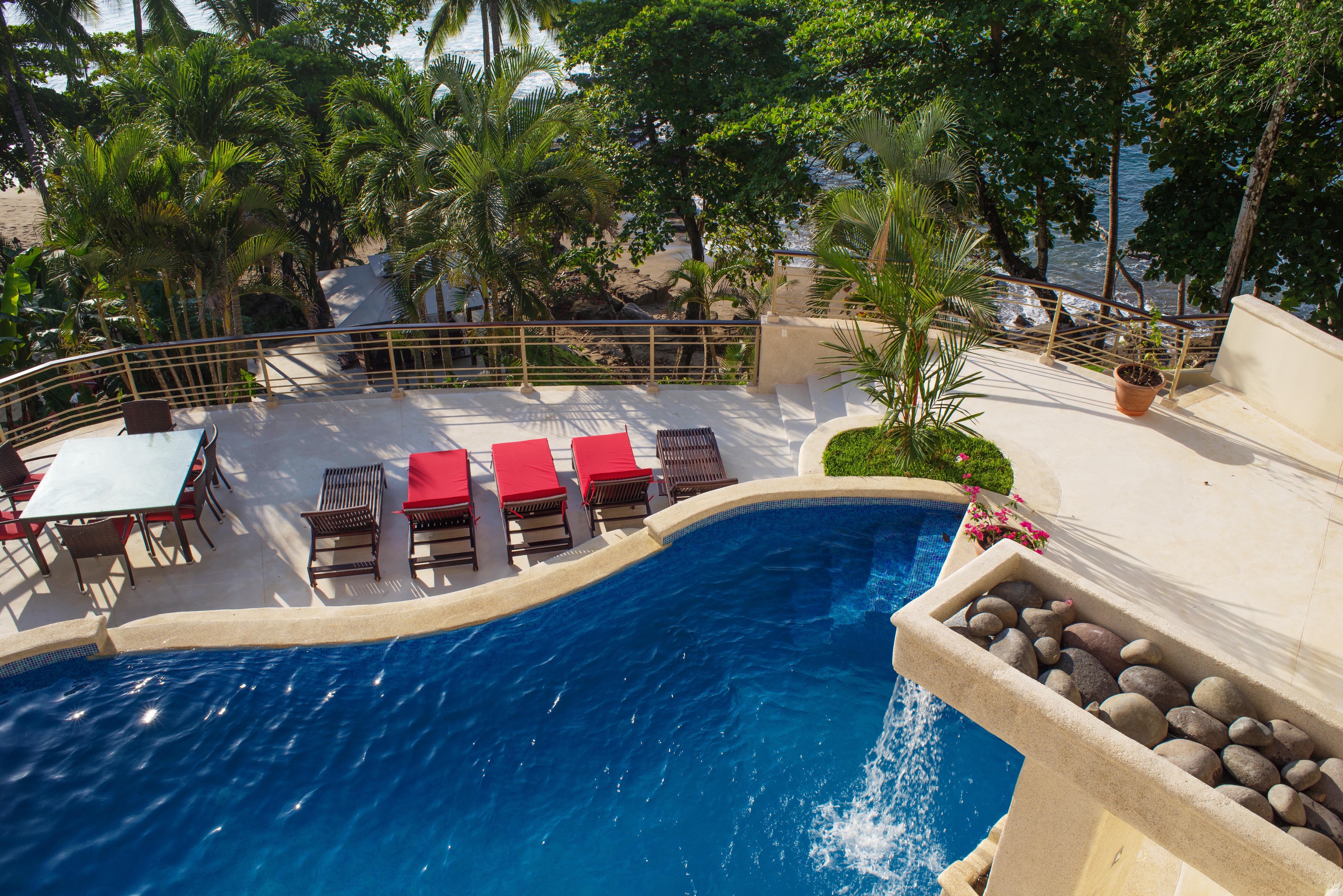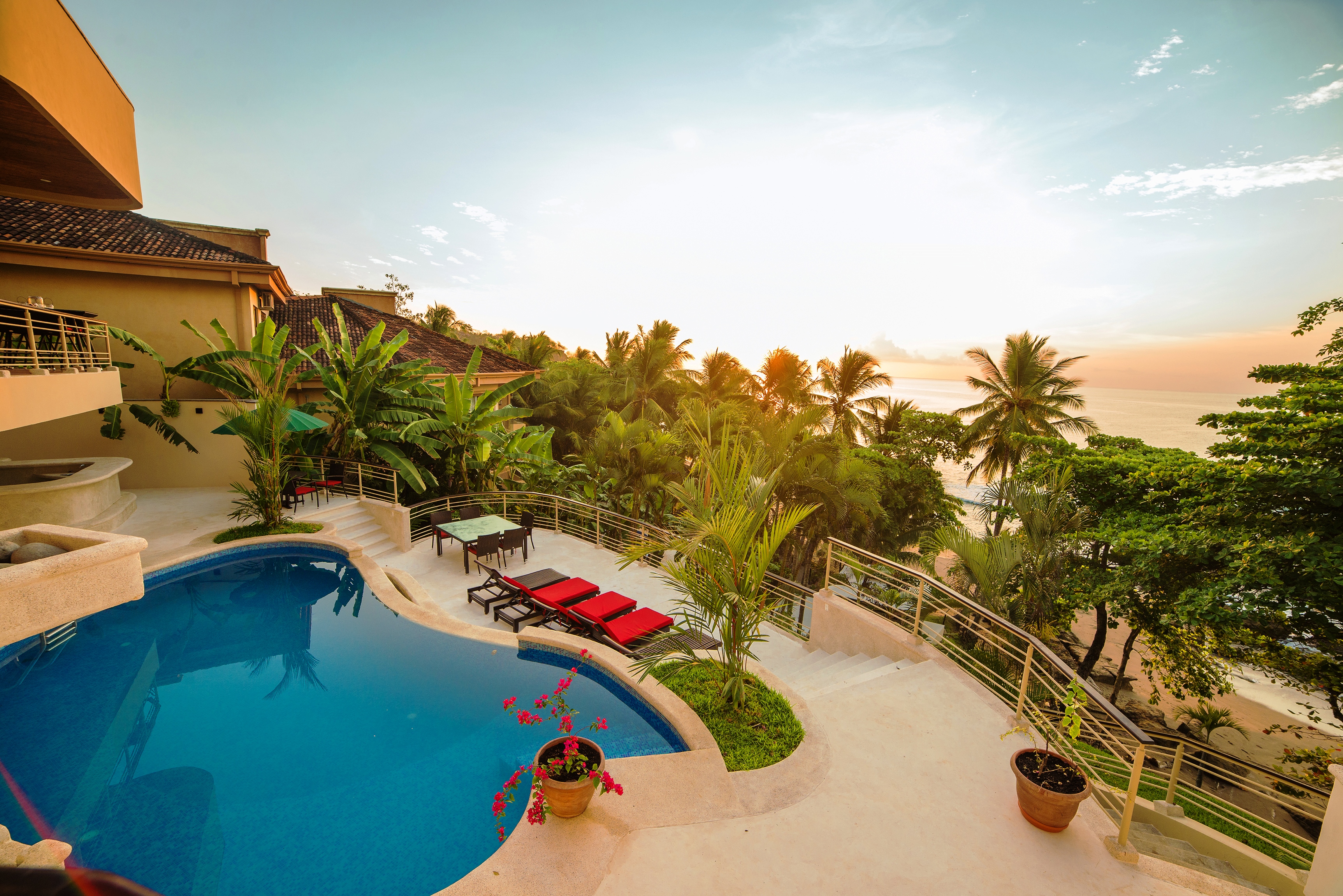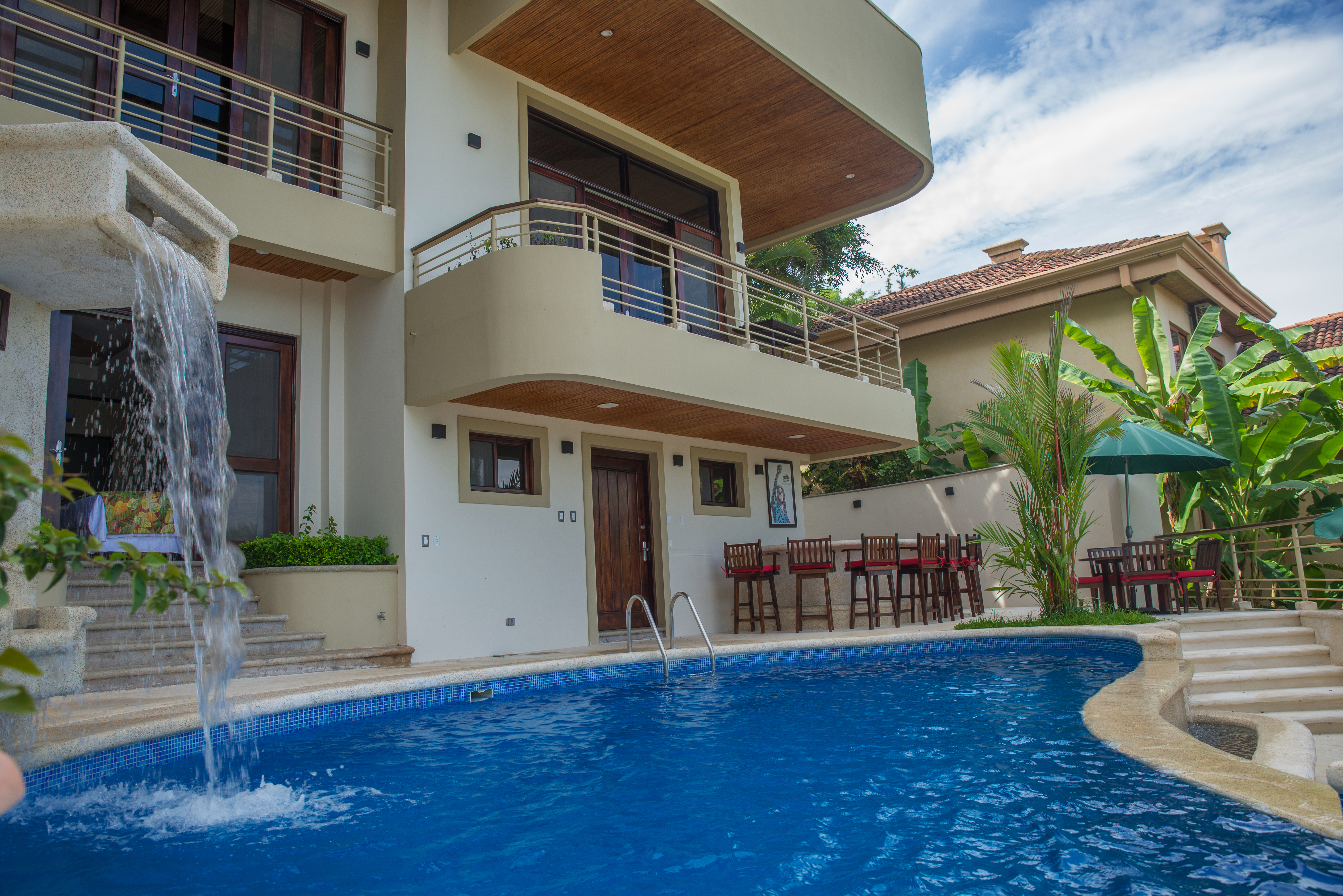 An Exceptional Modern Beachfront 3 Story Luxury Villa with 6 Private Bedrooms, 6.5 Baths & Large Pool -That Touches the Sand – In a Private Golf Resort Community Designed by a renowned architect, this Villa offers gorgeous blue water panoramic views from every room in the house. The separate bedrooms assure privacy and solace while being just steps from the lovely pool. From the pool there a just a few more steps to the sandy beach. The quality of construction and use of exotic hardwoods is obvious throughout the home. There are separate social areas for BBQs as well as a large living room for larger gatherings. The roomy chef’s is equipped with the most modern equipment of the highest quality. This gated community has its own water supply and 9-hole golf course and a beachfront luxury hotel. The restaurant in the Club House is excellent, overlooking the beach and sea. Nearby towns offer all the services such as hardware stores, supermarkets, gas stations, clinics, restaurants and much more Each bedroom has its own private bathroom and outdoor veranda to enjoy the ocean views. The photos do not do it justice. This house is a dream of comfortable living that looks out over unbelievable ocean vistas and the sound of the waves on the shore. People who visit this house just pause and take in the lovely feeling of being on the edge of the sea and surrounded by luxury. Here is a quick slide show video of the property and separate photos below – https://www.youtube.com/watch?v=--bk97a6ebQ