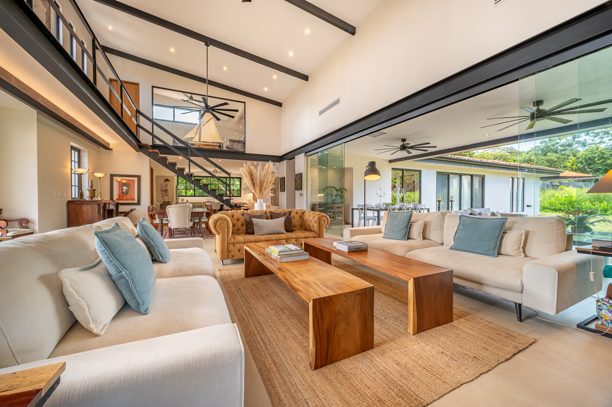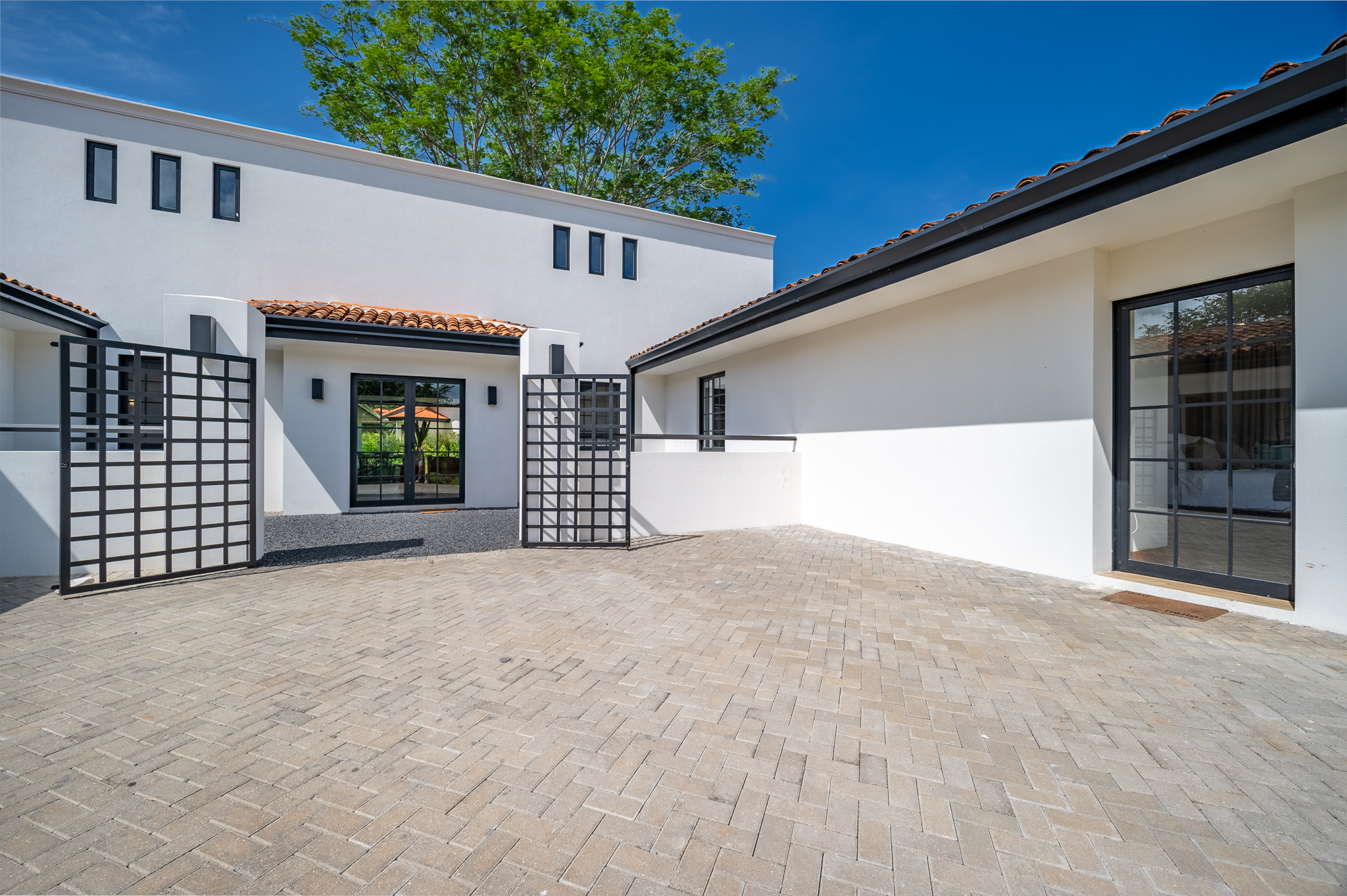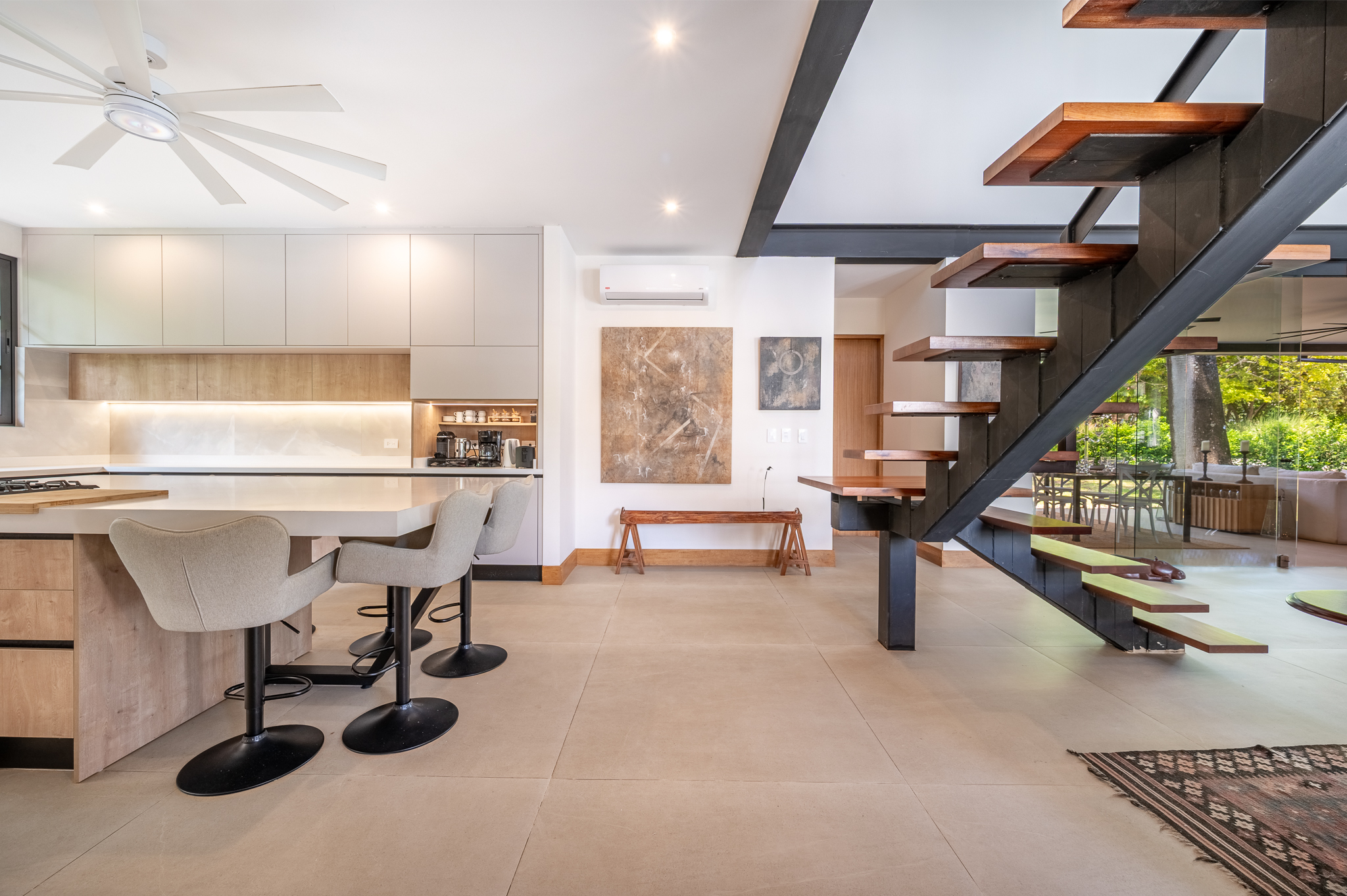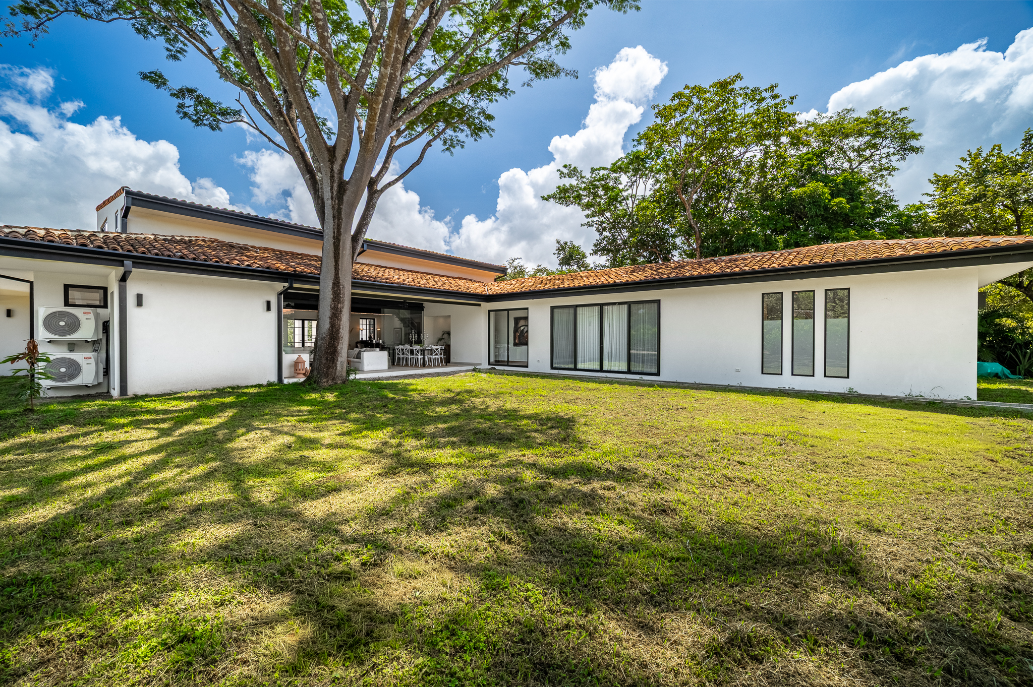 The exterior showcases Mediterranean character, while the interior embraces open, modern living. The chef’s kitchen includes high-end appliances and ample counter space, flowing into a spacious living area with double-height ceilings. Indoor and outdoor dining areas invite both elegant dinners and relaxed gatherings. Outside, a mature tree anchors the patio, adding charm and shade to the terrace—perfect for enjoying Guanacaste’s sunny climate. The property also offers a two-car carport and extra parking.