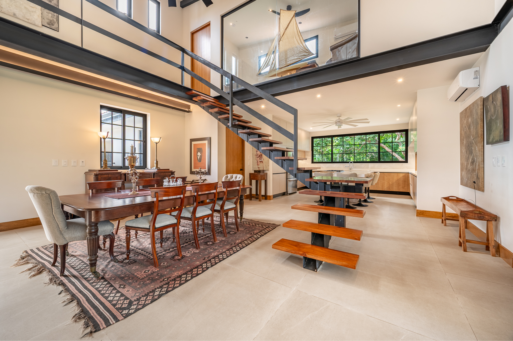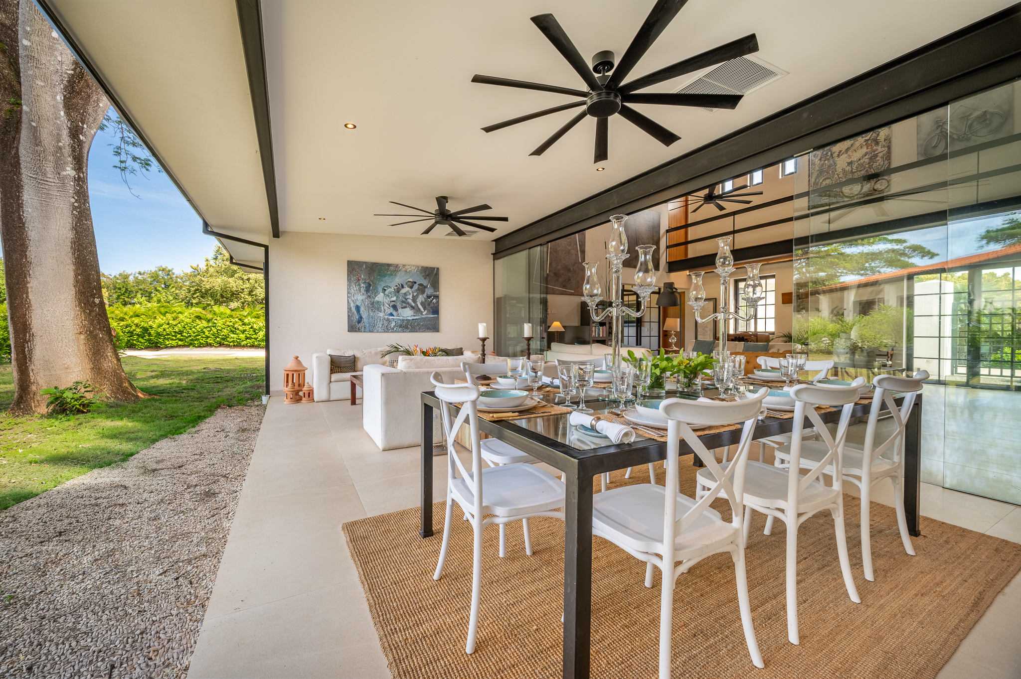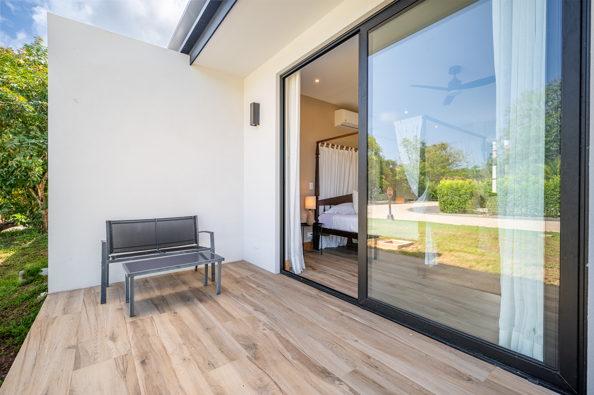 The exterior showcases Mediterranean character, while the interior embraces open, modern living. The chef’s kitchen includes high-end appliances and ample counter space, flowing into a spacious living area with double-height ceilings. Indoor and outdoor dining areas invite both elegant dinners and relaxed gatherings. Outside, a mature tree anchors the patio, adding charm and shade to the terrace—perfect for enjoying Guanacaste’s sunny climate. The property also offers a two-car carport and extra parking.