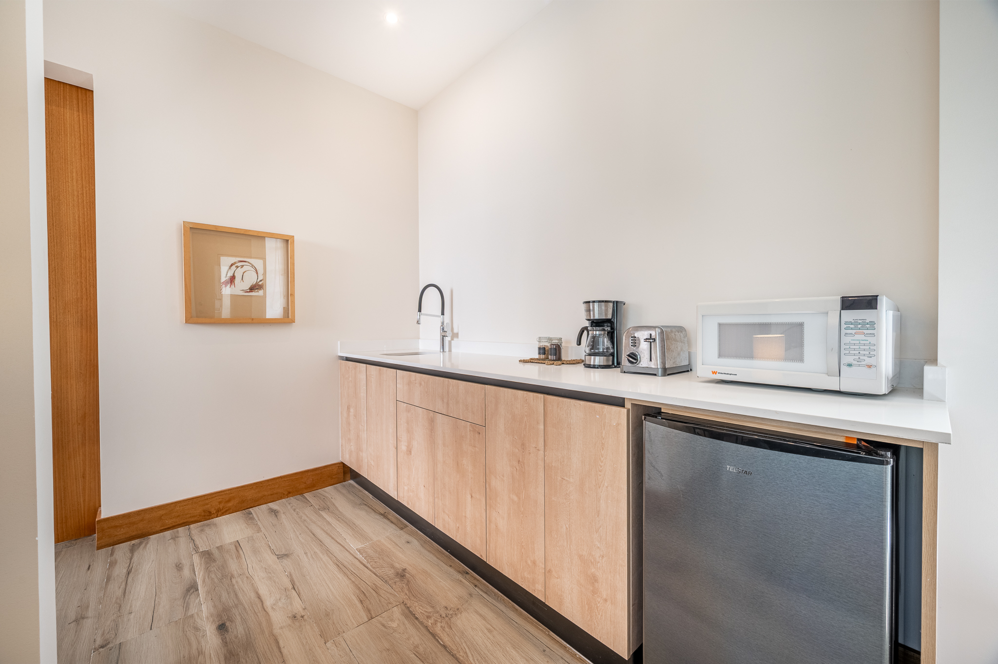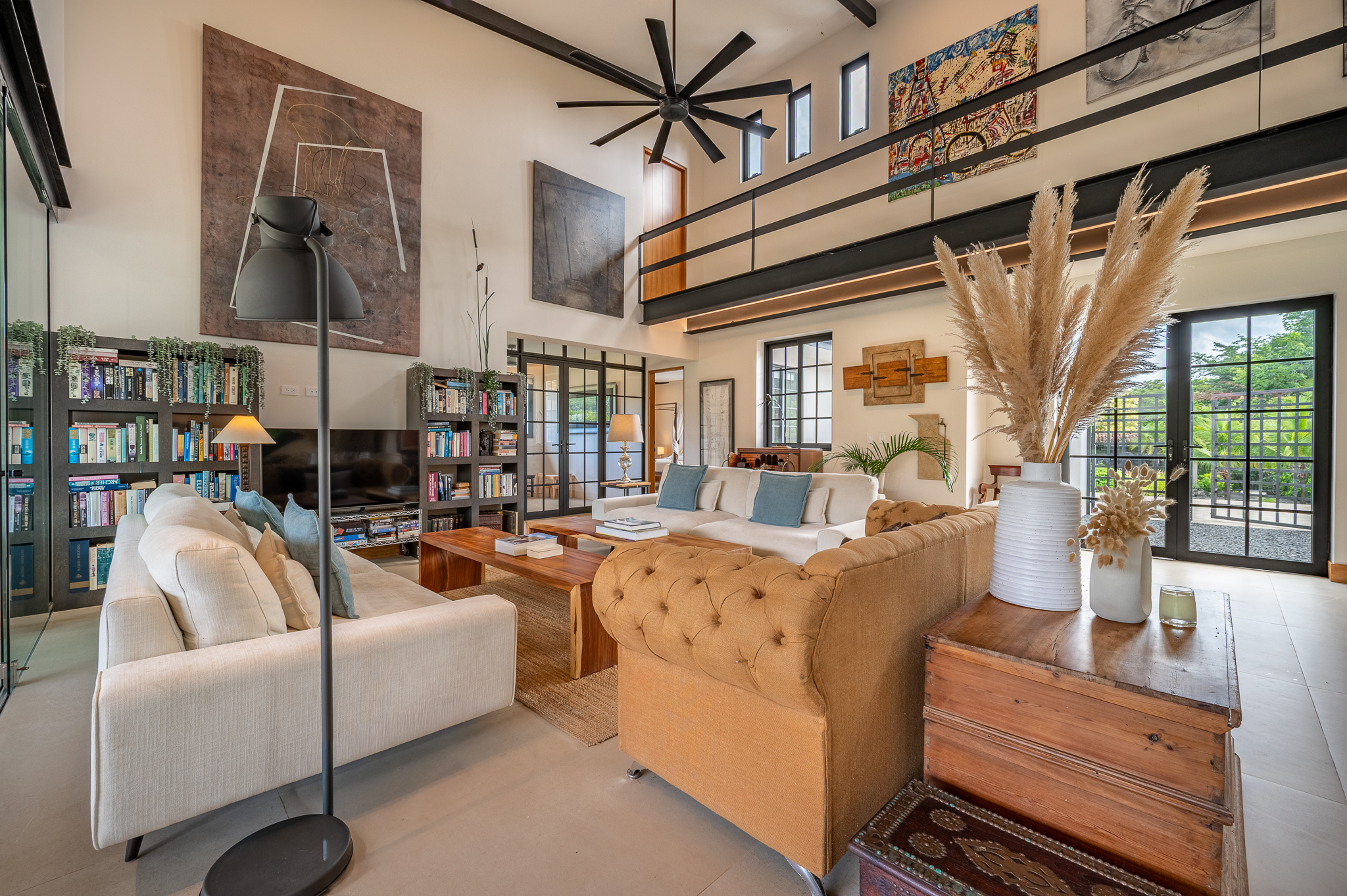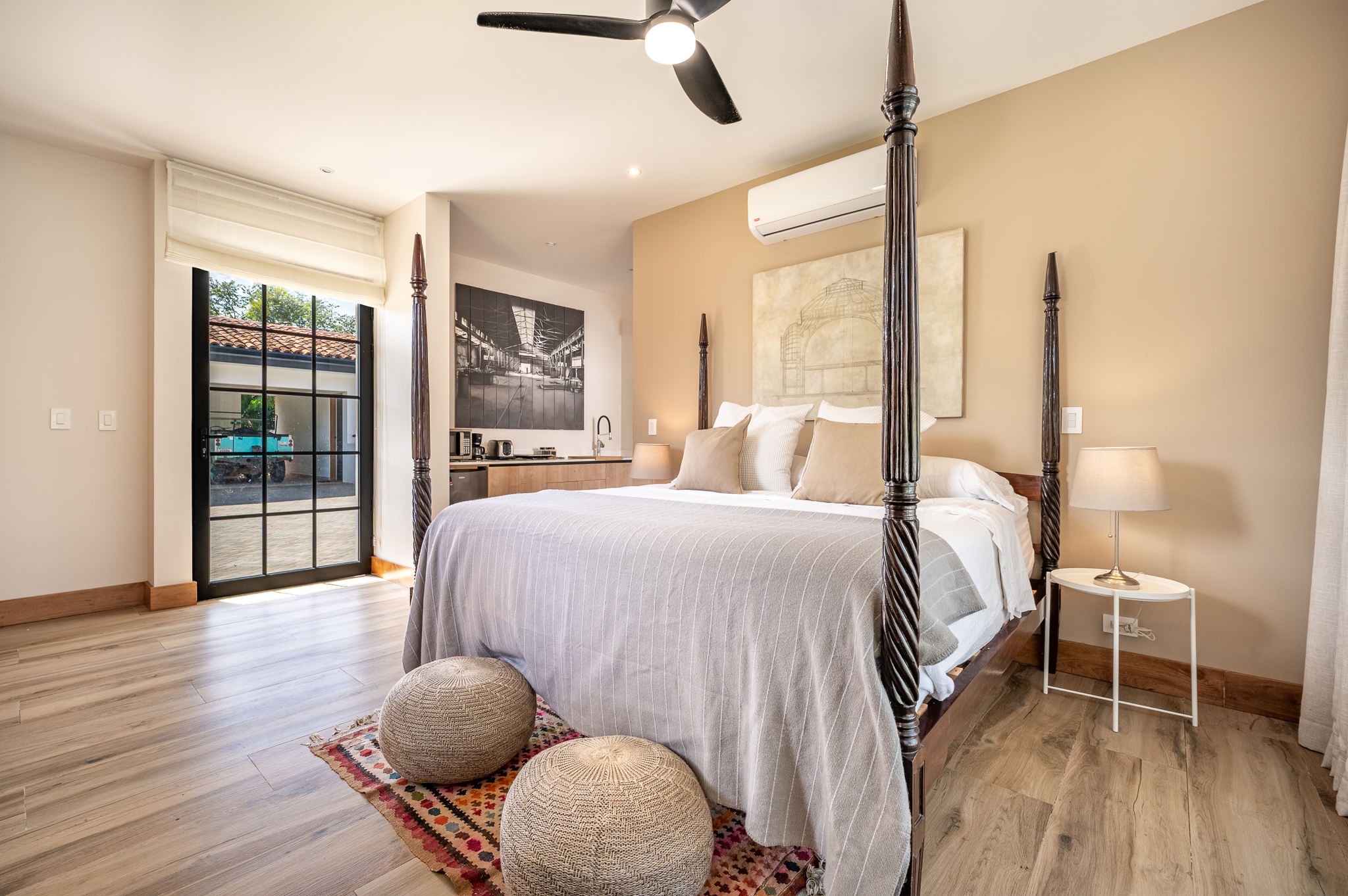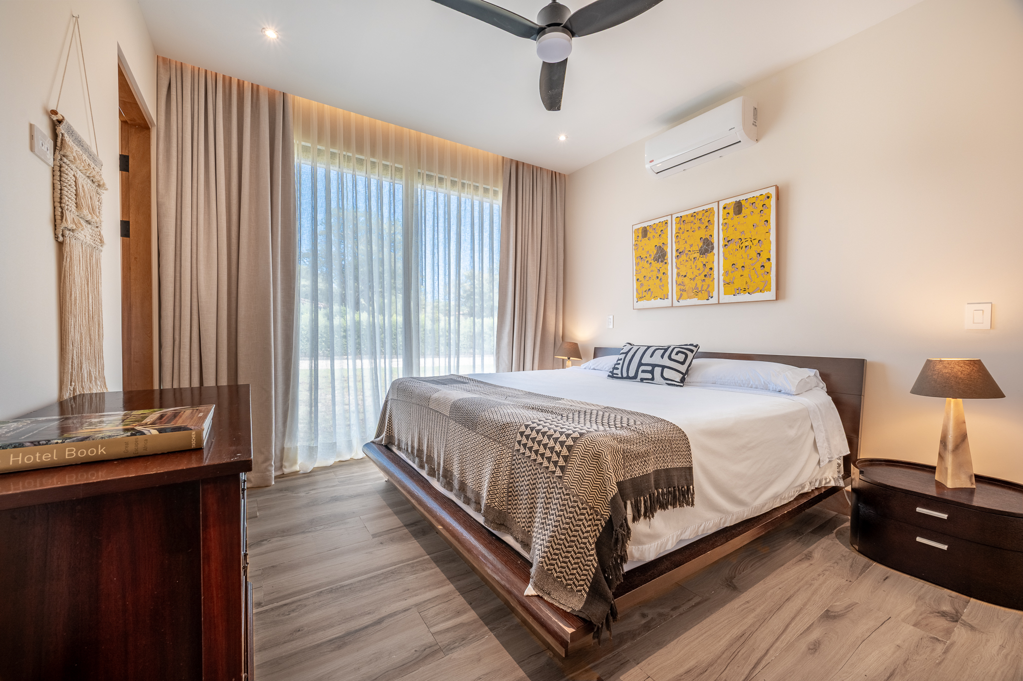 The exterior showcases Mediterranean character, while the interior embraces open, modern living. The chef’s kitchen includes high-end appliances and ample counter space, flowing into a spacious living area with double-height ceilings. Indoor and outdoor dining areas invite both elegant dinners and relaxed gatherings. Outside, a mature tree anchors the patio, adding charm and shade to the terrace—perfect for enjoying Guanacaste’s sunny climate. The property also offers a two-car carport and extra parking.