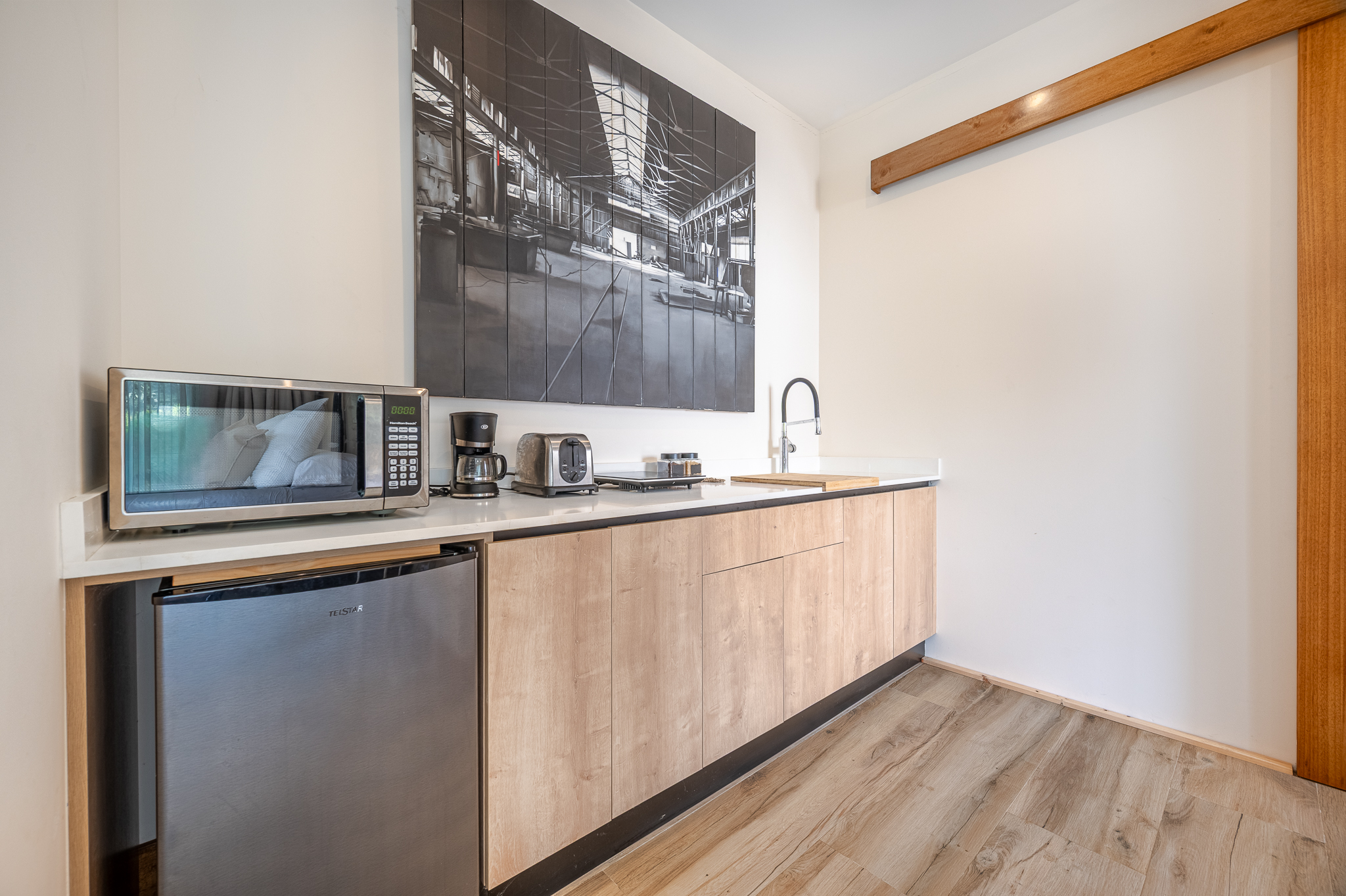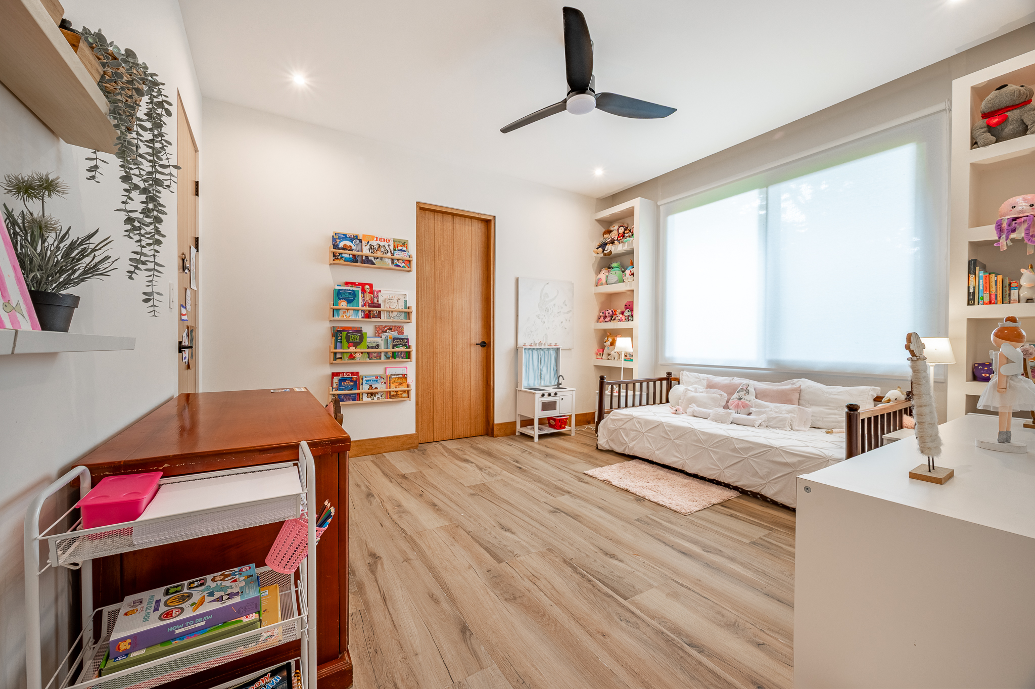 One bedroom is specially designed for children, creating a cheerful and playful space. The home’s design highlights locally sourced wood, including custom bleachers built into the staircase, combining natural warmth with clean, modern lines.