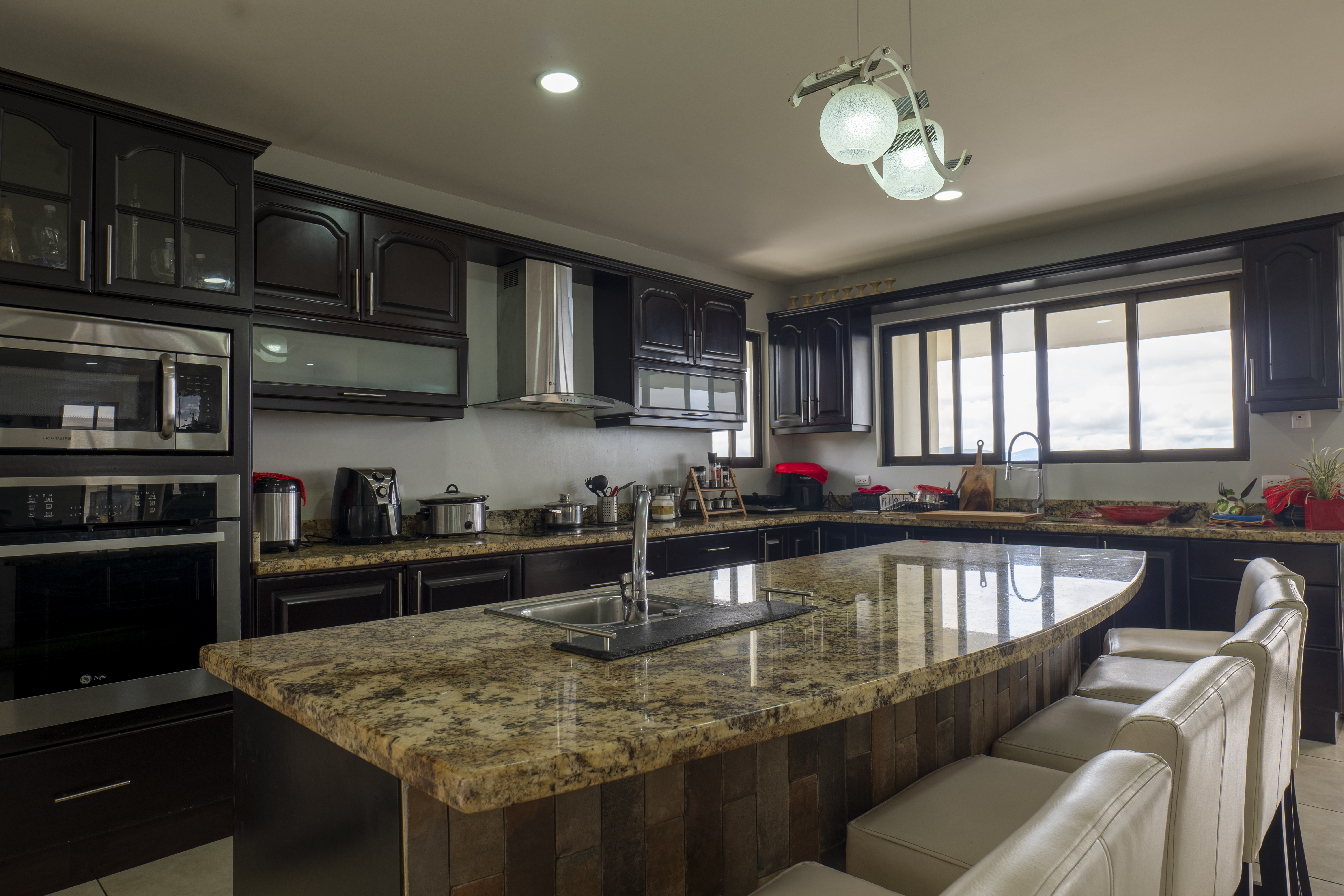 HOUSE ONE: 3 bedrooms with full bathrooms, the master has a walk-in closet 2 half bathrooms Spacious living room and dining room Kitchen with beautiful wooden furniture and natural granite countertops with a large island and breakfast area as well as a pantry. Laundry room area Indoor parking for 4 vehicles 150m2 multipurpose room with kitchenette and full bathroom Terraces and balconies surround the house.