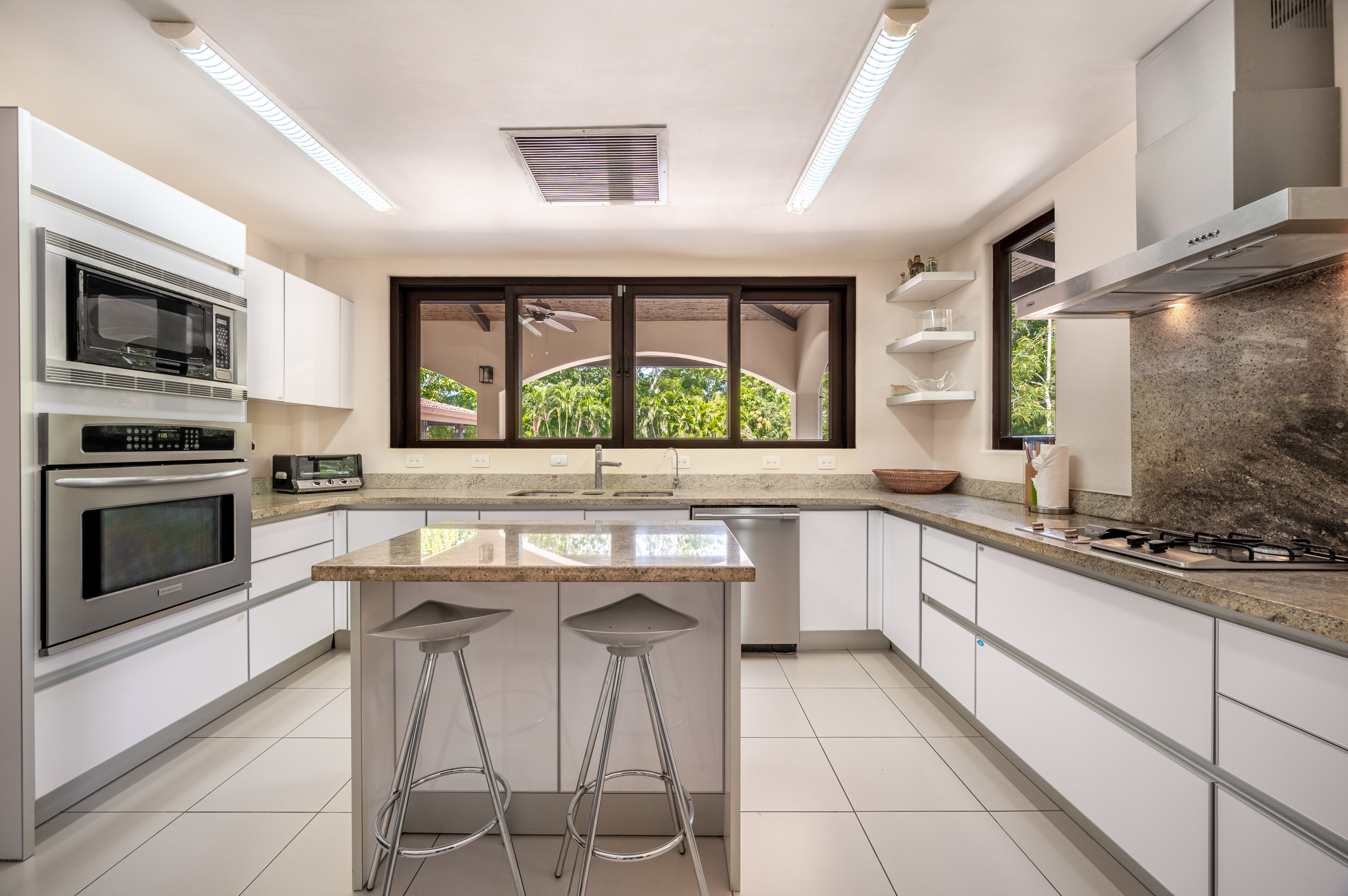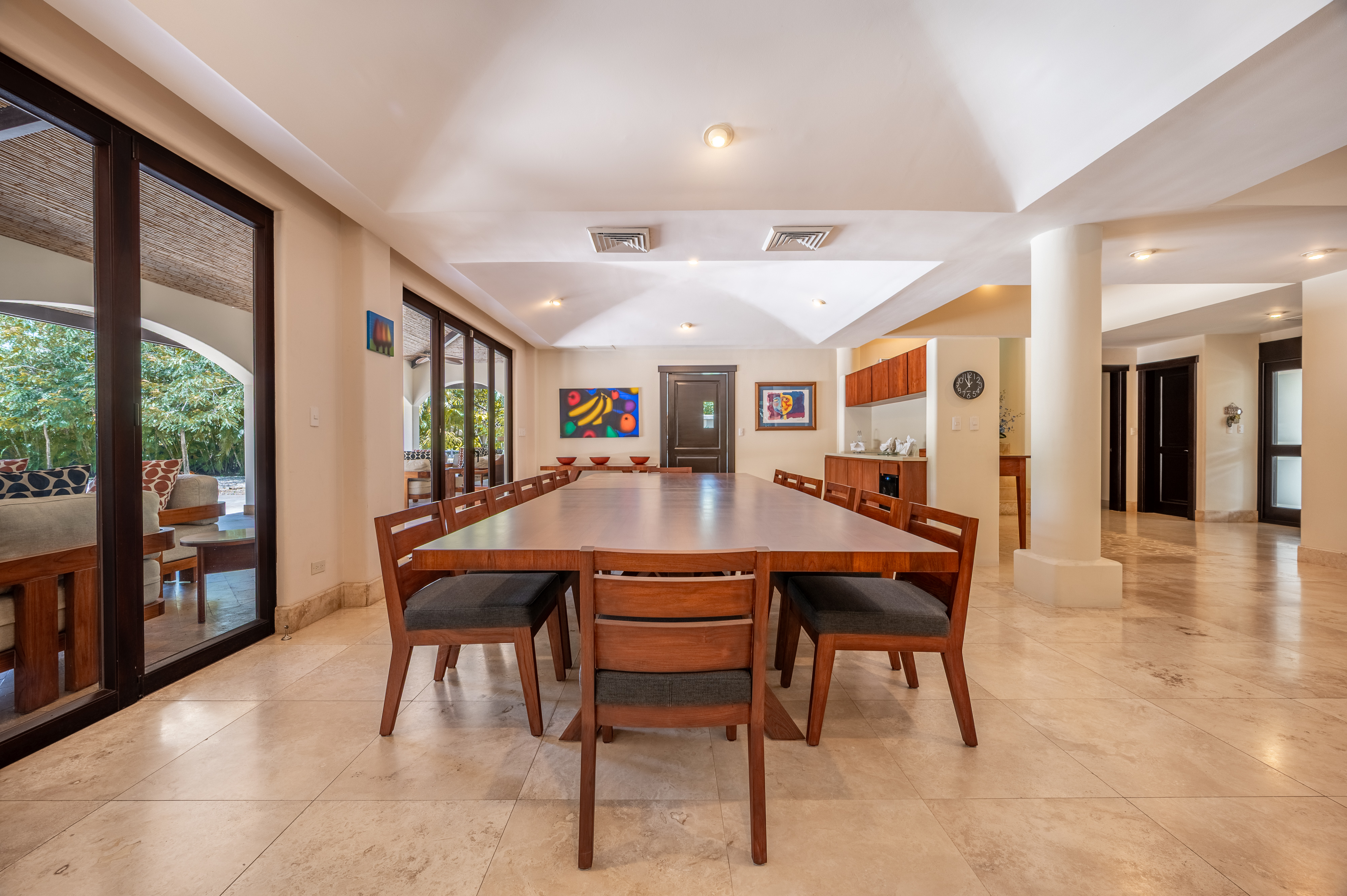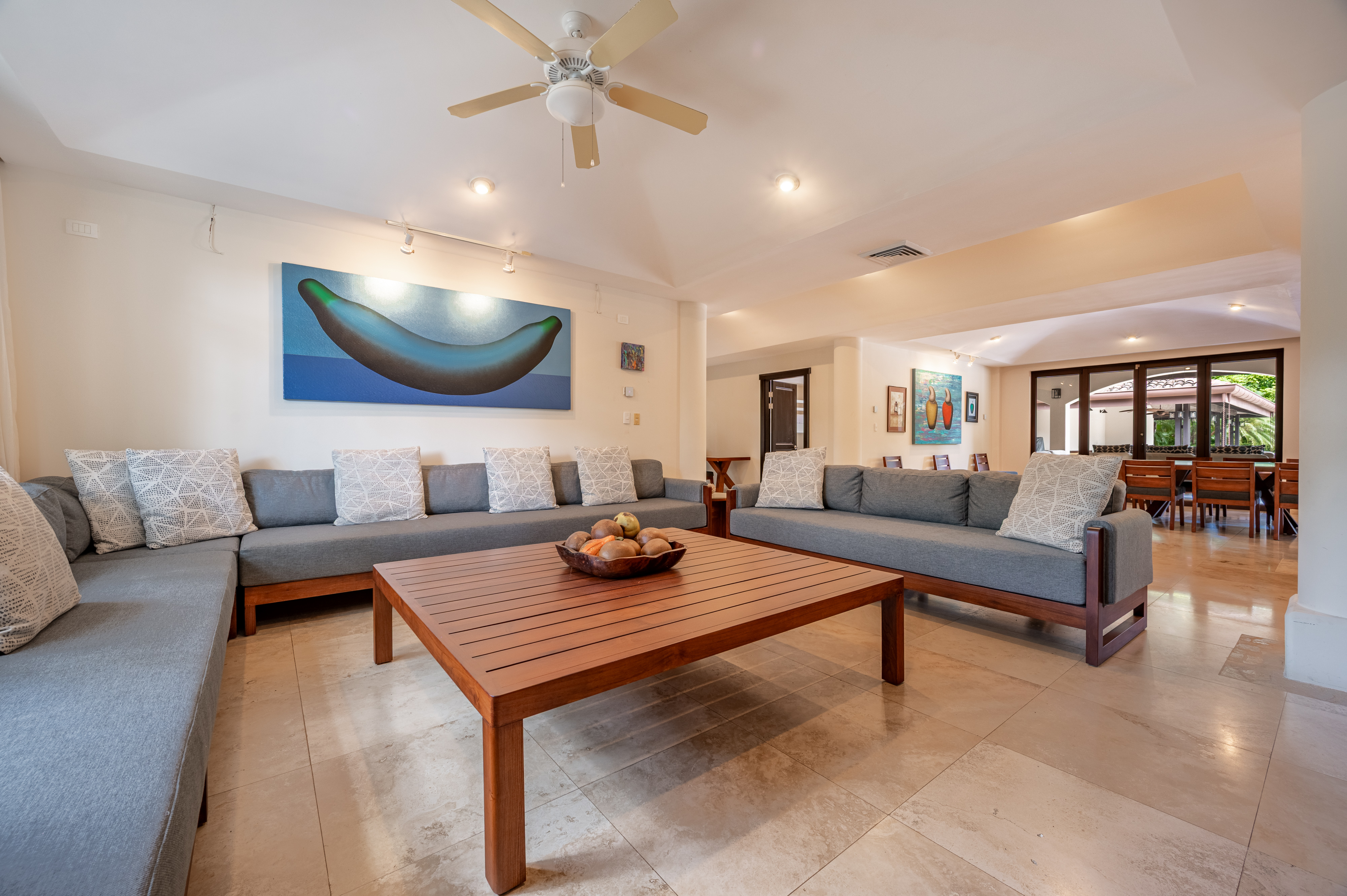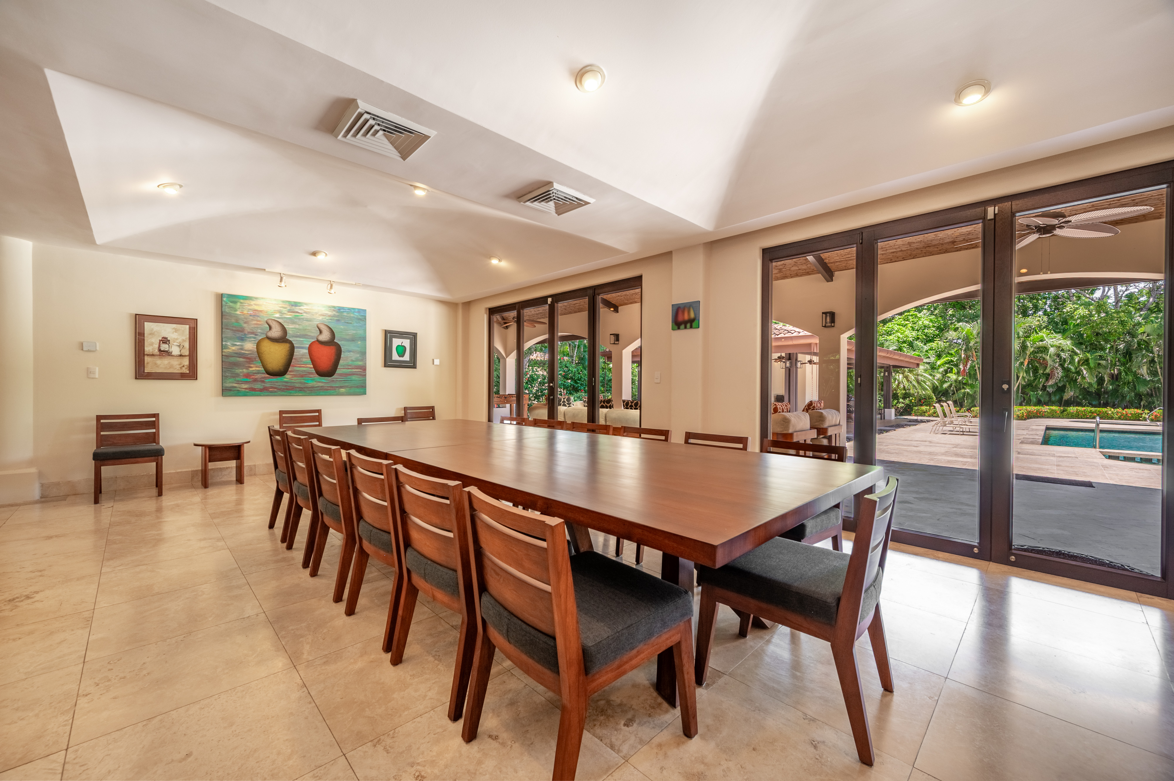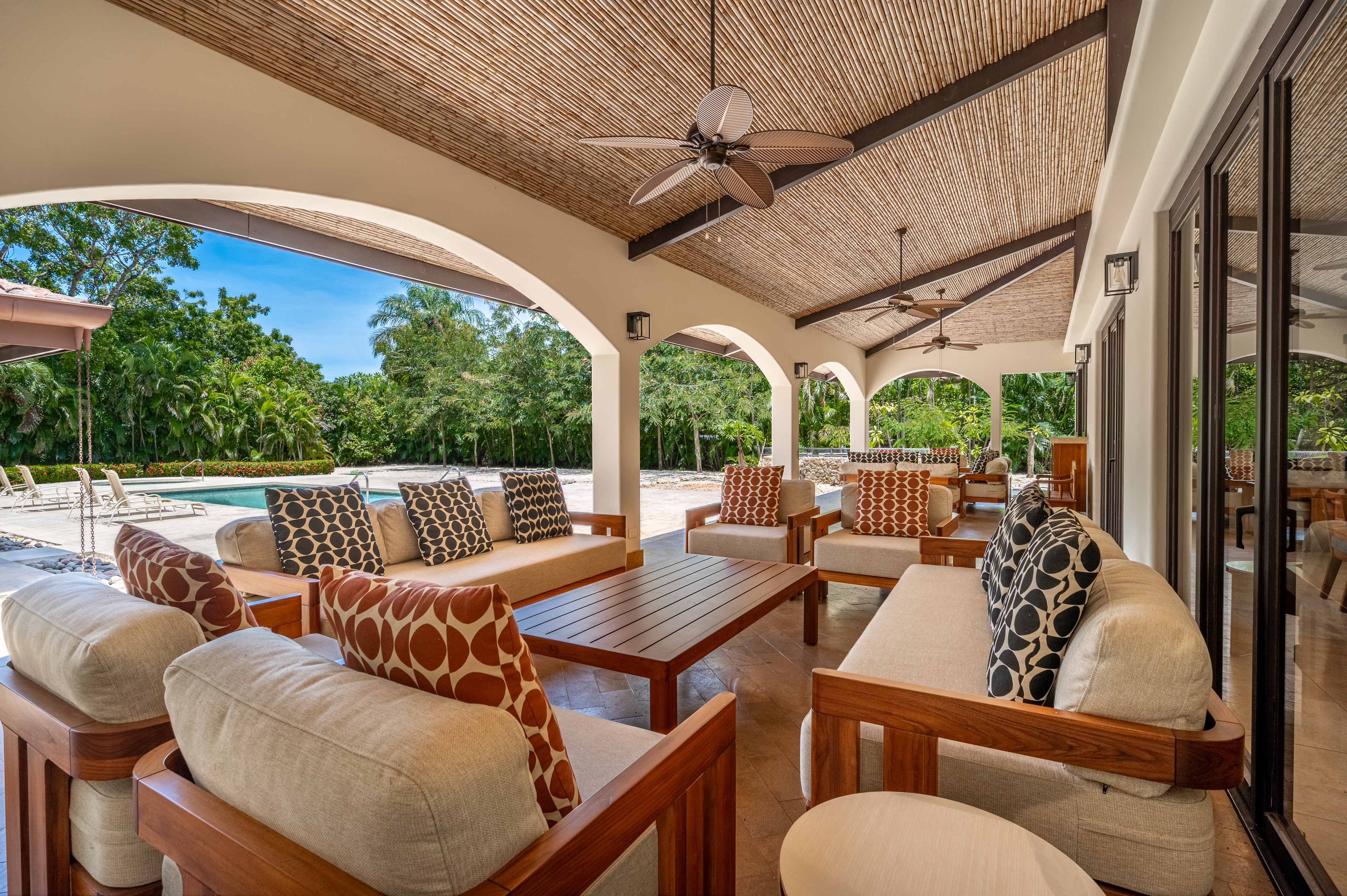 Stunning luxury residence for sale in Hacienda Pinilla Guanacaste. Located in the prestigious Reserva de Golf community, this property offers 740 m² of refined construction on a 2685 m² lot. Fully furnished and move-in ready, the home combines timeless architecture with modern comfort. It features seven bedrooms including a master suite with private bath, walk-in closet and balcony, four guest bedrooms each with ensuite bathrooms, and a convenient main-floor guest suite. Expansive social areas and bright interiors open into a gourmet kitchen with pantry and storage, a family TV lounge, and elegant spaces for relaxation and entertaining.