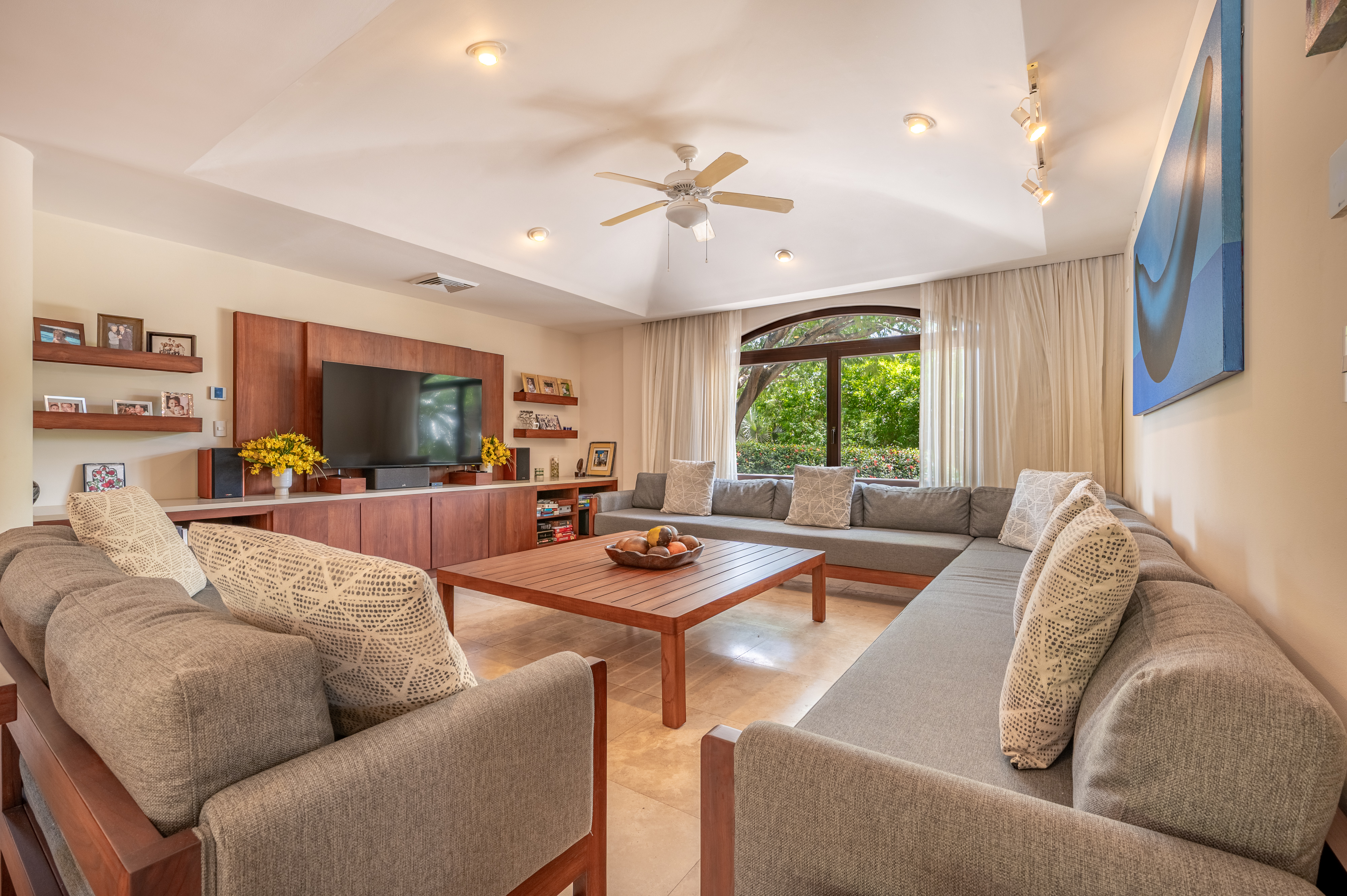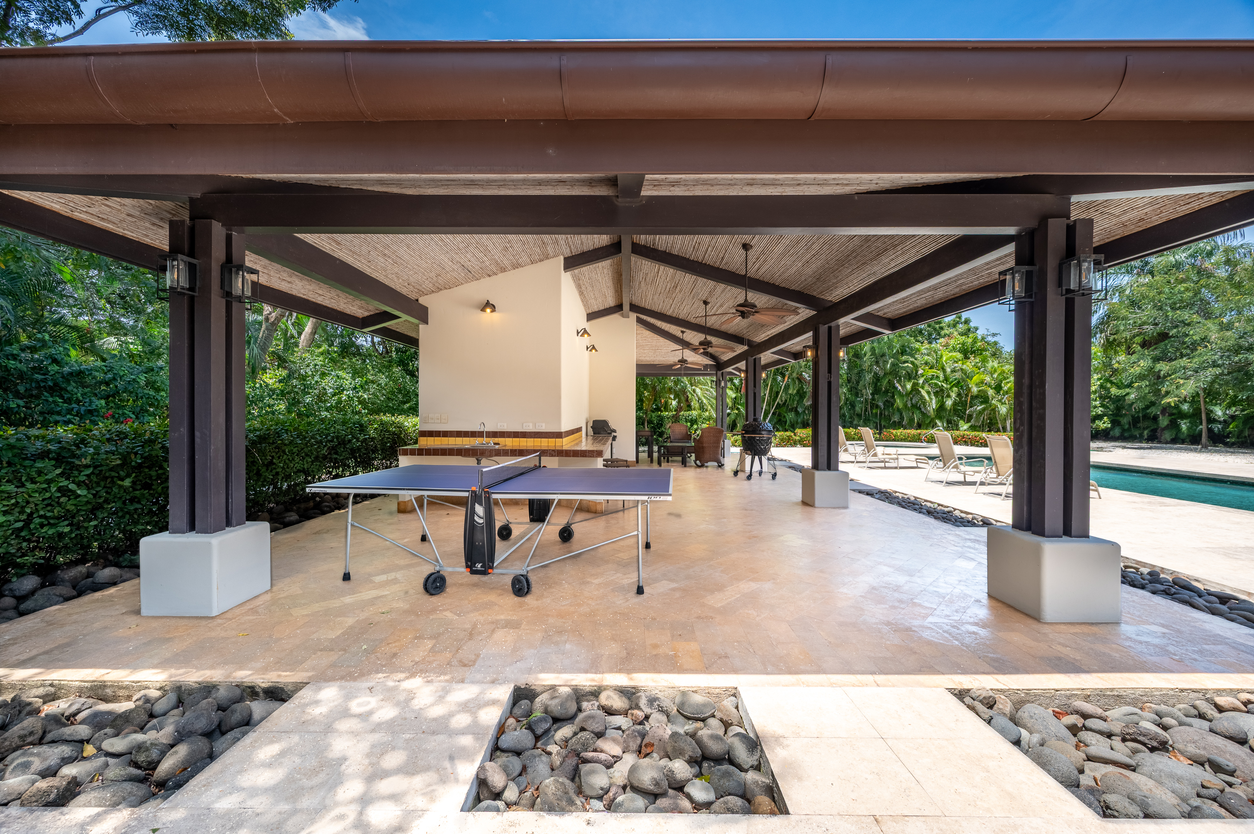 A covered terrace invites al fresco dining alongside a sparkling pool with jacuzzi, solar heating and a spacious entertainment rancho perfect for gatherings. The residence includes a two-car garage with built-in storage, a service quarter with private bath, and a laundry area. High-end finishes include travertine stone flooring, solid wood custom furniture, natural stone accents, and central air conditioning with four independent zones, creating an atmosphere of elegance and sophistication.