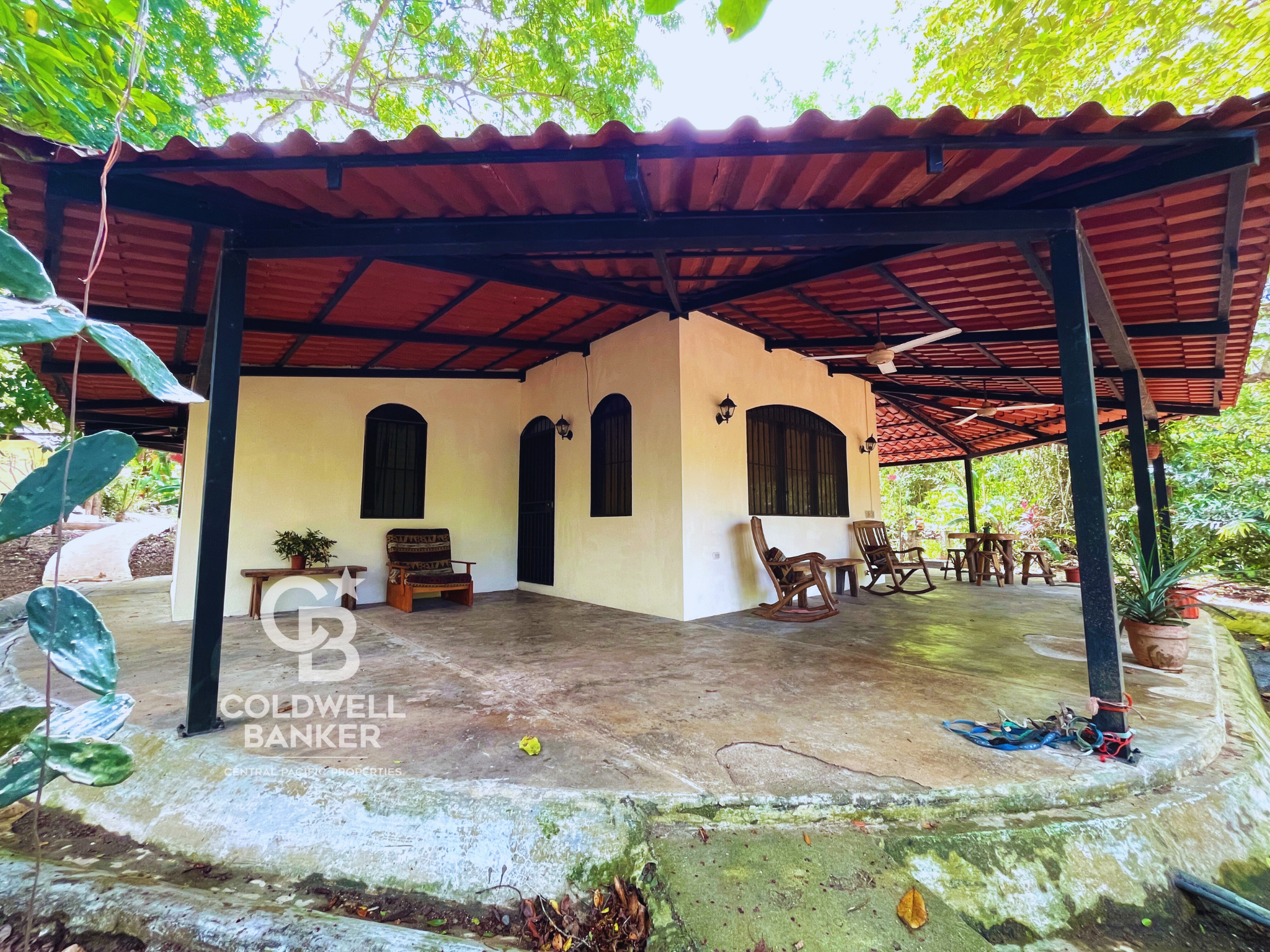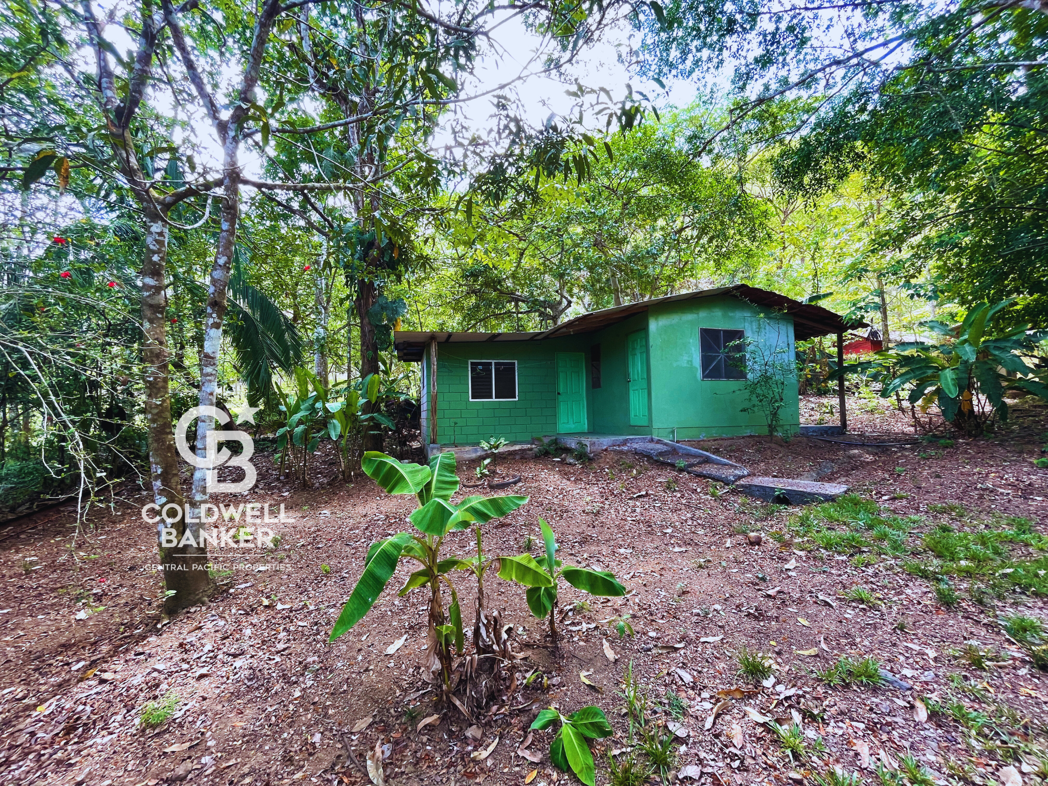 The main house is sturdily built, has 2 bedrooms, each with A/C, a full bathroom with wheelchair accessible wide shower, a large open kitchen and living room, ceiling fans, a covered wrap-around spacious porch with ceiling fans, a flat roof with roof garden, with the possibility of adding a second storey.