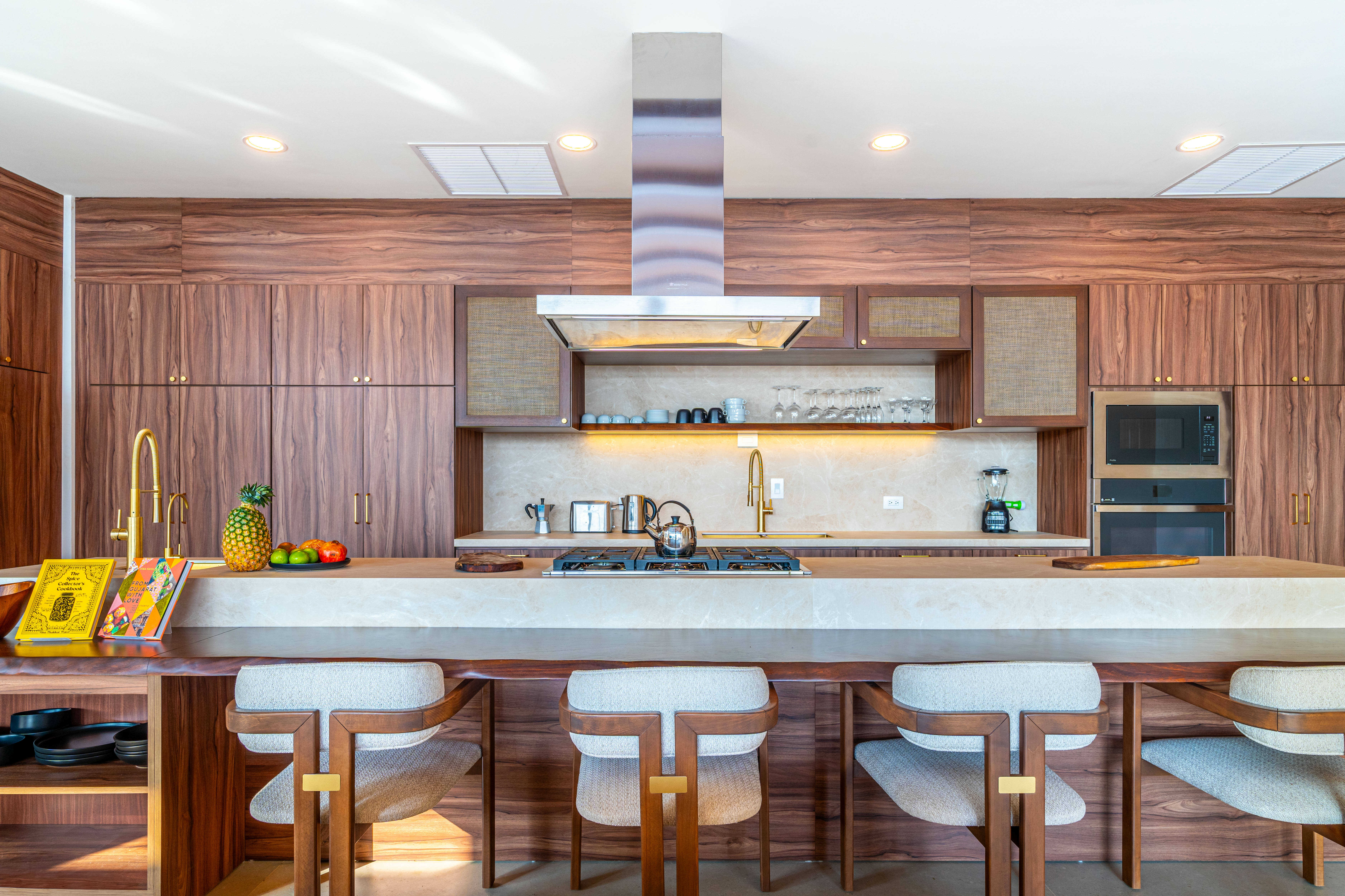 Designed by an award-winning cookbook author specializing in Indian and international cuisine, the fully stocked chef’s kitchen is a dream for culinary enthusiasts. The aroma of fresh local coffee fills the air as breakfast simmers on the stove. Gather around the long wooden dining table, where conversations flow as easily as the wine—or take your meal outdoors, beneath the gentle sway of palm trees.