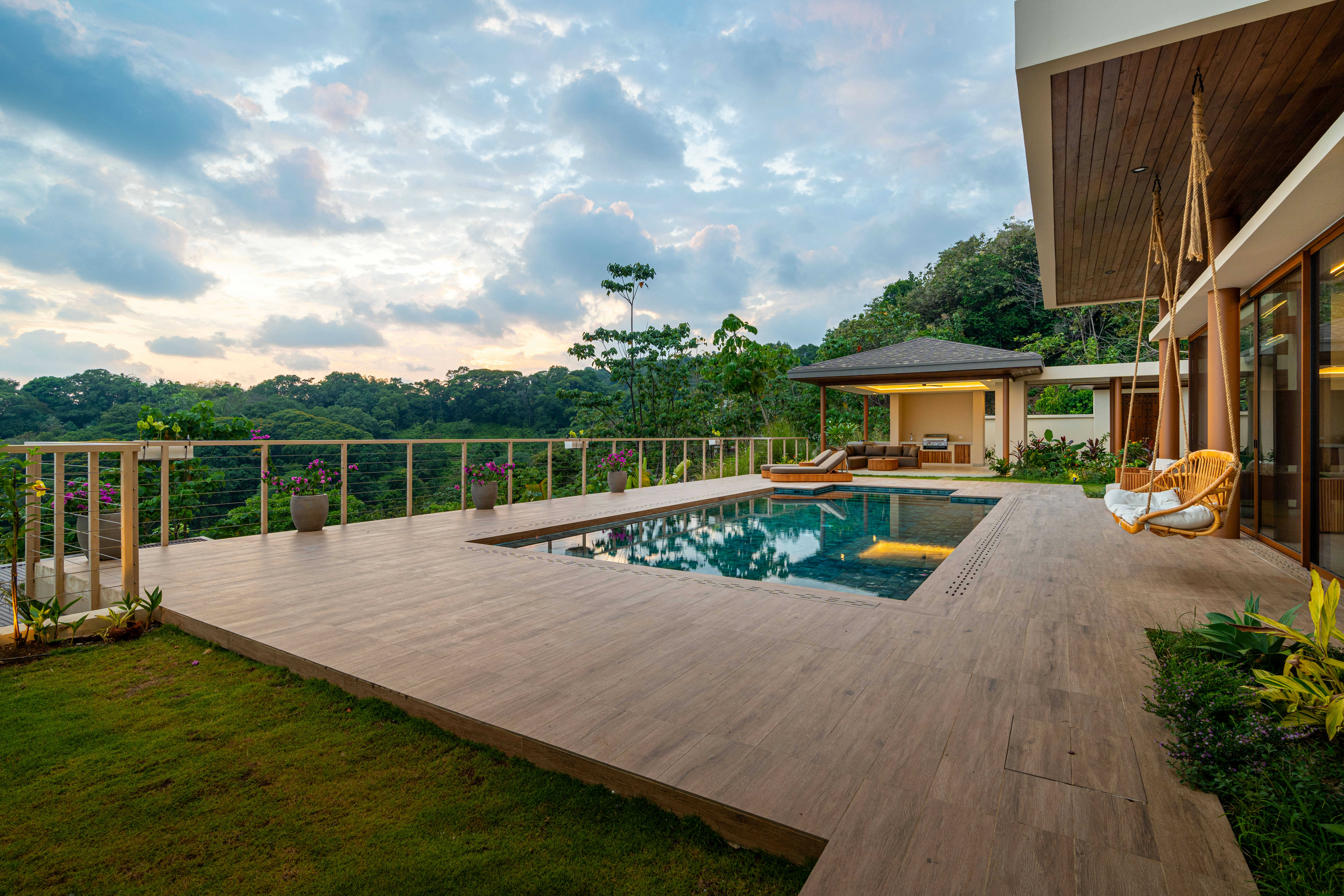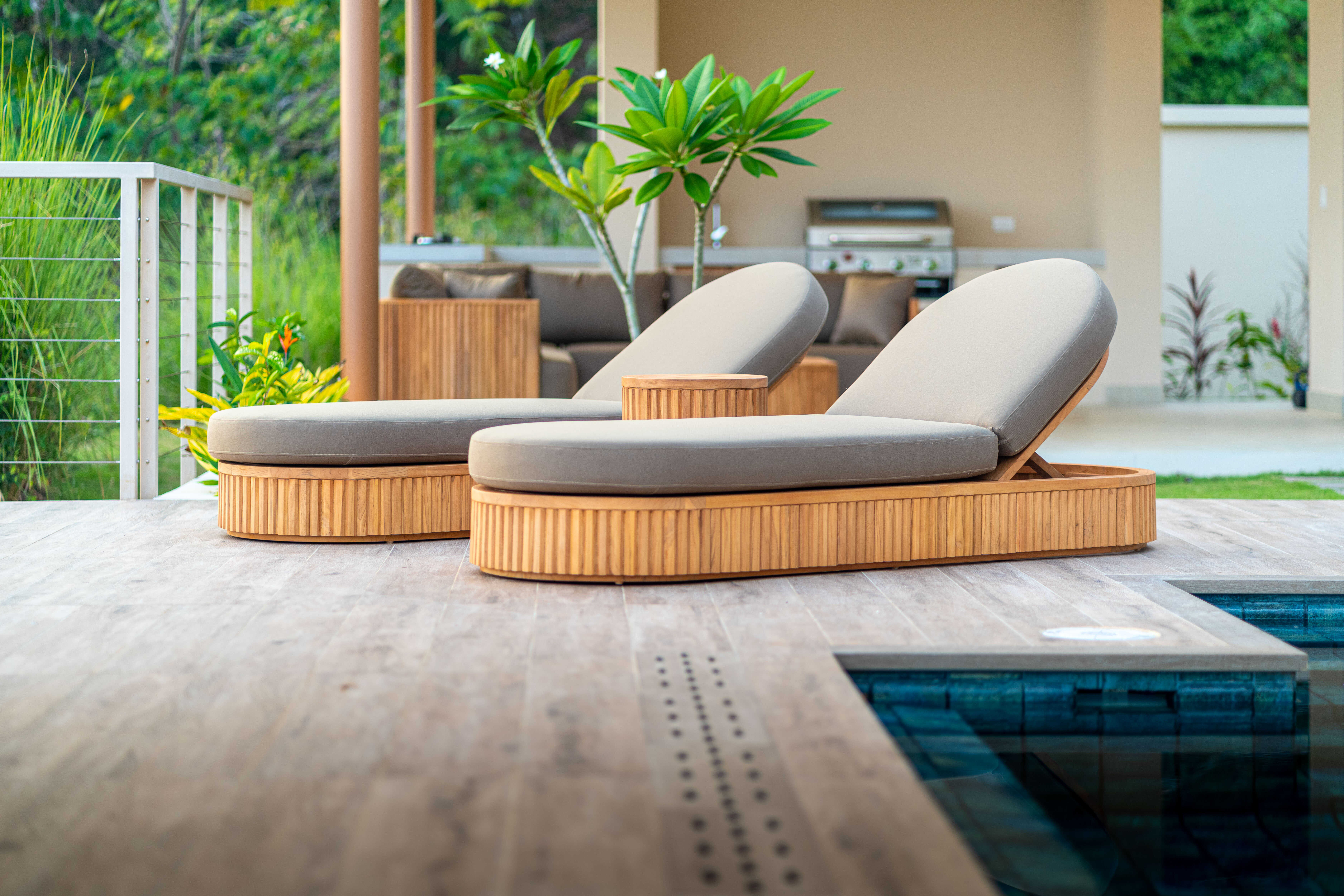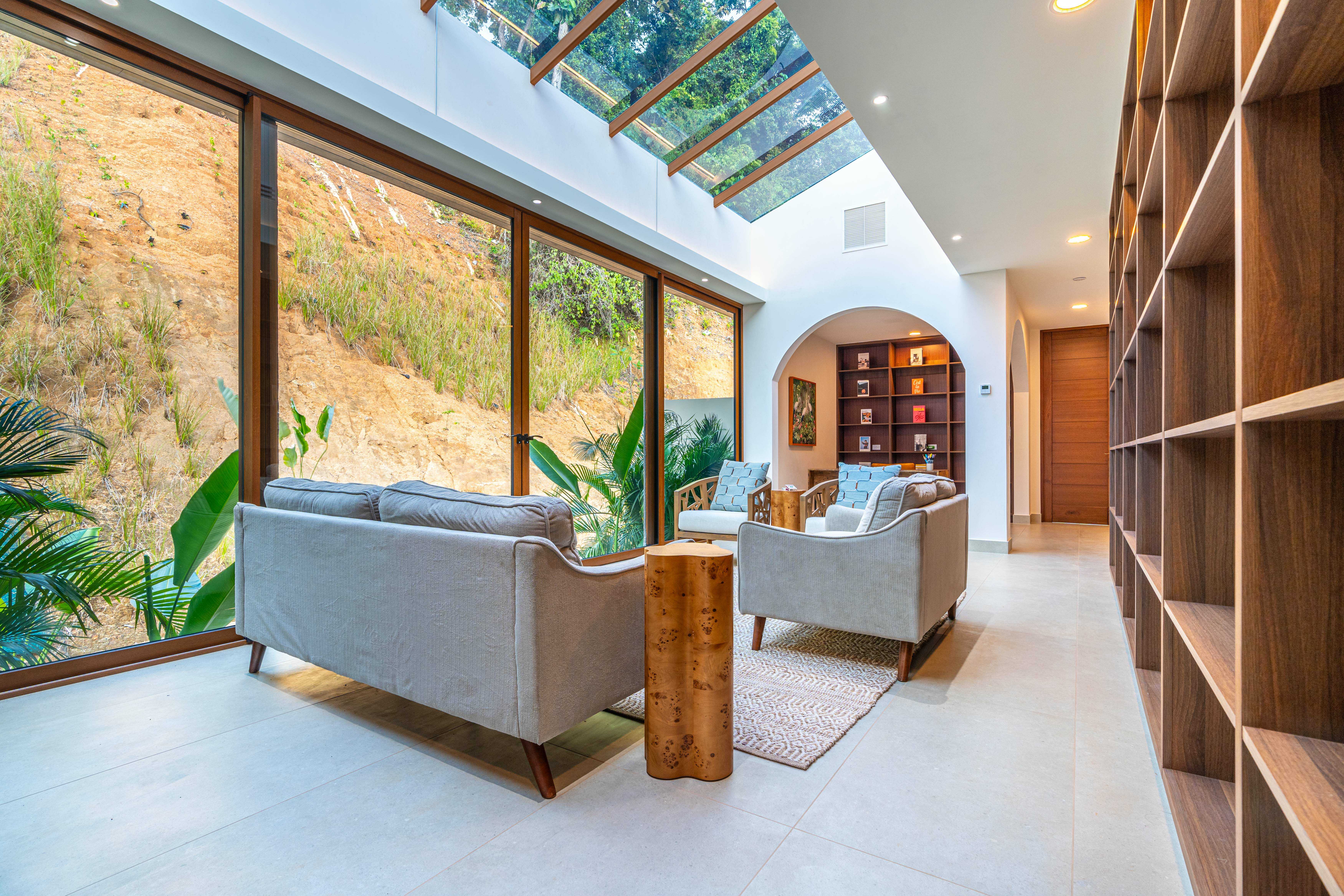 Inside, light dances across hand-selected wood, stone, and woven textures, blending Balinese inspiration with the raw beauty of Costa Rica. Expansive glass doors dissolve the boundary between indoors and out, leading you into the heart of the home—a soaring space designed for connection.
