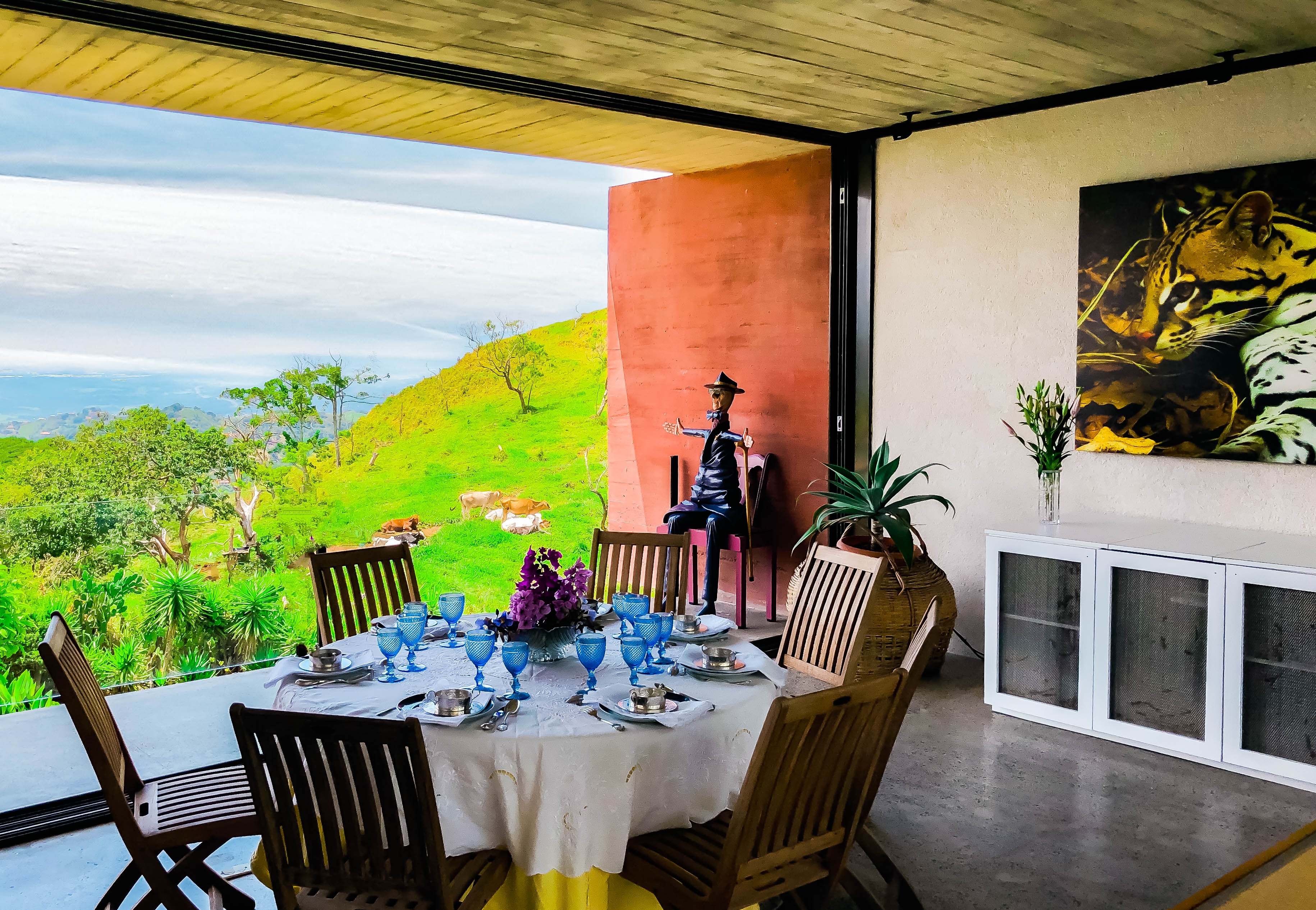Perched above the charming town of Atenas, this modern architectural gem in Vista Atenas offers luxury living, breathtaking views, and multiple income opportunities. Known as “The Glass Farmhouse,” the property features a sleek main home and three tropical guest homes, all with panoramic views of the Central Valley, including San José, surrounding mountains, and volcanoes.