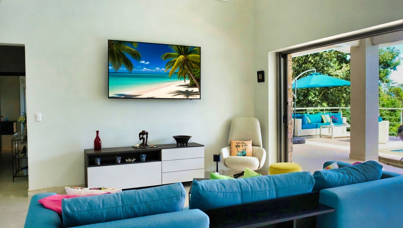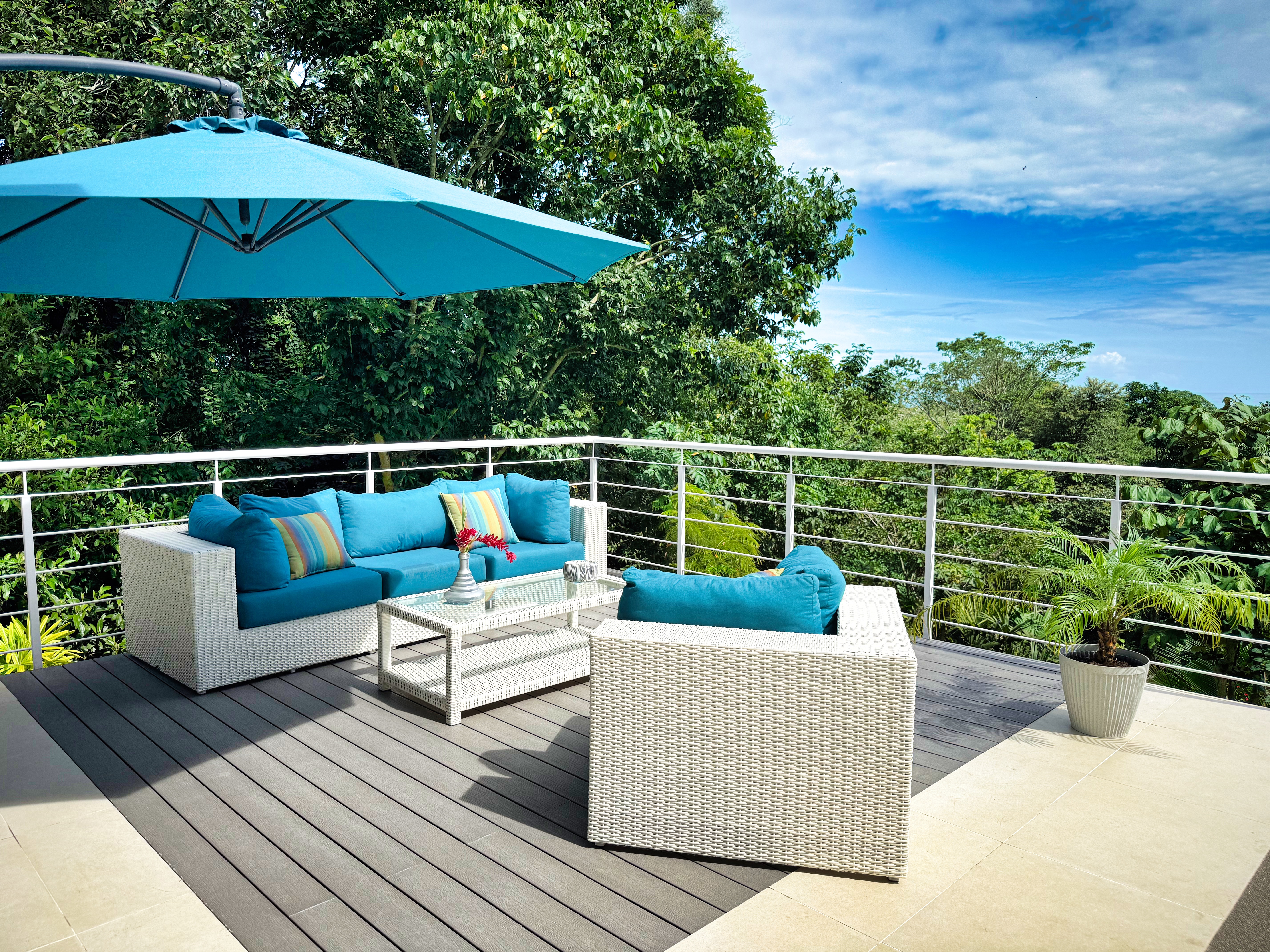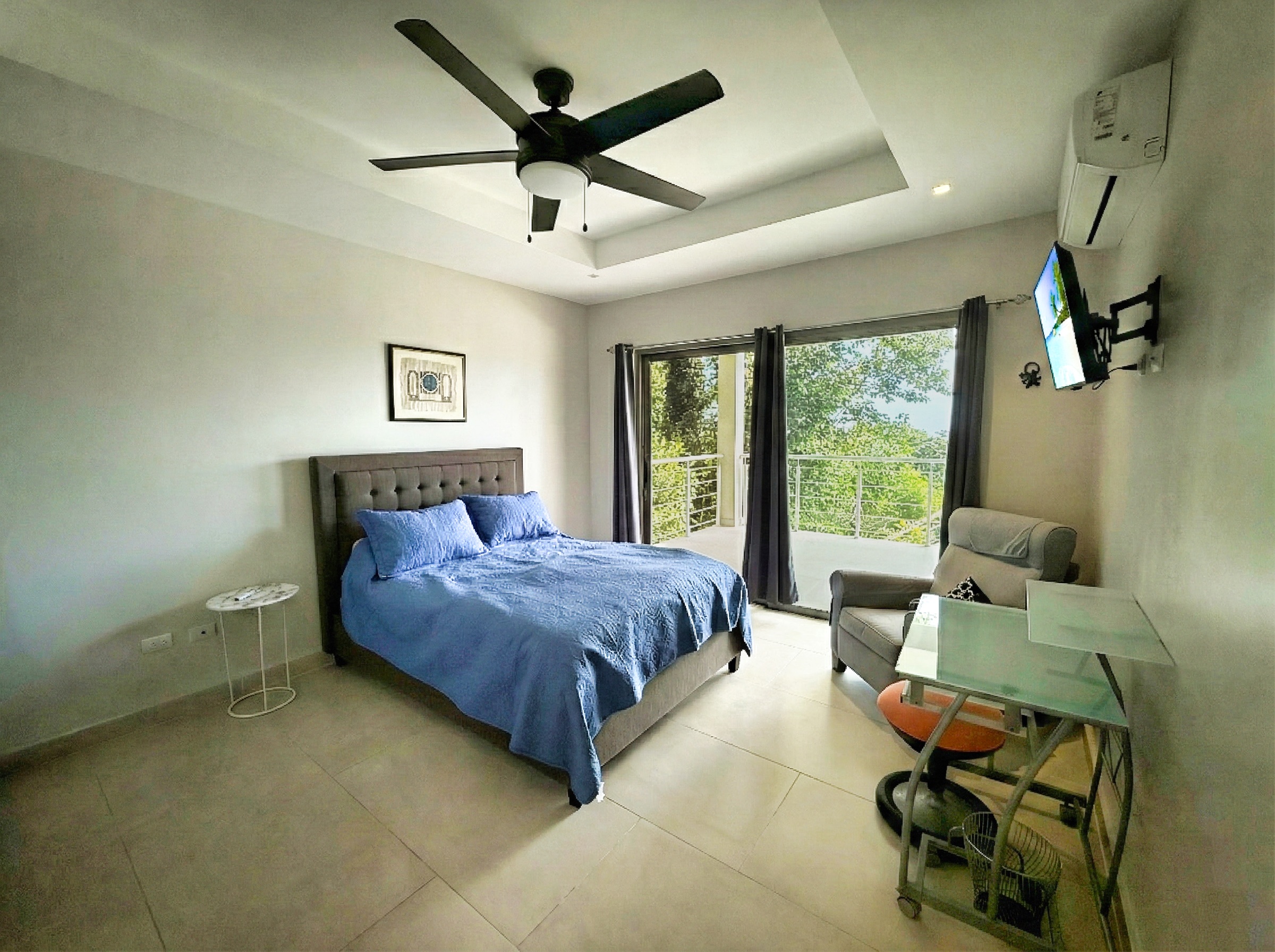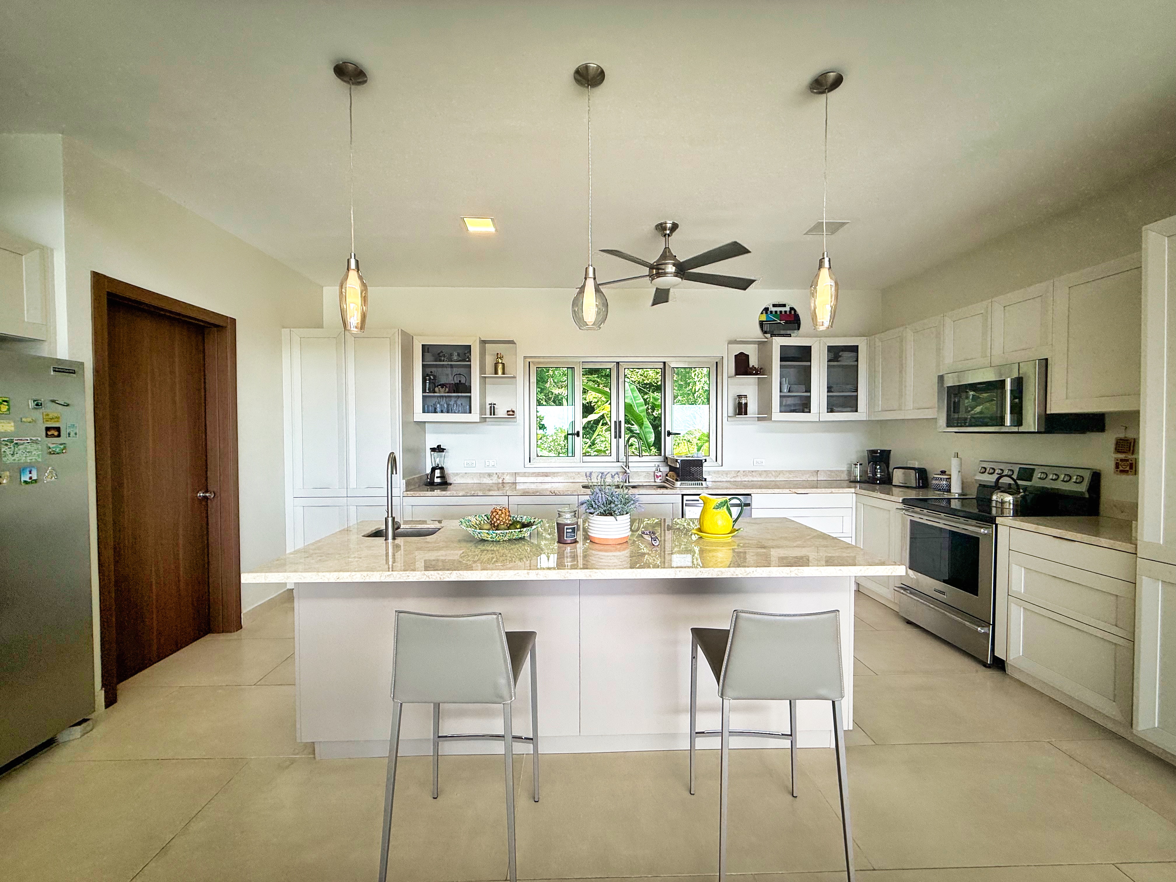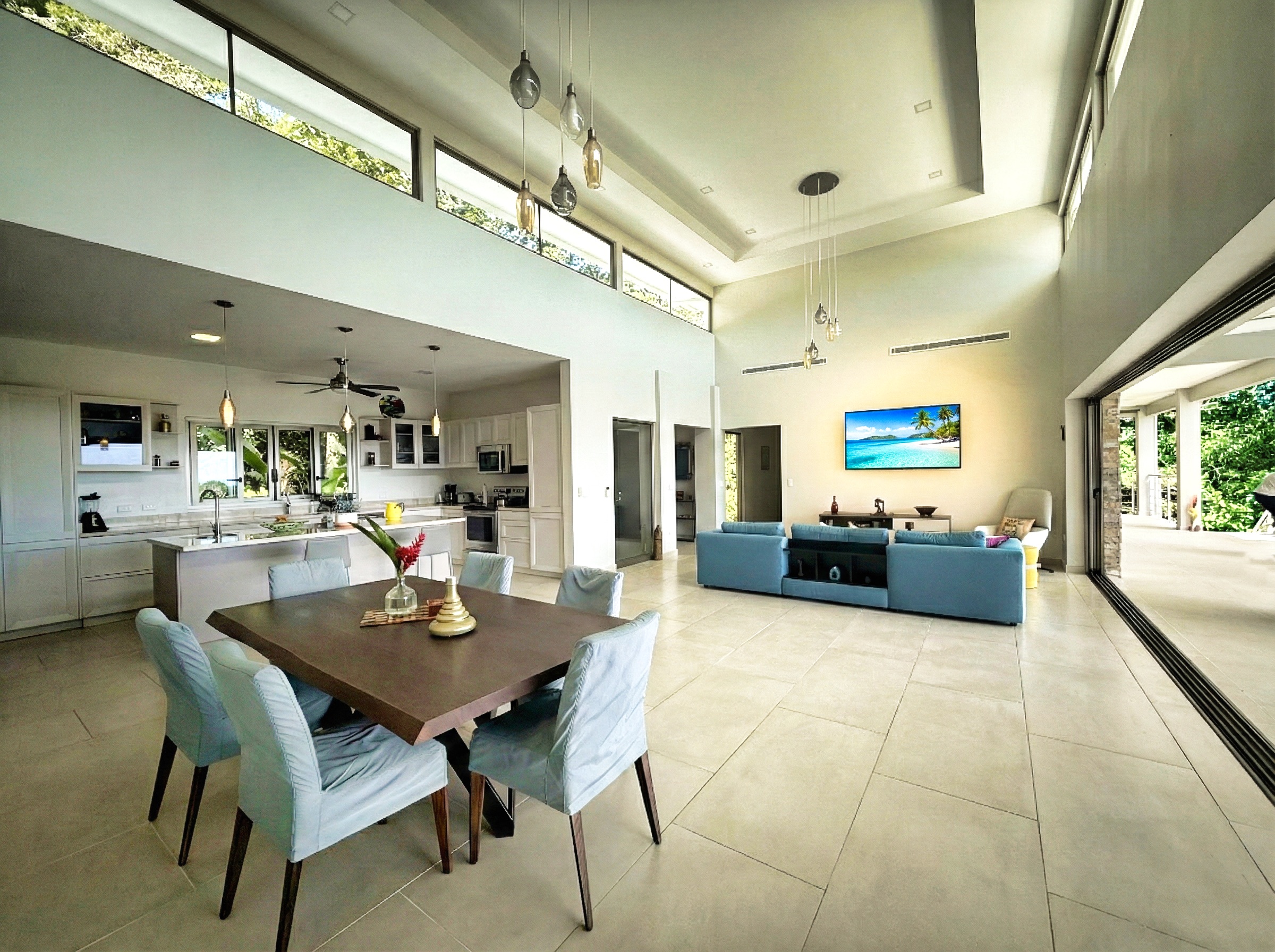 Built in late 2020 on an elevated plateau, the primary home enjoys commanding panoramic views of the Caribbean Sea, enveloped by dense tropical rainforest and serene natural surroundings. Accessible via a private, solar-illuminated driveway bordered by meticulously landscaped gardens, this single-level brick residence provides 366 square meters of refined interior living space, complemented by 122 square meters of integrated outdoor areas designed for seamless relaxation.
