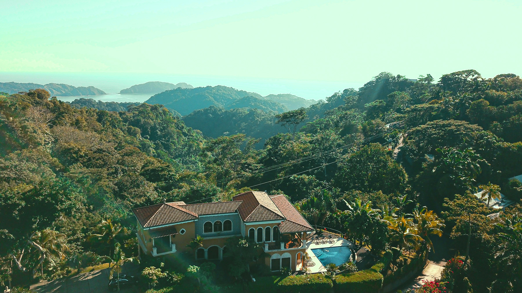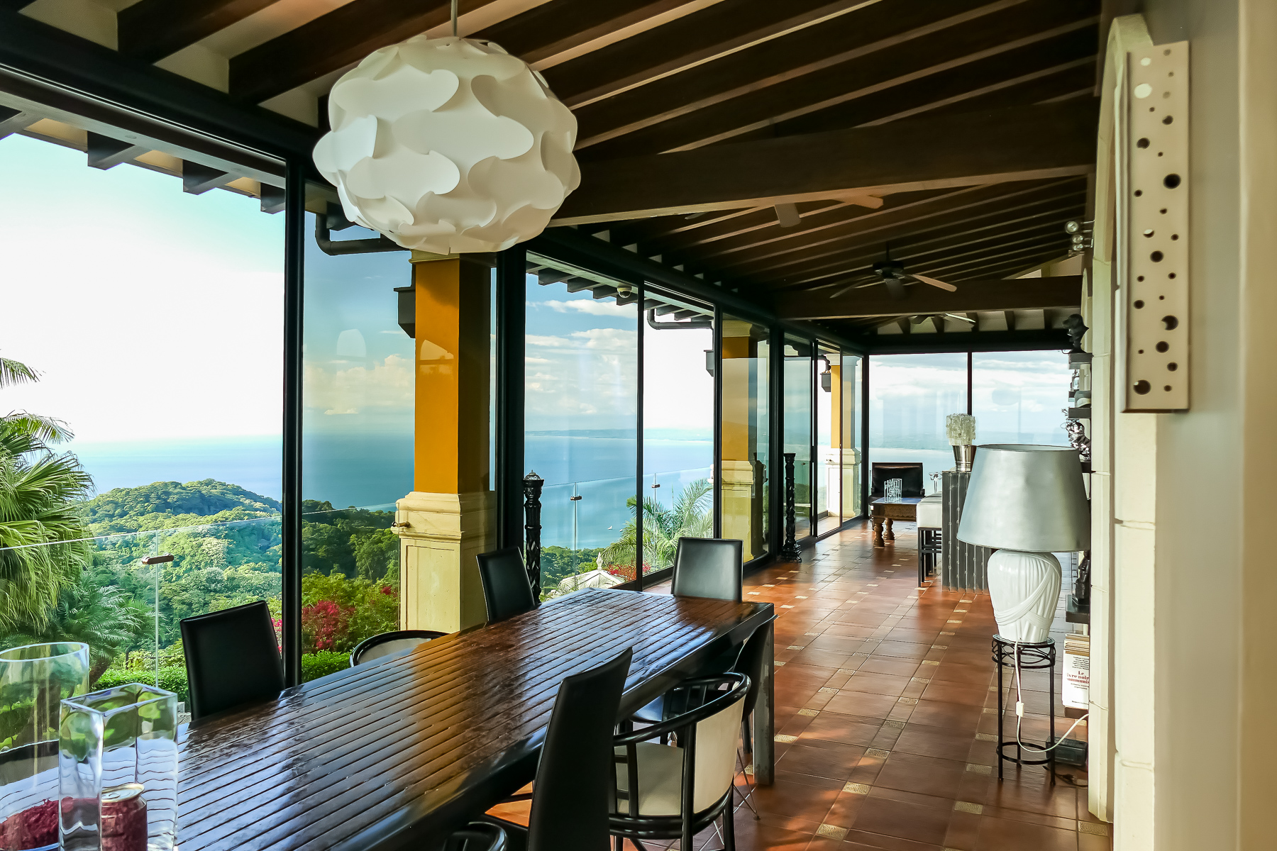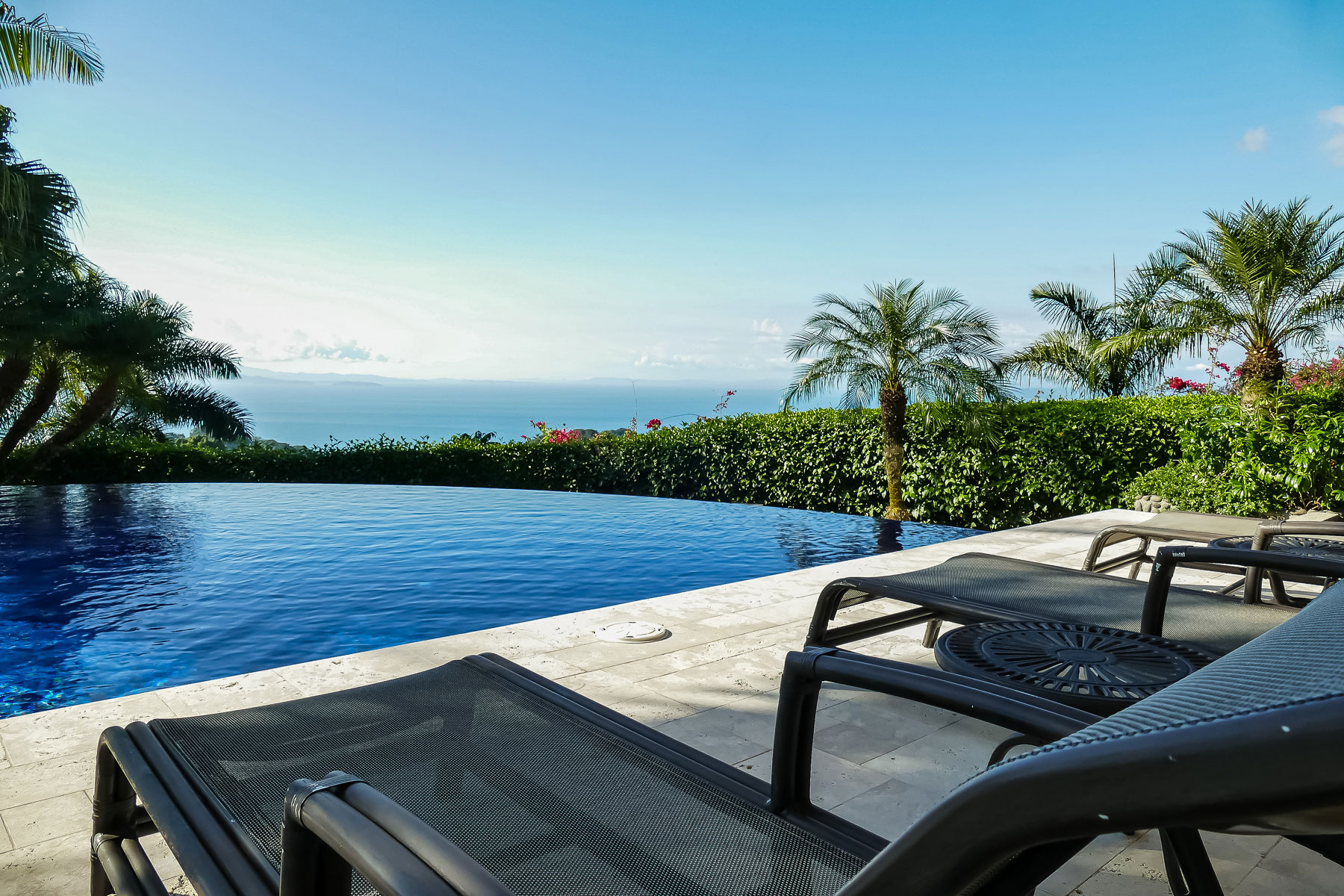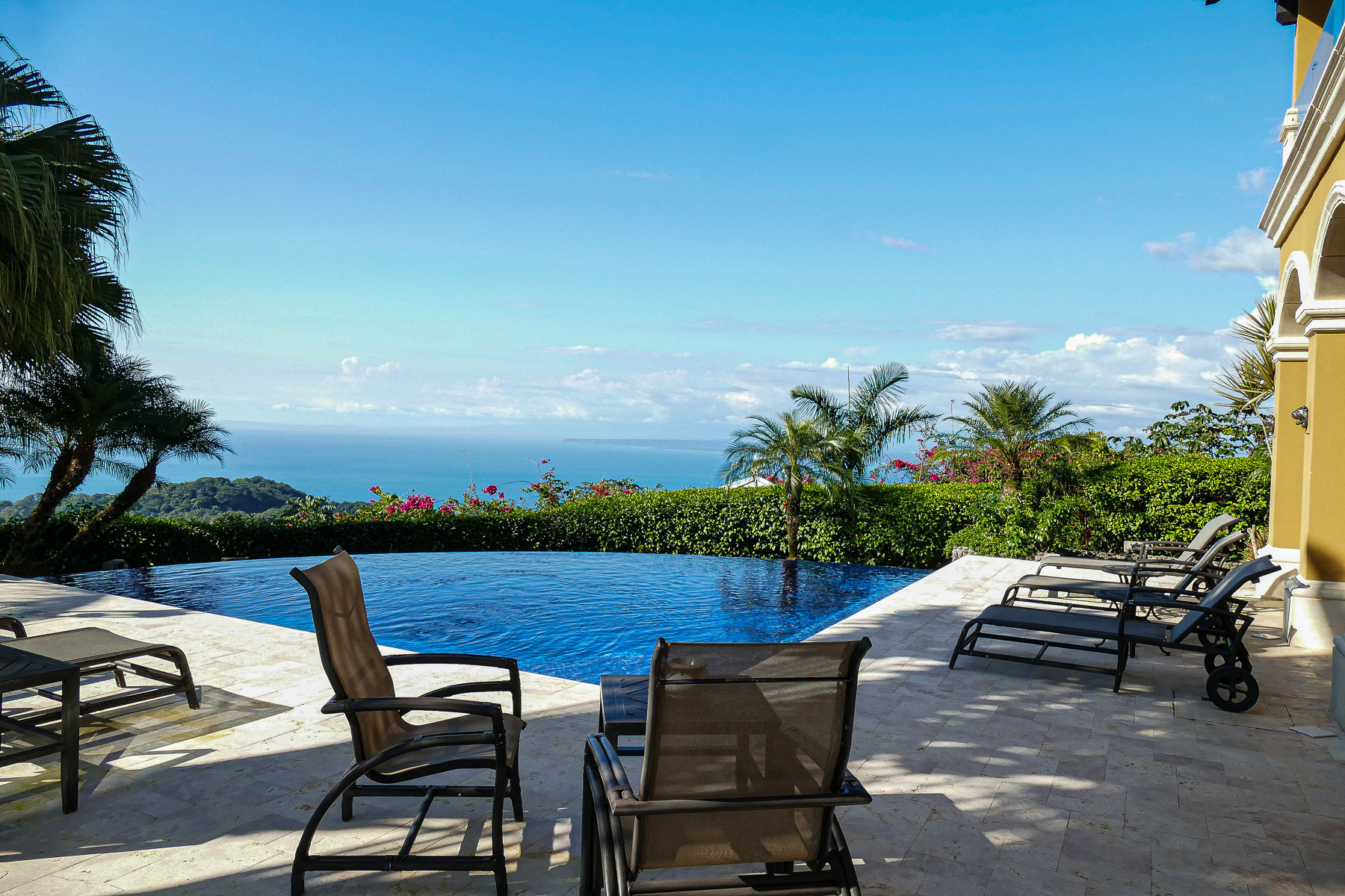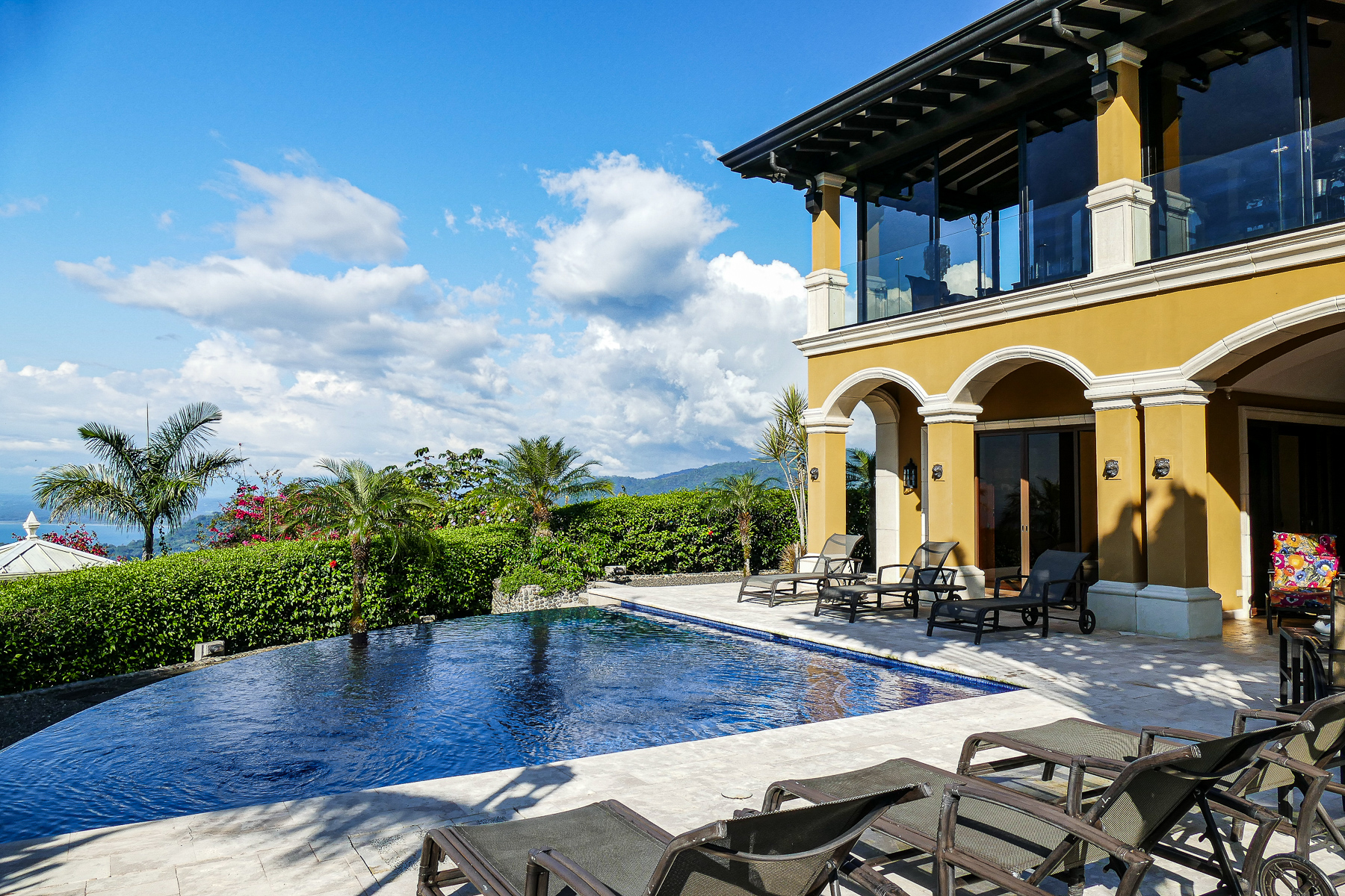It is truly a one-of-a-kind property with over an acre of pristine land situated high above the coast with no neighboring properties to mar the expansive views. The main home boasts an infinity edge pool, private wine cellar, outdoor kitchen, upstairs bar and dining areas with floor to ceiling glass windows that open fully to huge balconies overlooking the azure waters of the Pacific ocean, with rolling rain forested hills on one side overlooking the beaches and the beautiful rocky islands toward Los Suenos Marriott Resort on the other side.