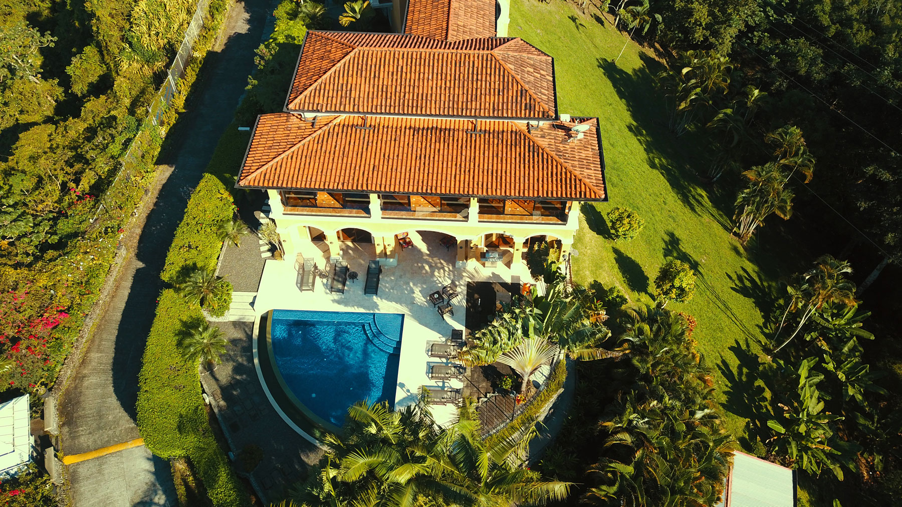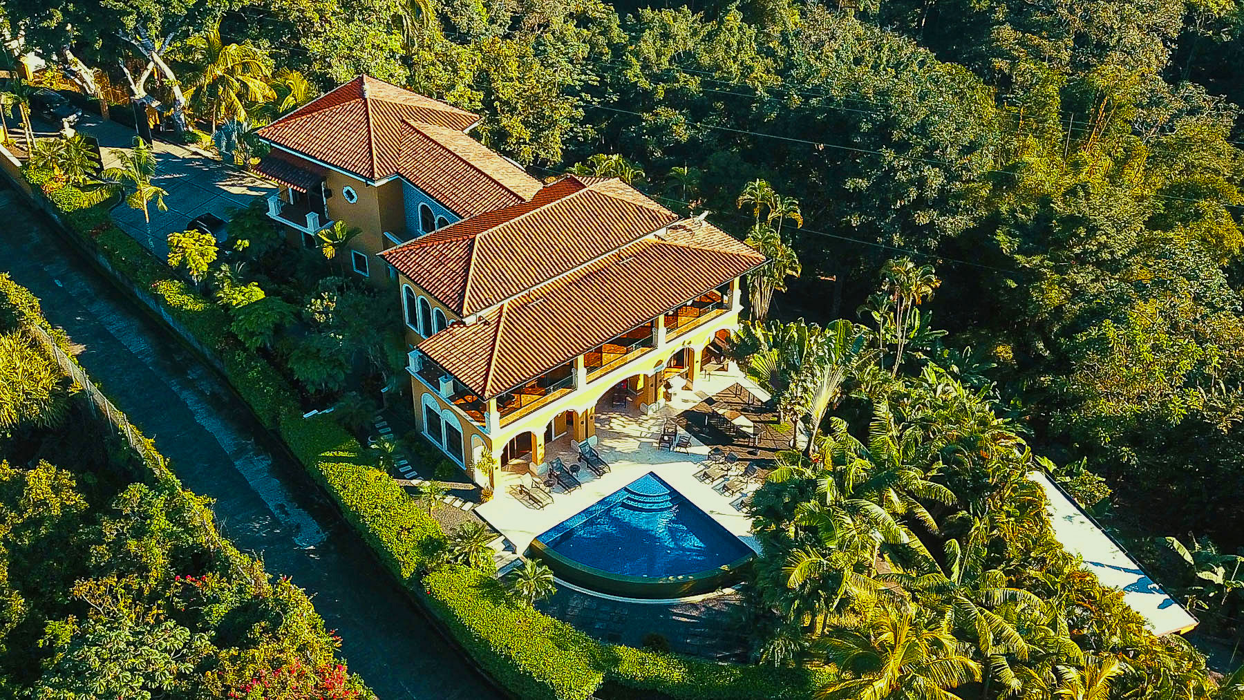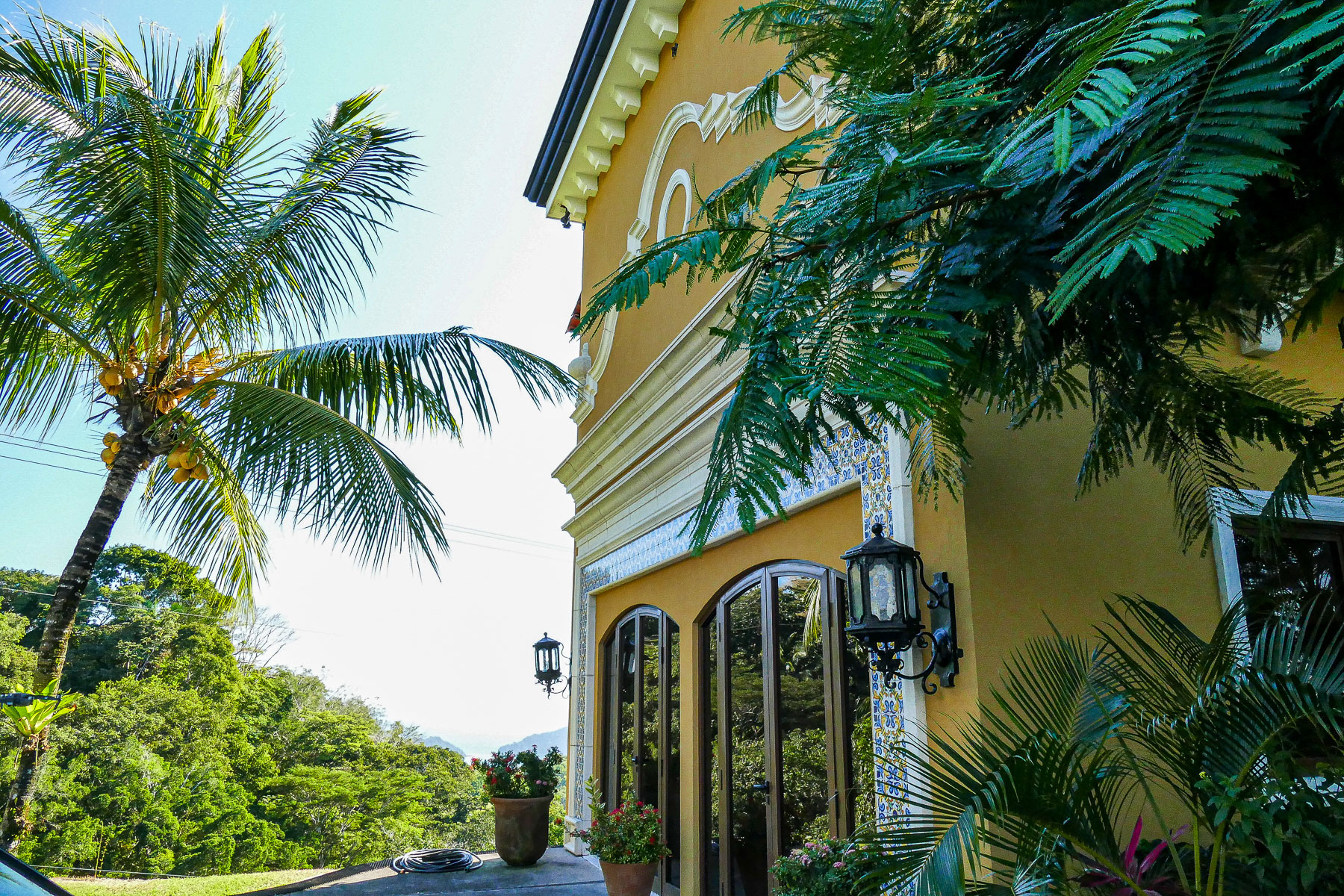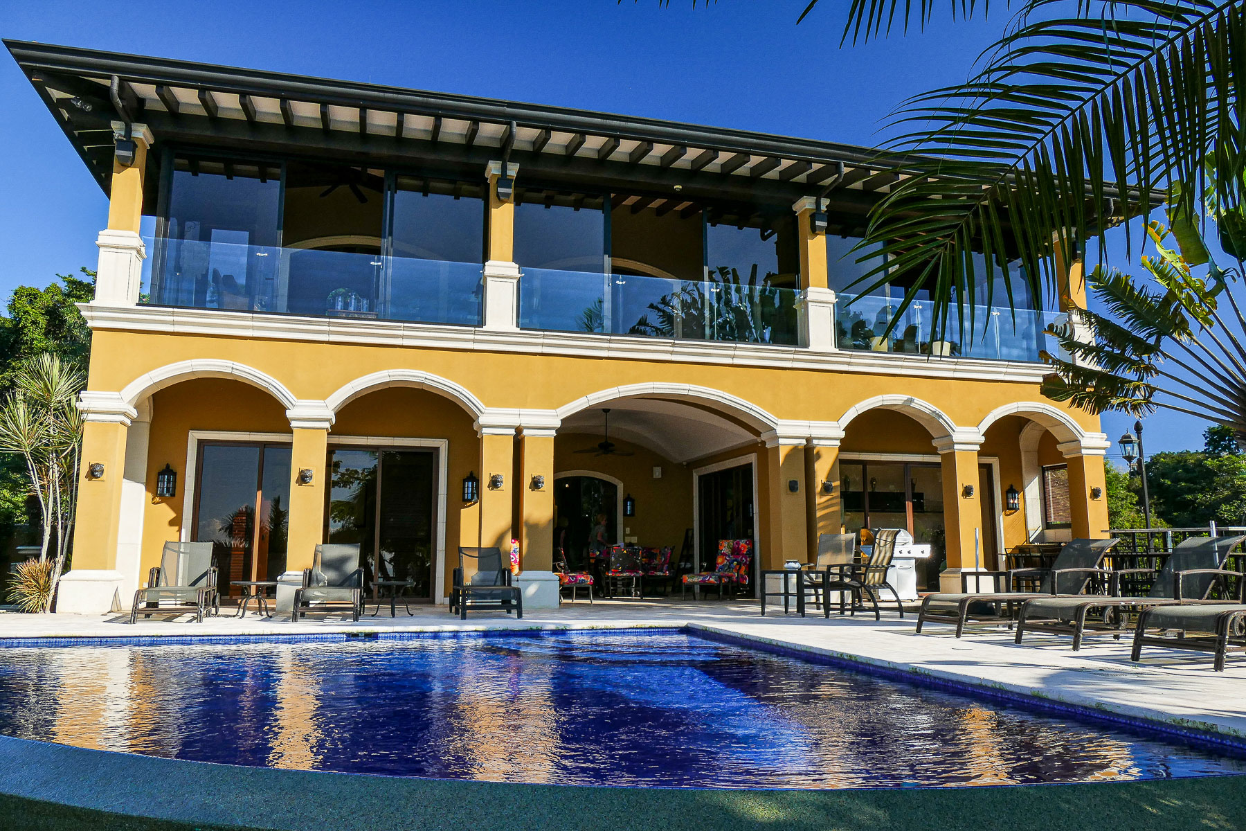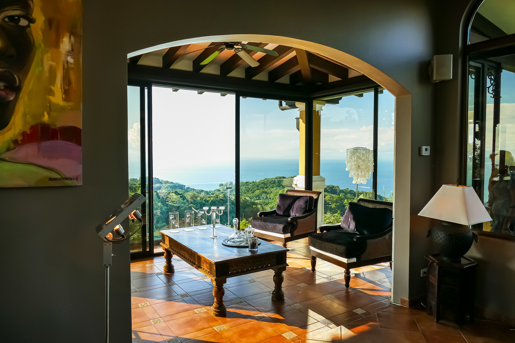 It is truly a one-of-a-kind property with over an acre of pristine land situated high above the coast with no neighboring properties to mar the expansive views. The main home boasts an infinity edge pool, private wine cellar, outdoor kitchen, upstairs bar and dining areas with floor to ceiling glass windows that open fully to huge balconies overlooking the azure waters of the Pacific ocean, with rolling rain forested hills on one side overlooking the beaches and the beautiful rocky islands toward Los Suenos Marriott Resort on the other side.