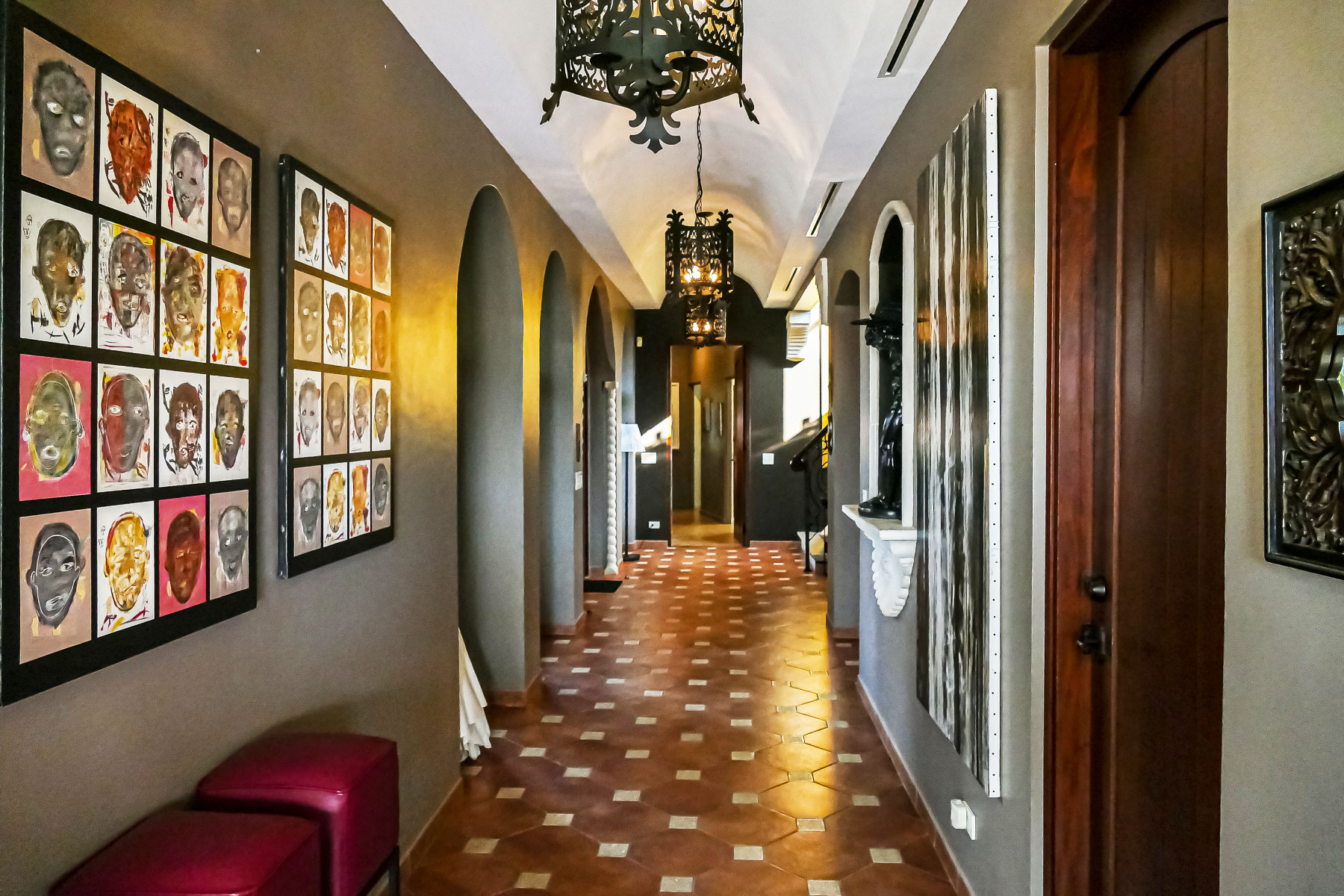 The first level features an entrance courtyard, private parking, four guest bedrooms, two with en suite baths, an additional full bath and an extra half bath for guests, plus a huge entertainment deck and infinity edge pool overlooking the coast, huge, outdoor kitchen, indoor temperature controlled wine cellar and a huge pantry/laundry/utility room too. The curved staircase is a work of art all by itself with beautiful artwork and statues leading up to an upstairs shangri-la with a huge private master bedroom suite with spacious bathroom, his and her closets, extra half bath for guests, large living area, huge kitchen with every modern convenience, bar and dining room all overlooking the stunning ocean views.