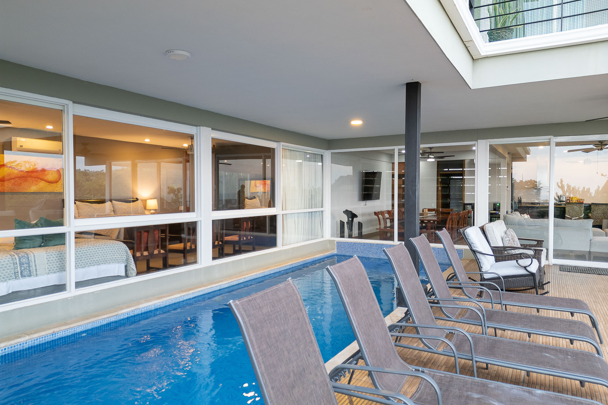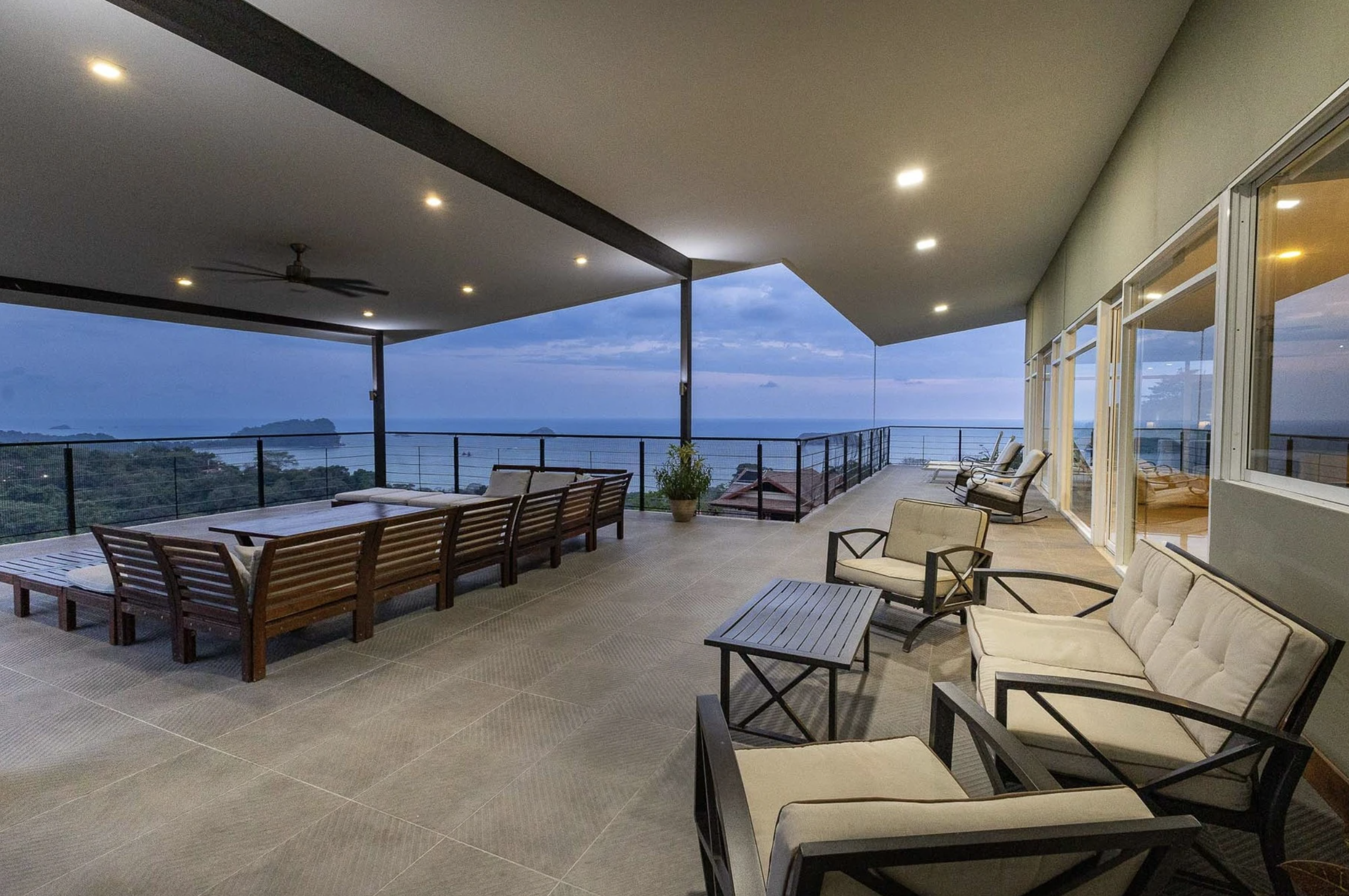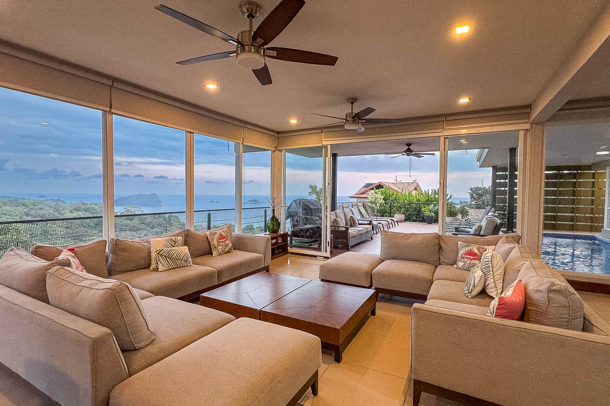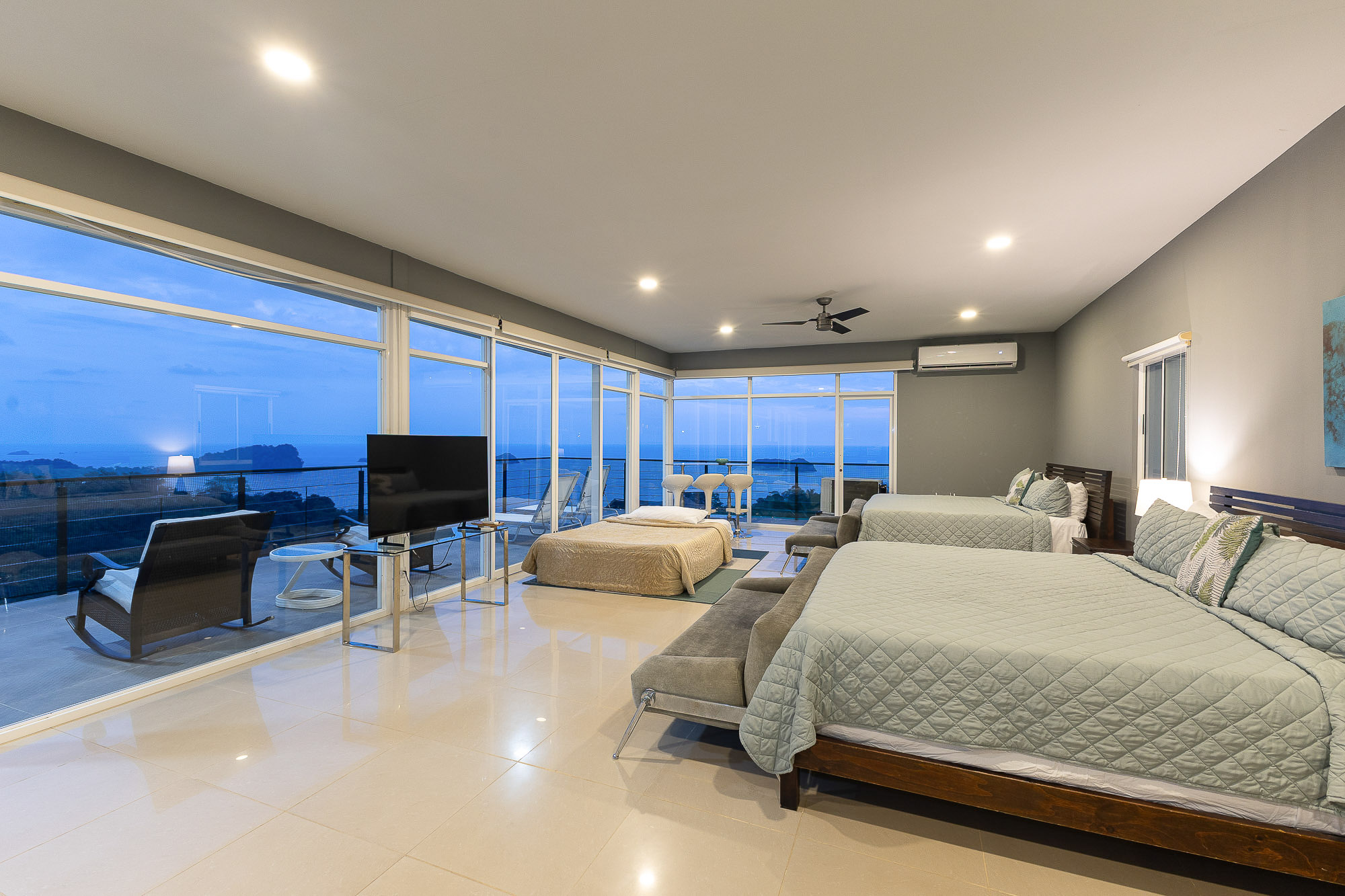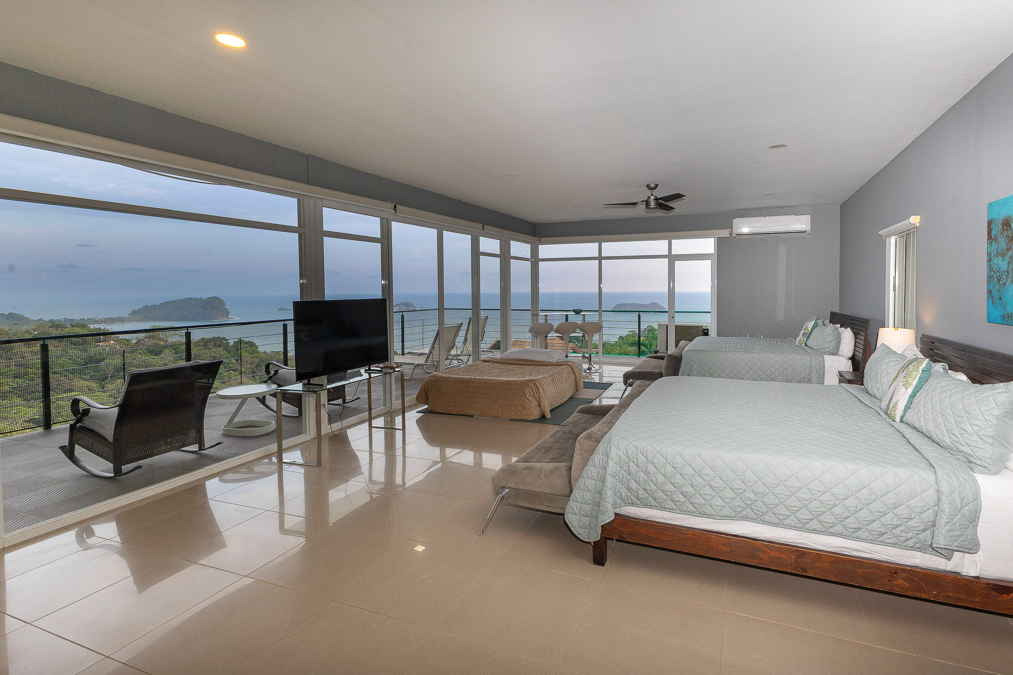Flooded with natural light, the villa features floor-to-ceiling glass doors and windows, offering uninterrupted views from most living and bedroom area. Step out onto the adjoining patios and enjoy panoramic views of the Pacific Ocean, with boats drifting by and birds soaring across the sky.